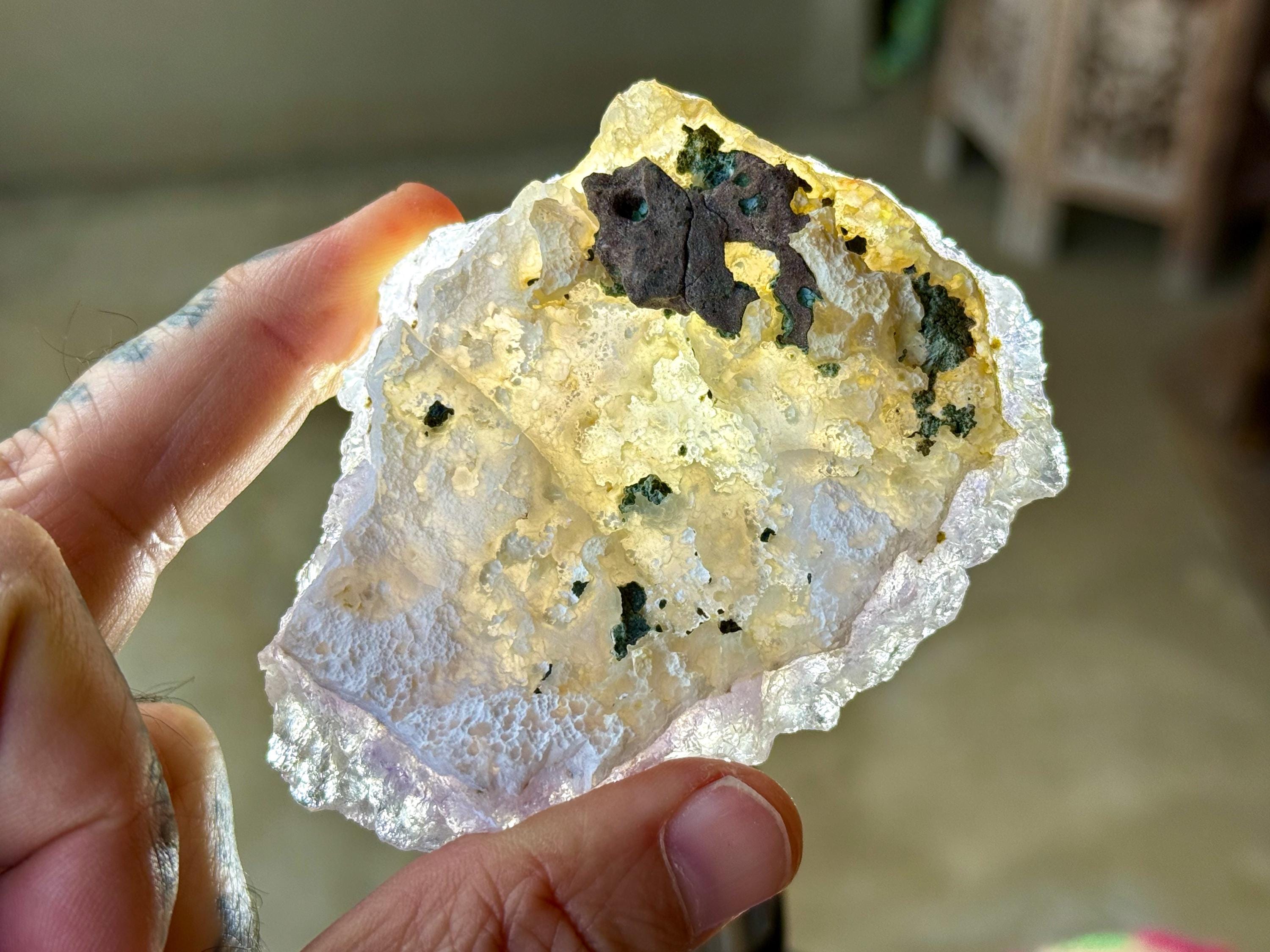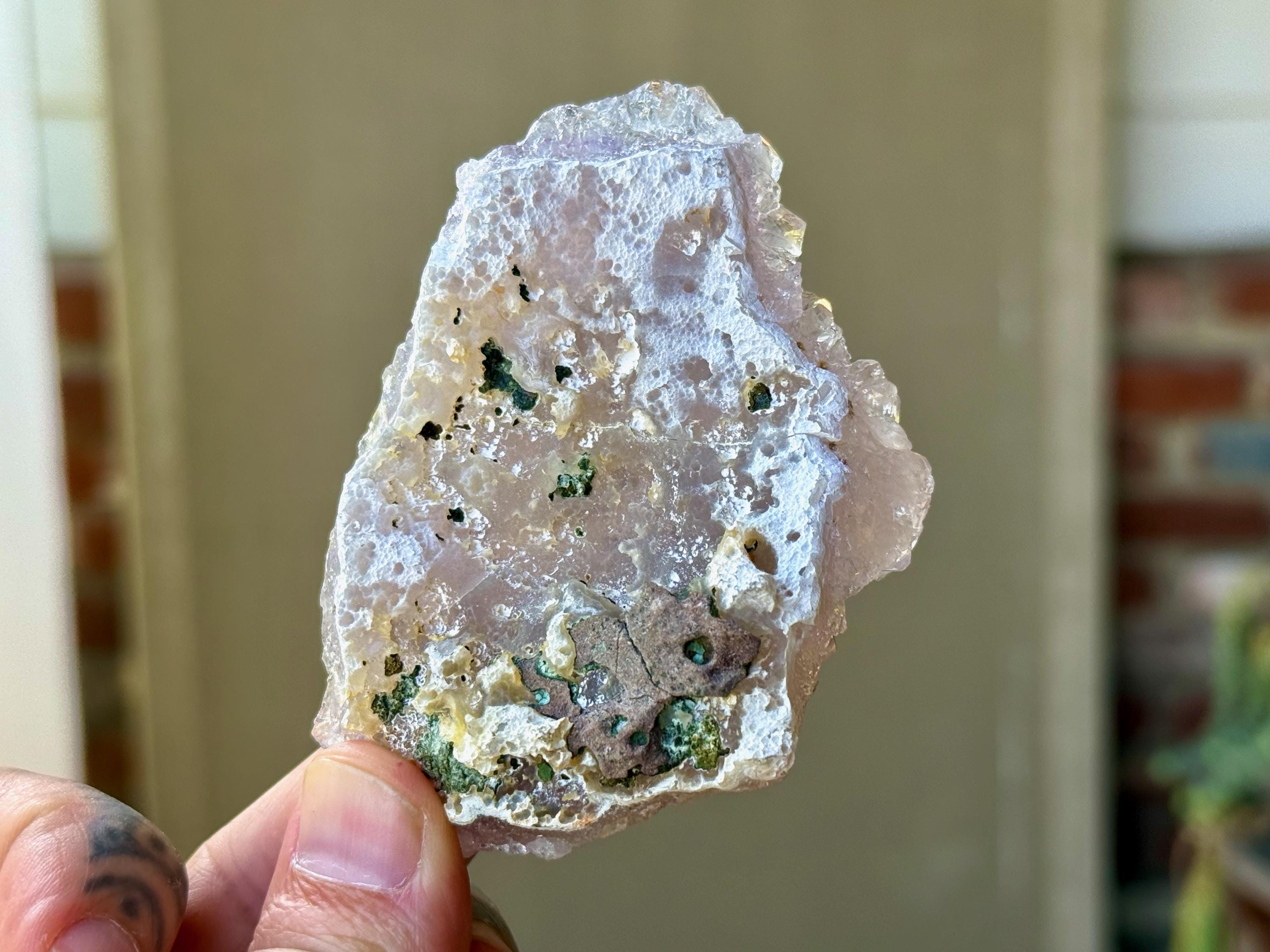 There is hardly any matrix attached on the underside, so this piece is nearly all Amethyst, and we can see some hints of Green Celadonite here as well (Photo 10).