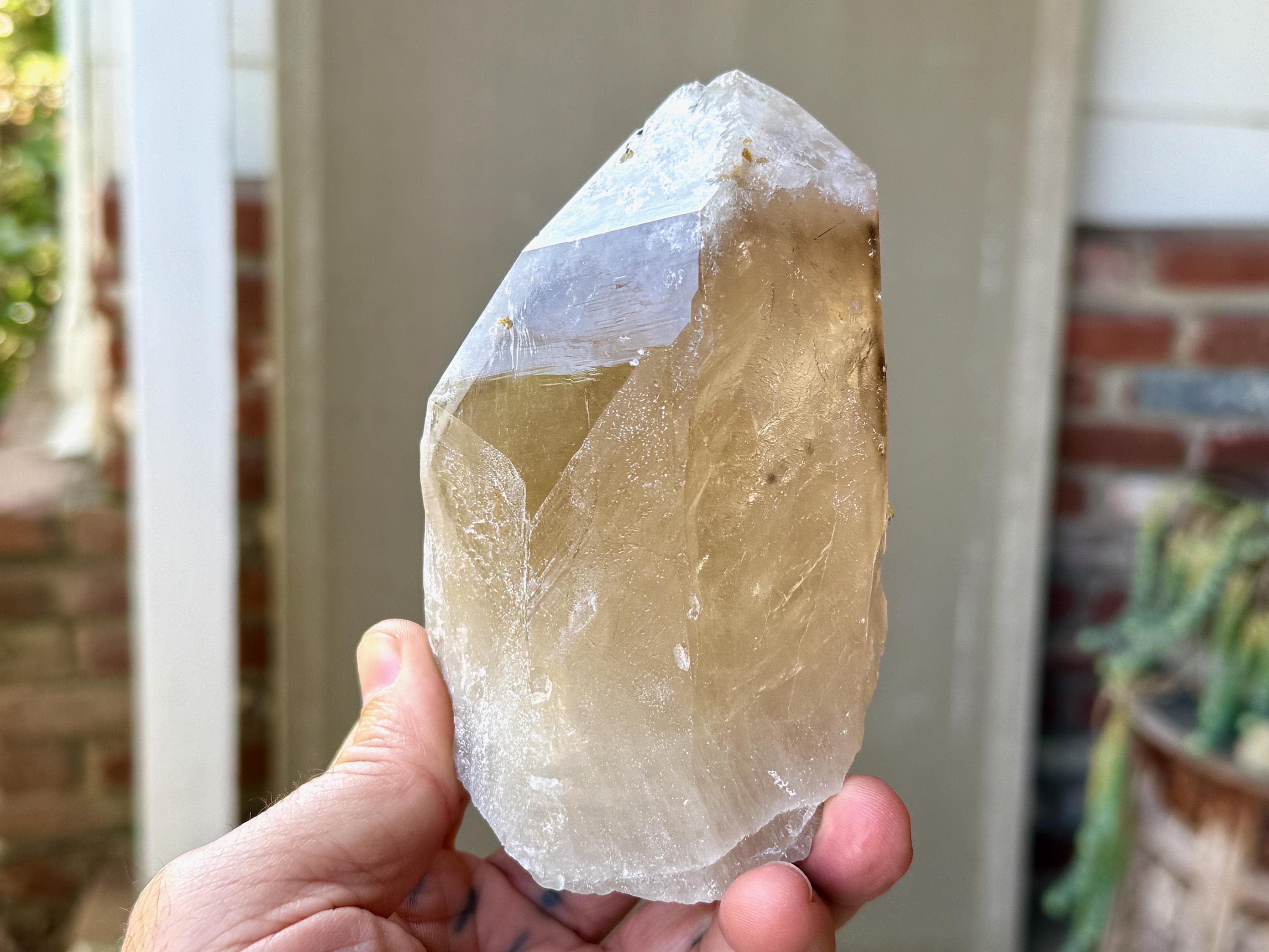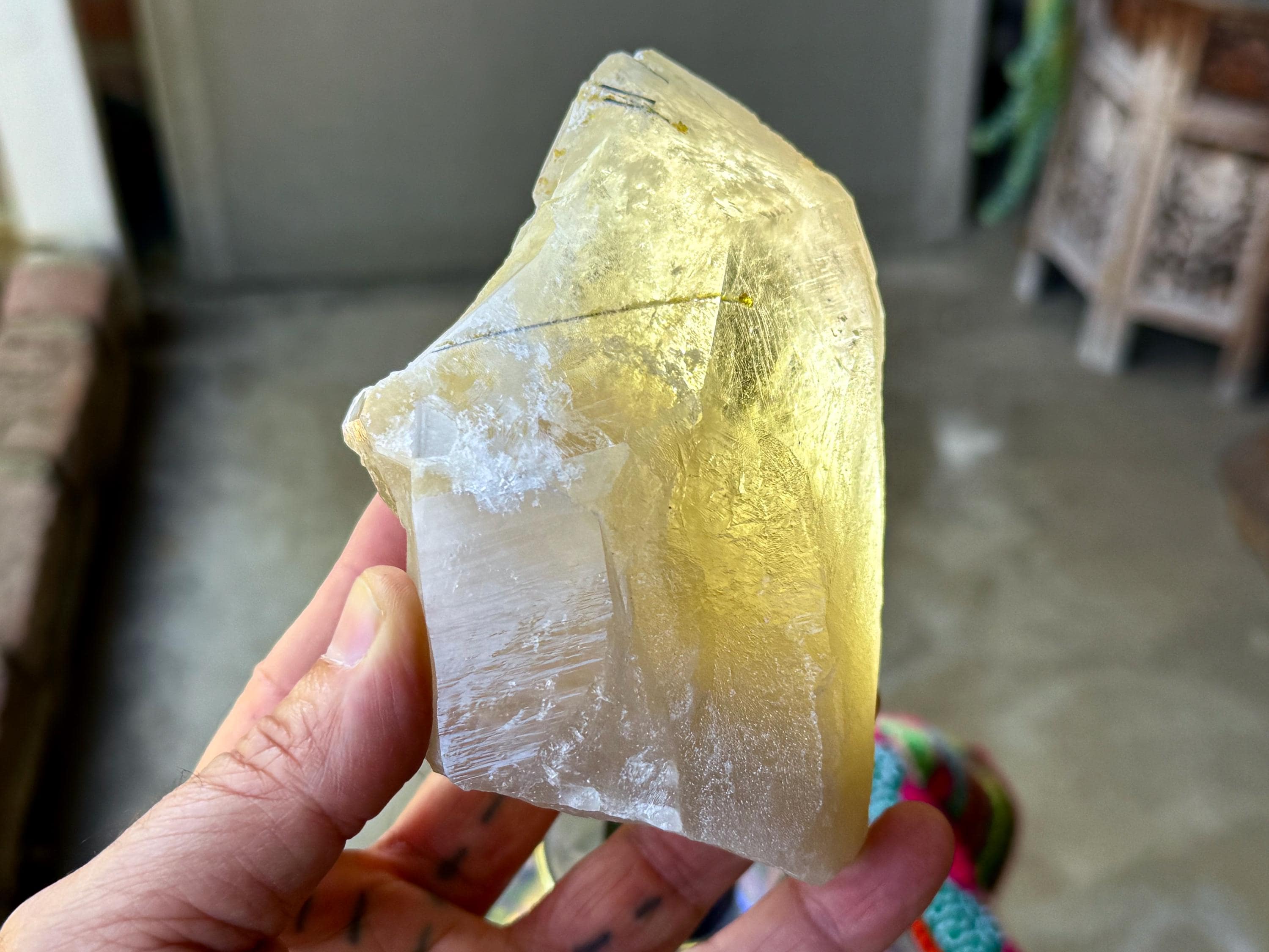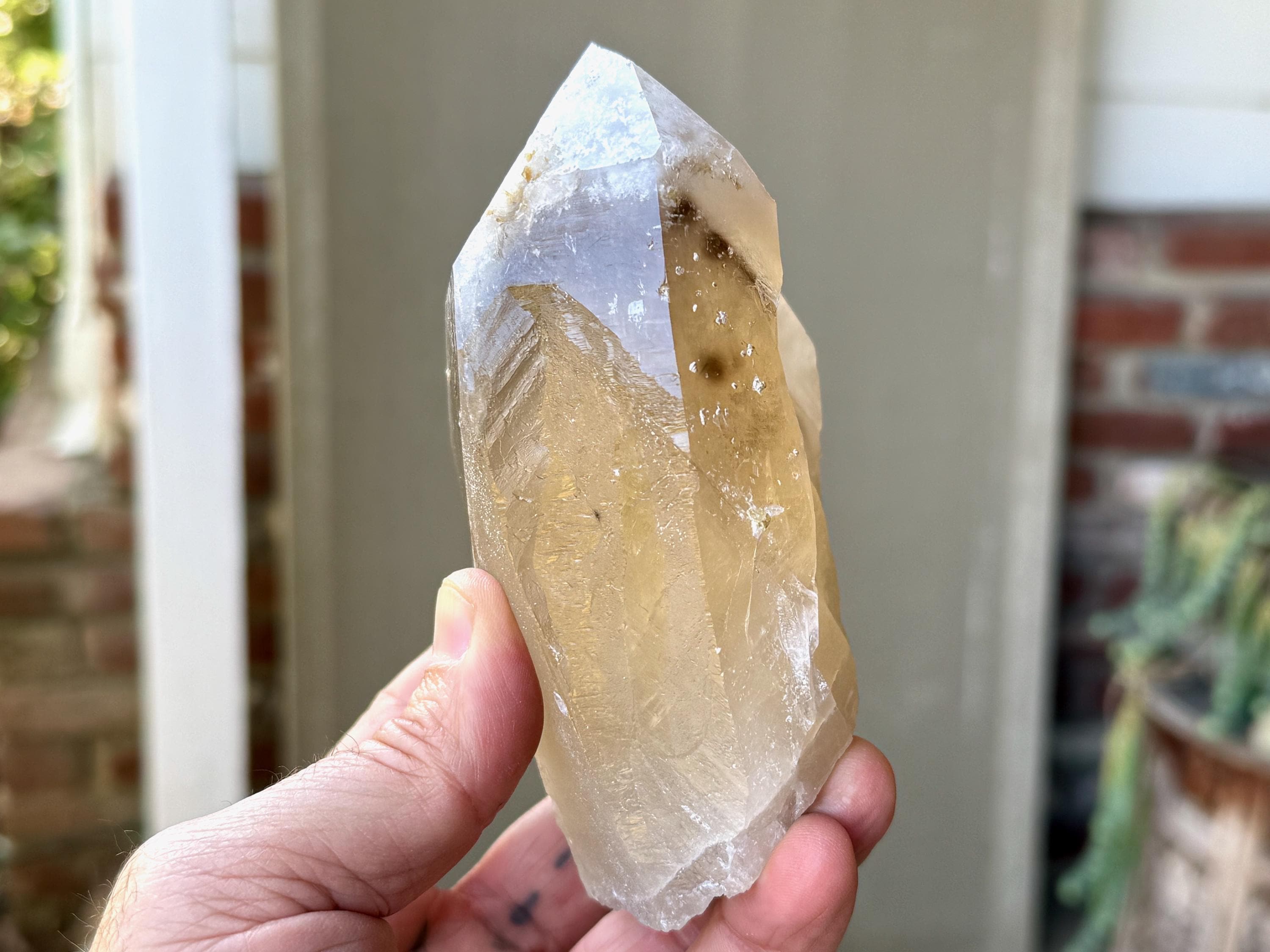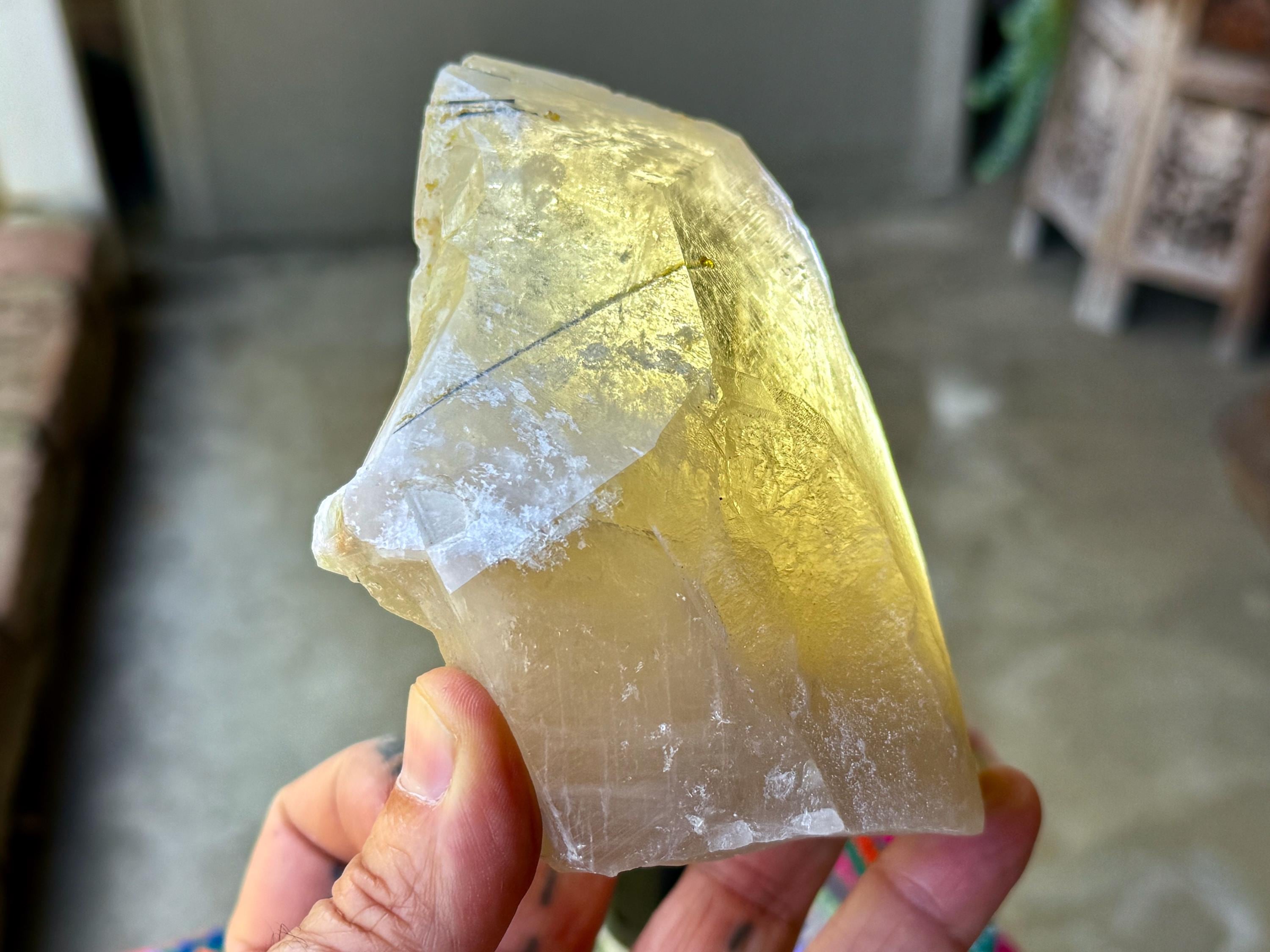 Superb luster and a vibrant golden hue to this large, natural Citrine crystal with Green Tourmaline inclusions in the main facet! When backlit, we can really see those yellow-golden hues come out, and also get a sense of how well this crystal passes light (see Photos 2-5).
