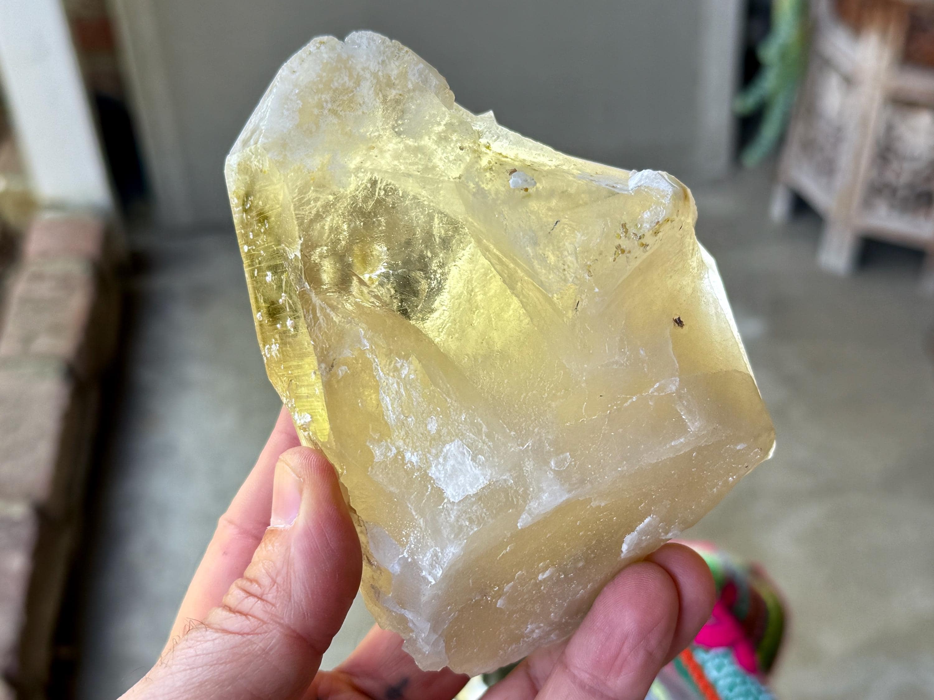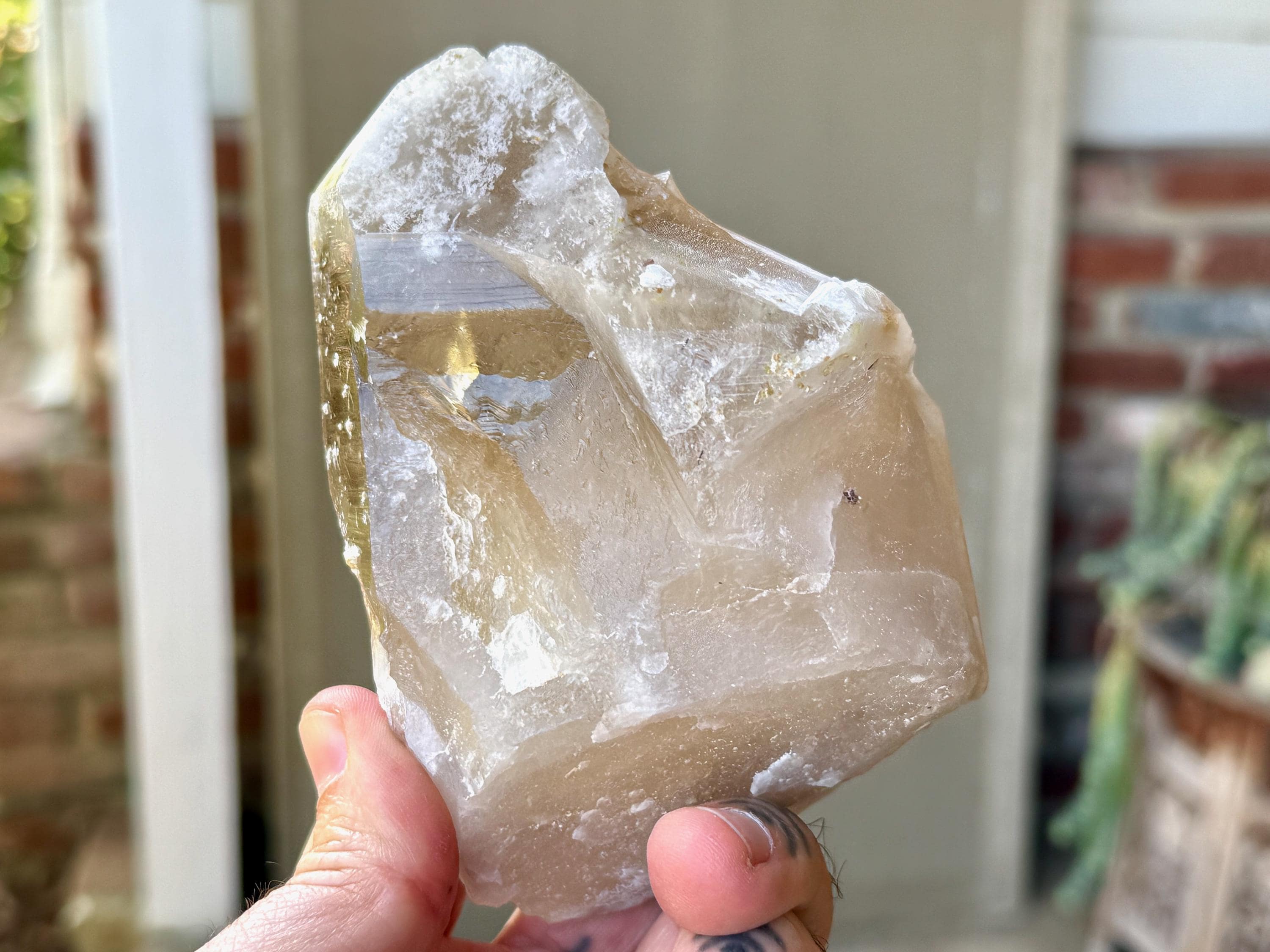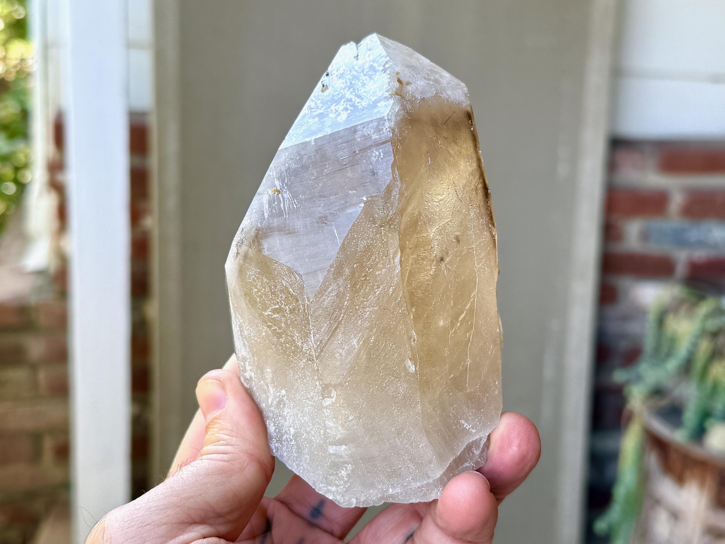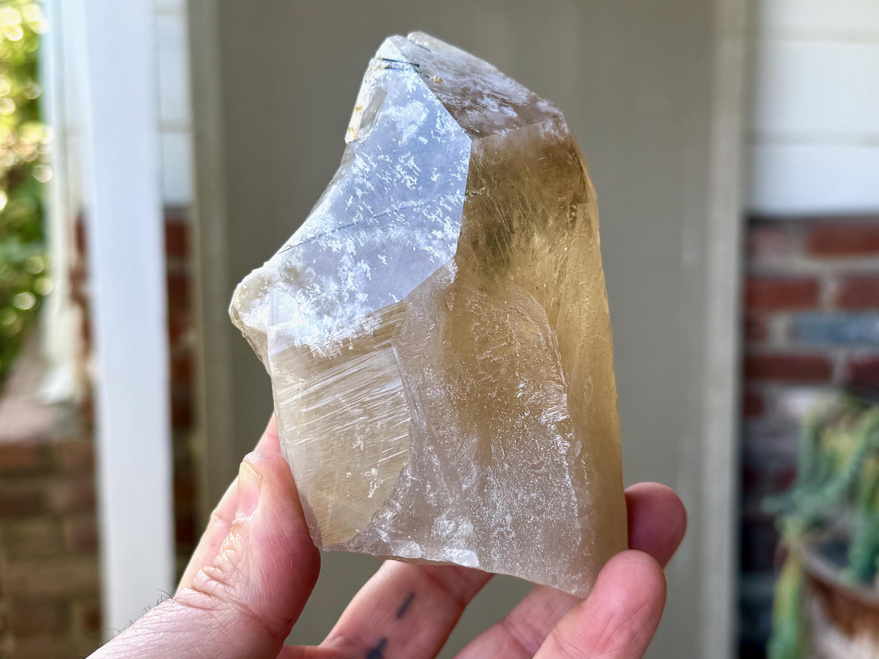 Superb luster and a vibrant golden hue to this large, natural Citrine crystal with Green Tourmaline inclusions in the main facet! When backlit, we can really see those yellow-golden hues come out, and also get a sense of how well this crystal passes light (see Photos 2-5).