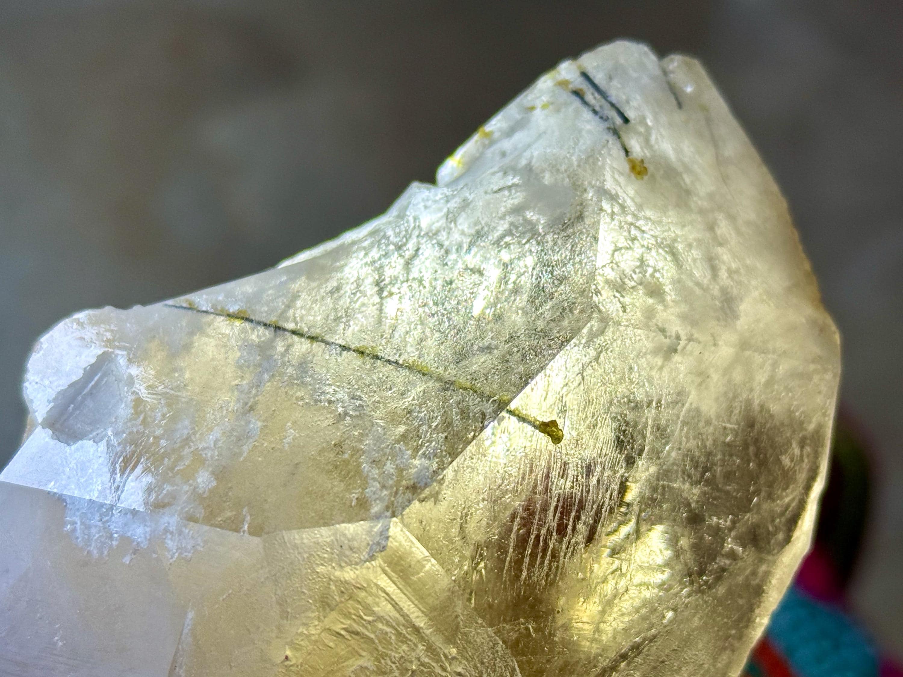 In the main facet area we see inclusions of white "frost," which is most likely Mica. When we look even more closely, we see a few *very* slender "needle" inclusions of dark Green Tourmaline. They look black in natural light, but when backlit, we can see the green hues quite well.