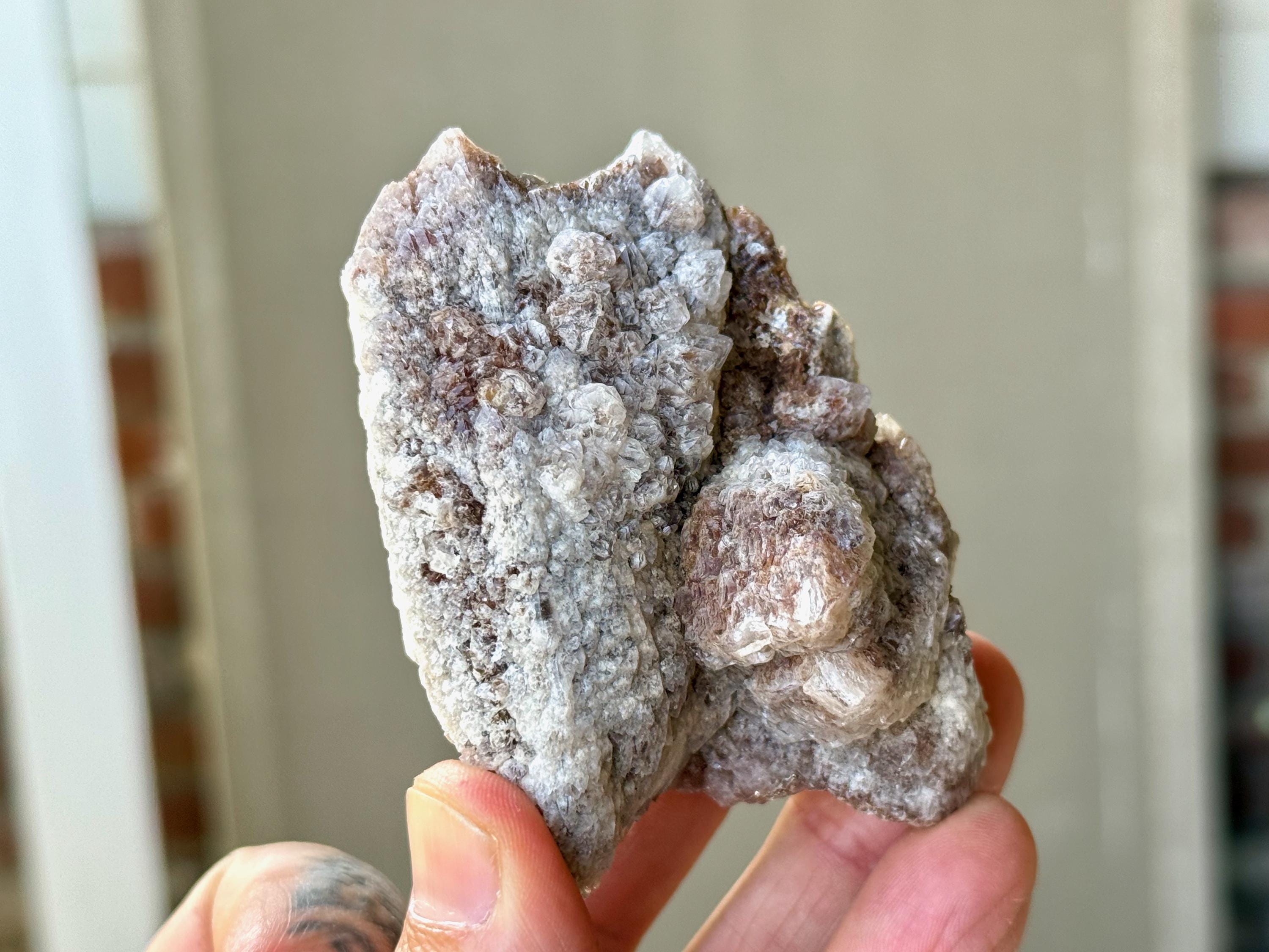 This unusual Dreamsicle Lemurian Quartz possesses a unique cluster formation and displays a darker reddish-pink hue than most of the crystals from this find. There is a snowy white "frost" that covers most of the surface, creating lovely contrasts of color.
