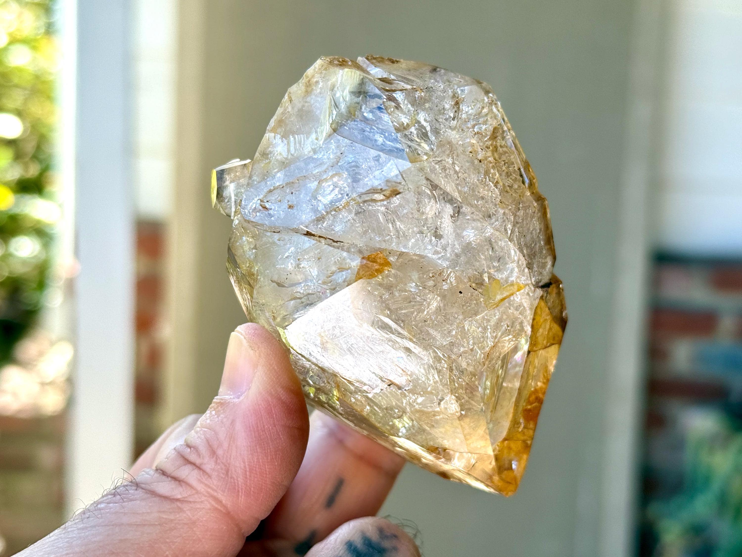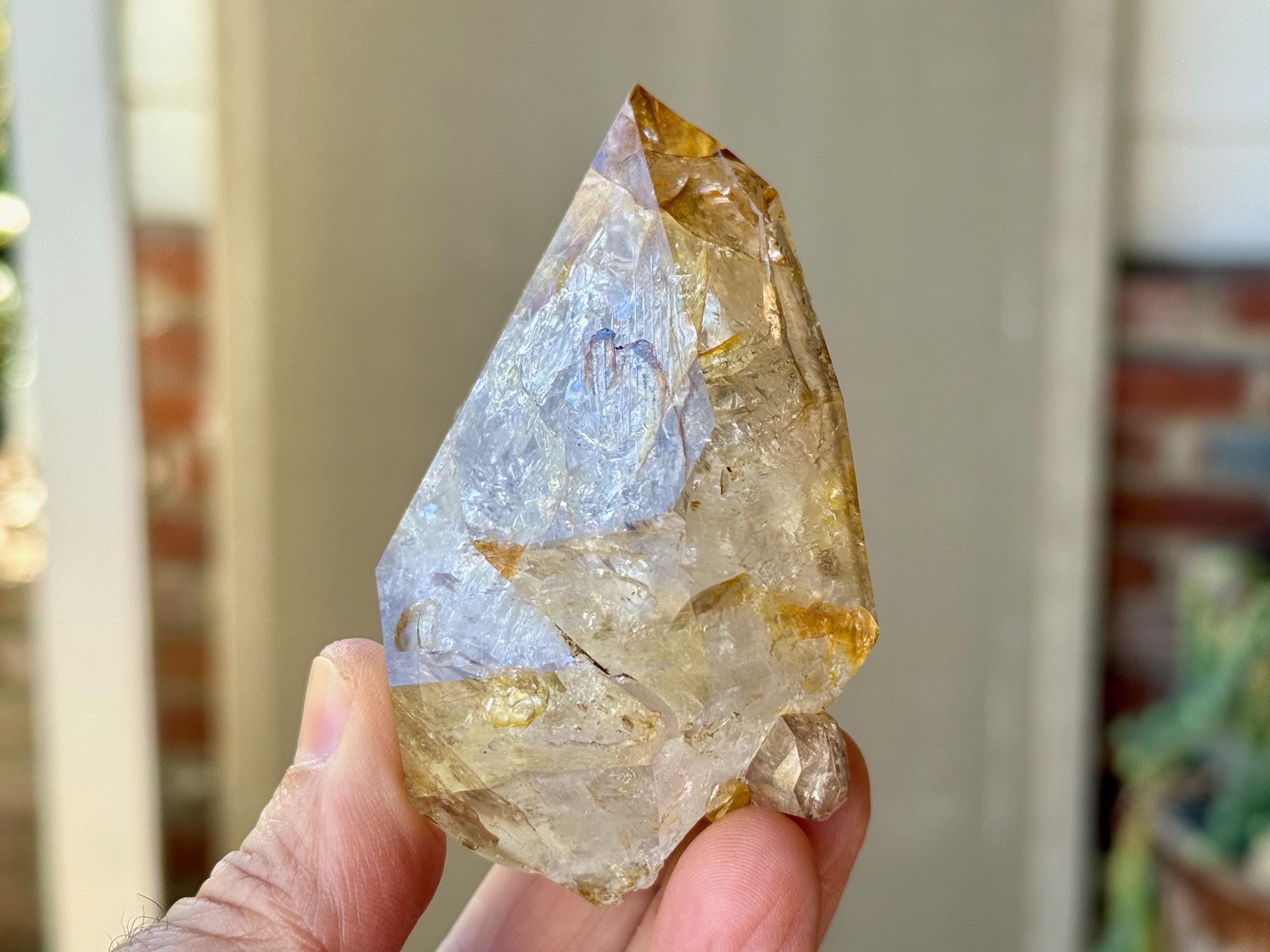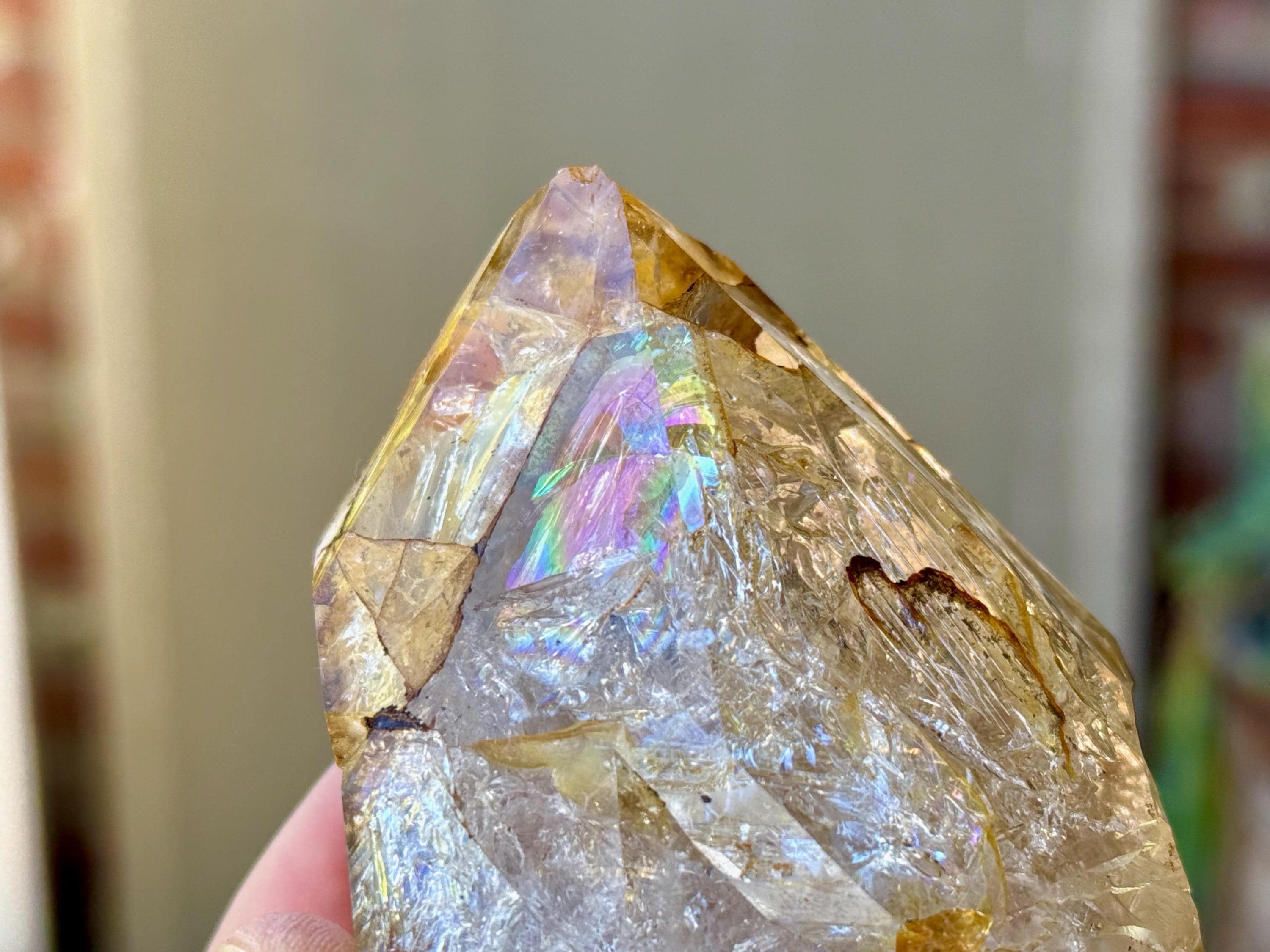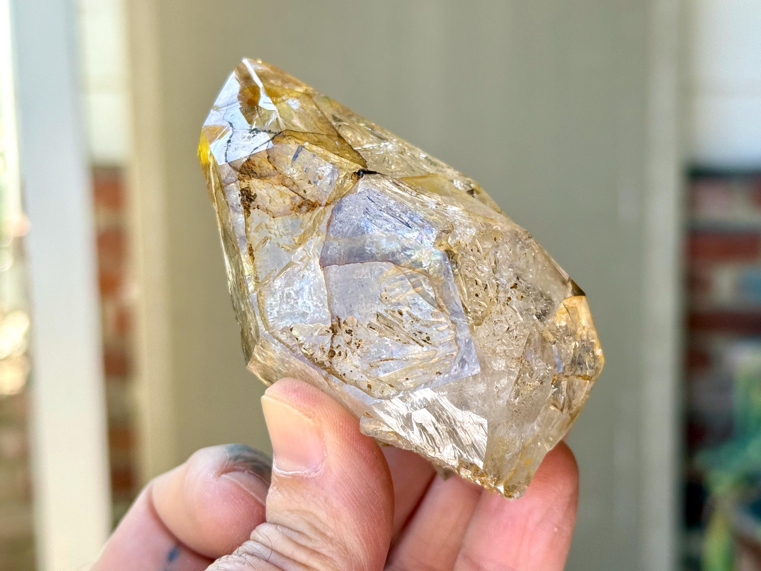This crystal has a giant main facet area and is a traditional Double Terminated formation. The bottom termination is partially interrupted by a large, semi-healed contact area (Photo 10). We're just noticing now some more lovely rainbows at the base main facet that we didn't catch in the photos!