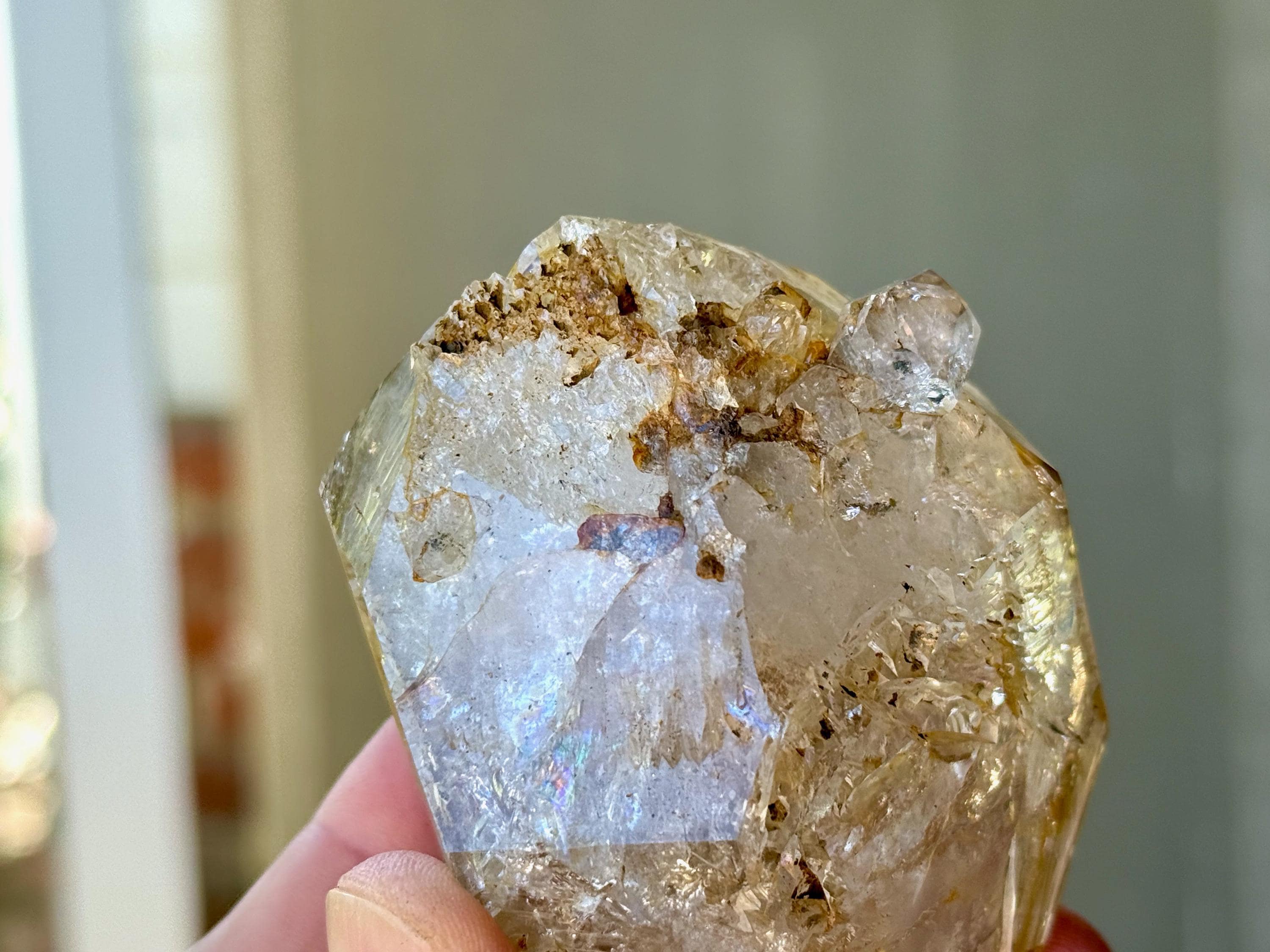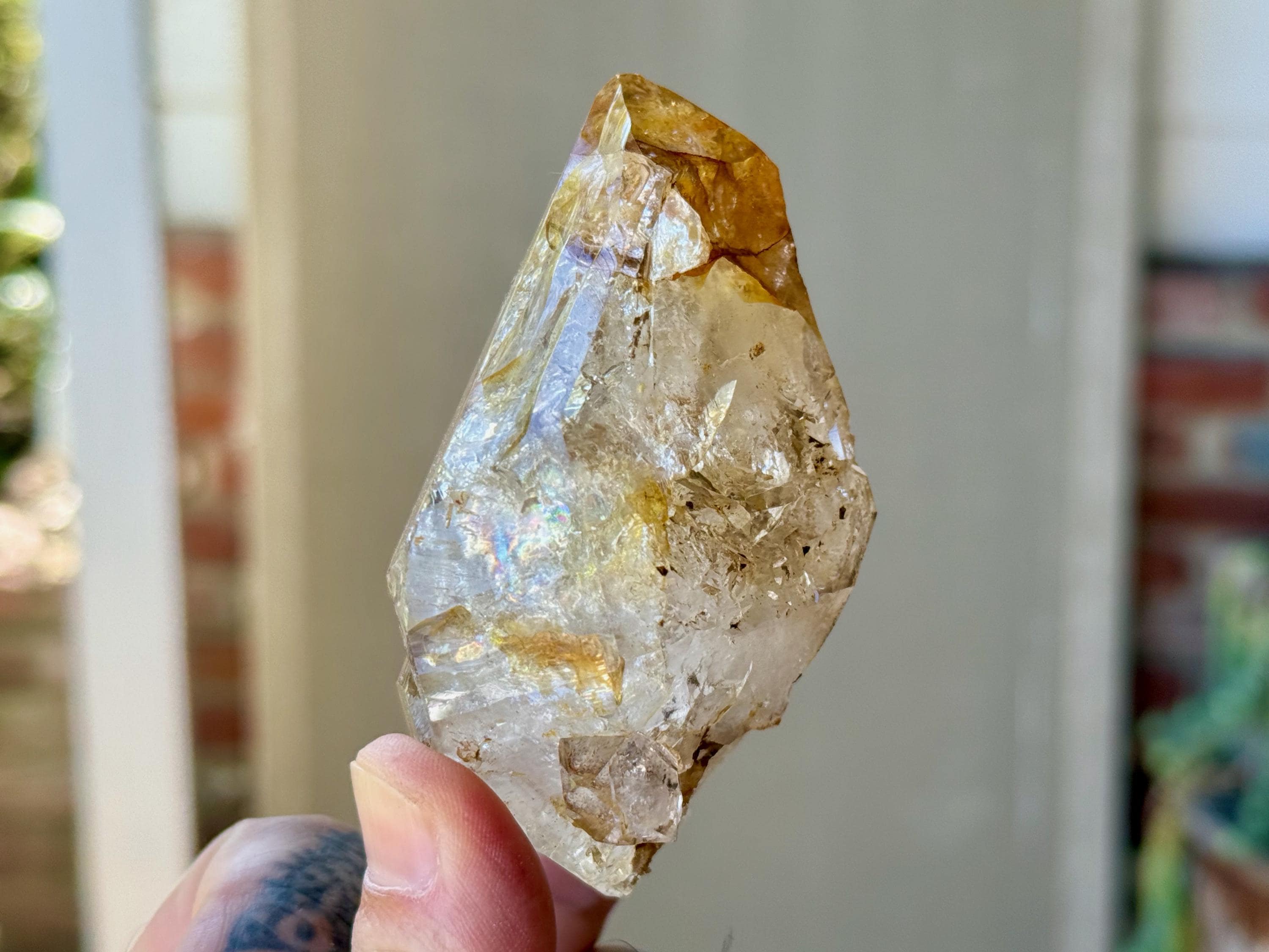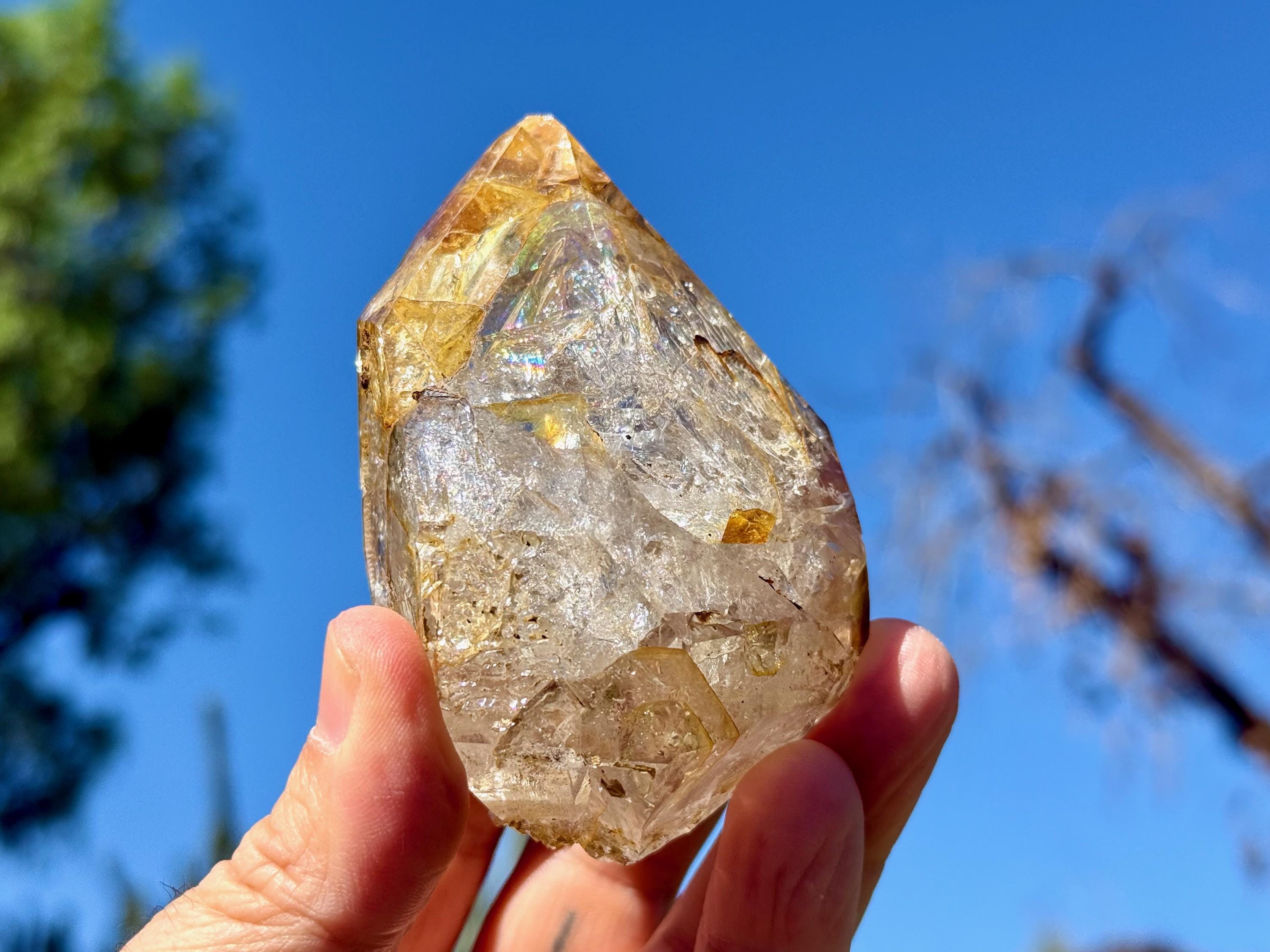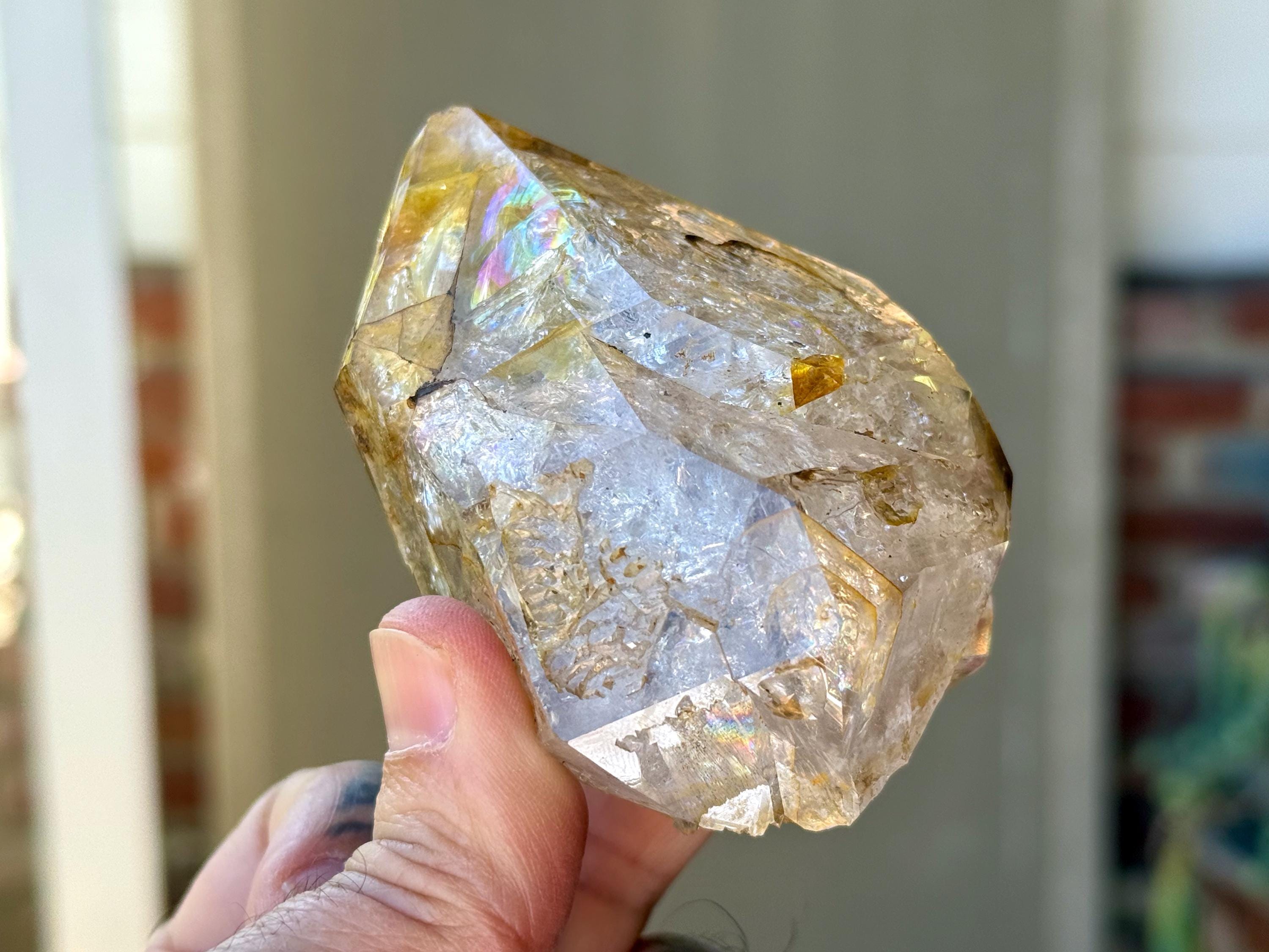 A brilliant Golden Healer Herkimer that is just *bursting* with rainbows! This magnificent crystal features outstanding clarity, superb luster and a lovely golden color, especially on the top portion. It's the excellent clarity that invites us to see all the lovely crystalline structures within. The absolute star of the show here is the vivid rainbow at the top (Photo 2).