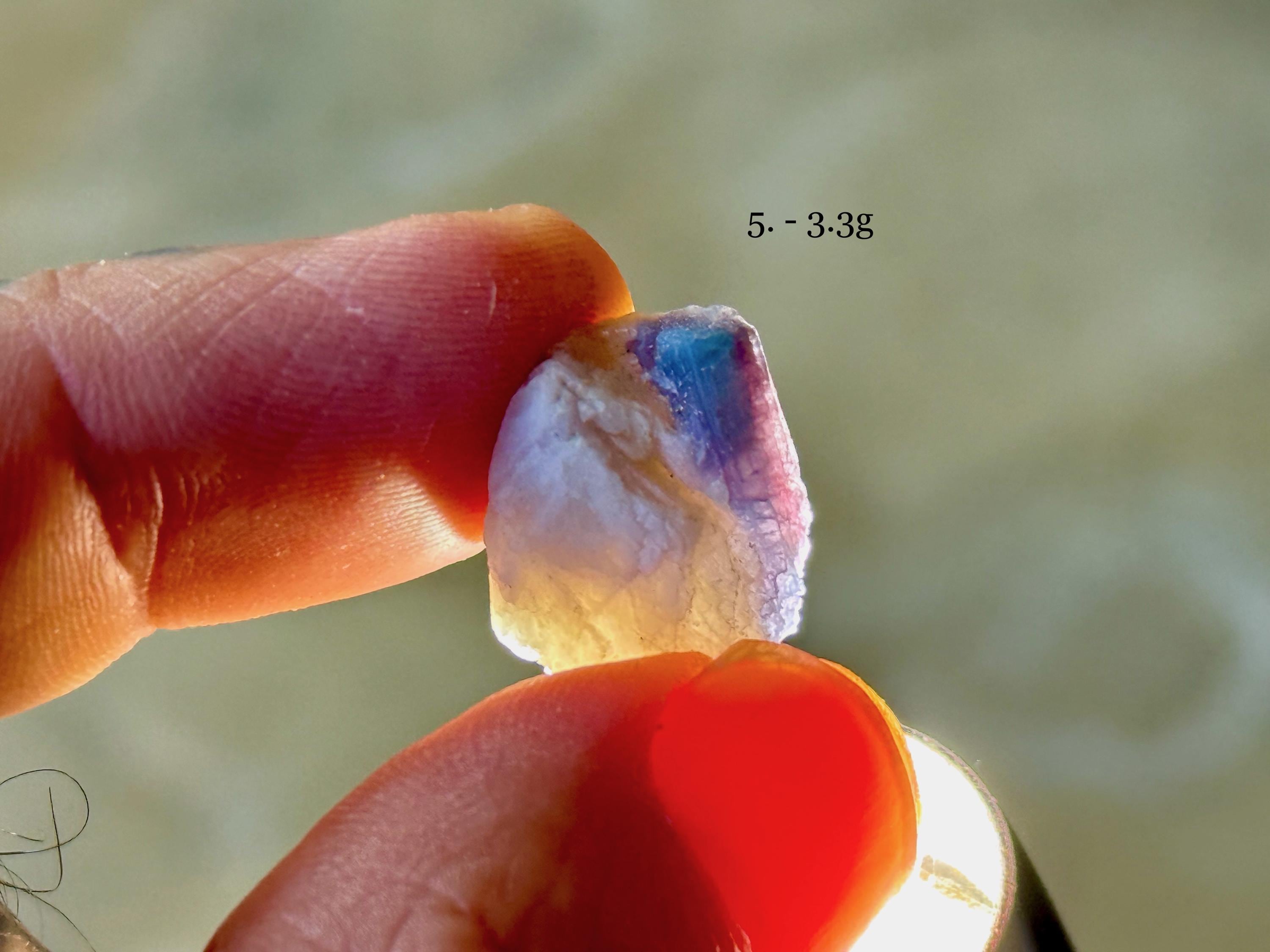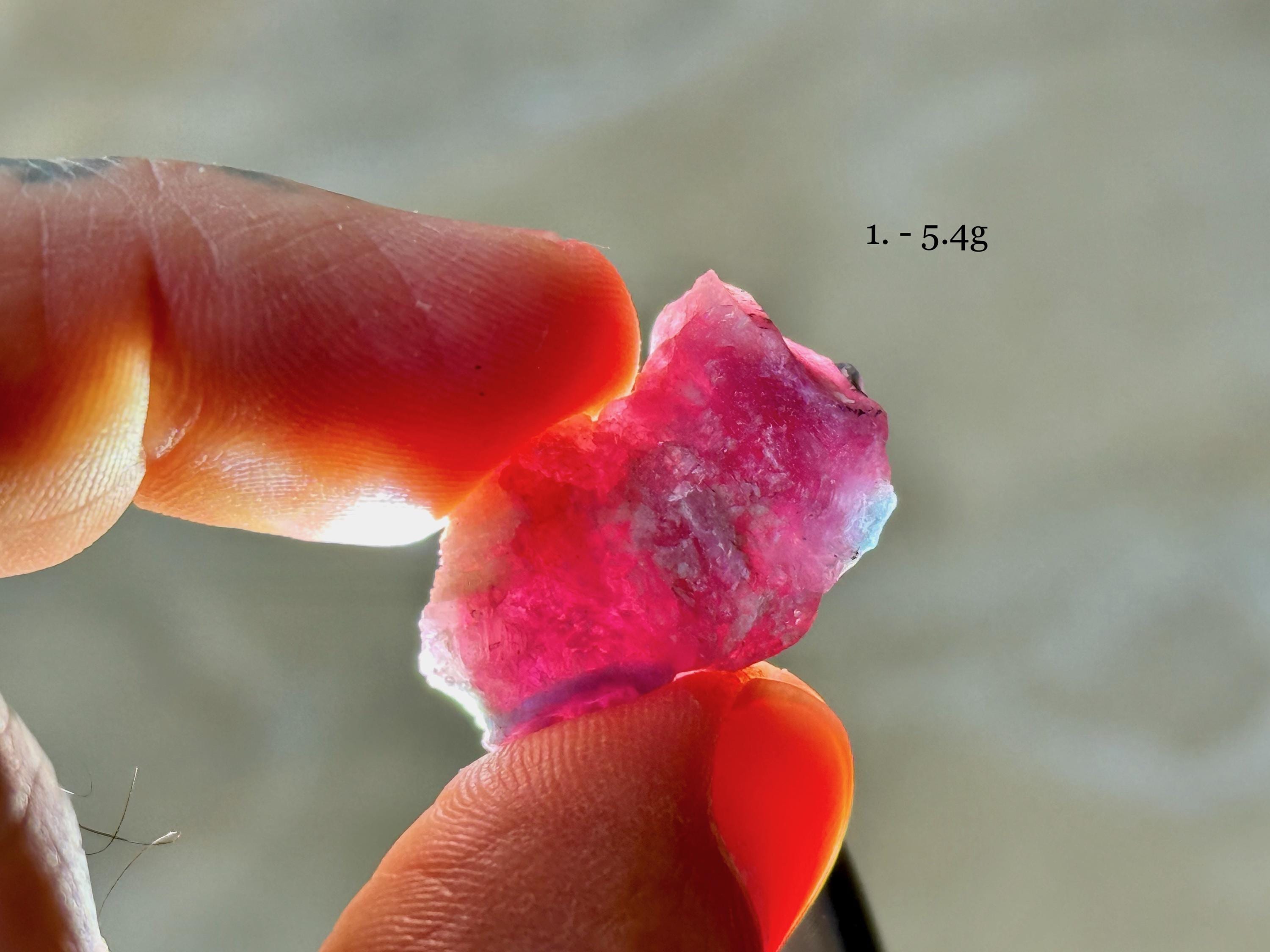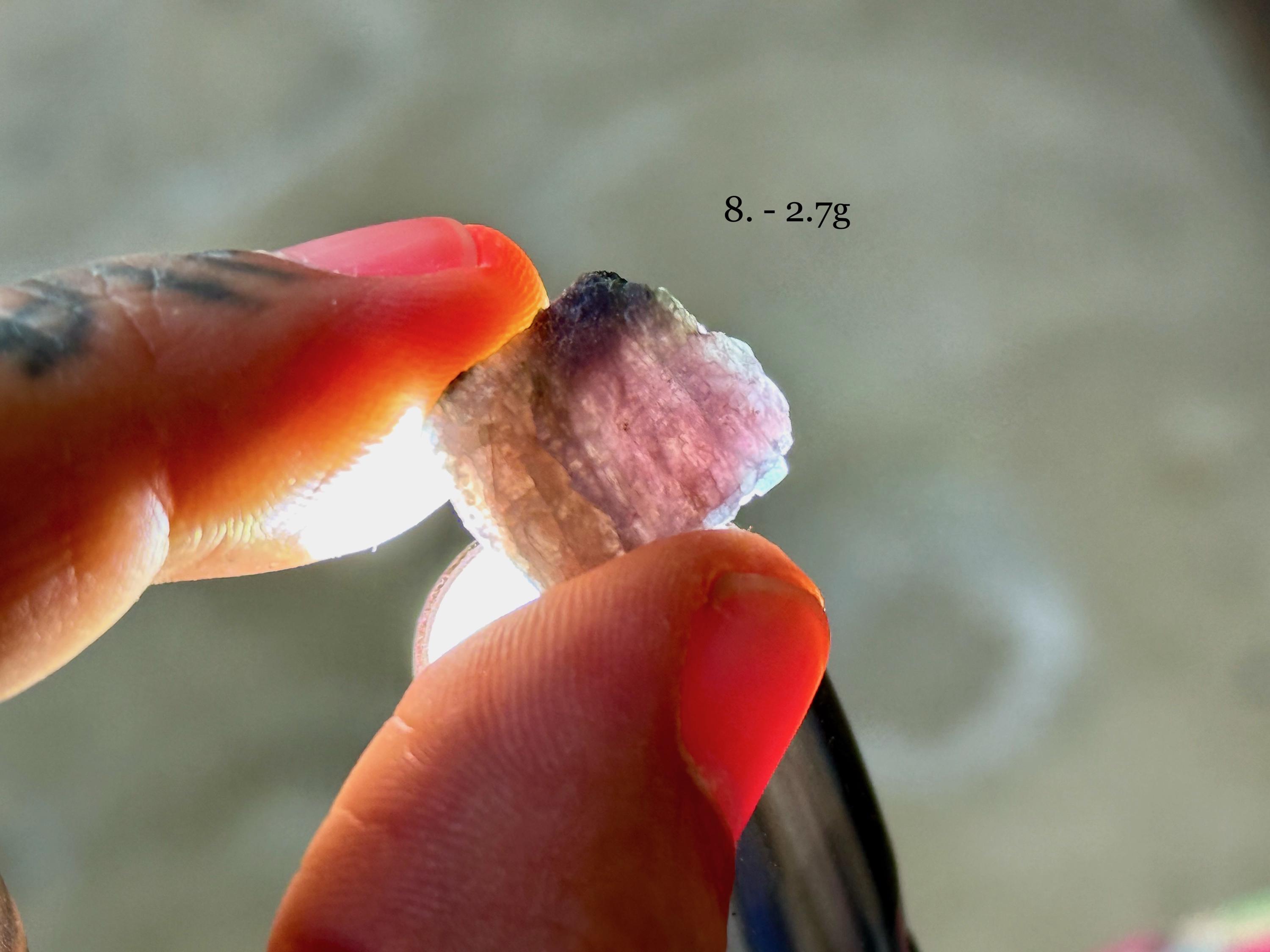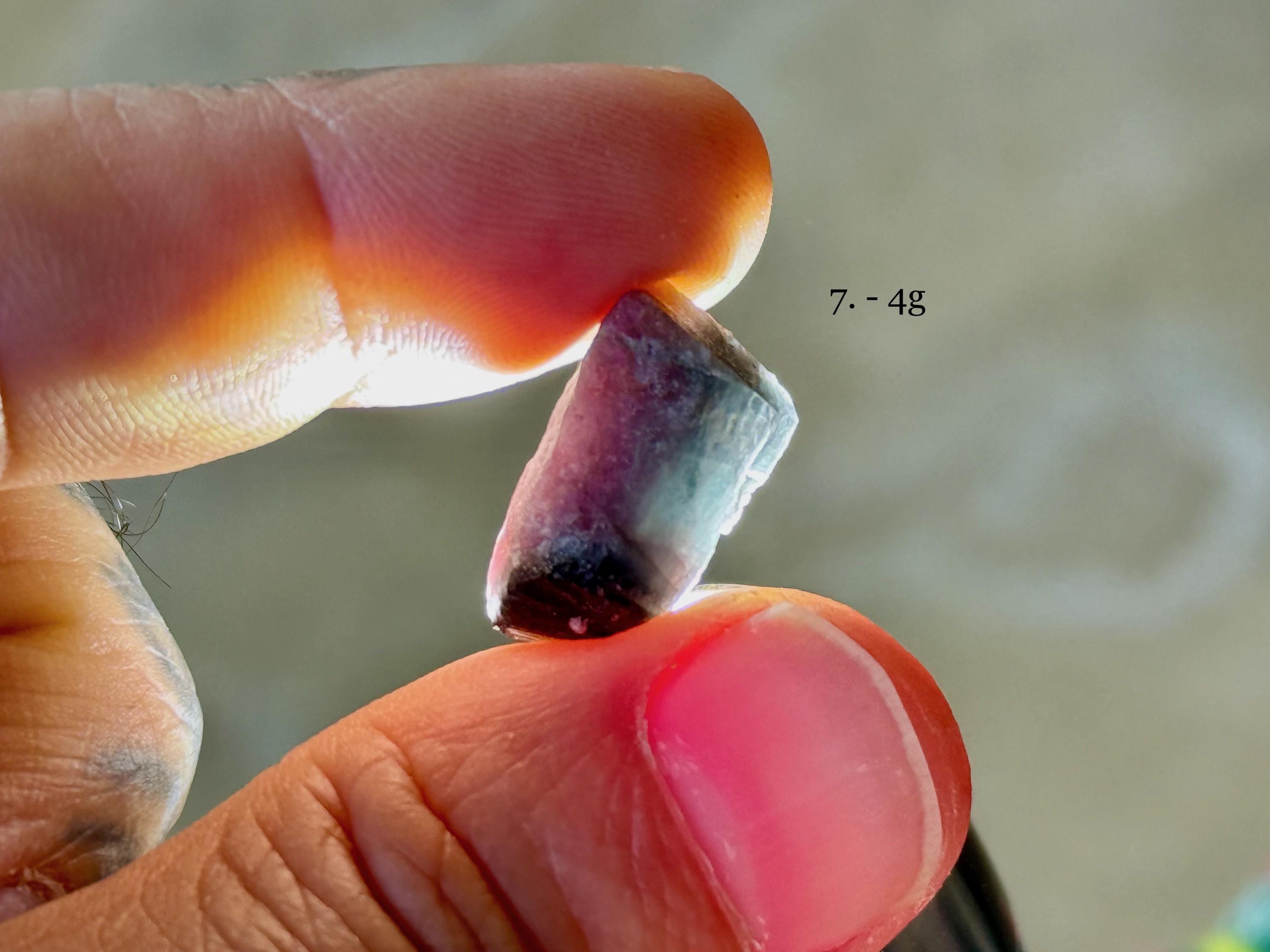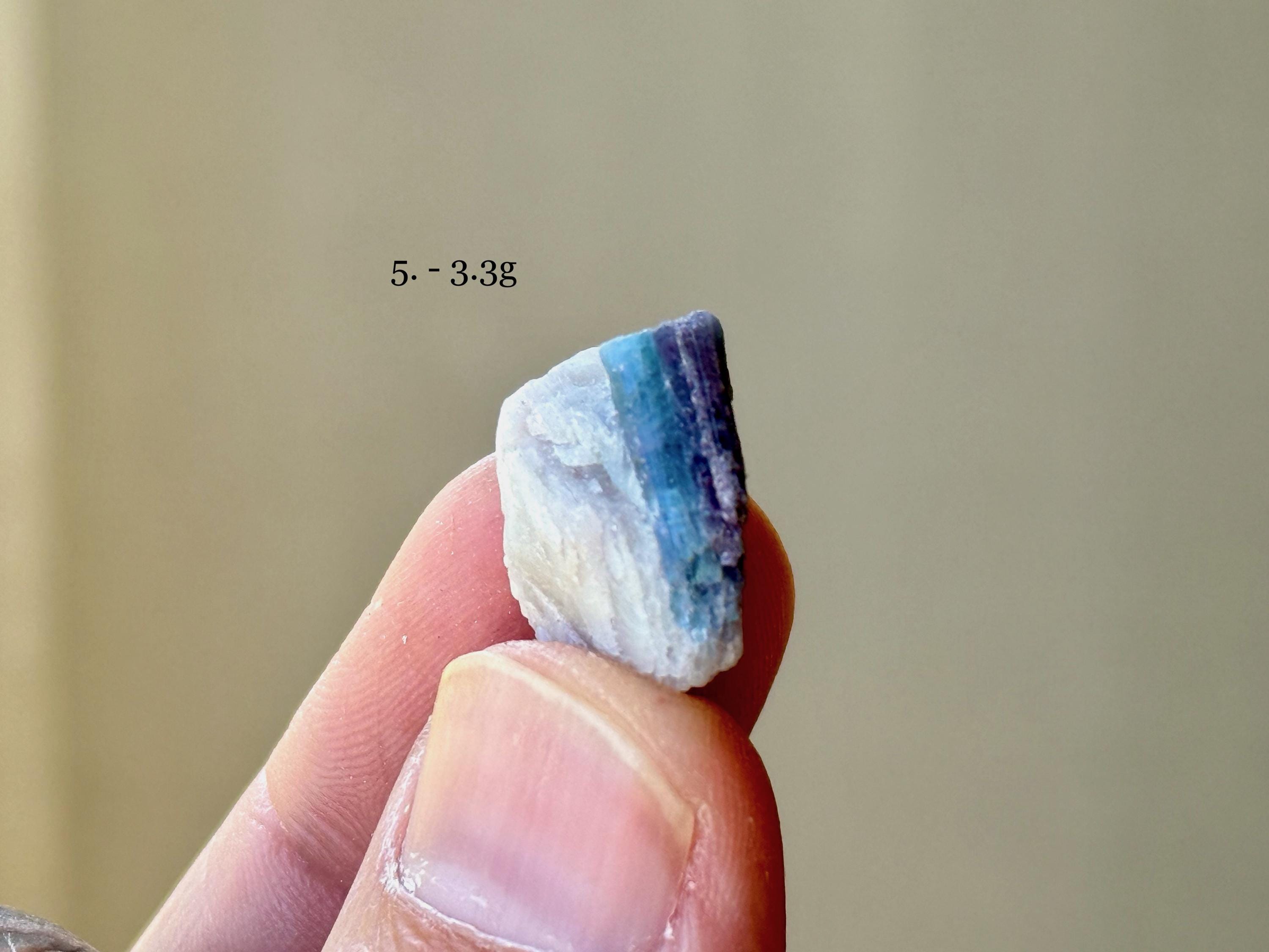 A colorful selection of small sized Paraiba Tourmalines with bicolor blue and pink hues. Most of these crystals feature partial formations, with some portion of the interior exposed. Some, though not all, may have some terminated portions. We've included photos in natural light and backlit to show off their translucency.