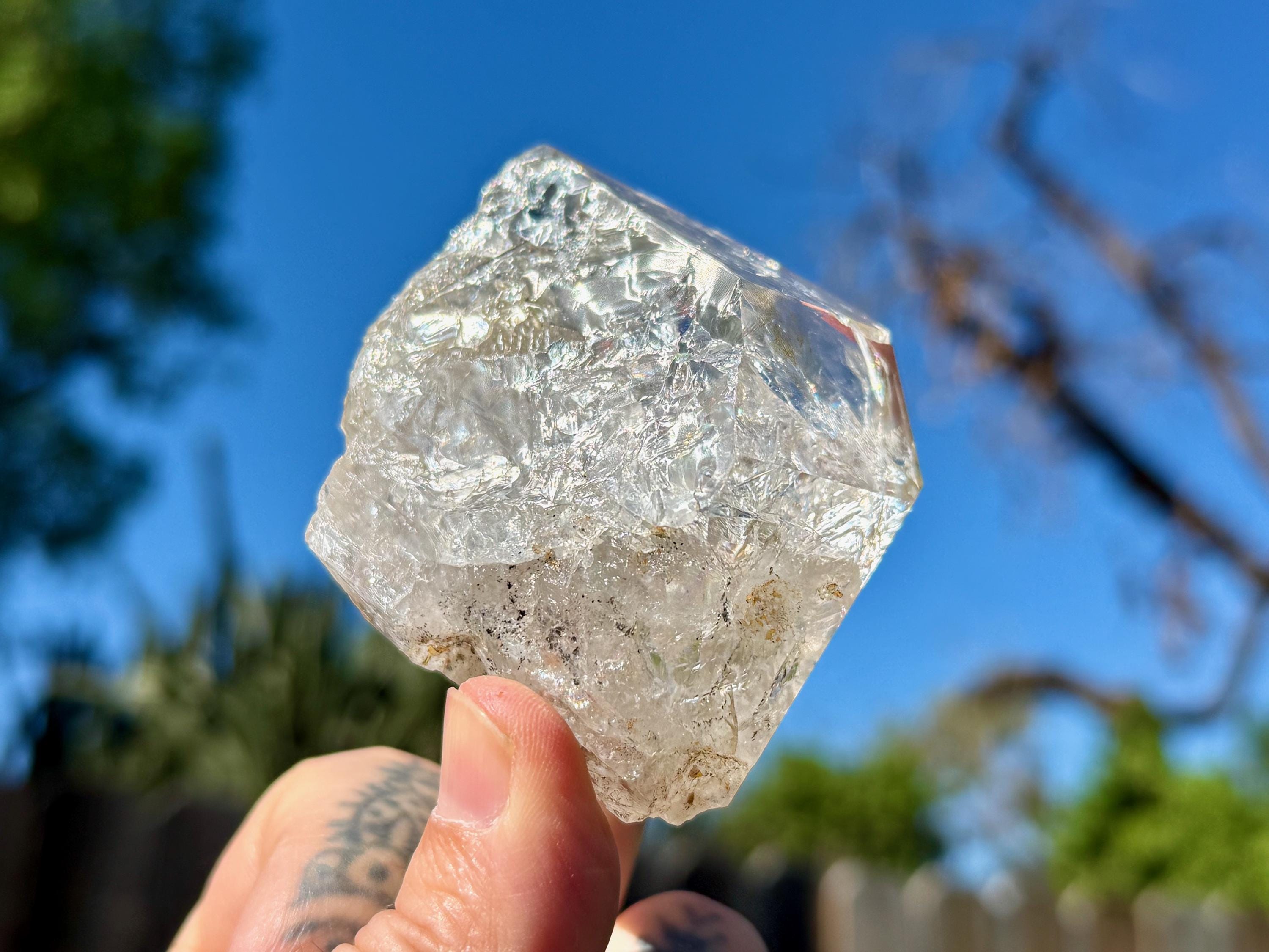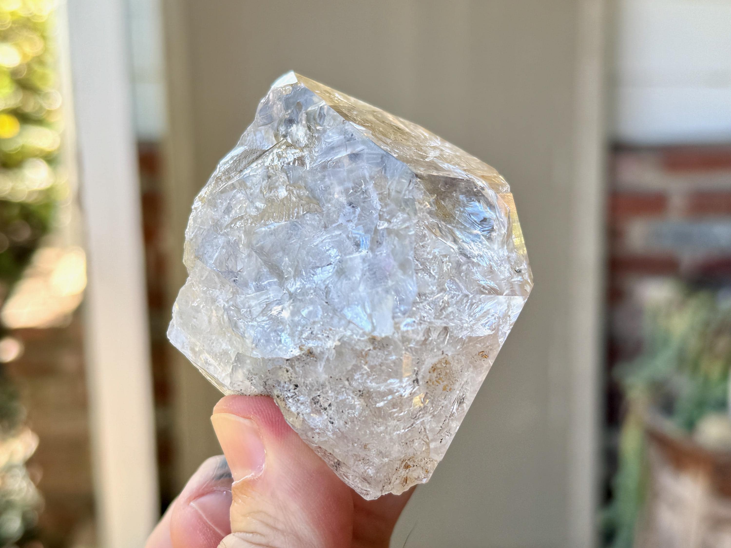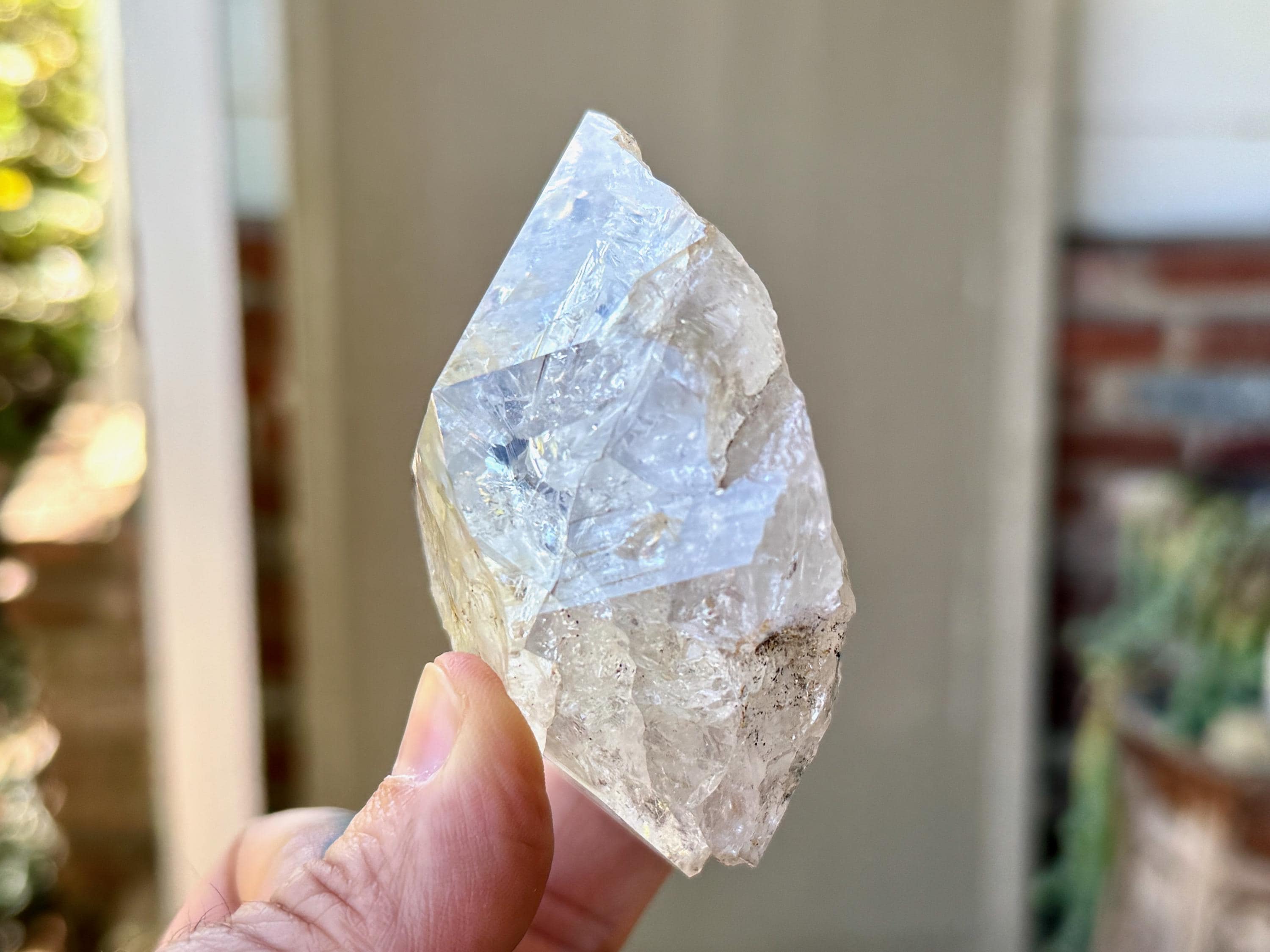 This crystal features a classic "diamond" formation and has a natural contact impression on the main facet. The entire backside is a self-healed contact area, indicating where this crystal broke in the pocket due to shifting tectonic plates and managed to heal itself. We can see a number of foil-like, self-healed indications inside the crystal as well. Self-healed crystals tend to have powerful healing energies.