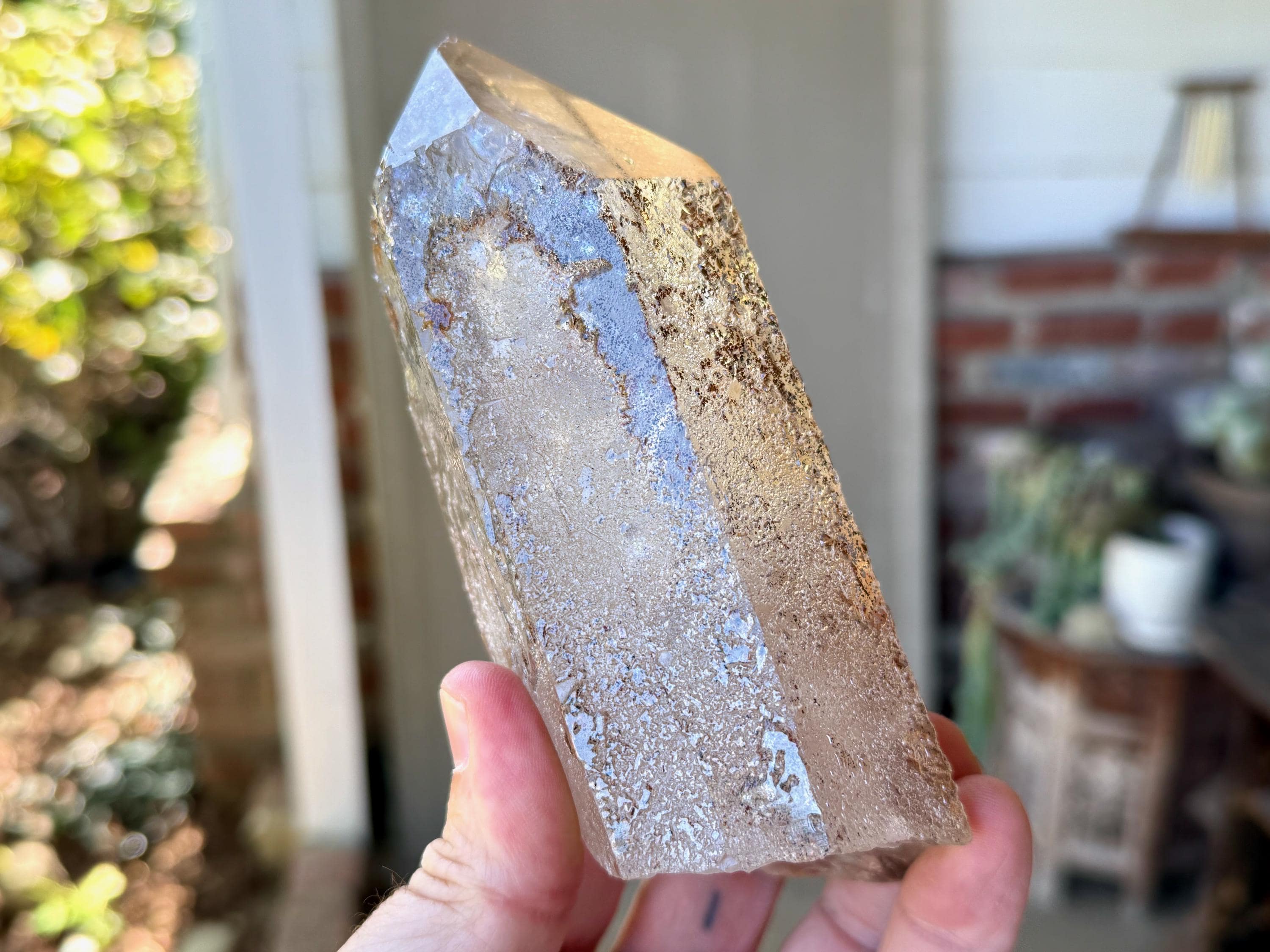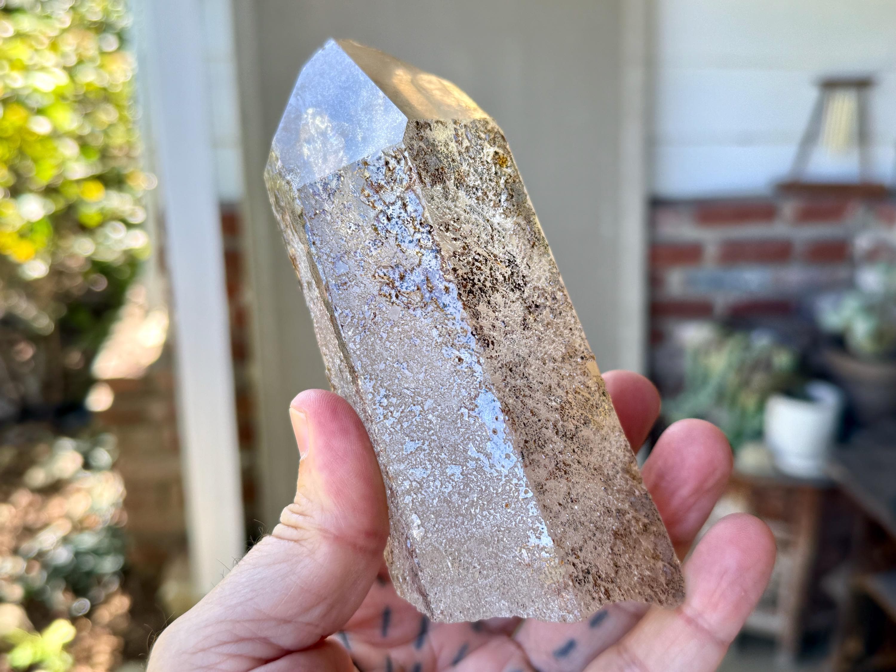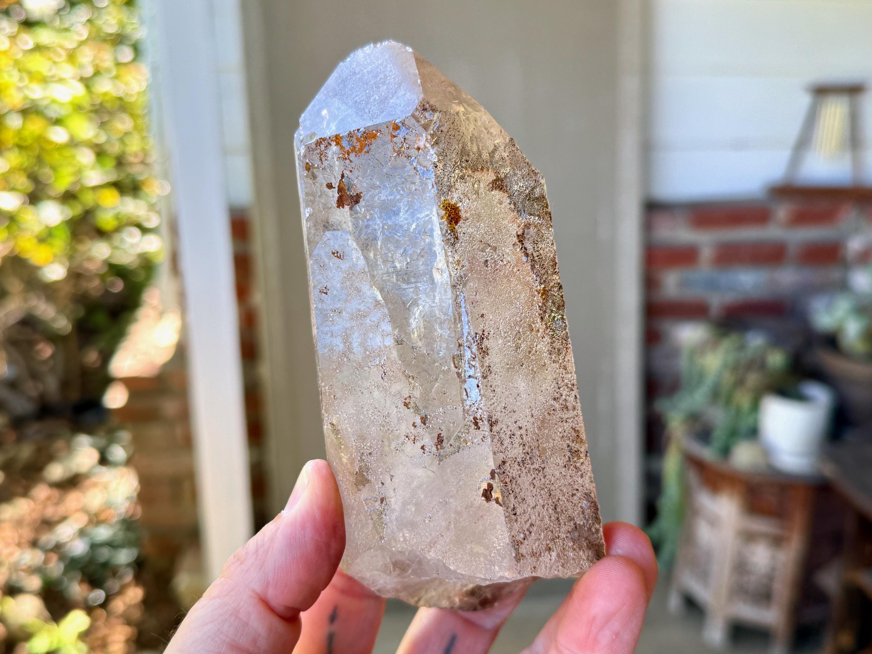 Gorgeous clarity and luster to this large Quartz crystal point with an array of black and orange speckled Hematite inclusions throughout.