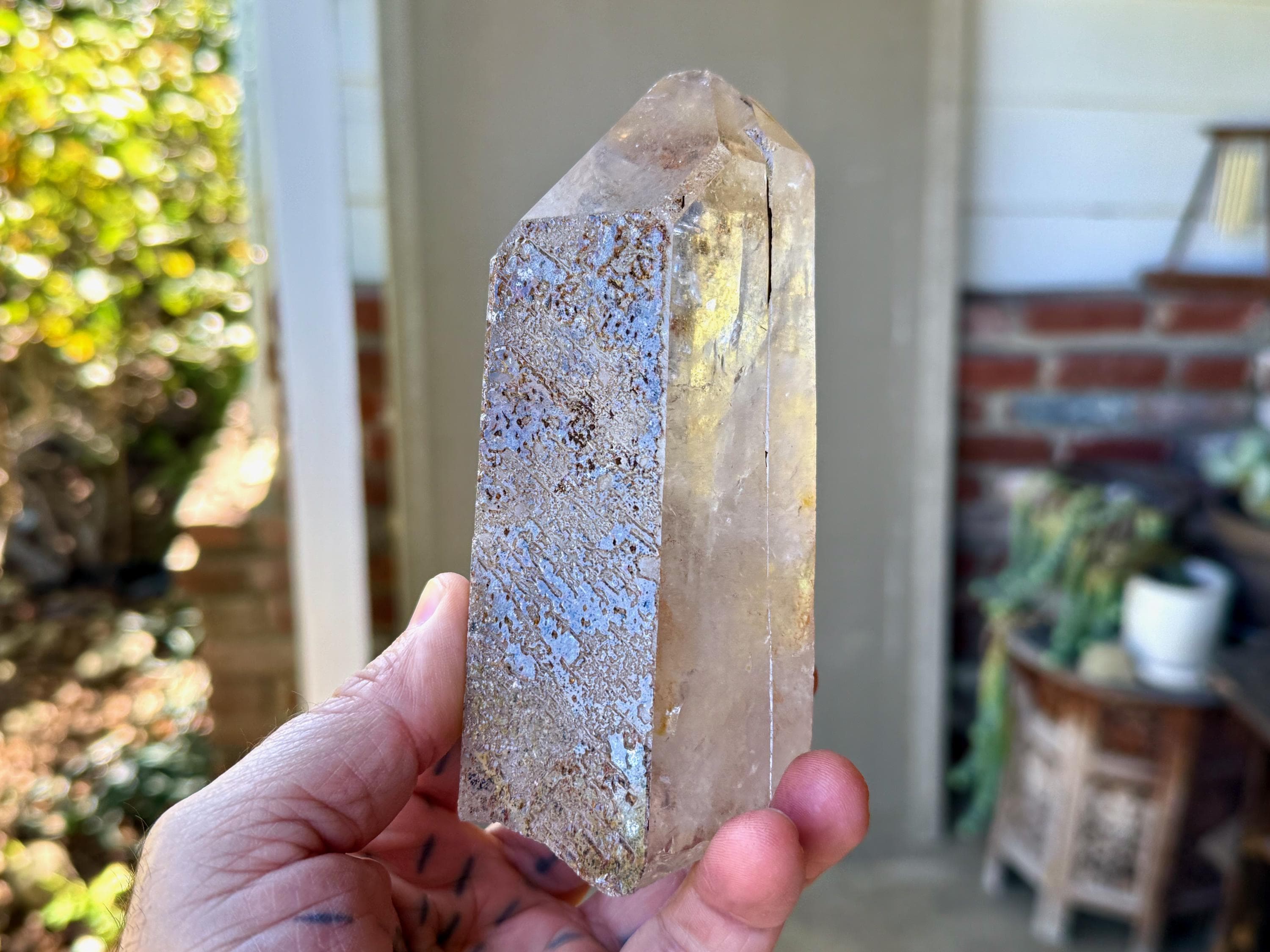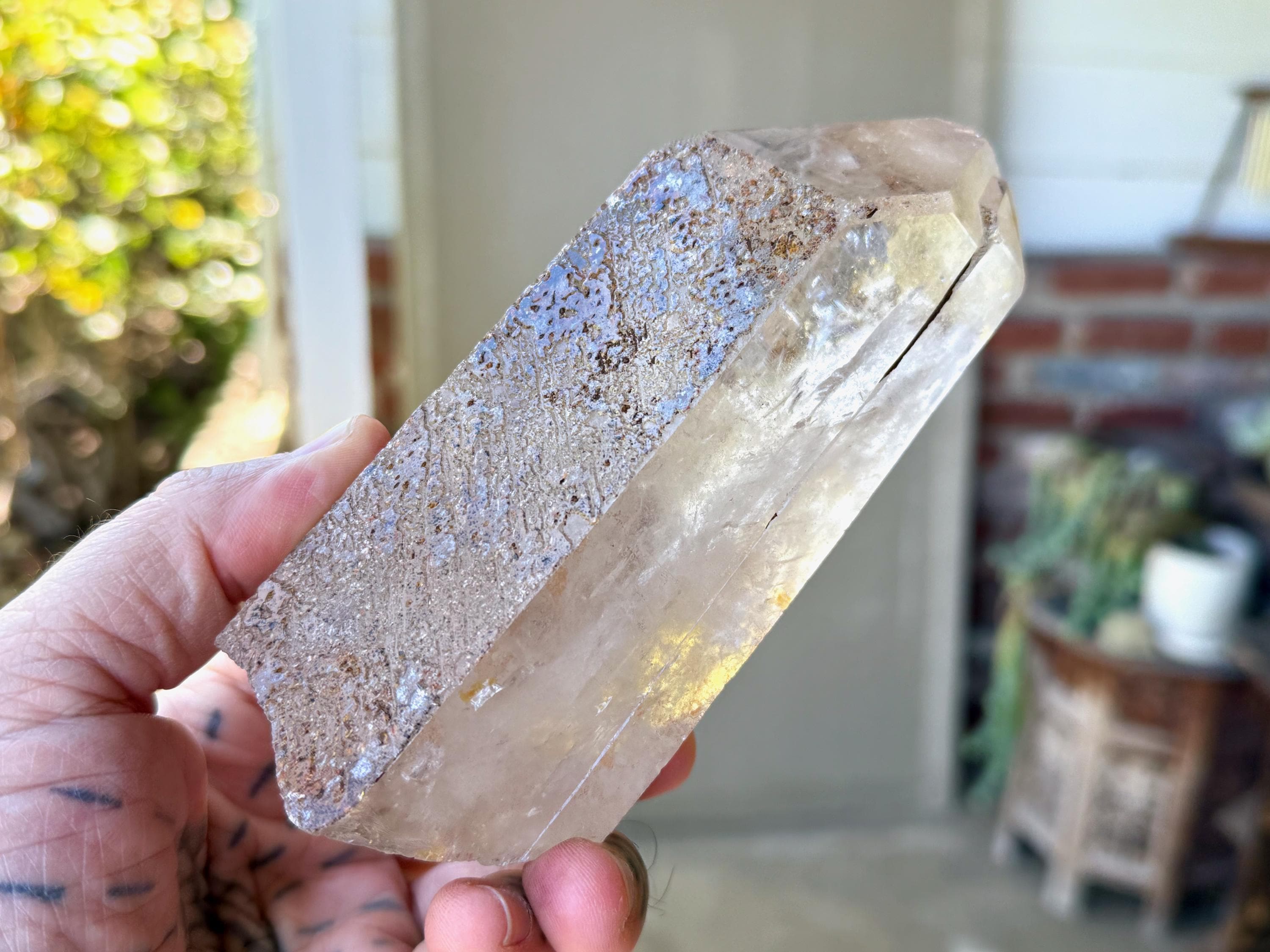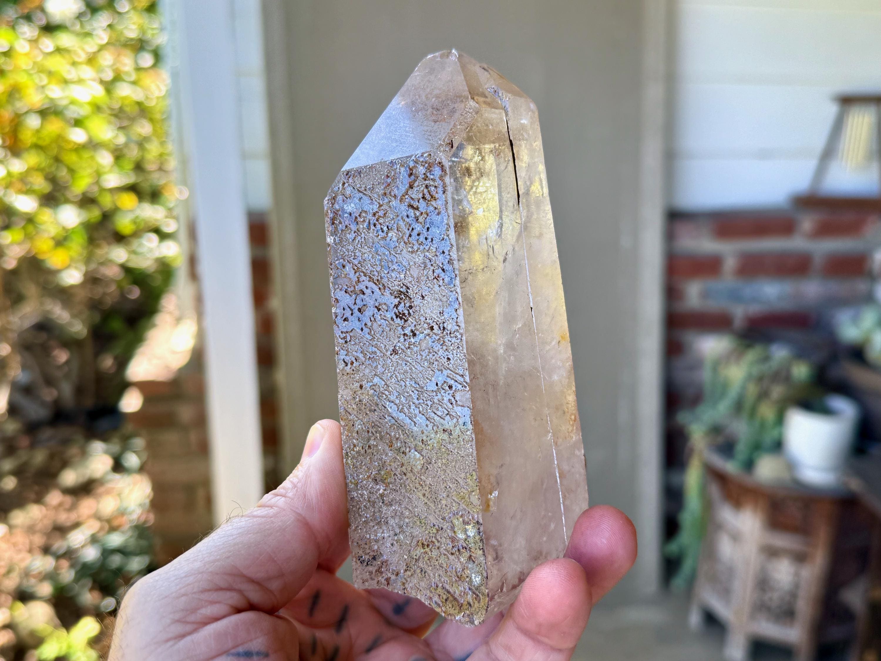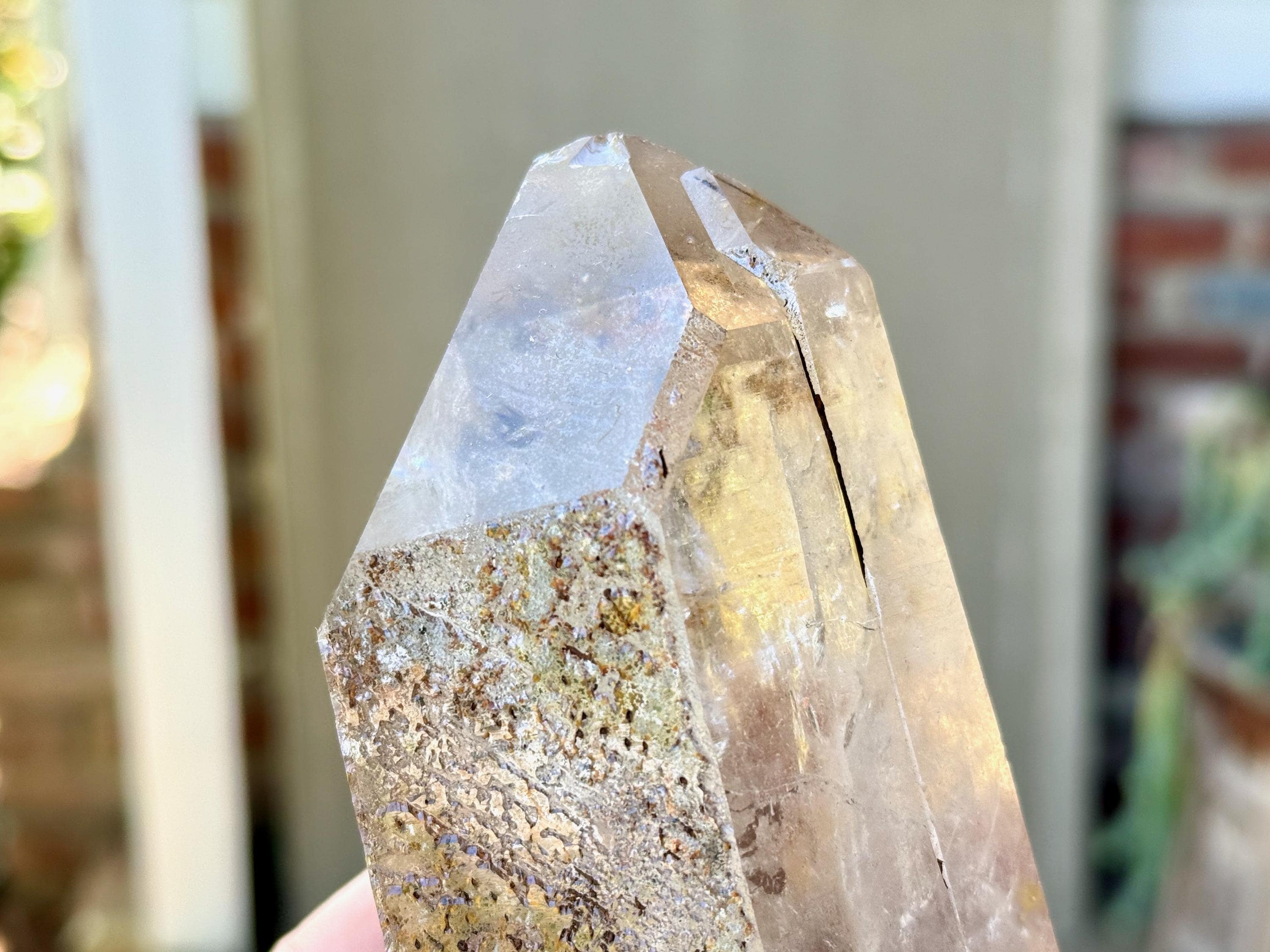 Gorgeous clarity and luster to this large Quartz crystal point with an array of black and orange speckled Hematite inclusions throughout.