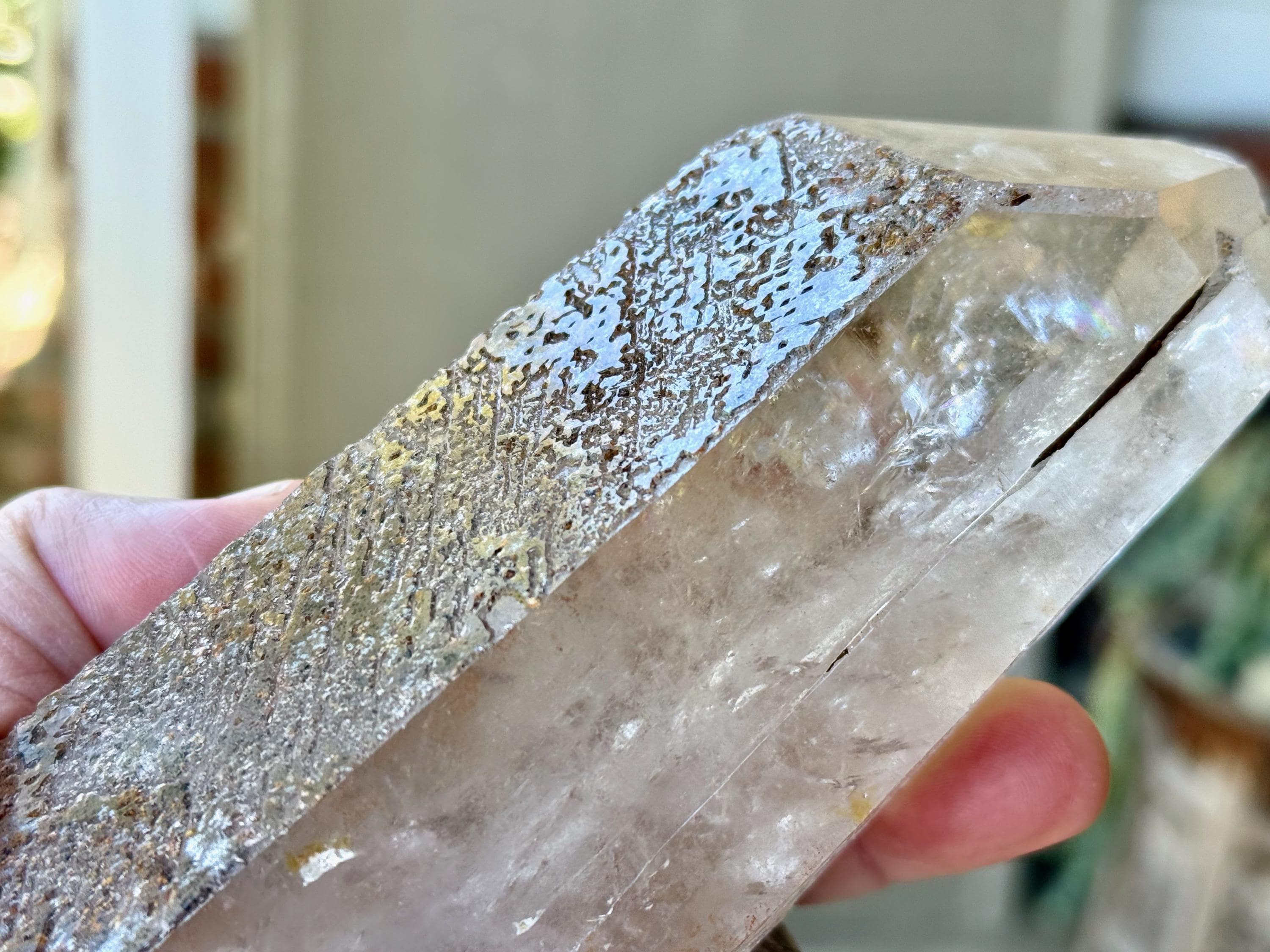 If we look closely, we'll also see that this crystal has beautifully patterned etched textures on its sides (see Photo 3). While we didn't catch them in the photos here, there are a number of small, flashing rainbows in the main facet area.