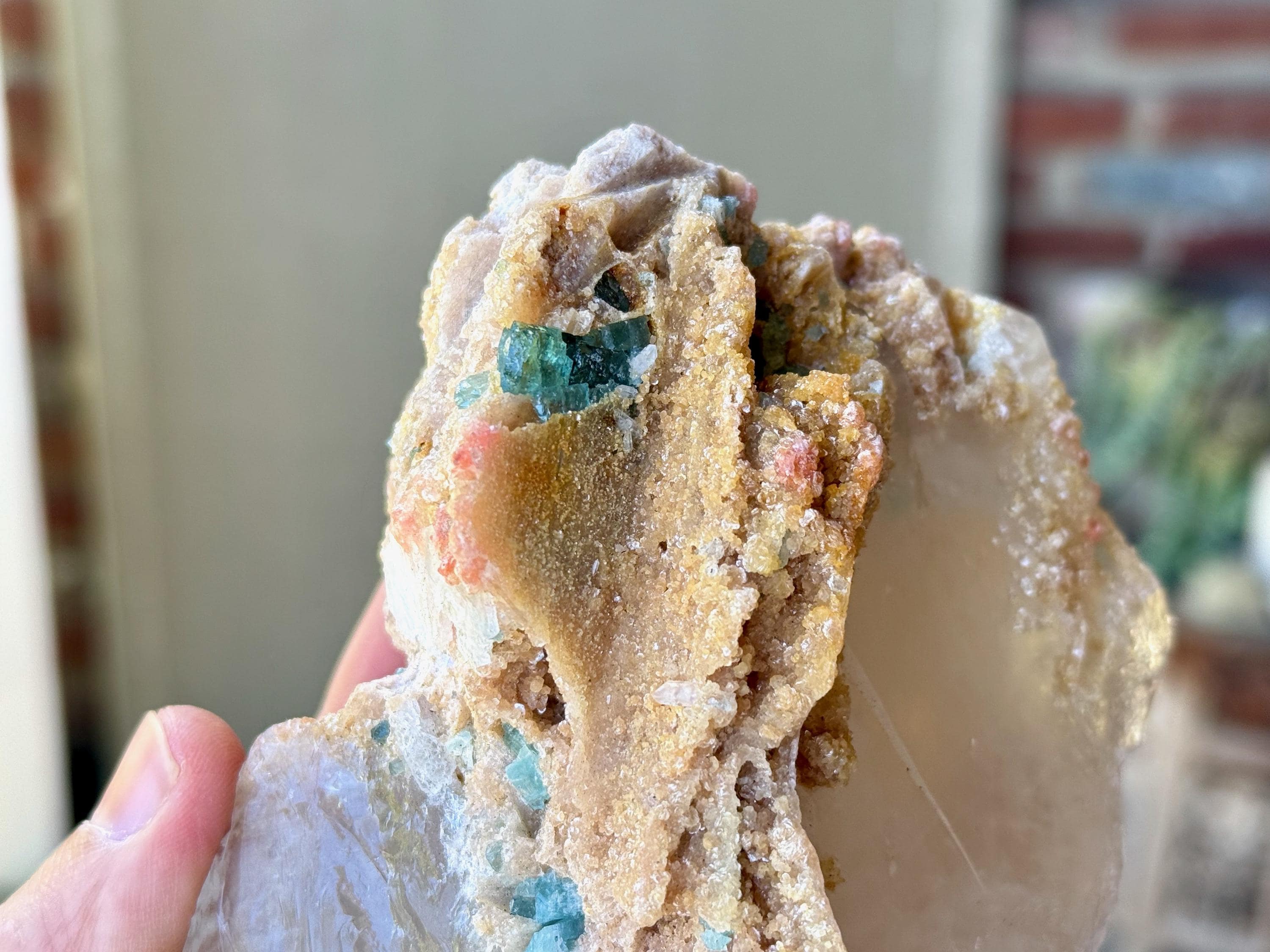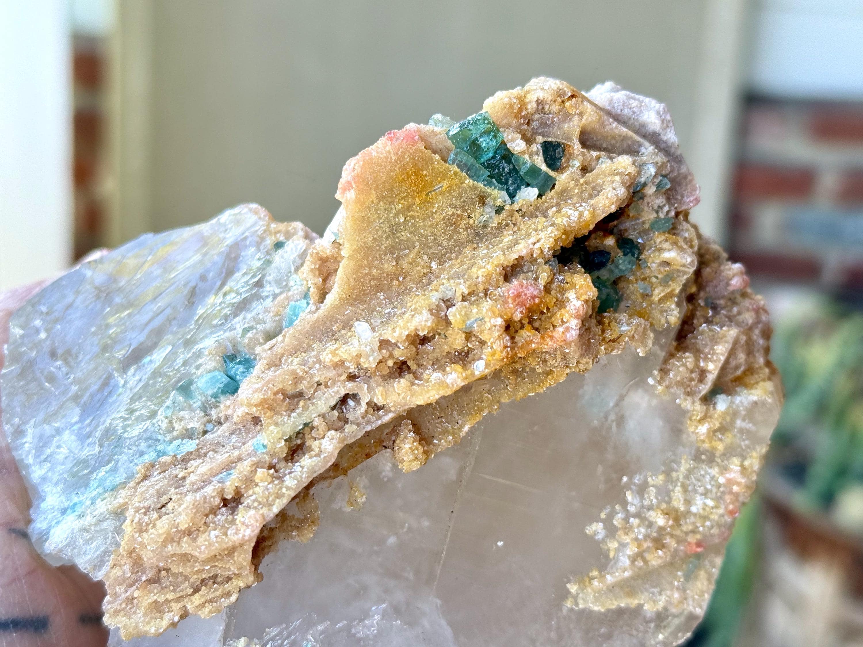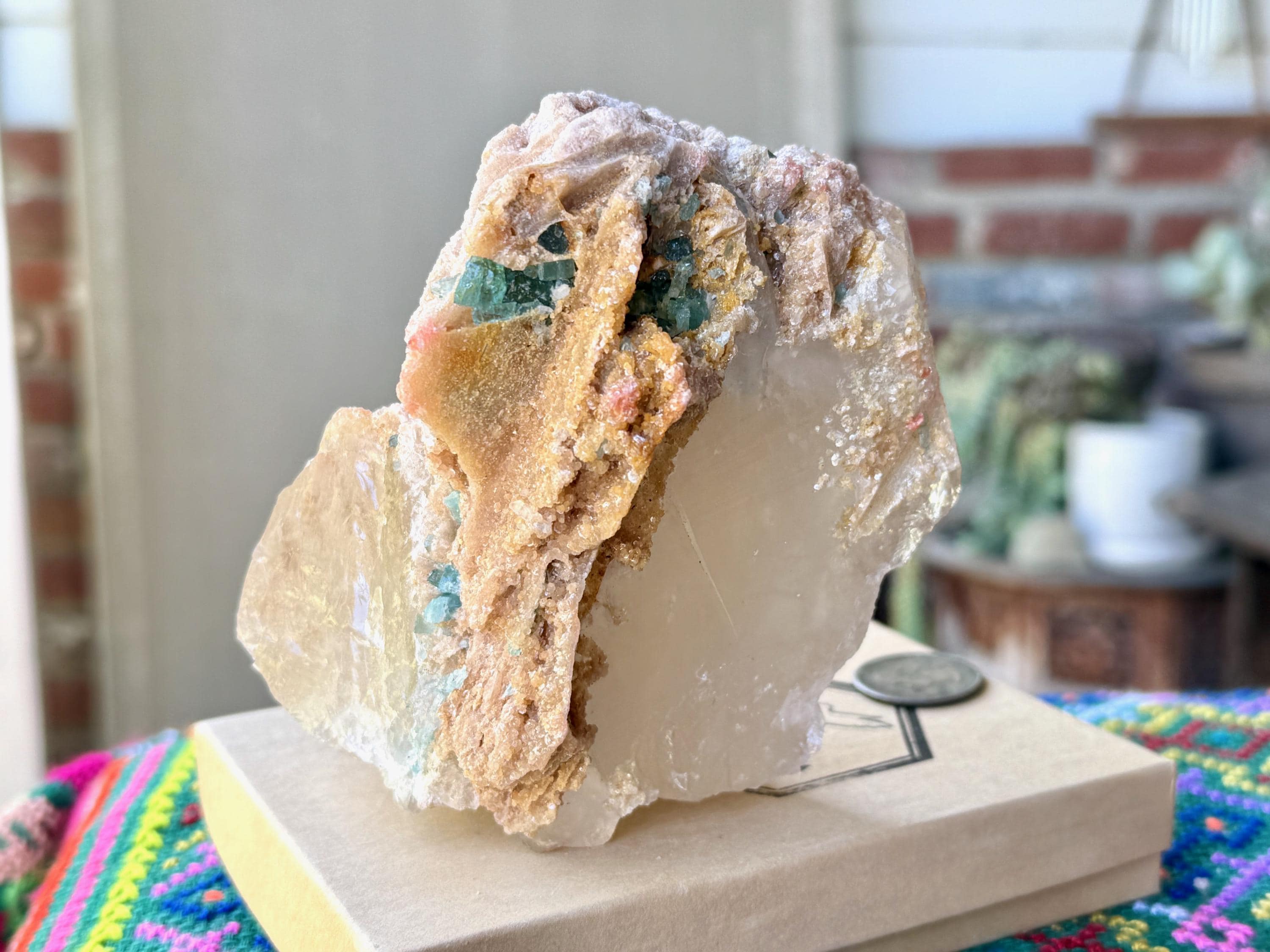 Stunning beauty to this gorgeous Unicorn Stone Quartz crystal, encrusted with sandy Golden Mica and embedded with vibrant Blue-Green Tourmaline. The color of the Tourmaline is very striking and characteristic of the colors we've seen coming from this region.