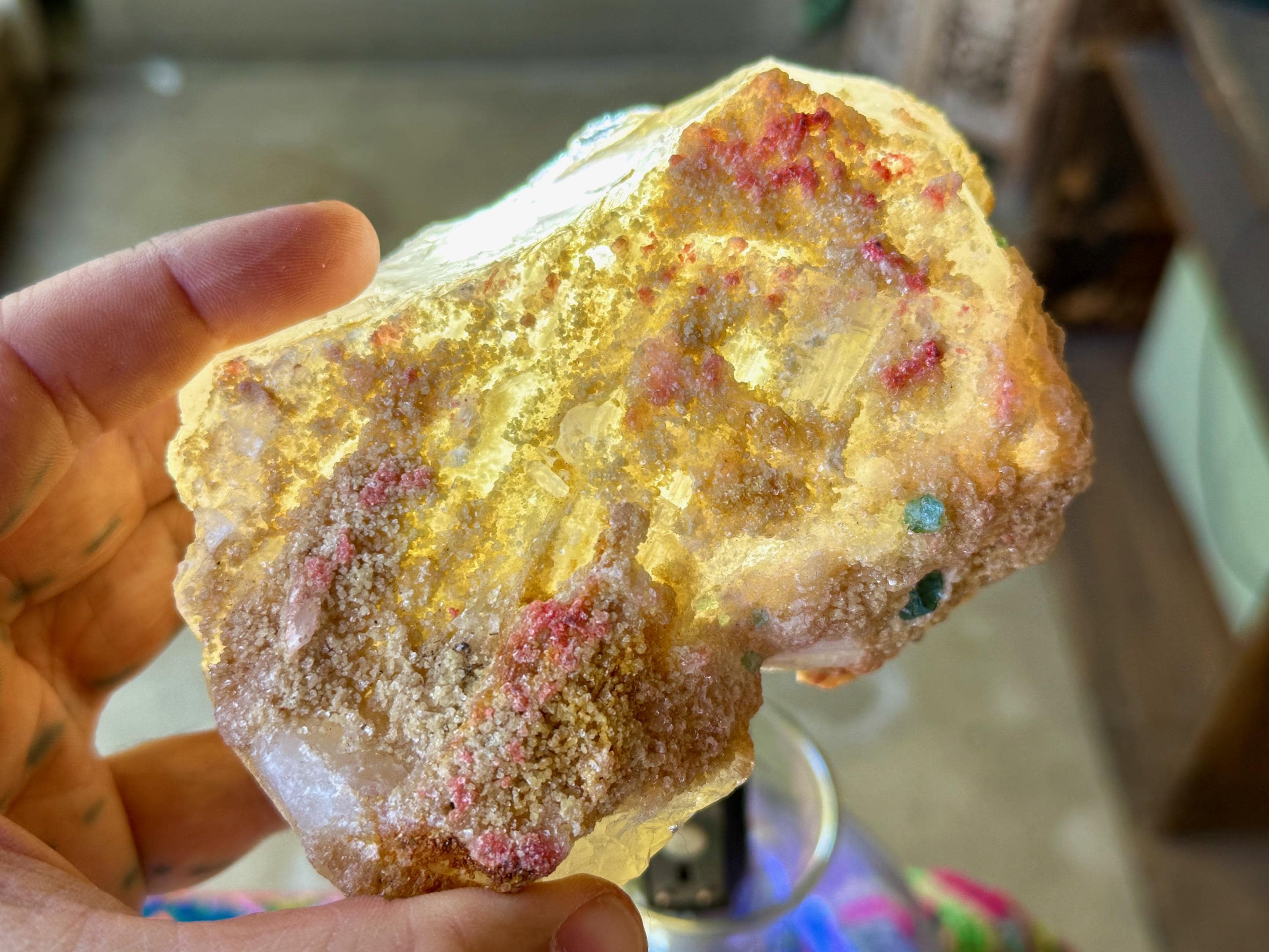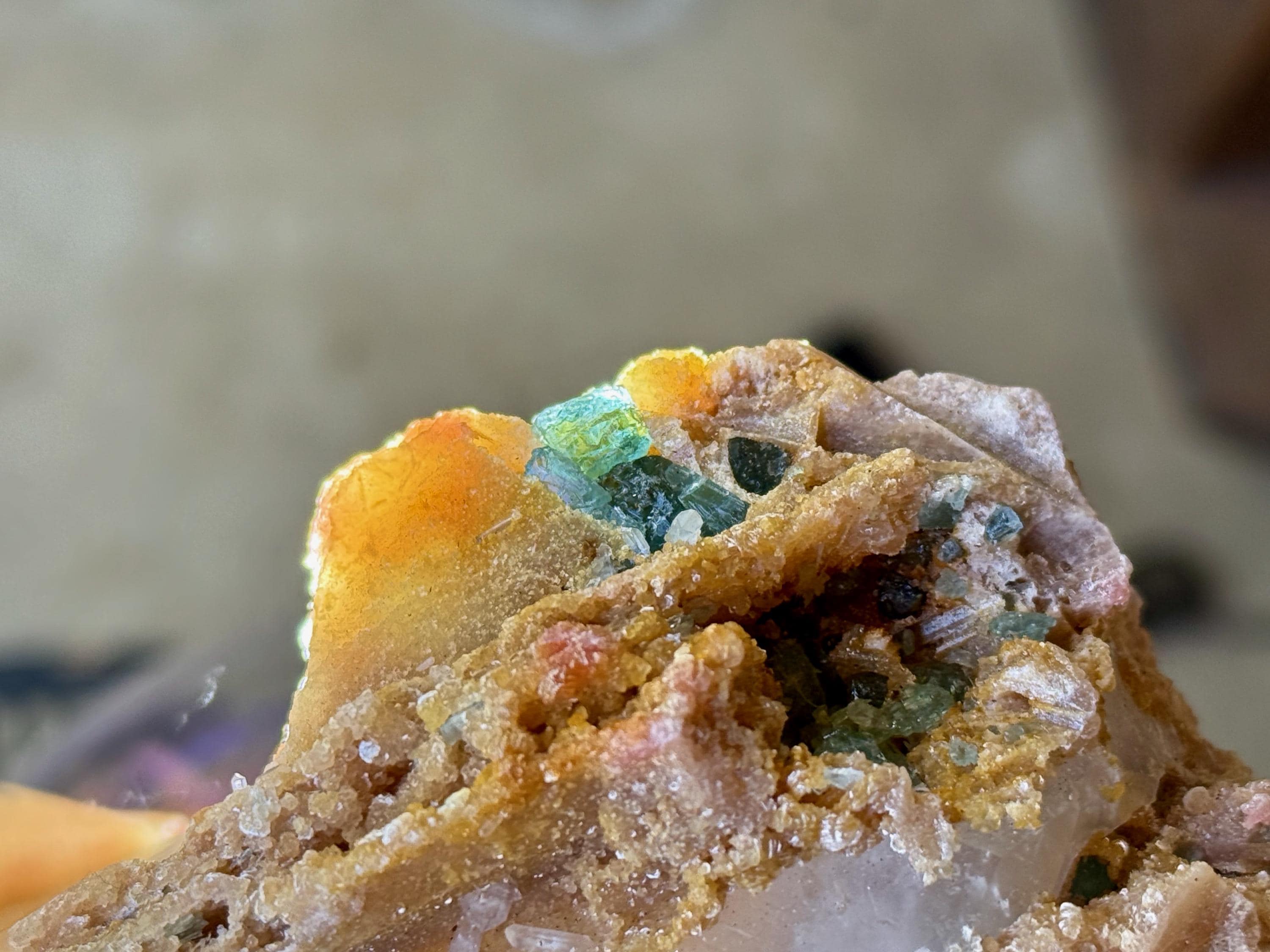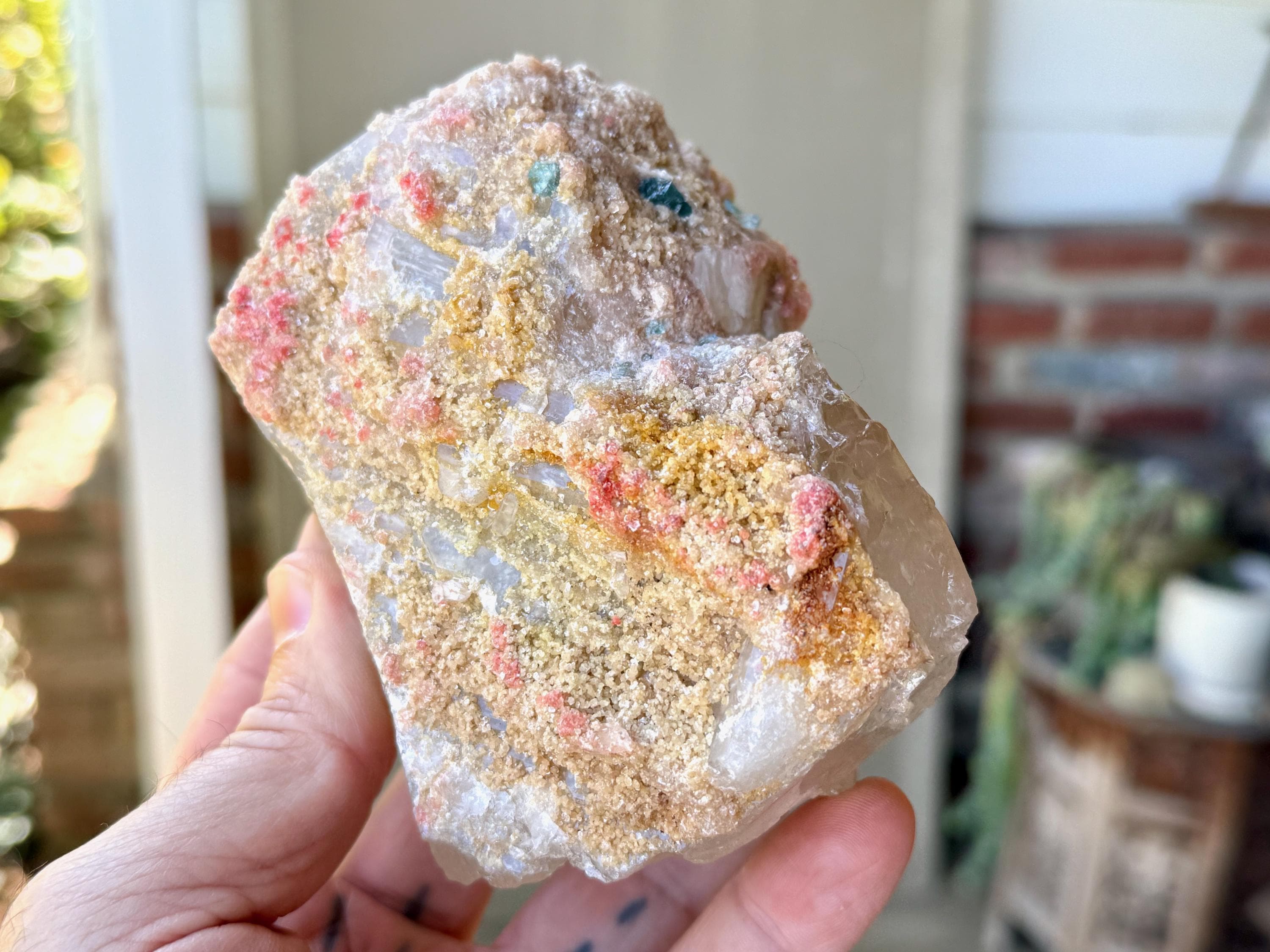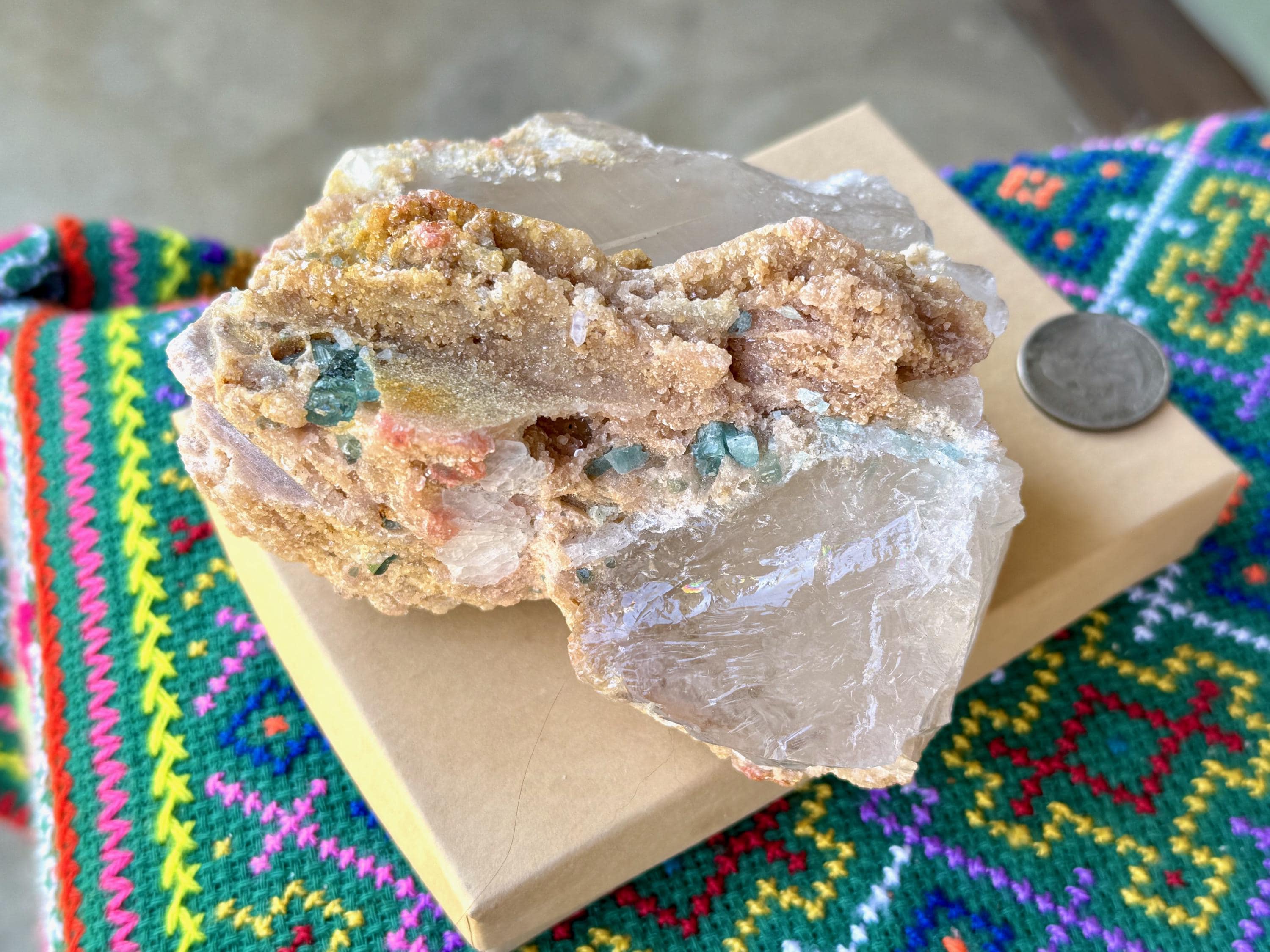 Stunning beauty to this gorgeous Unicorn Stone Quartz crystal, encrusted with sandy Golden Mica and embedded with vibrant Blue-Green Tourmaline. The color of the Tourmaline is very striking and characteristic of the colors we've seen coming from this region.