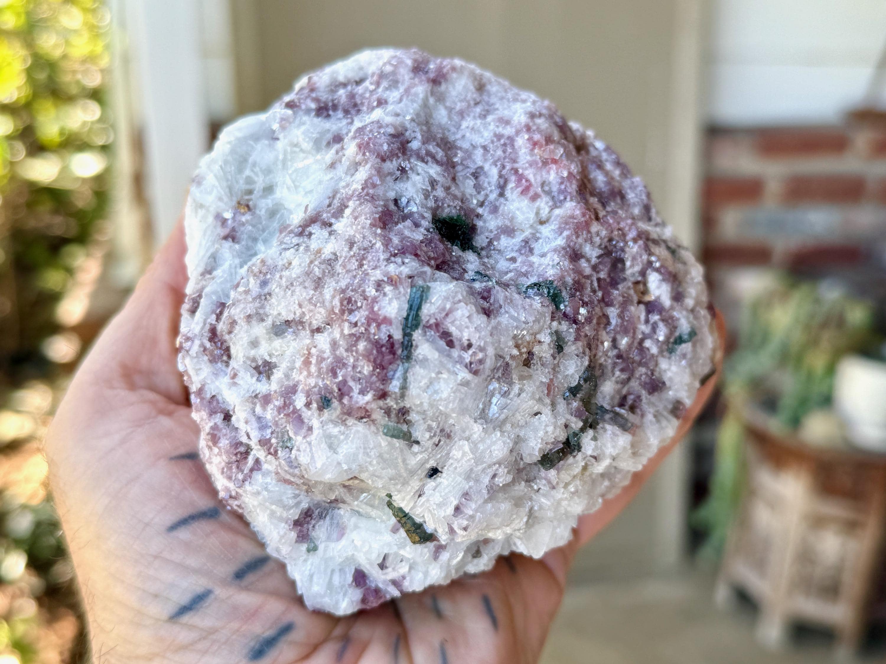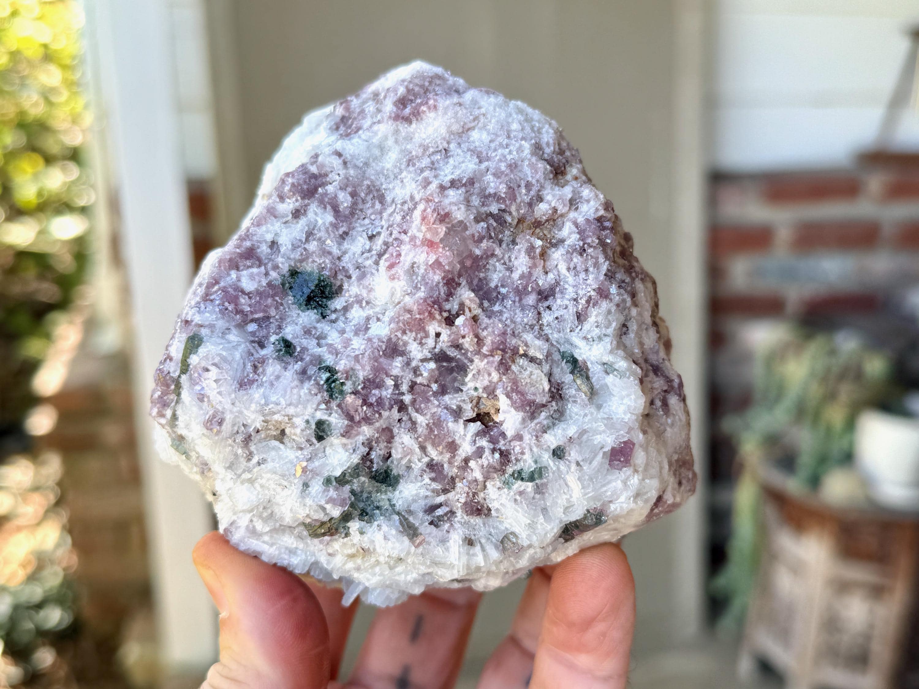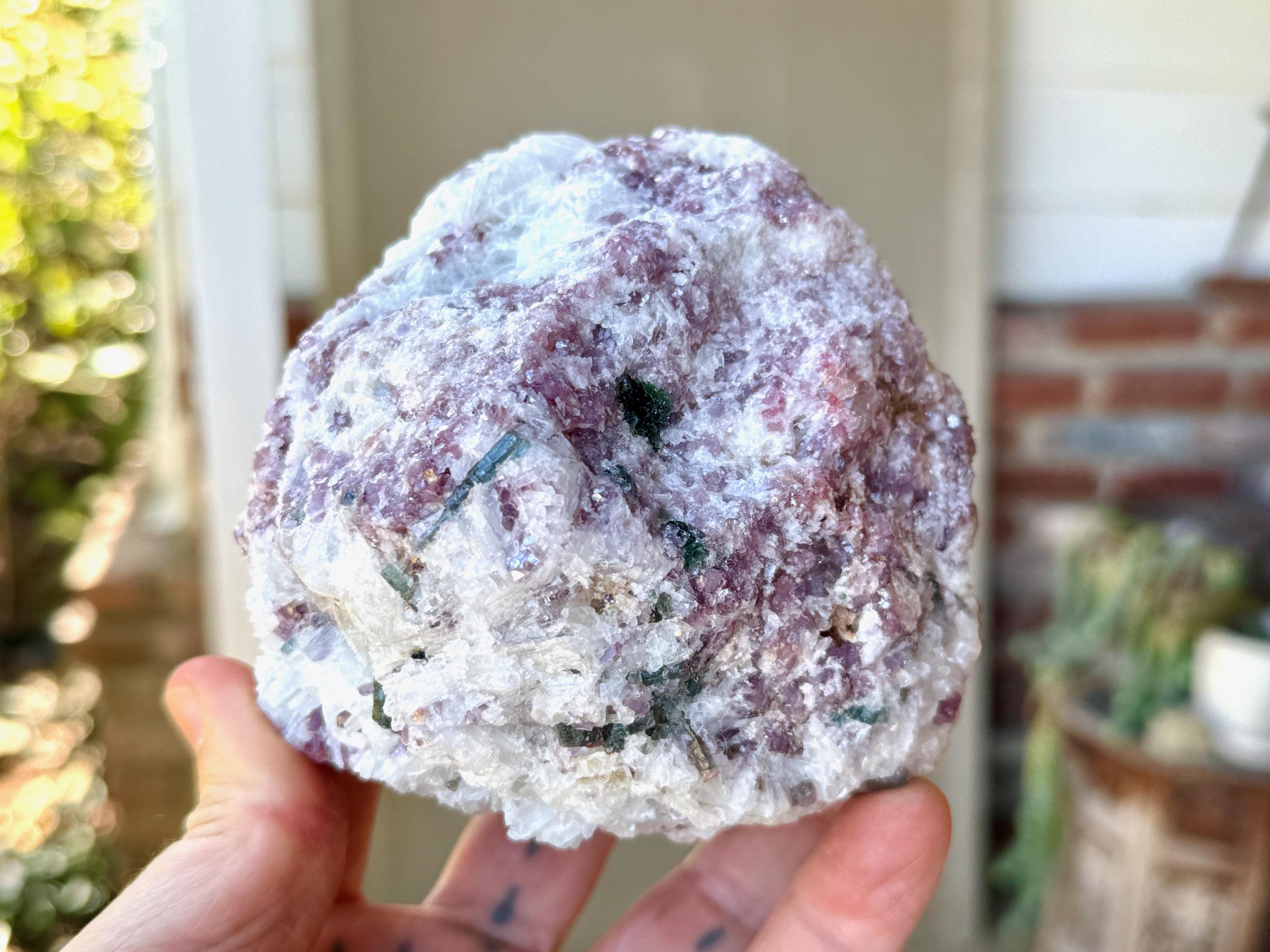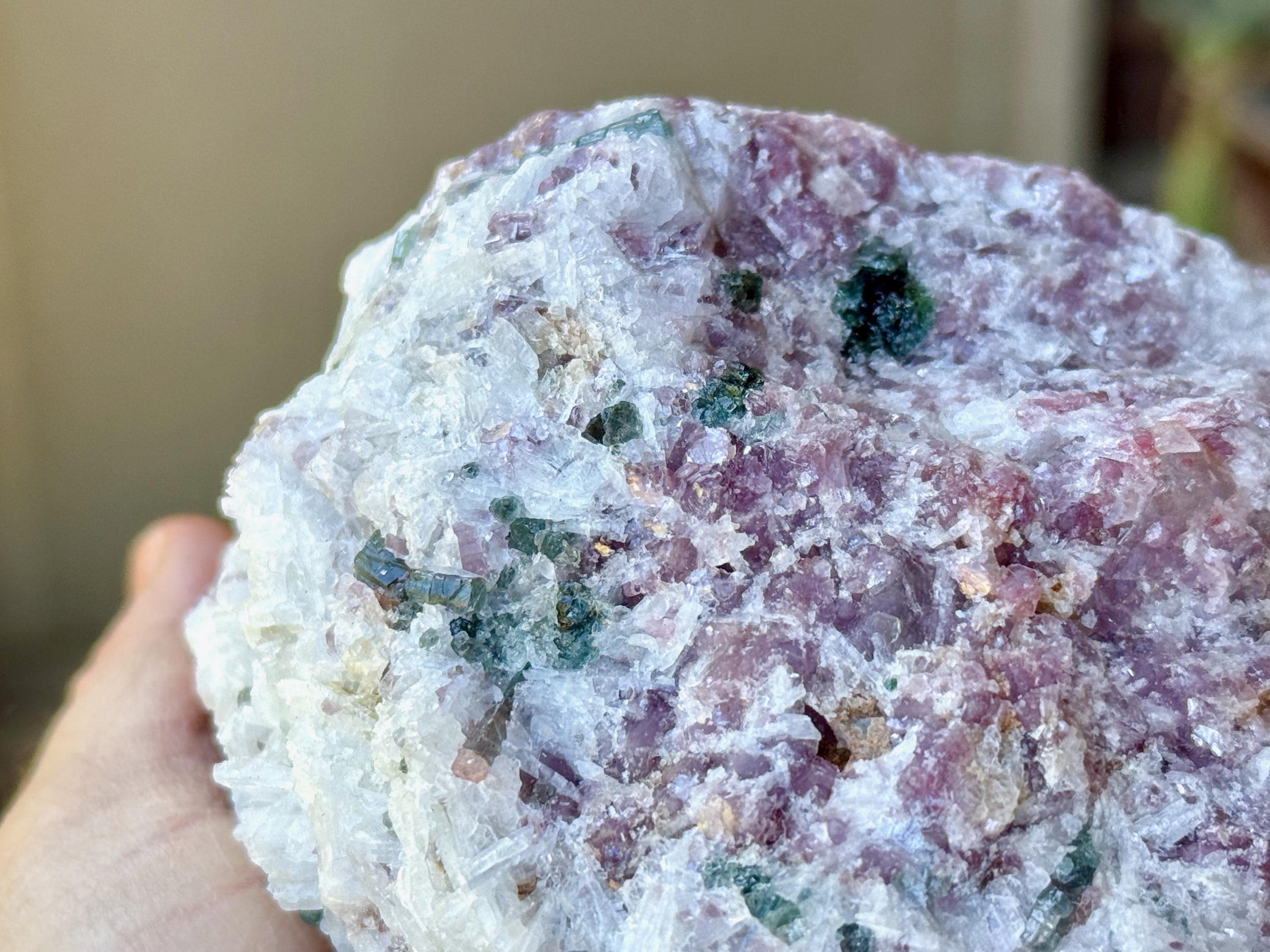 A beautiful white and purple snowball of a crystal! This is a large and chunky Unicorn Stone with such sweetness and a vibrant array of colors. It is a combination of Quartz and Cleavelandite with Purple Lepidolite and inclusions of dark Green Tourmaline throughout. There is lots of "sparkle" to this piece, as the Lepidolite and Cleavelandite have lots of luster. It's just so perfect and the bottom is naturally flat so this one sits so nicely for display (see Photos 3-4). So beautiful!