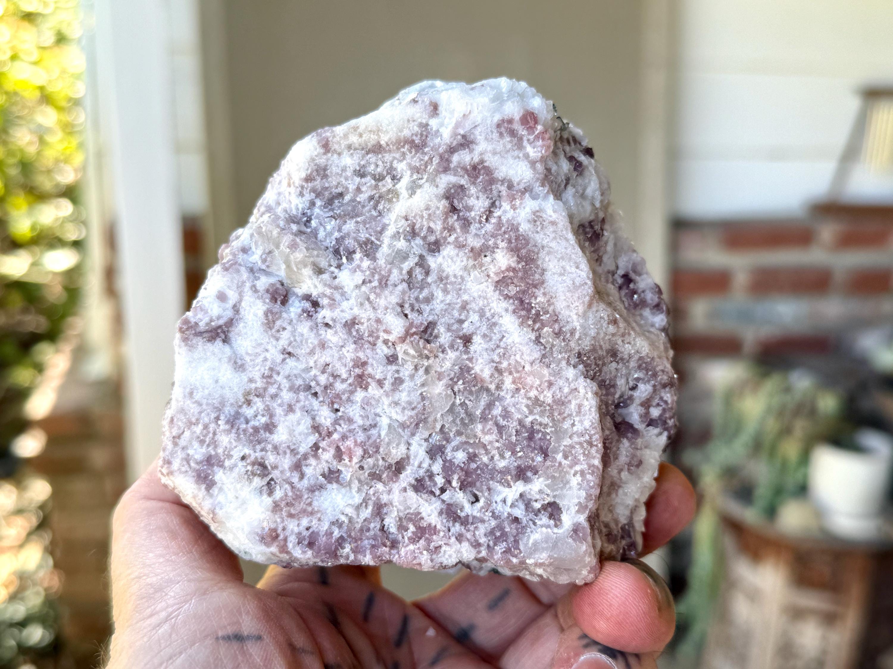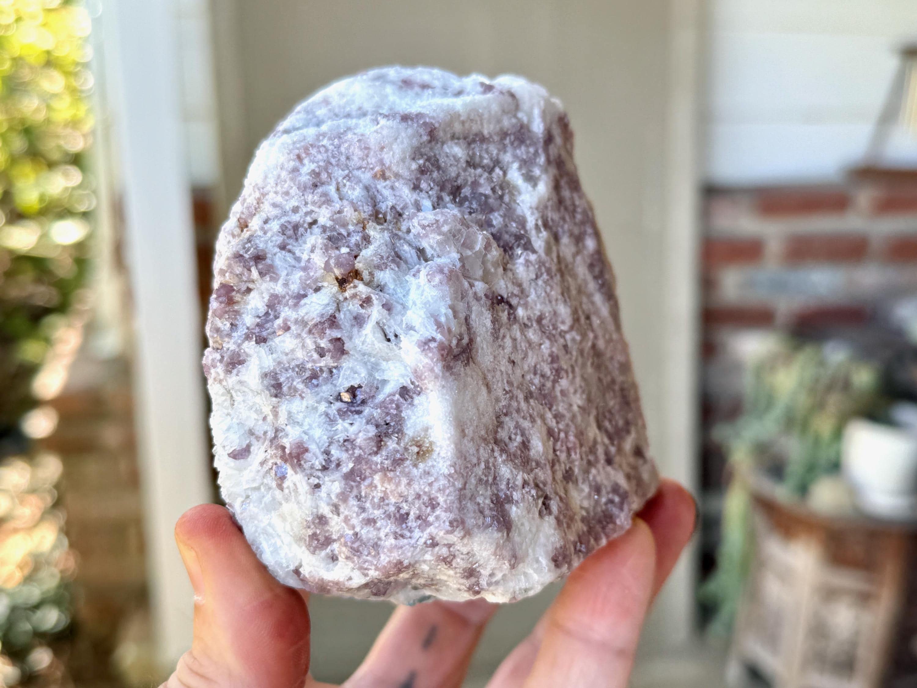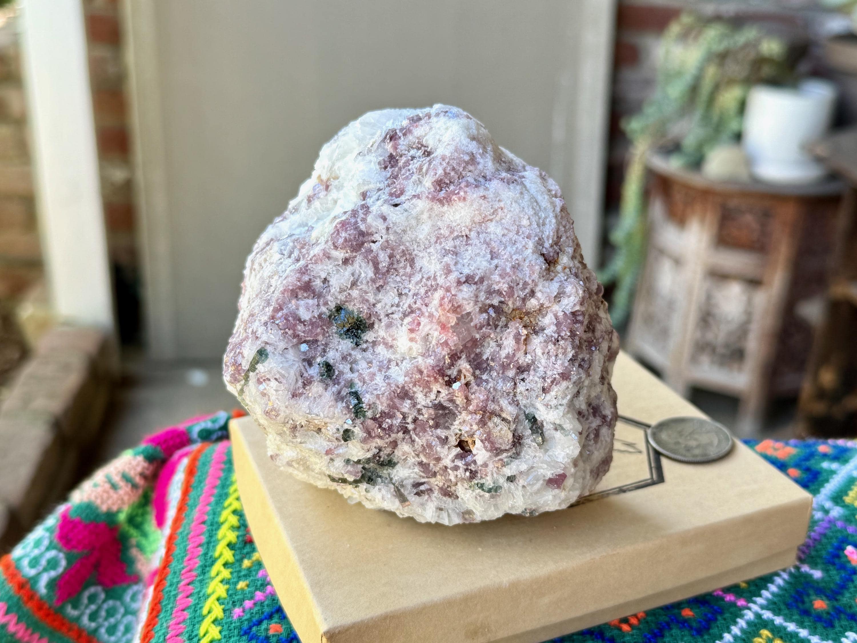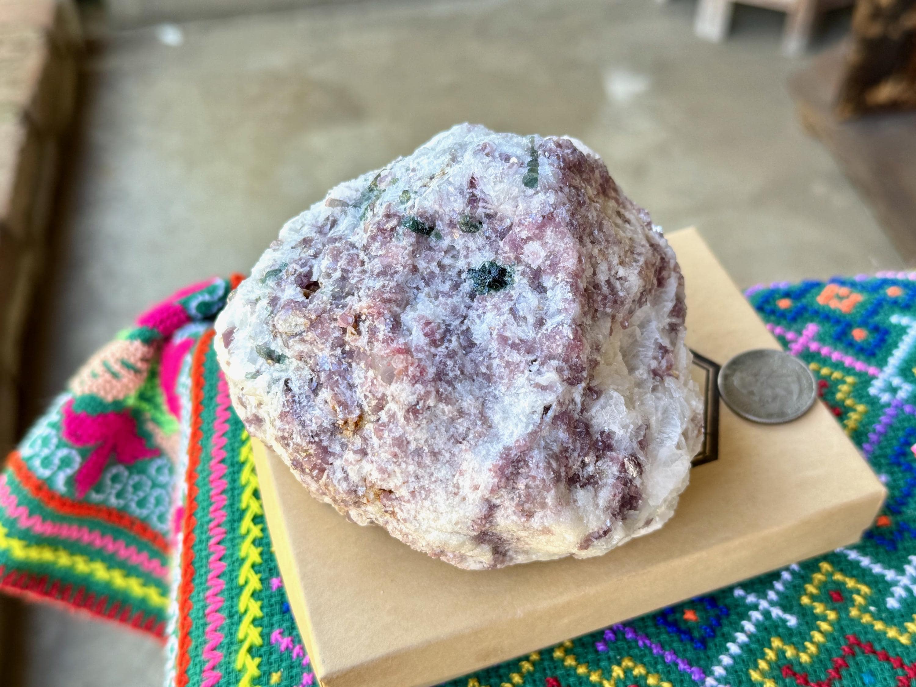 A beautiful white and purple snowball of a crystal! This is a large and chunky Unicorn Stone with such sweetness and a vibrant array of colors. It is a combination of Quartz and Cleavelandite with Purple Lepidolite and inclusions of dark Green Tourmaline throughout. There is lots of "sparkle" to this piece, as the Lepidolite and Cleavelandite have lots of luster. It's just so perfect and the bottom is naturally flat so this one sits so nicely for display (see Photos 3-4). So beautiful!