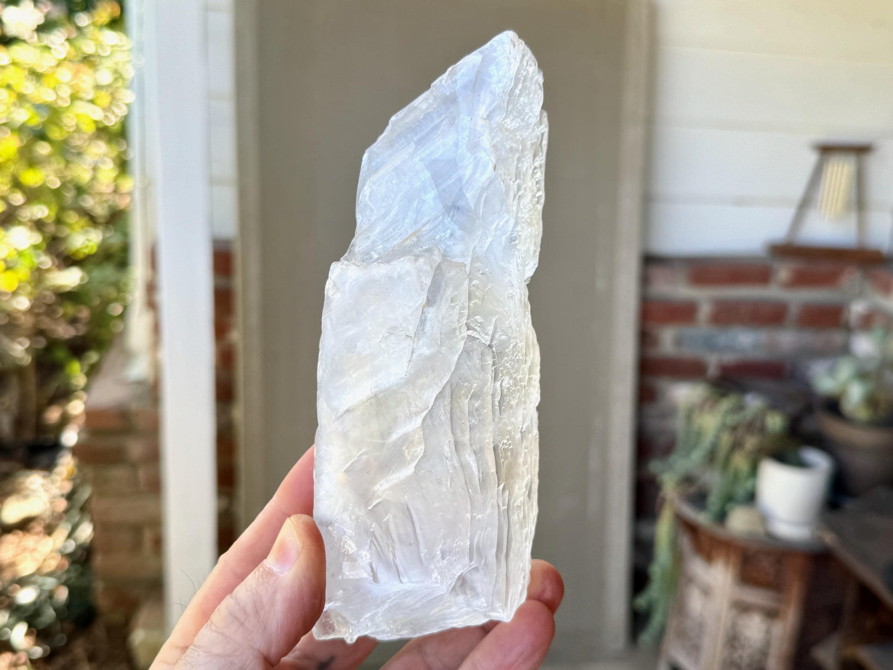 Spectacular, icy luster to this brilliant Selenite crystal in a layered formation, with so many natural etchings and crevices throughout. This piece has a broad and flat underside that allows it to sit nicely for display (Photo 3). Outstanding quality to this one!