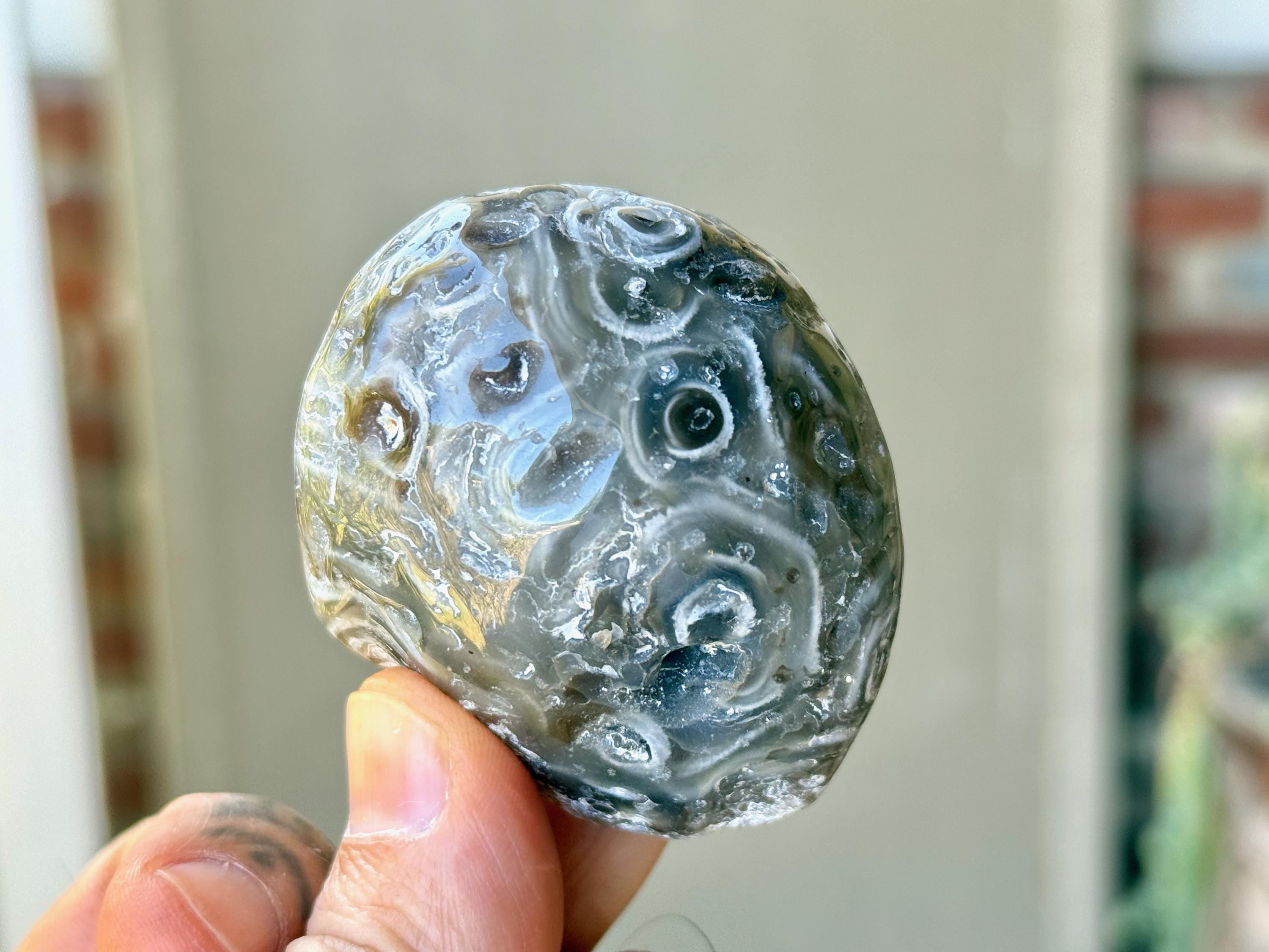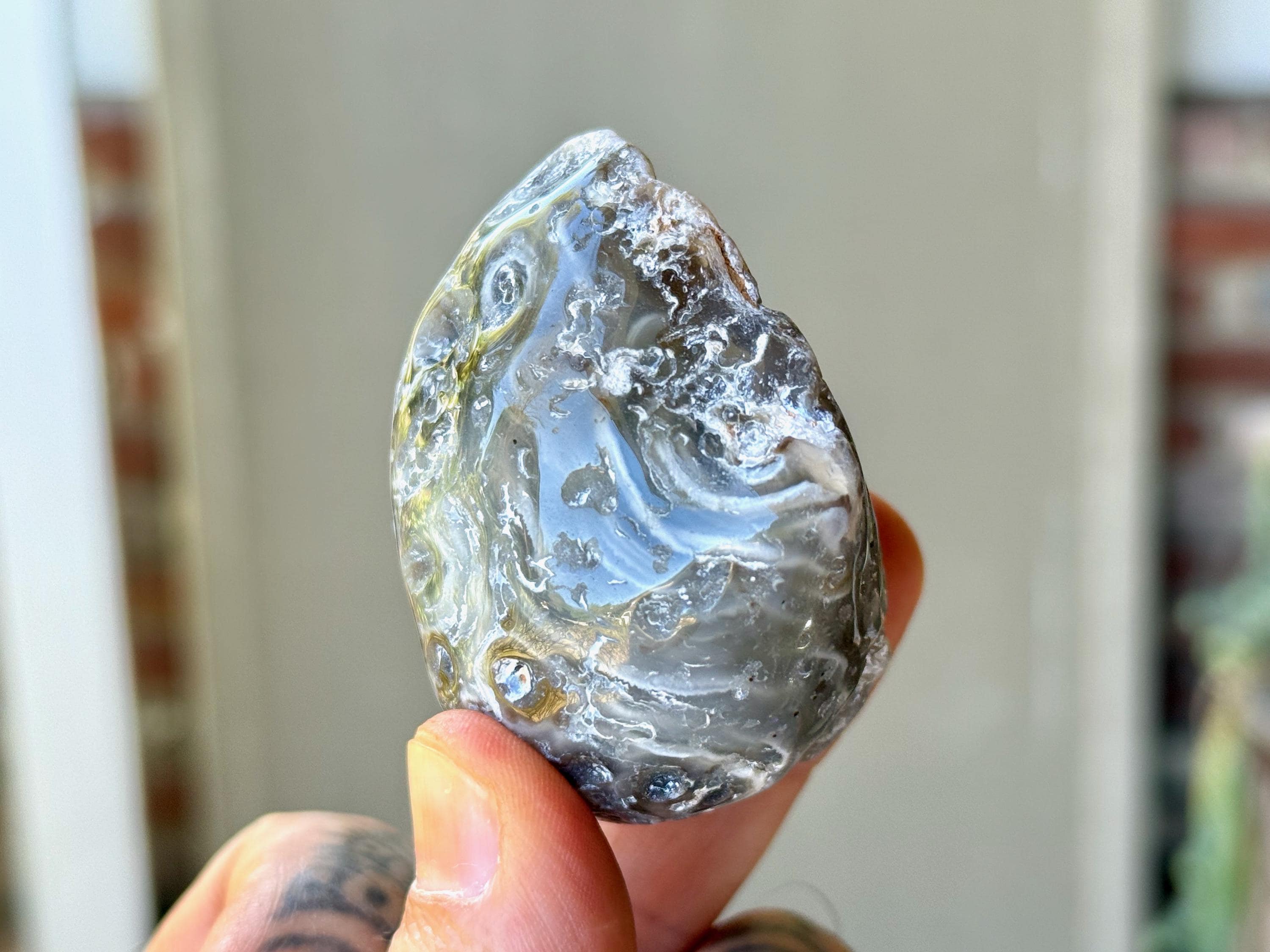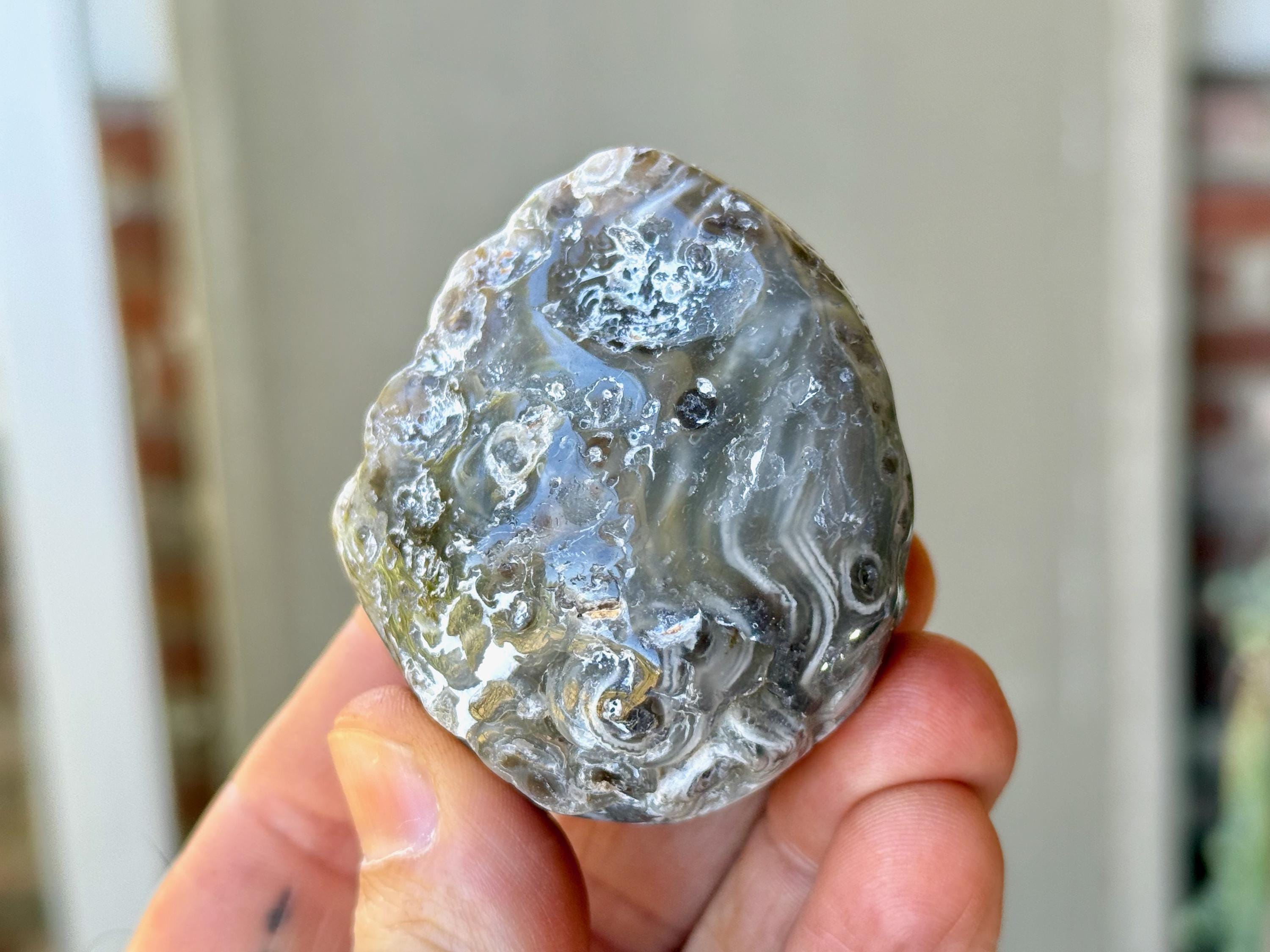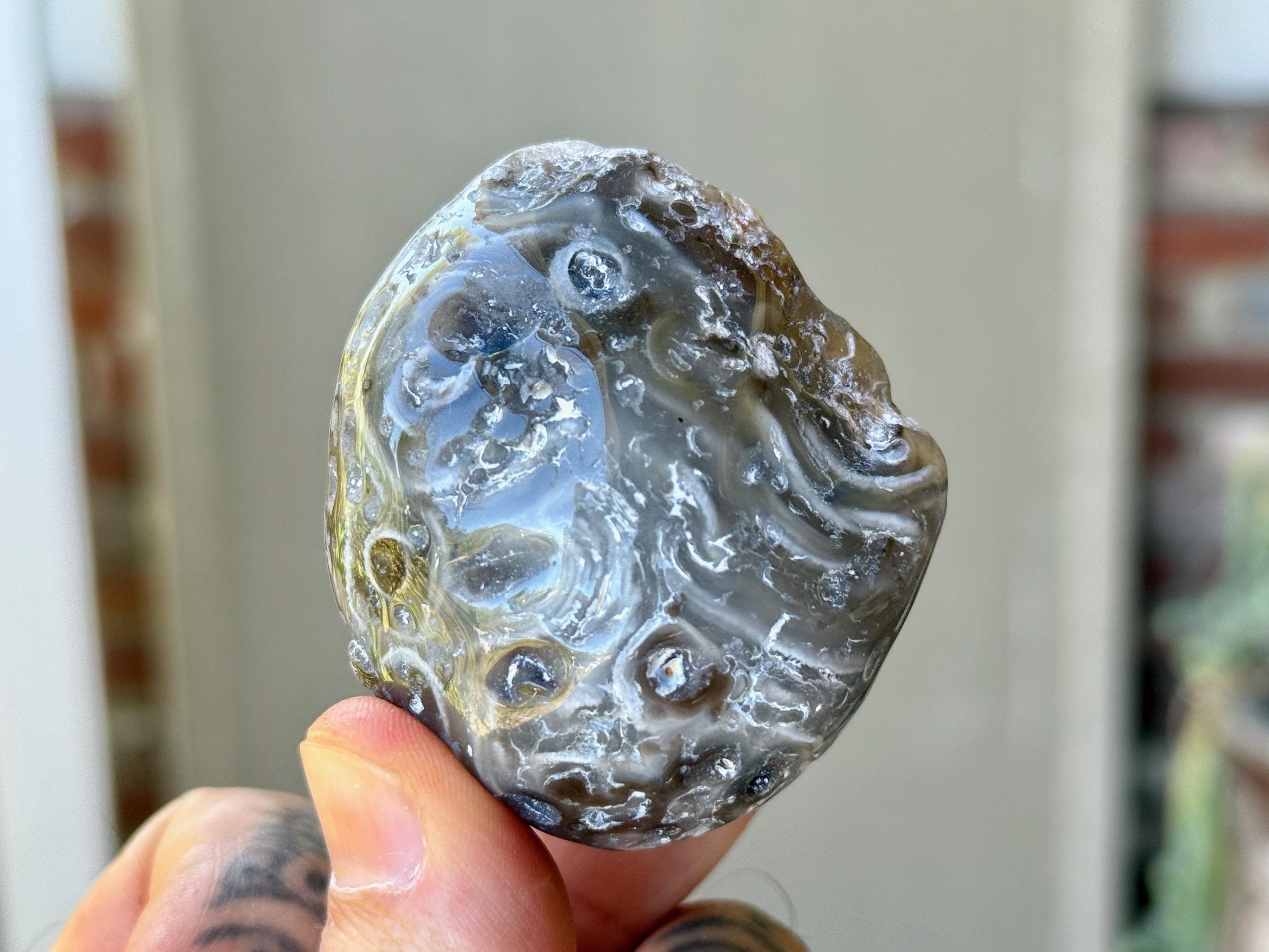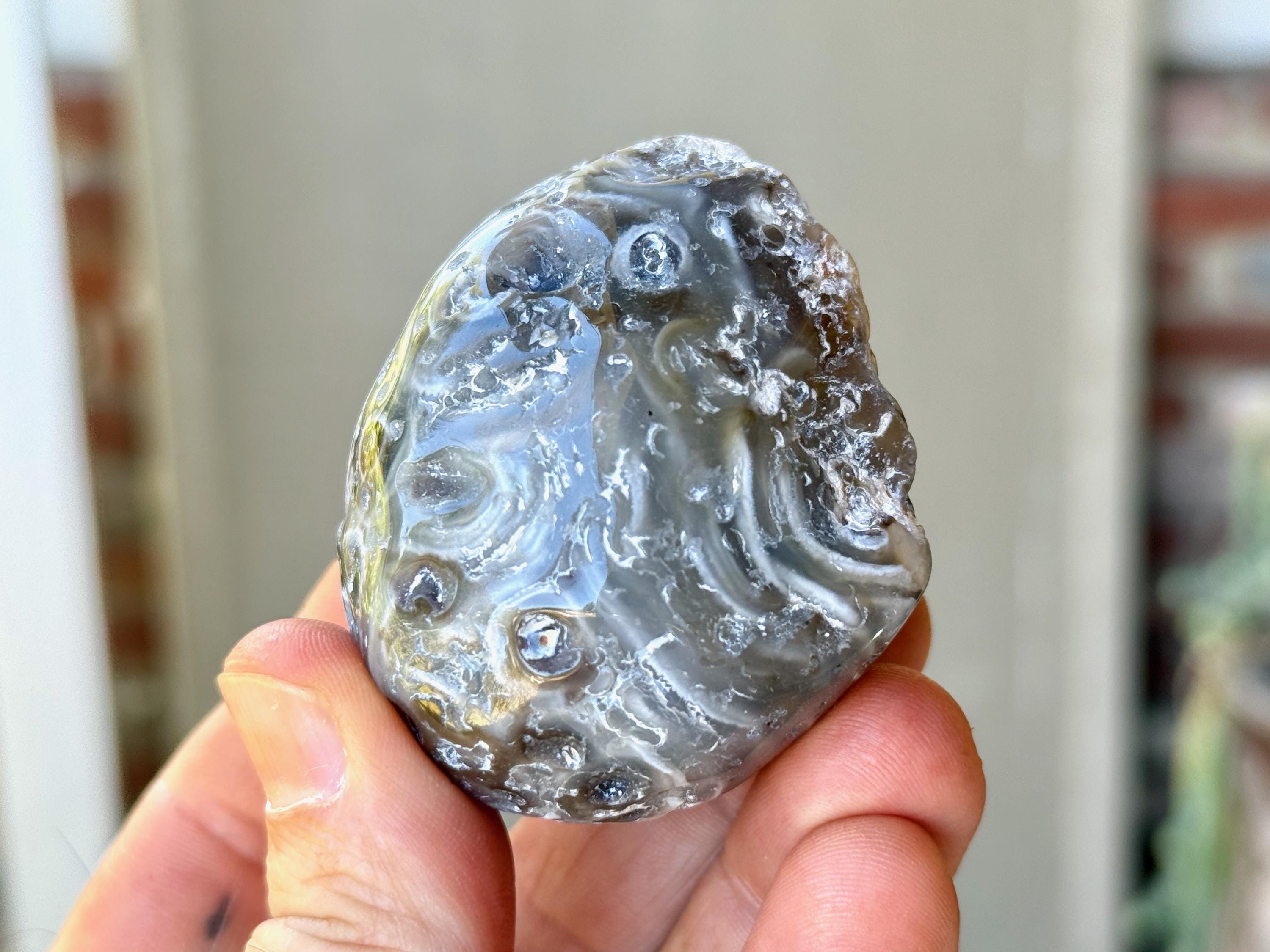 This superb Enhydro Ocean Agate comes from a 2018 find in Rio Grande do Sul, Brazil. While it is absolutely beautiful to look at from a glance, it has a secret within that makes it incredibly special and rare: it contains quite a large amount of water inside!