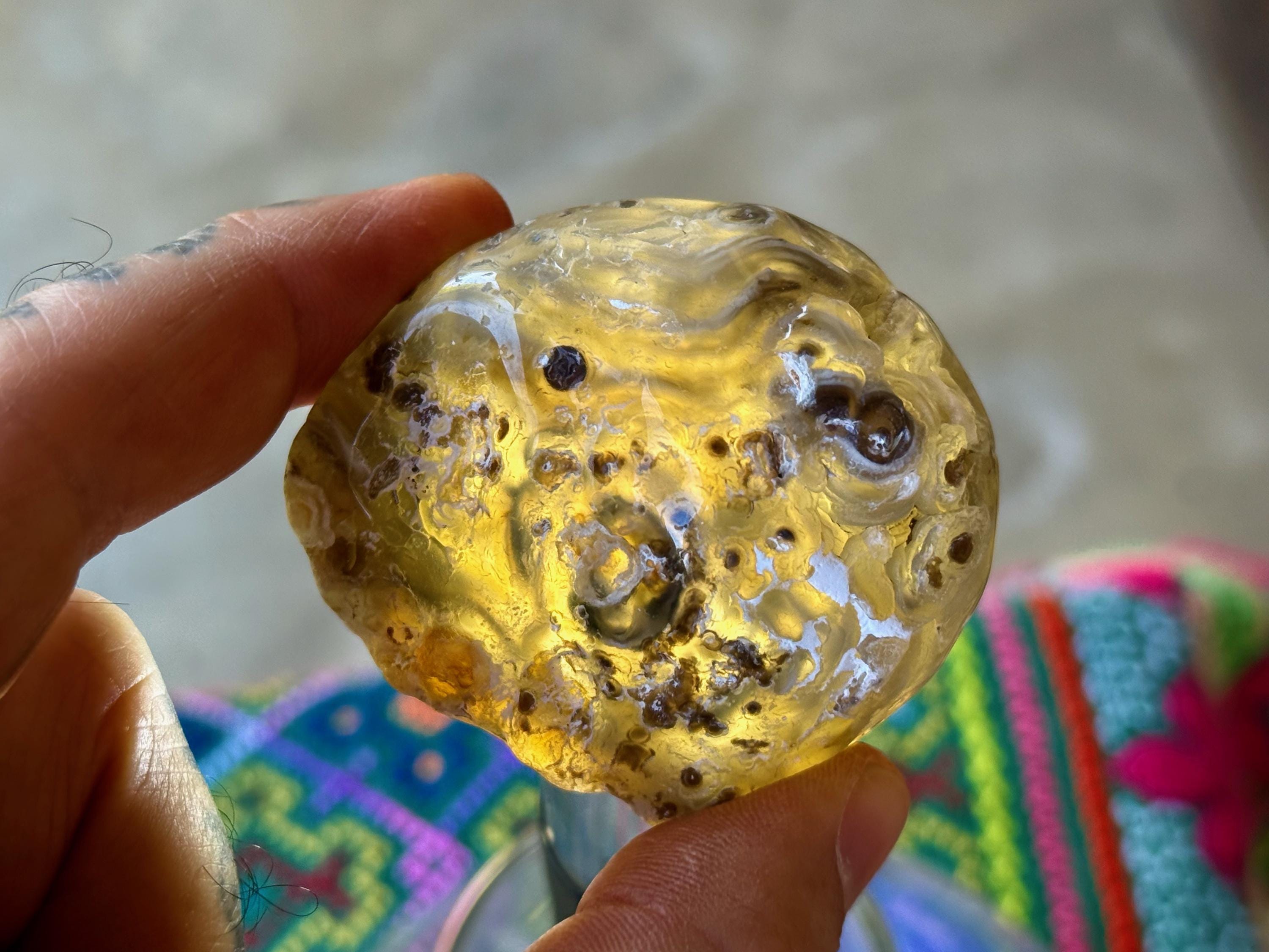The term for this natural phenomenon is "Enhydro" and it occurs when water is trapped inside of an Agate (or crystal) during its millions-of-years development. These Agates have been polished so that one can see the water moving within when backlit (with a flashlight, for instance). In many cases, you can actually hear the water swishing if you shake it next to your ear. This is an incredibly rare phenomenon, as most Enhydro crystals contain only the smallest drop of water. These very special stones bring a balance between the elements of Earth and Water, increased spiritual receptivity and balance.
