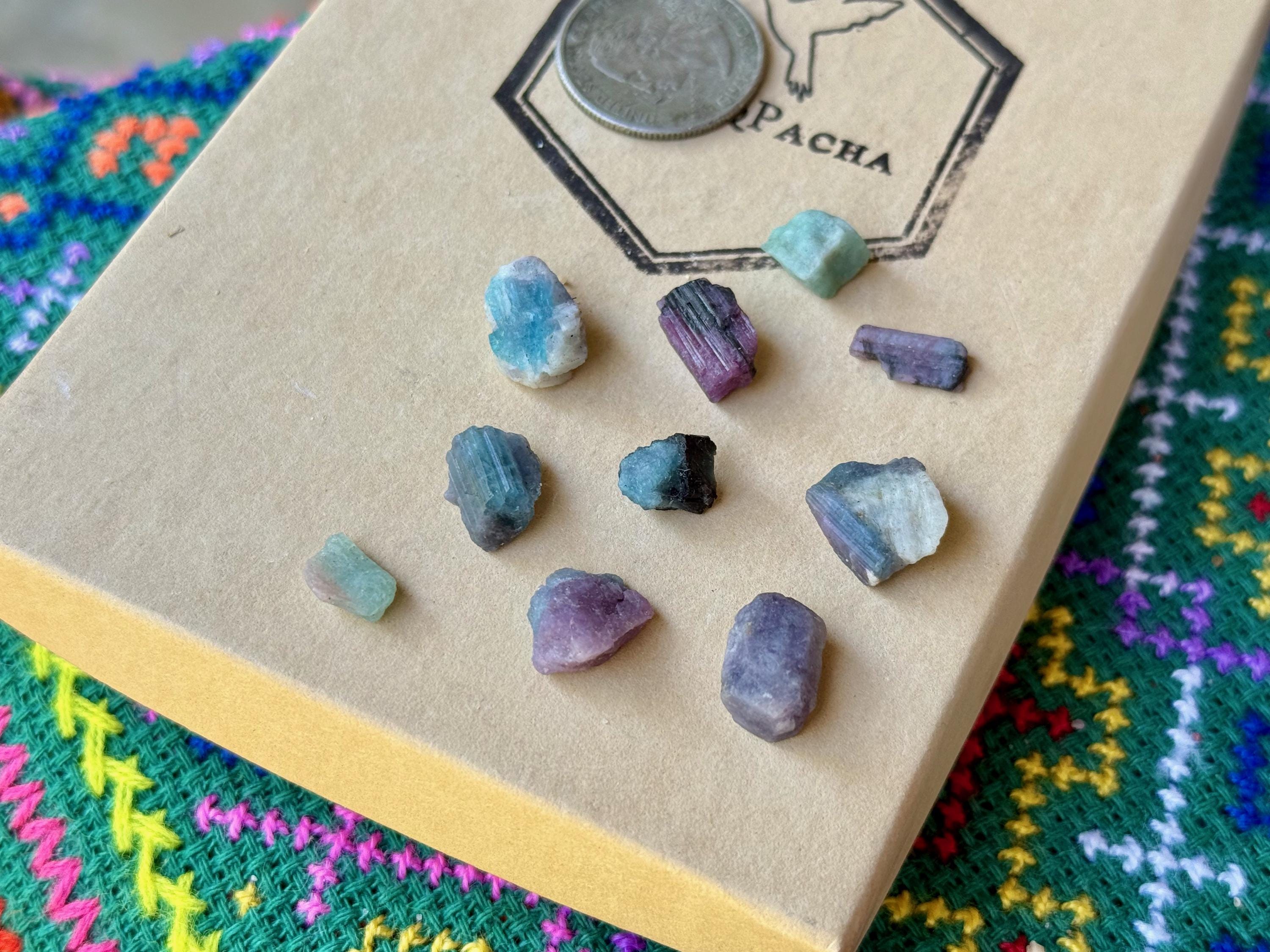 These Paraiba Tourmalines feature gorgeous pastel colors of pink and, the most desired, blue! When backlit, most (not all) of these crystals will pass light as pictured.