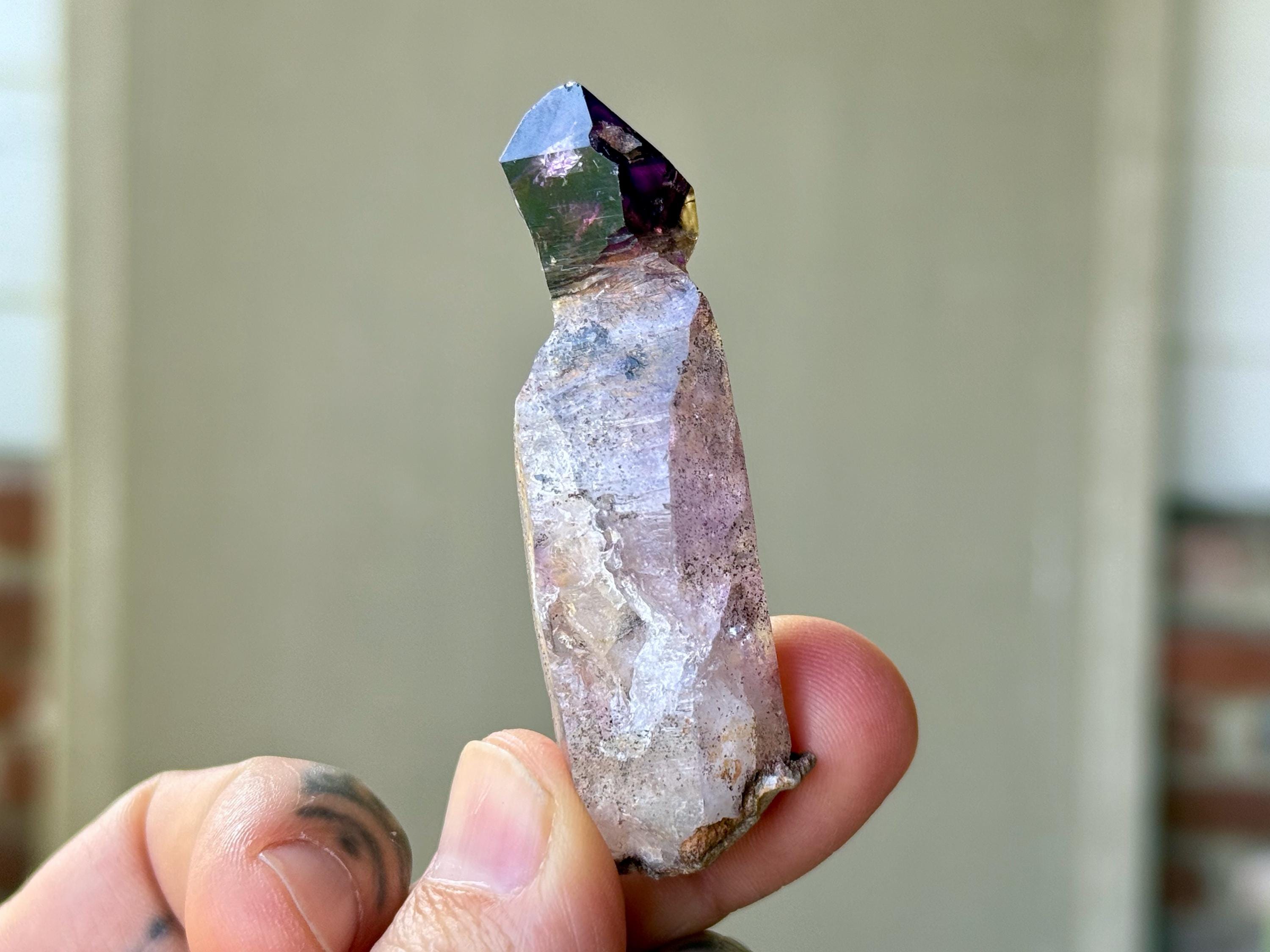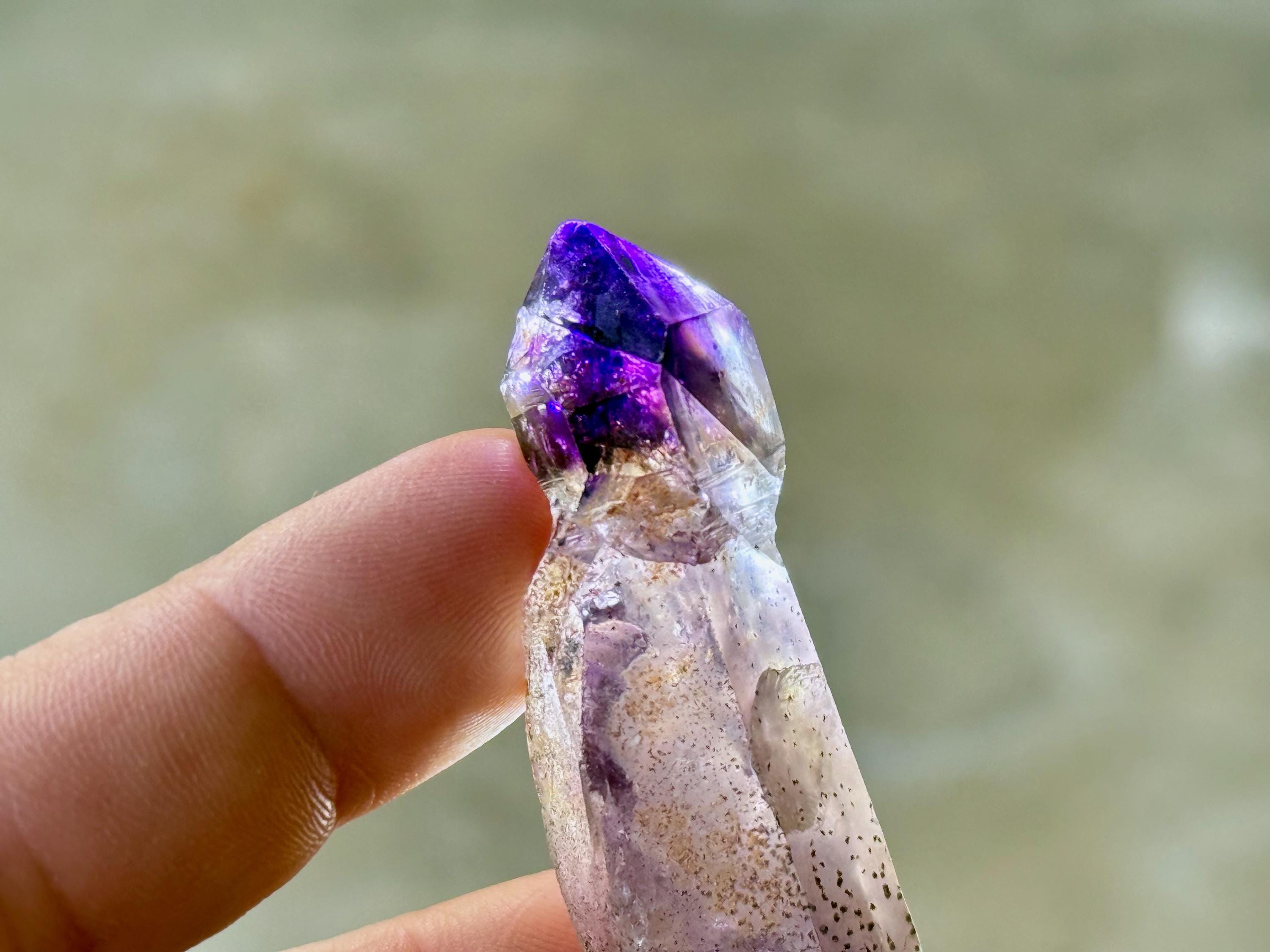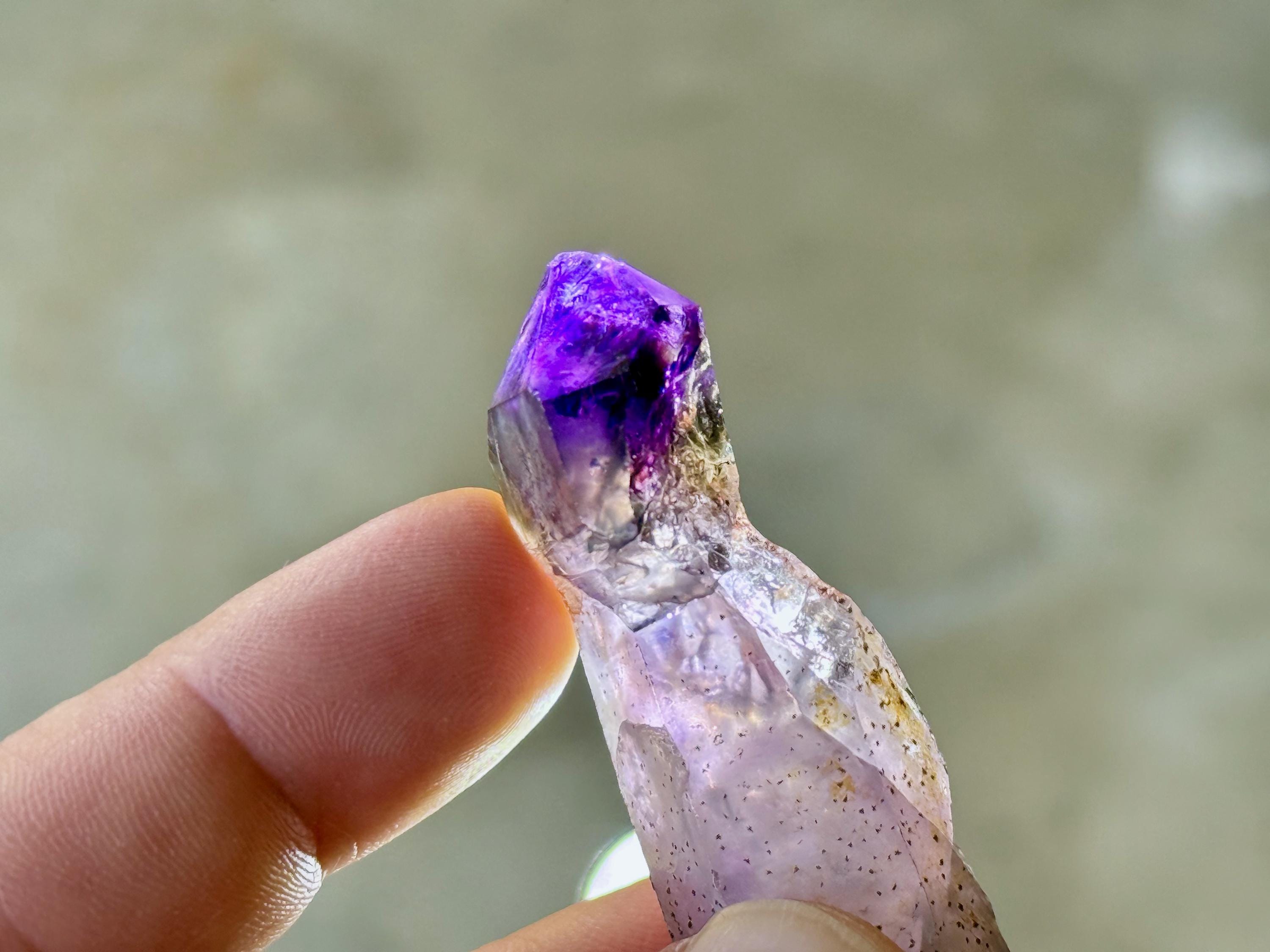 This crystal features an exquisite sceptered form, with a perfectly formed jewel of an Amethyst perched atop a robust scepter "stem." The Amethyst growth on top possesses dark purple hue with wonderful luster and depth of color. When backlit, the color and translucency become even more apparent (Photos 3-5).