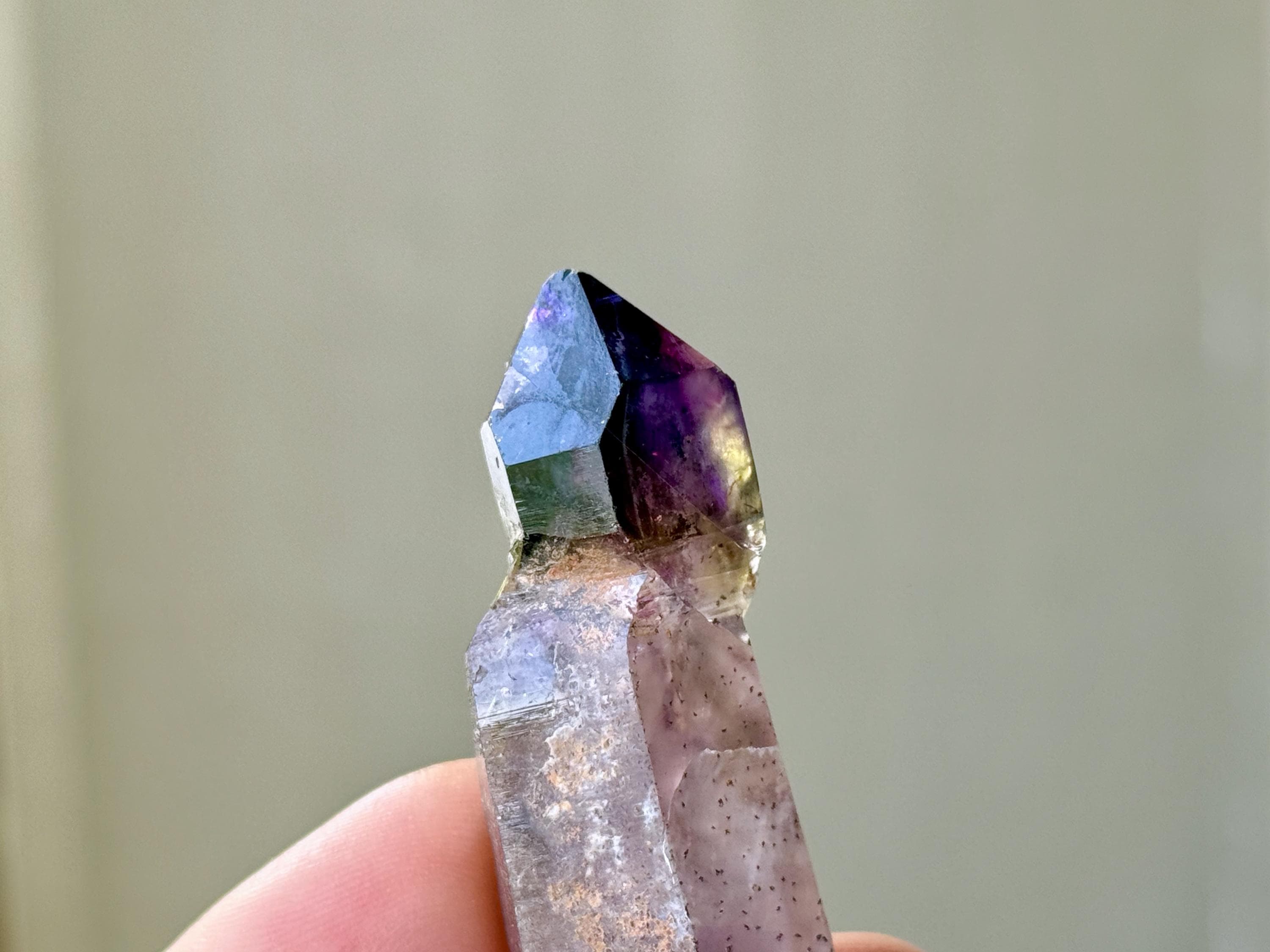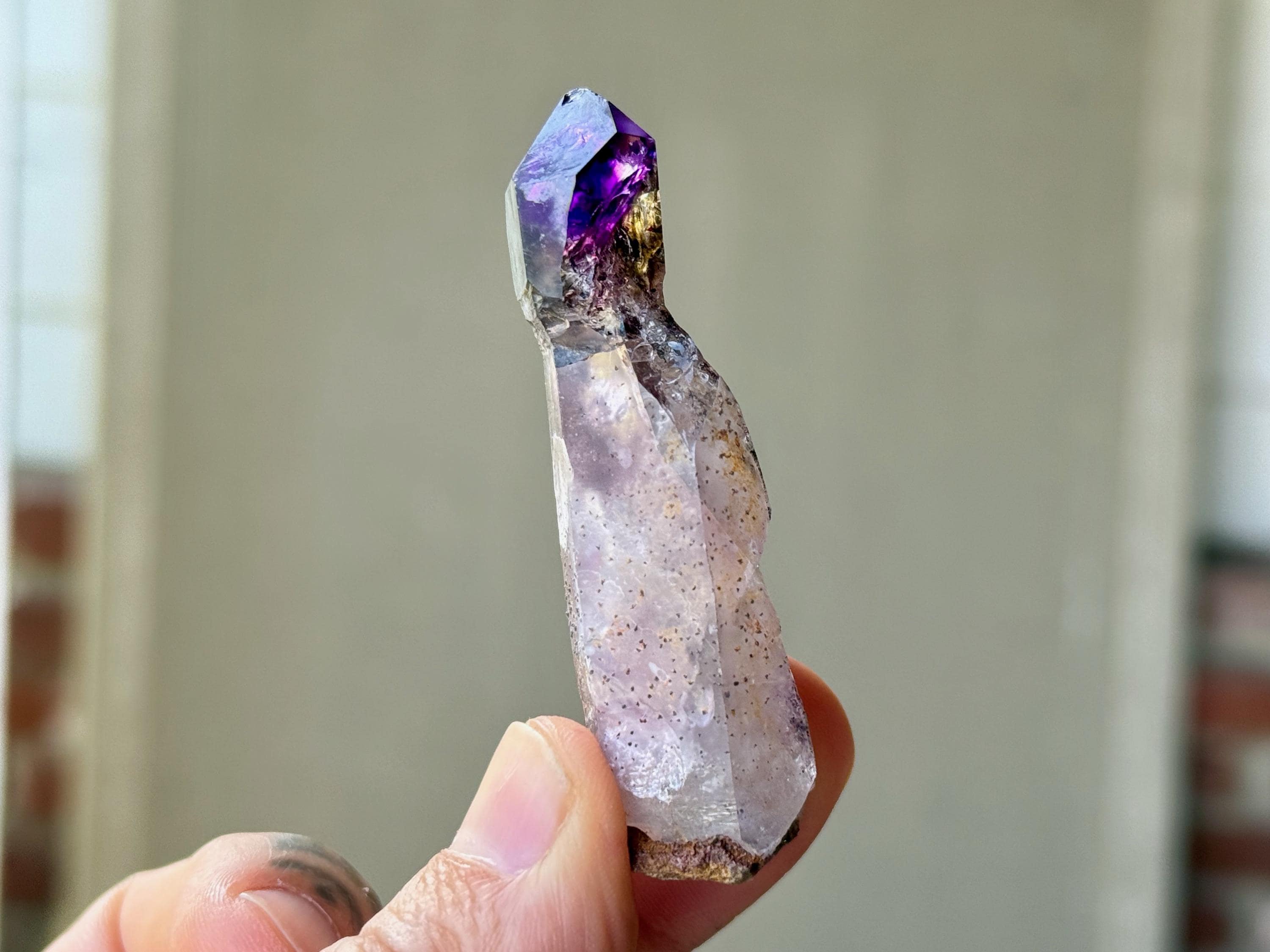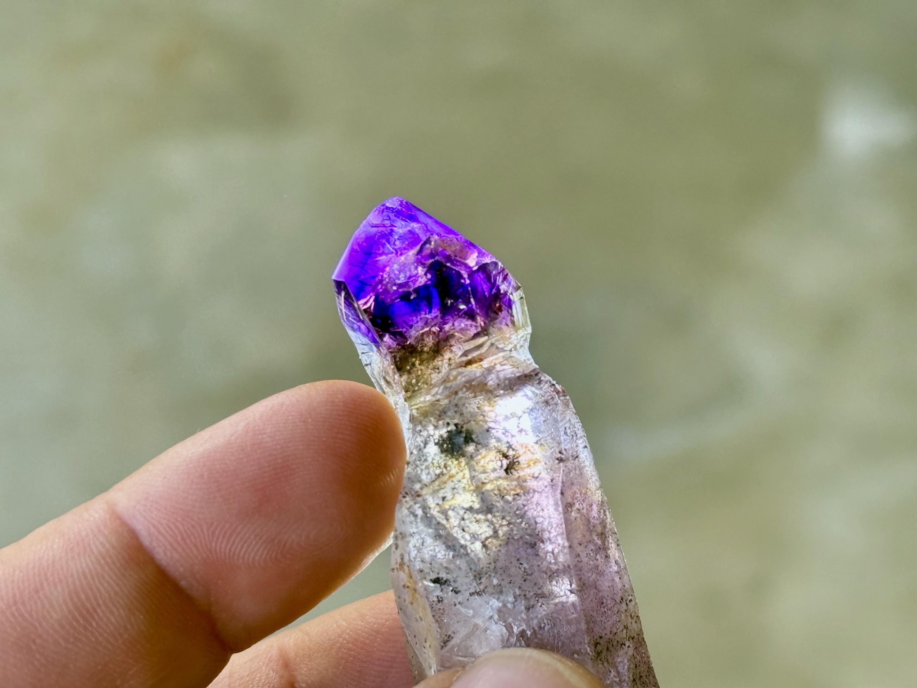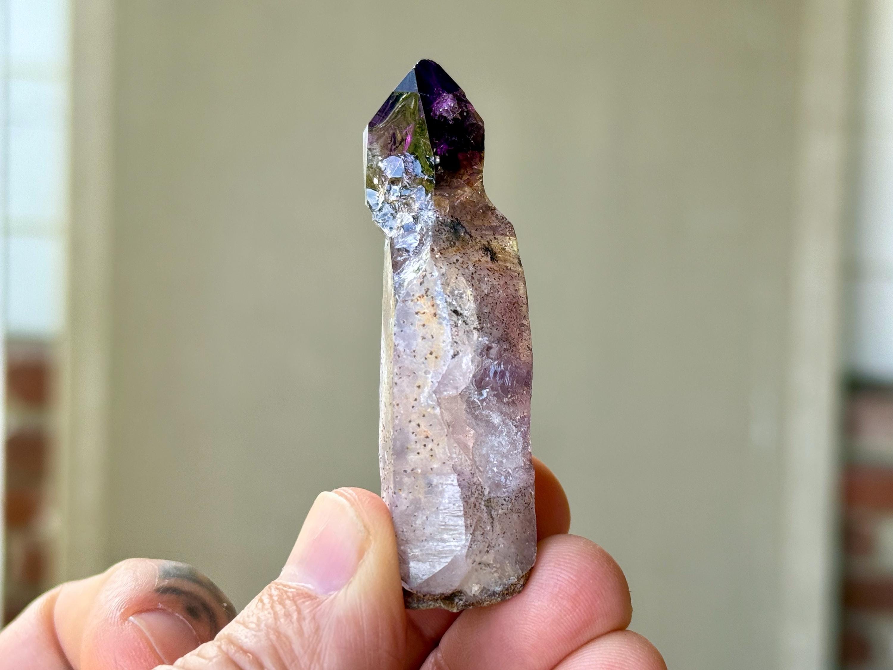 This crystal features an exquisite sceptered form, with a perfectly formed jewel of an Amethyst perched atop a robust scepter "stem." The Amethyst growth on top possesses dark purple hue with wonderful luster and depth of color. When backlit, the color and translucency become even more apparent (Photos 3-5).