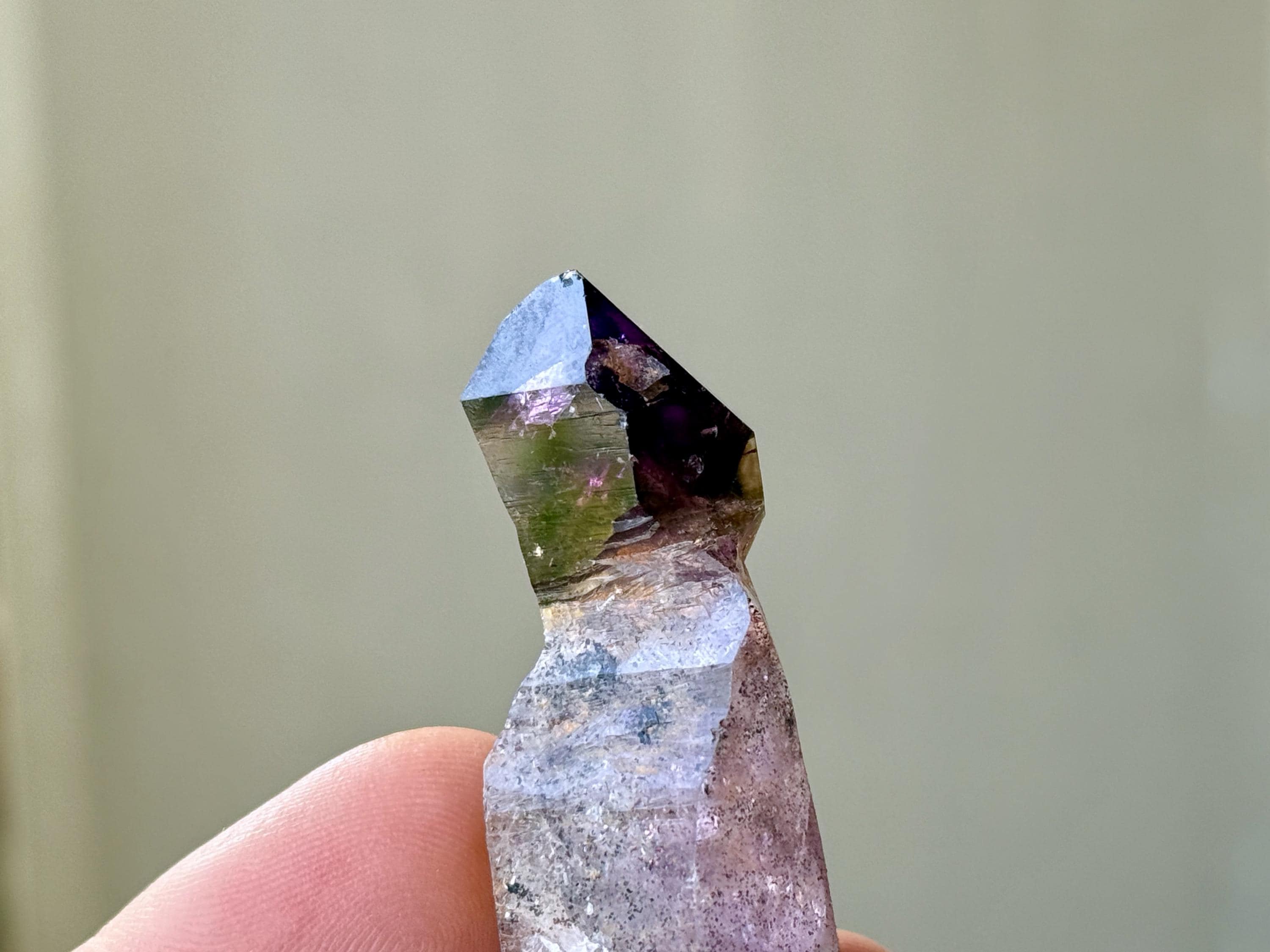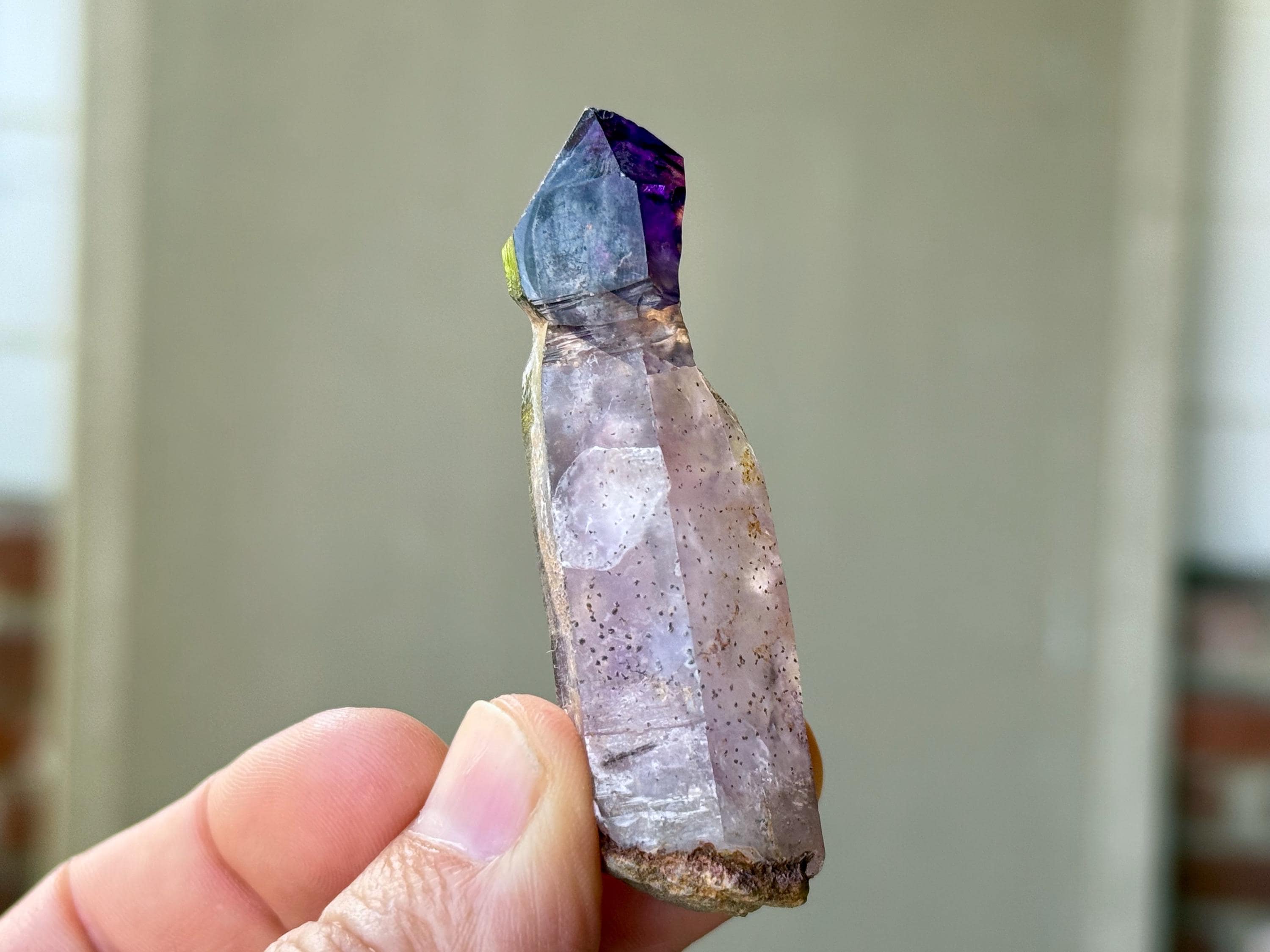 The broad stem displays a milder lilac hue in beautiful contrast to the darker Amethyst on top. There is a minor chip to the backside of the darker Amethyst growth, which can be best seen in Photo 2. The termination, however, is excellent.