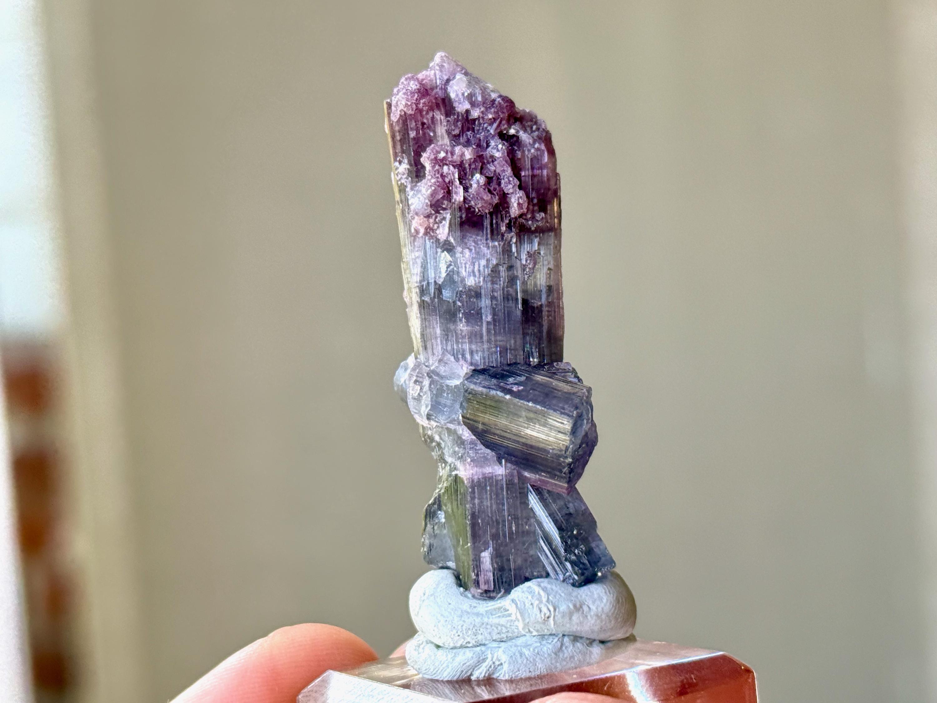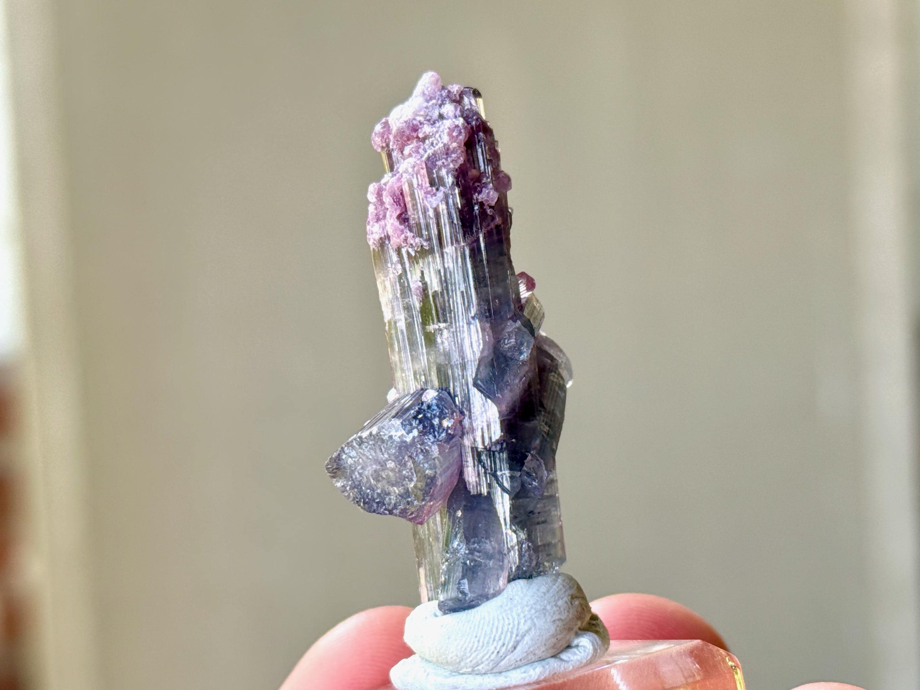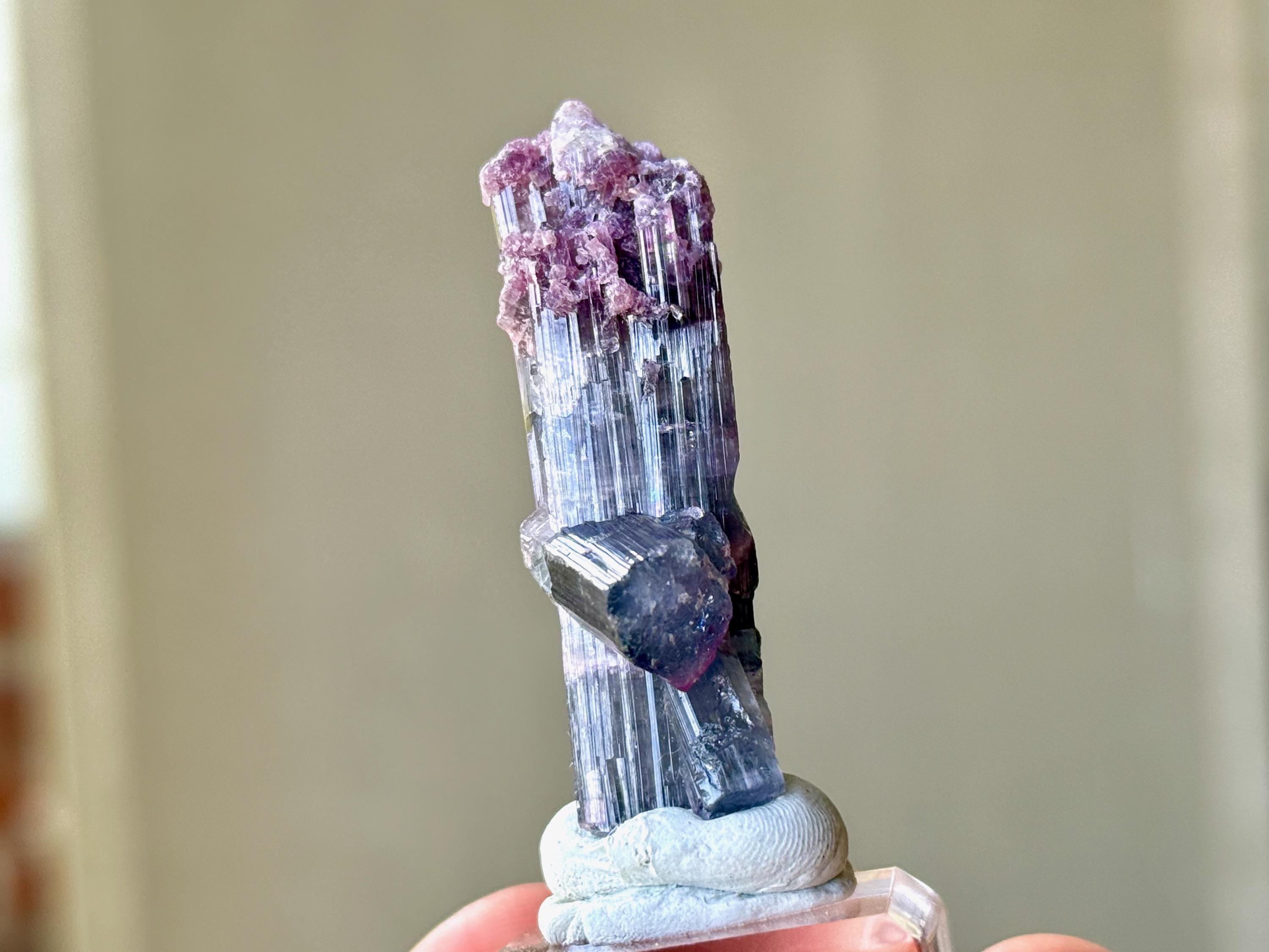 One of the most exquisite and unique Tourmaline crystals we've ever offered, this is a spectacular Lilac Purple Tourmaline from the famed Aricanga Mine. As mentioned above, our sources have shared with us that this is actually a Steel Blue Tourmaline that has taken on a purple hue due to Lepidolite inclusion. We can see some of this purple-pink Lepidolite encrusted on the termination area.