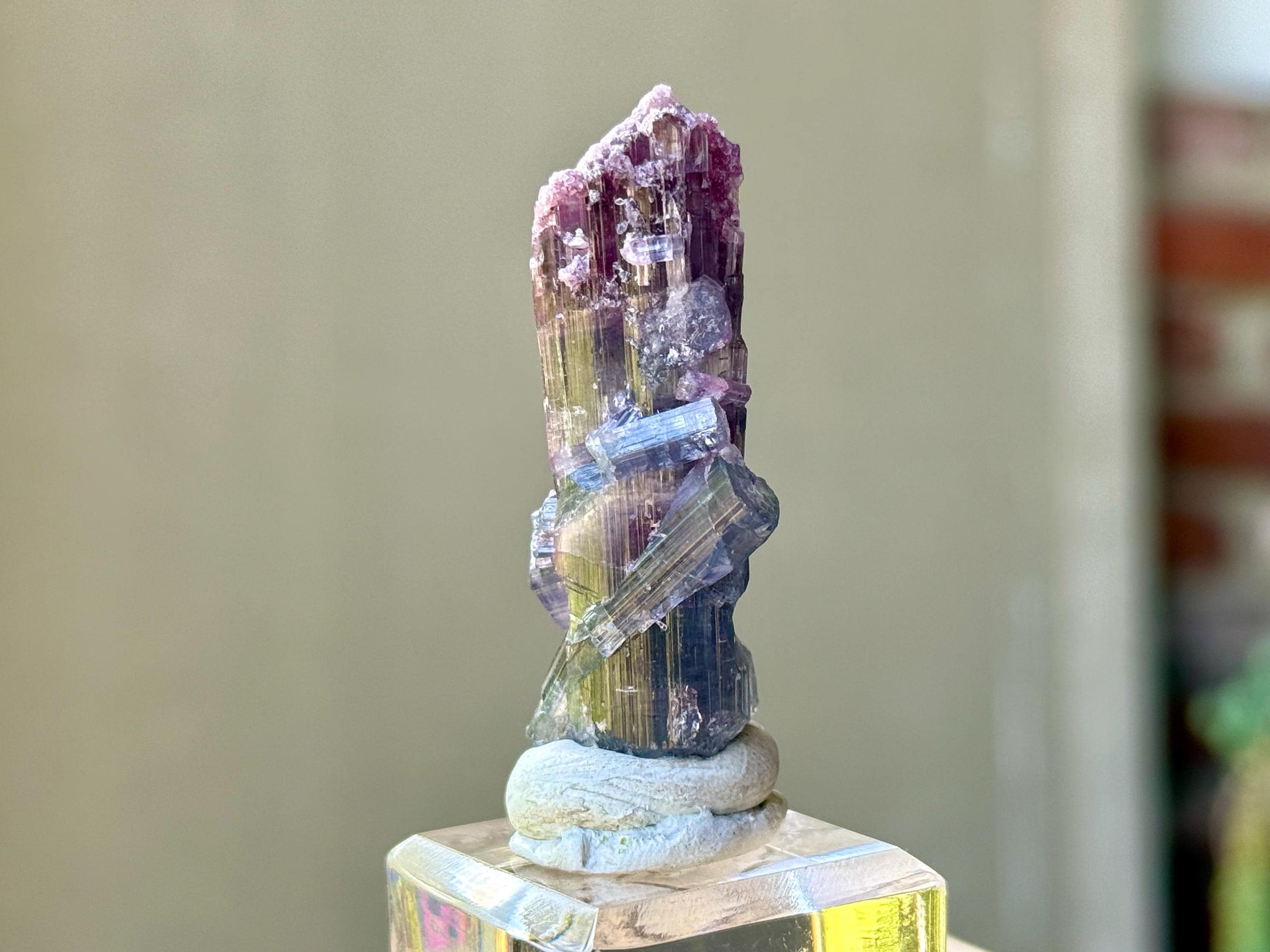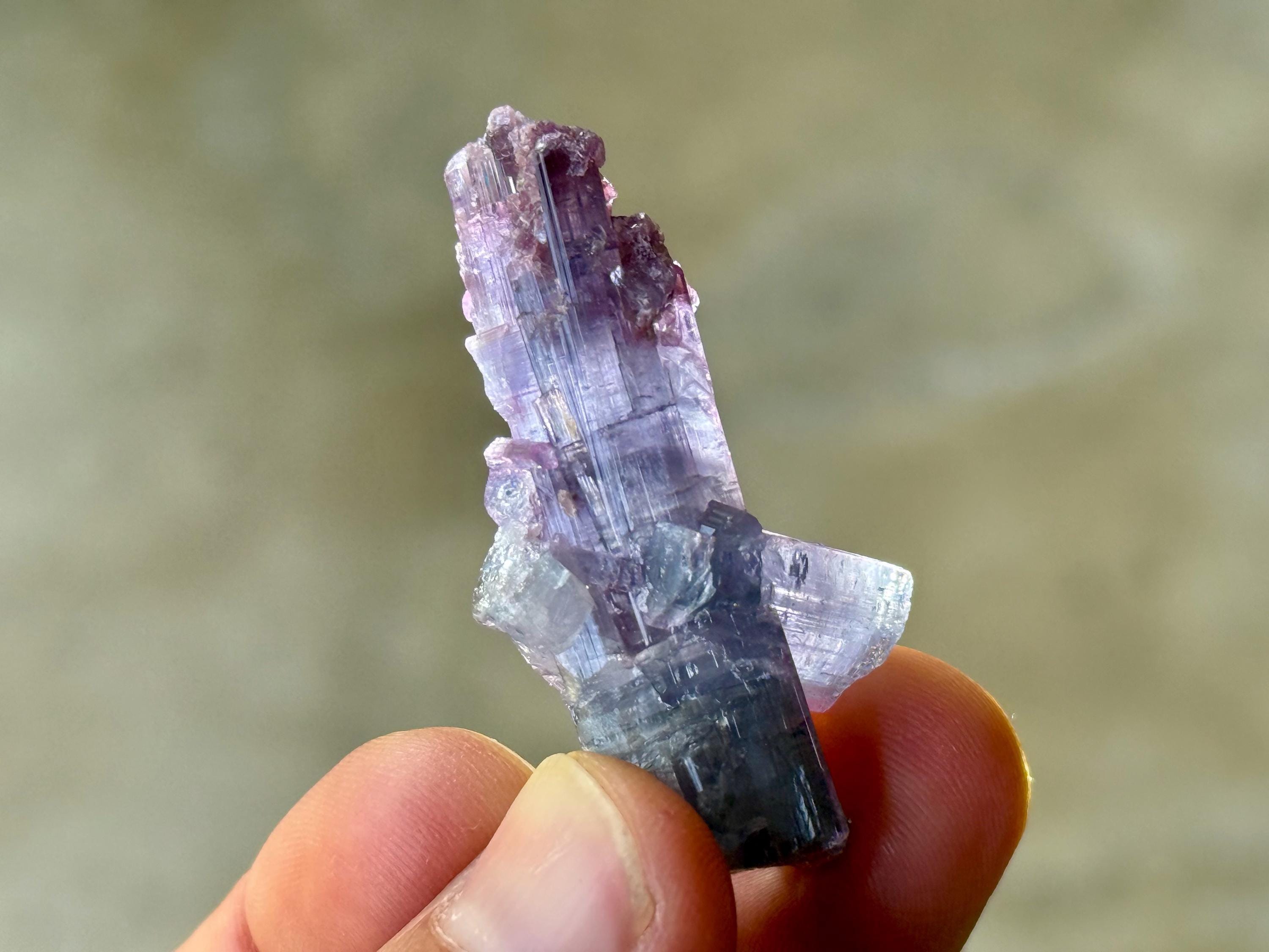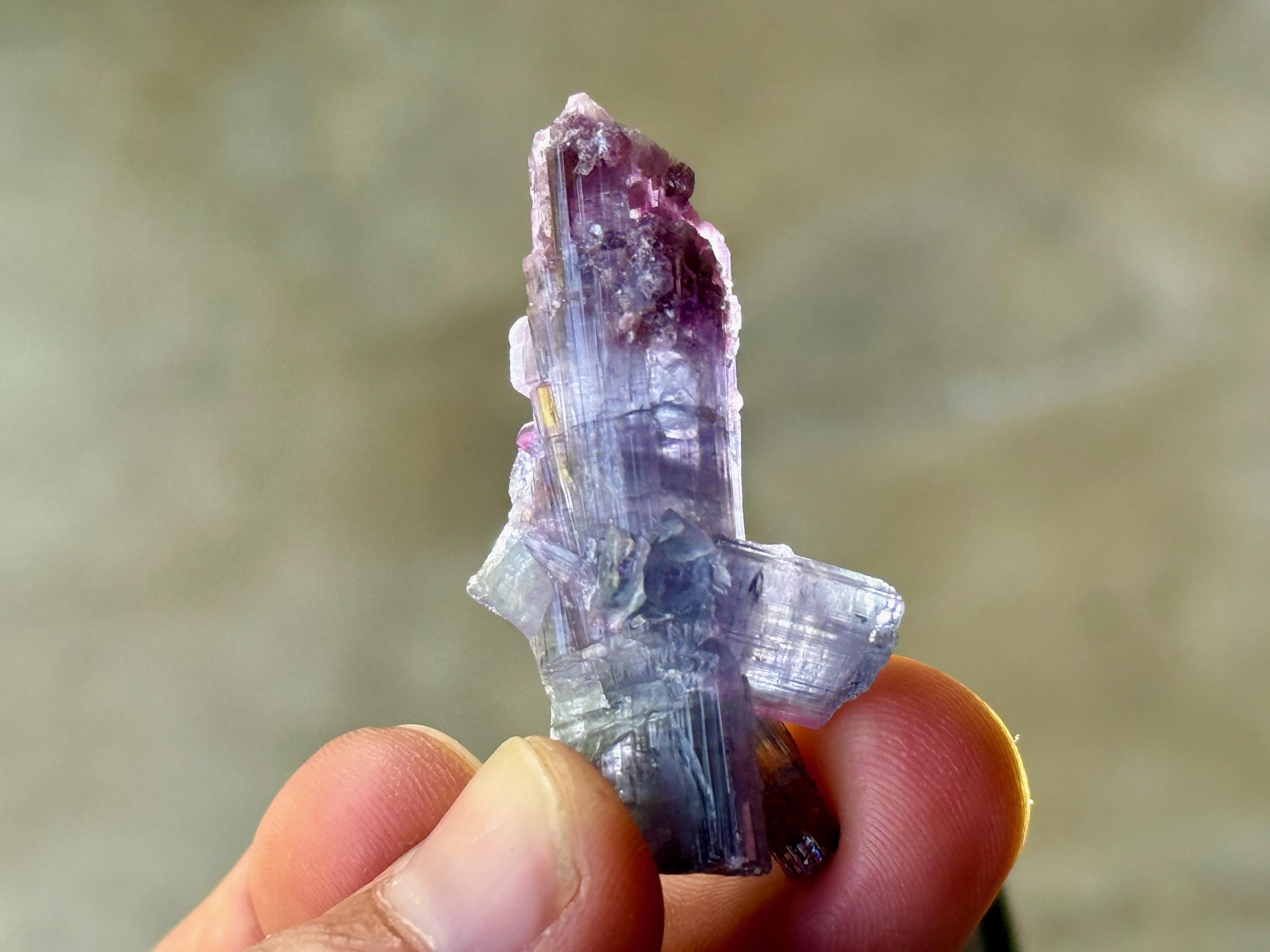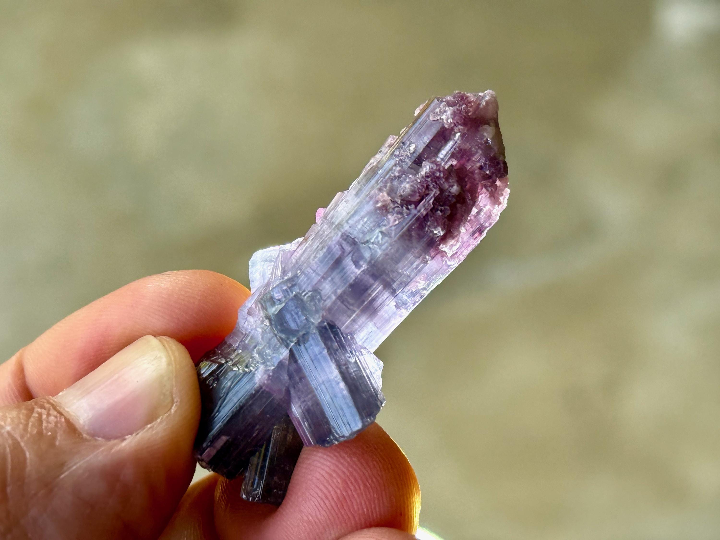 One of the most exquisite and unique Tourmaline crystals we've ever offered, this is a spectacular Lilac Purple Tourmaline from the famed Aricanga Mine. As mentioned above, our sources have shared with us that this is actually a Steel Blue Tourmaline that has taken on a purple hue due to Lepidolite inclusion. We can see some of this purple-pink Lepidolite encrusted on the termination area.