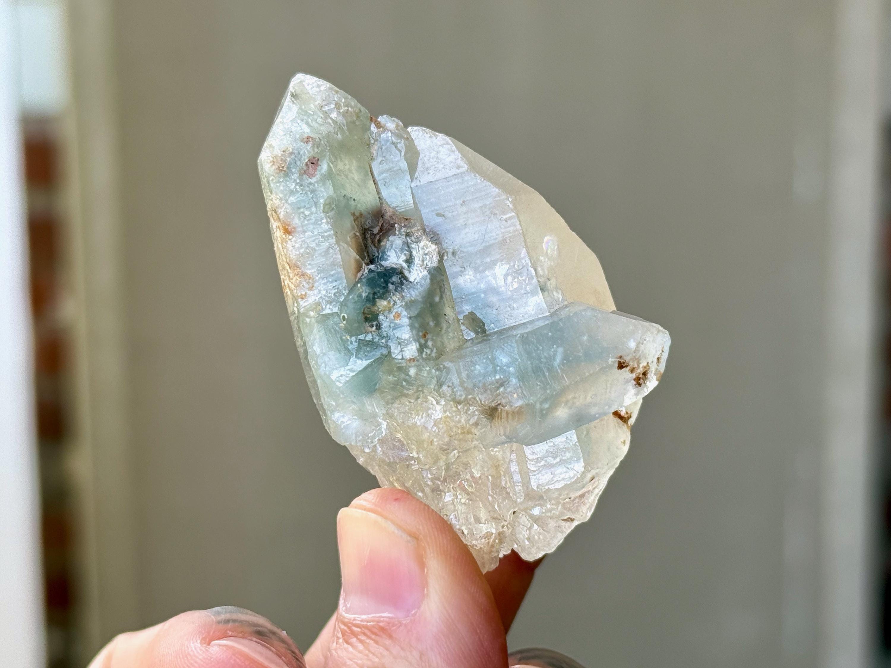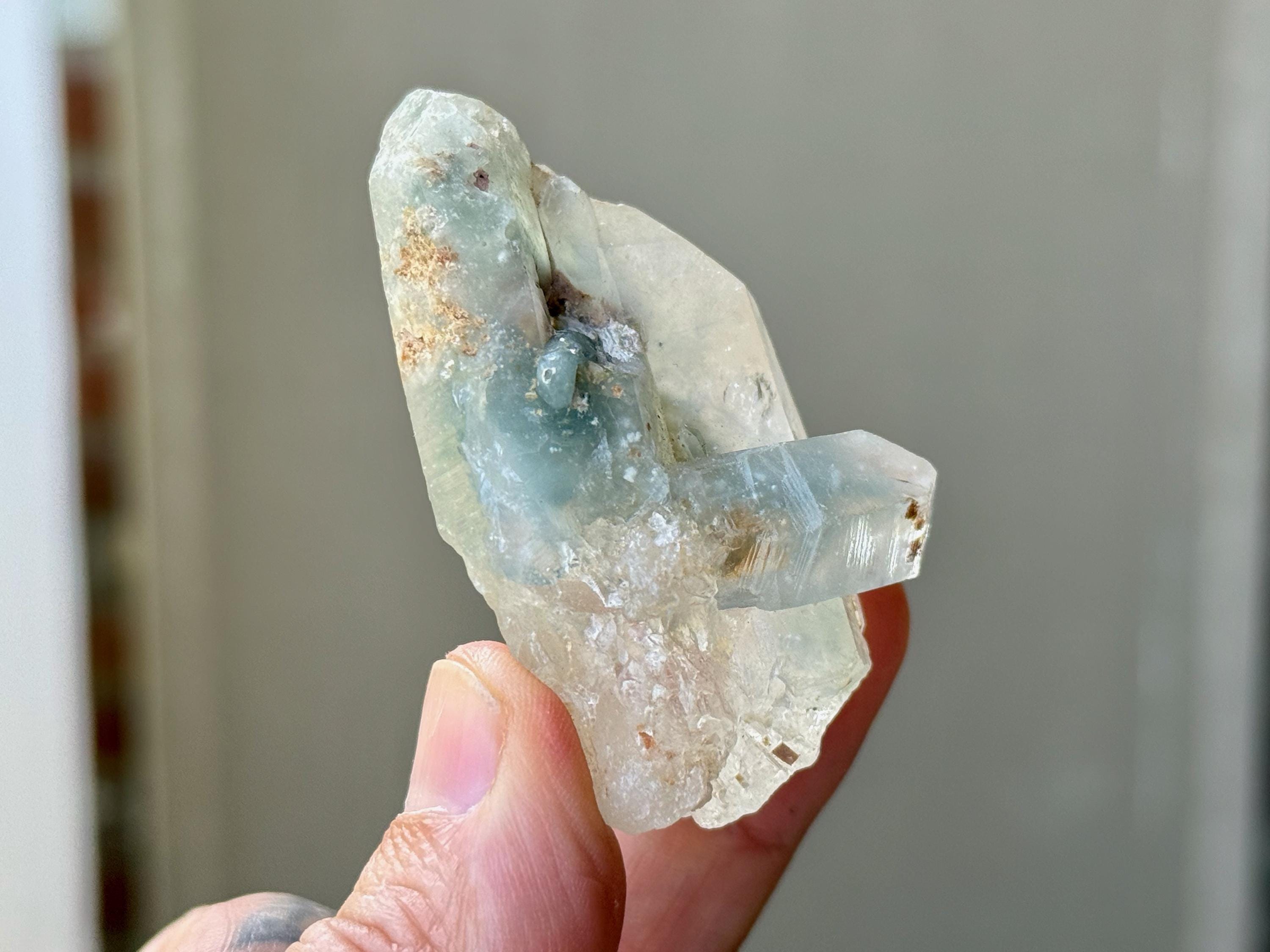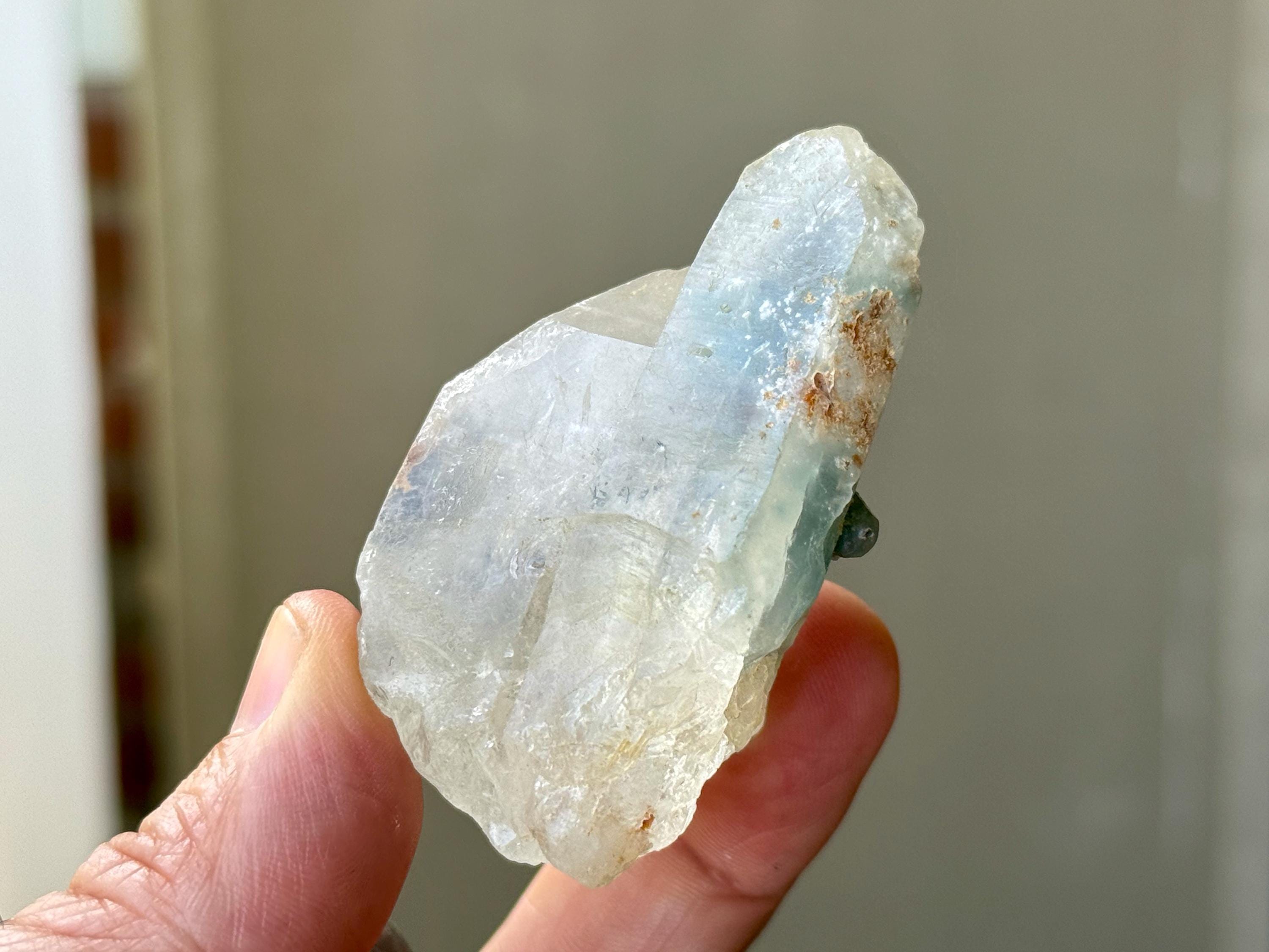 Icy blue hues and marvelous luster to this pretty and uniquely formed Blue Tourmaline Quartz crystal. It's a bit of a Tantric Twin formation with a smaller "child" crystal near the base that's almost "hugging" the secondary crystal. Very cute! The color is pale oceanic blue and so lovely.