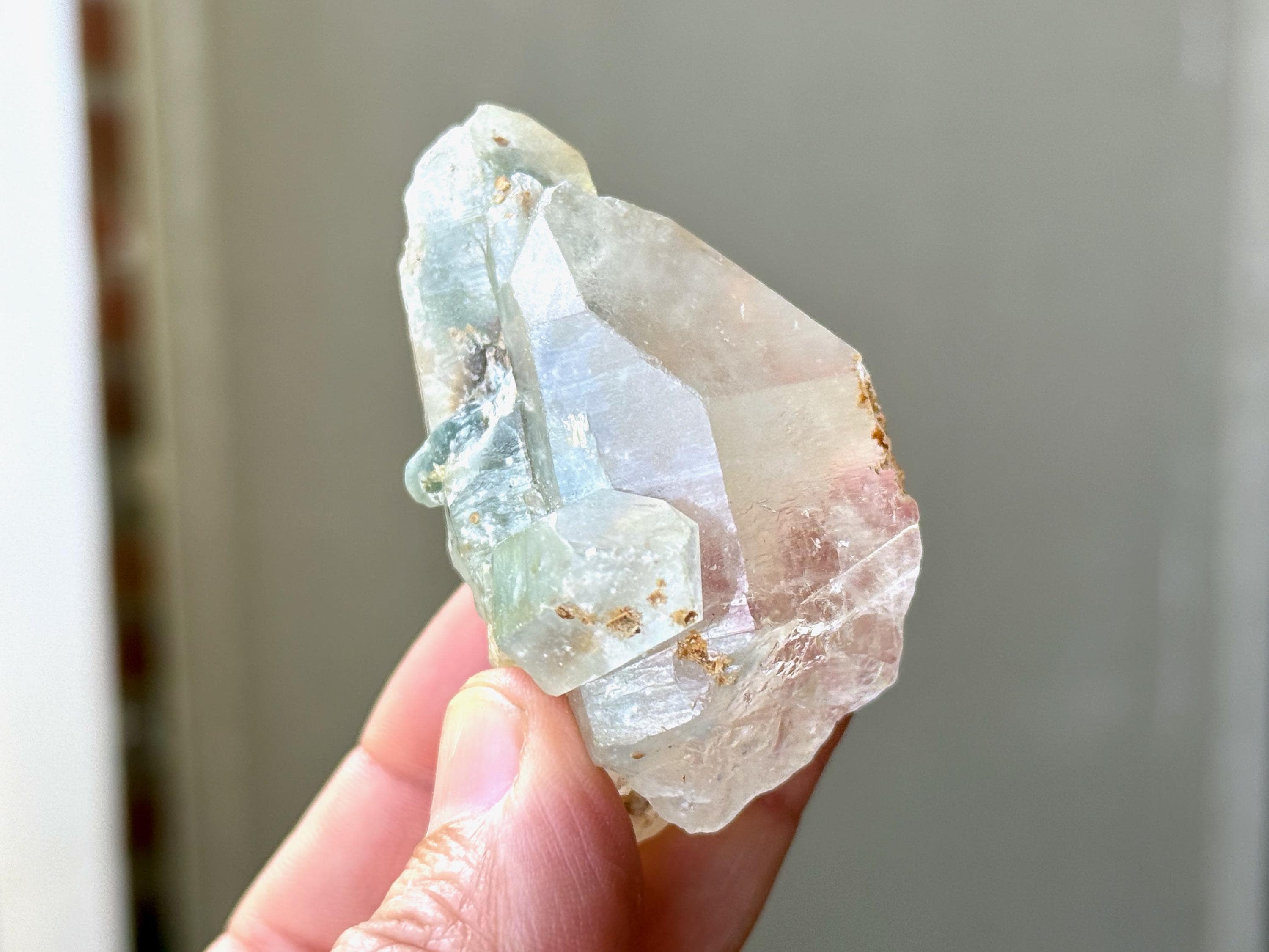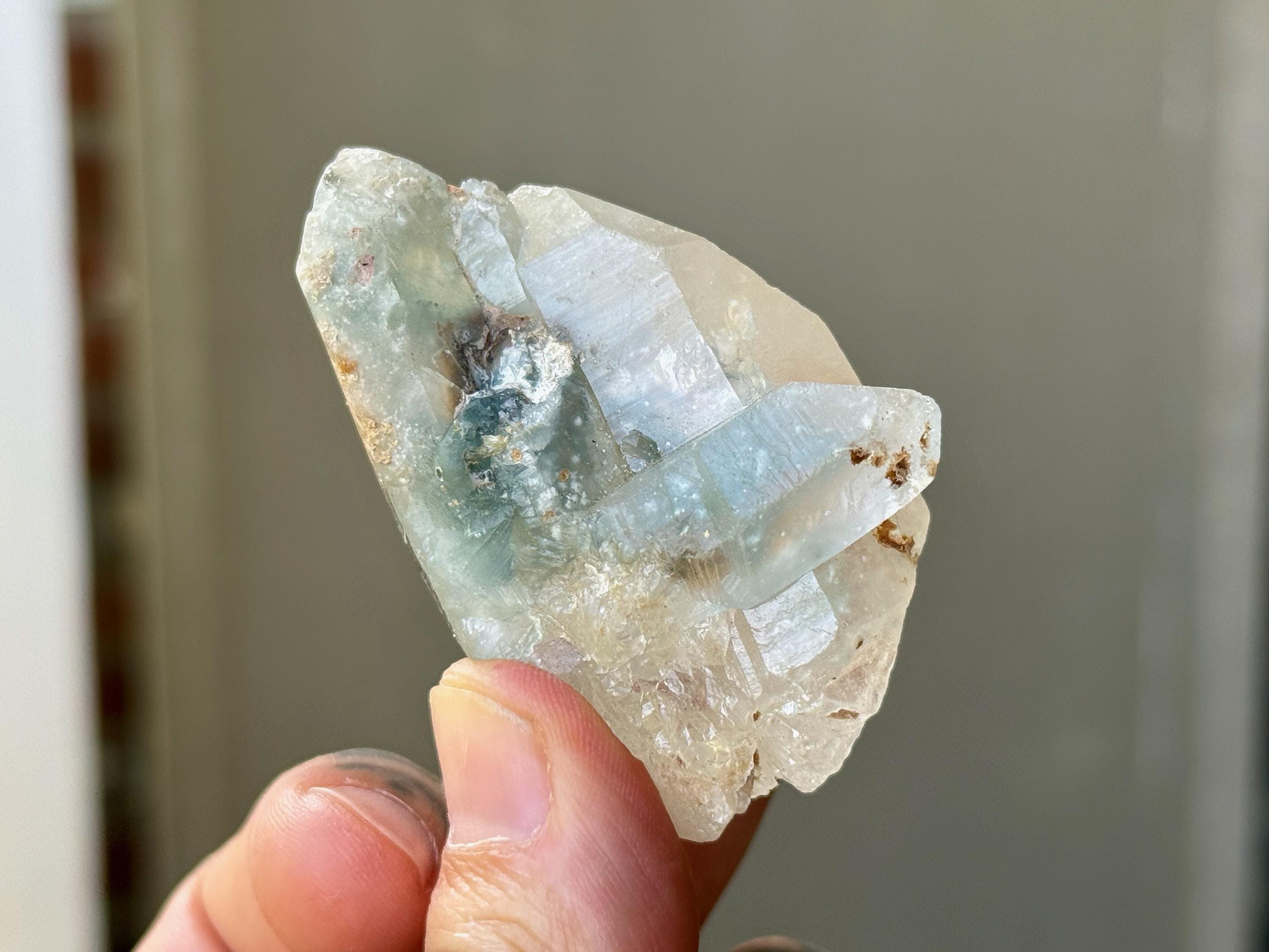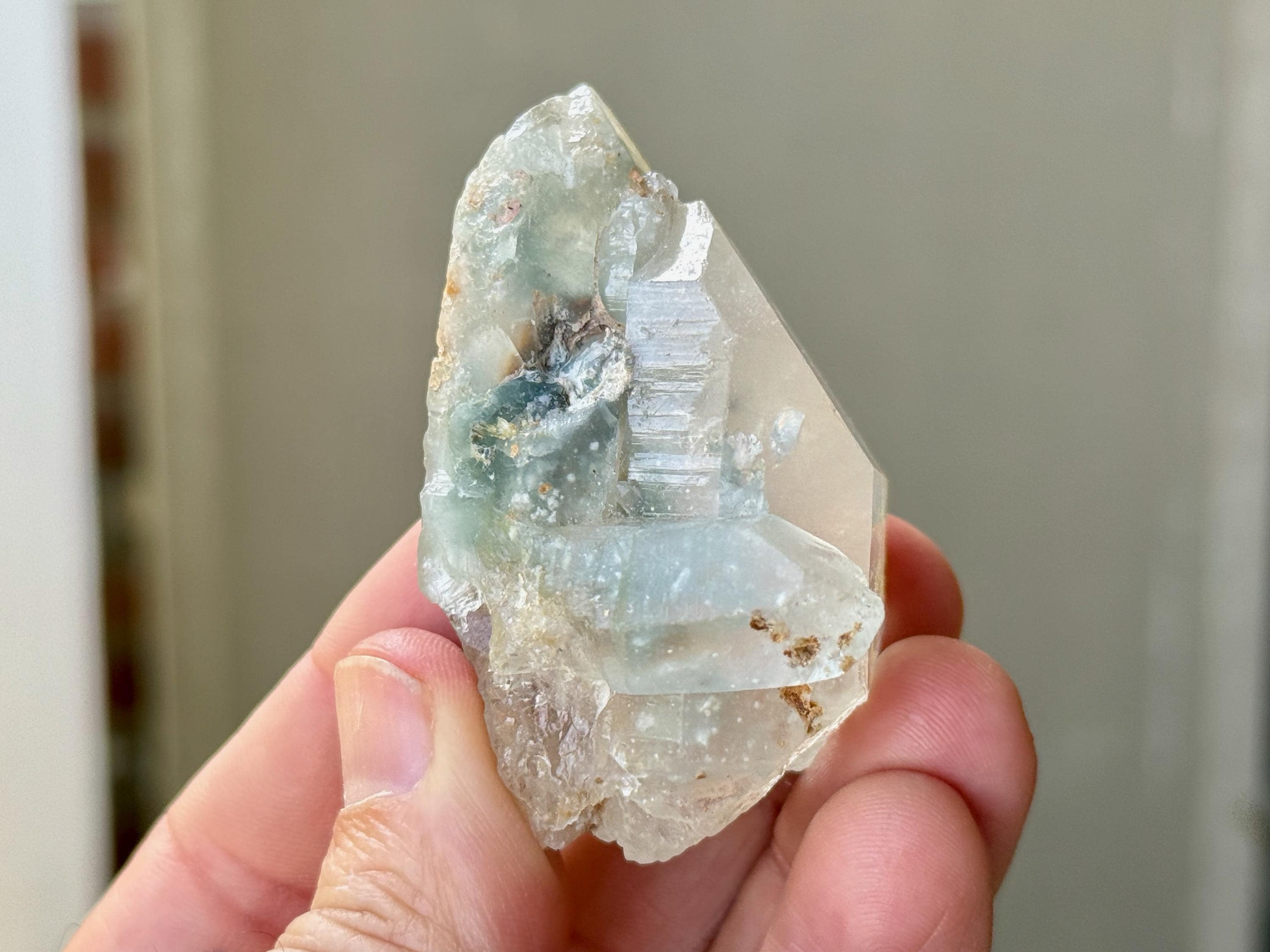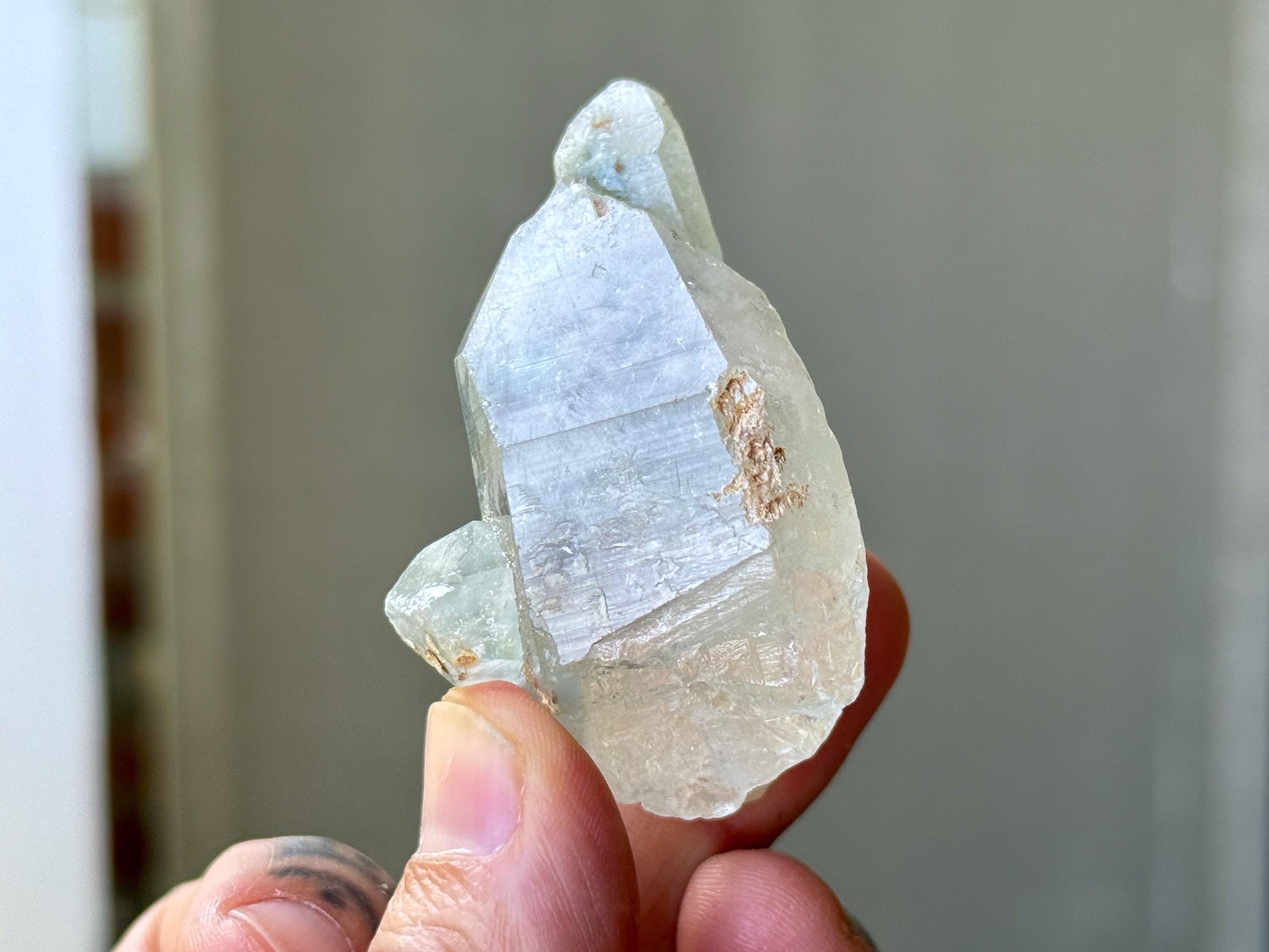 Icy blue hues and marvelous luster to this pretty and uniquely formed Blue Tourmaline Quartz crystal. It's a bit of a Tantric Twin formation with a smaller "child" crystal near the base that's almost "hugging" the secondary crystal. Very cute! The color is pale oceanic blue and so lovely.