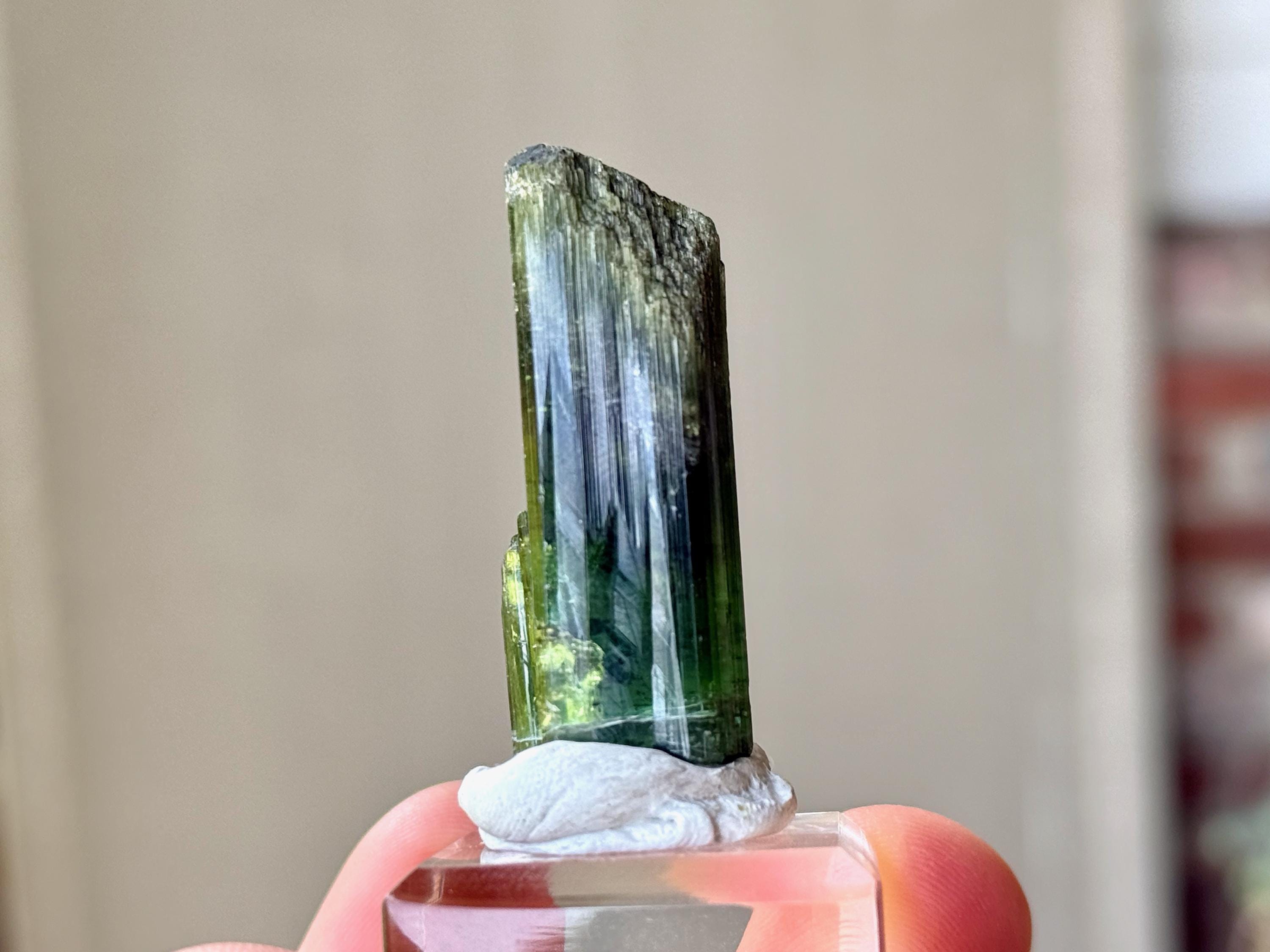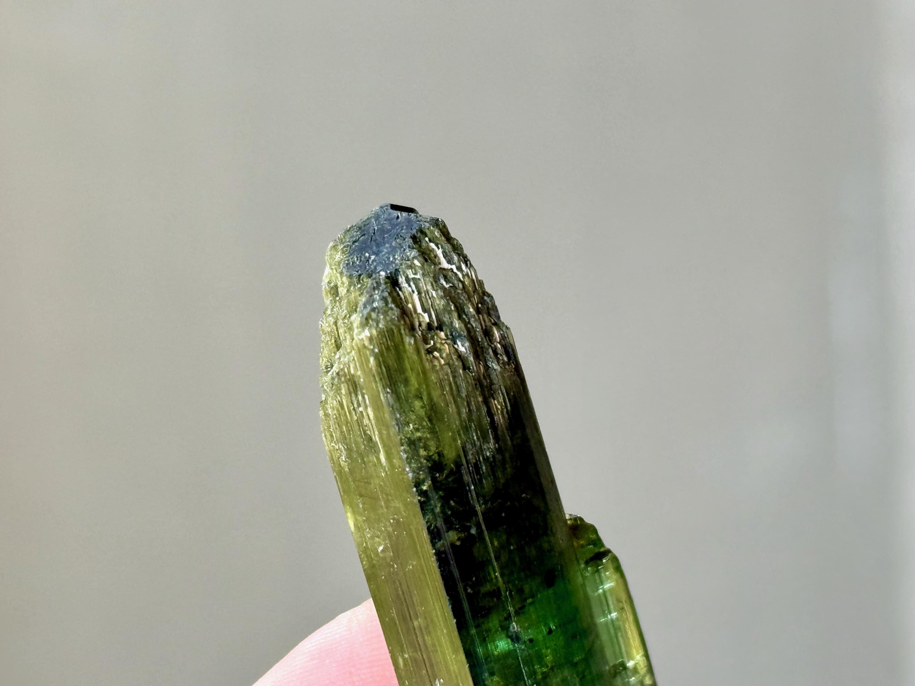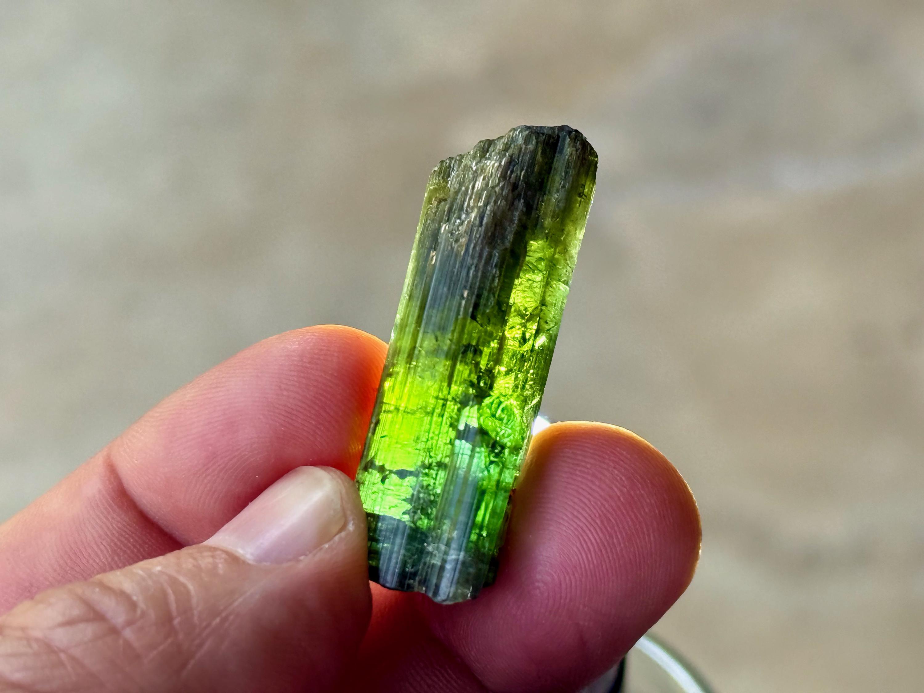 This is a brilliantly hued, highly lustrous, super-juicy Bicolor Tourmaline from the famed Aricanga mine. In natural light, this crystal simply appears to be a darkly lustrous Green Tourmaline. However, when backlit, we can see that the base is a lovely pale teal blue color that blends into green just below the midsection (Photos 1, 4-7). The translucency and depth of color is beautiful.