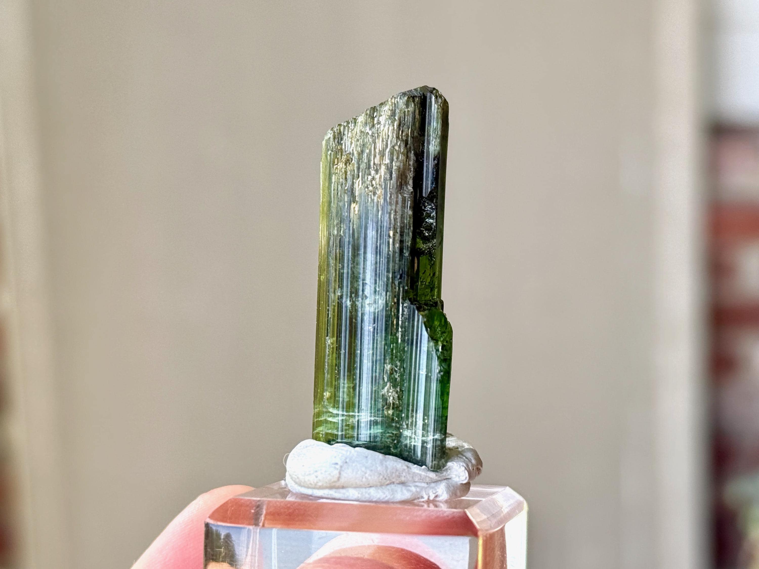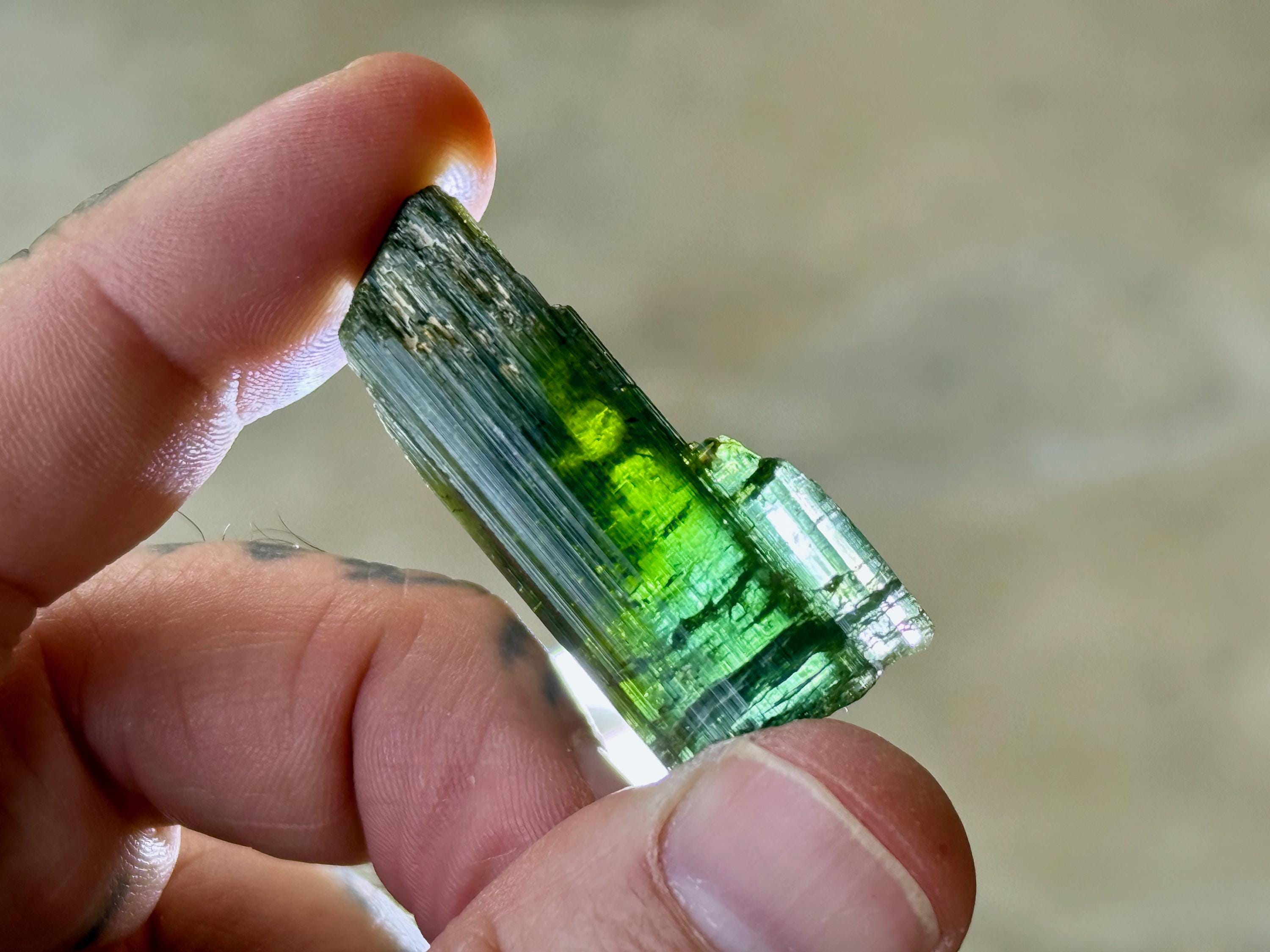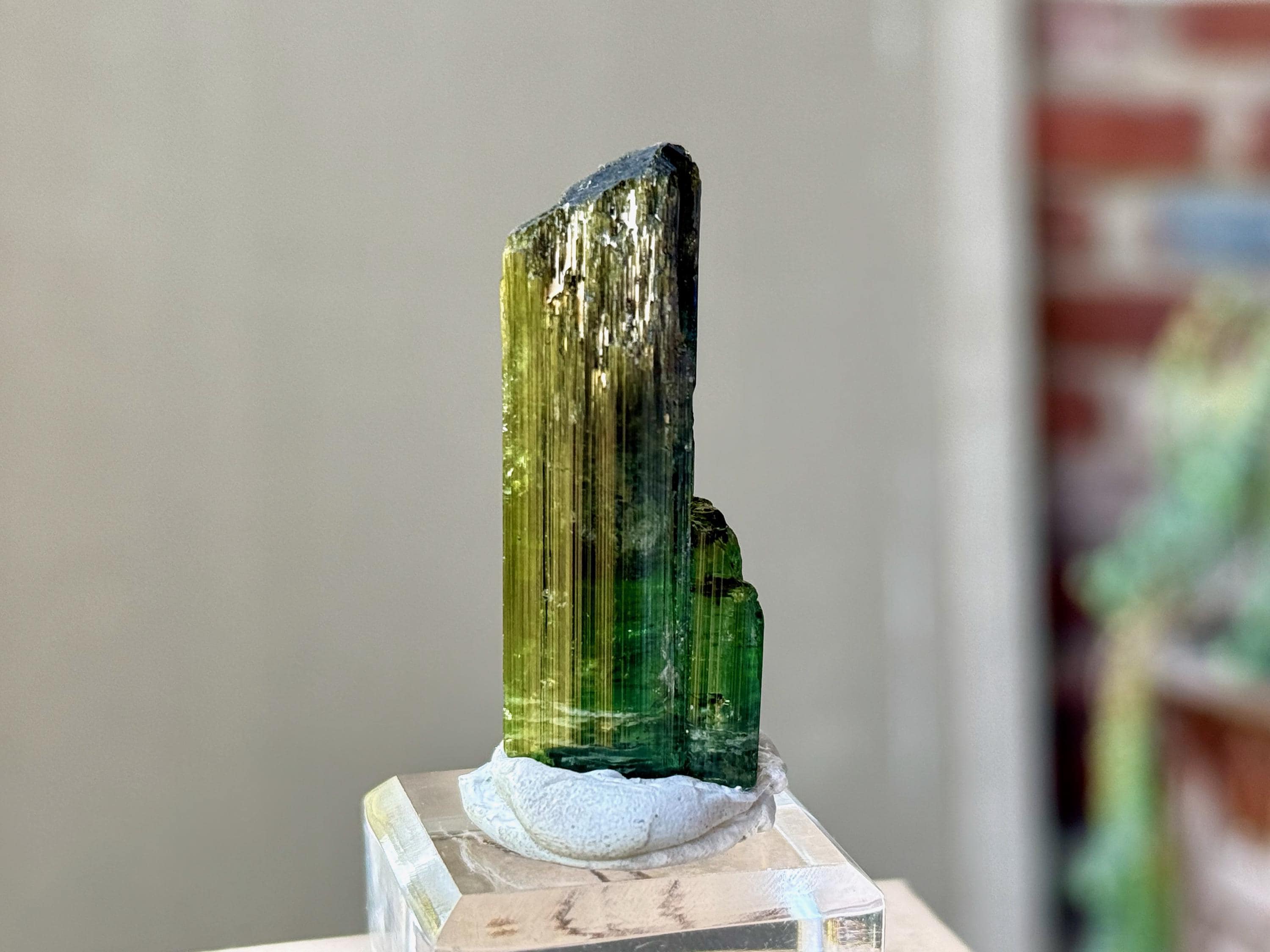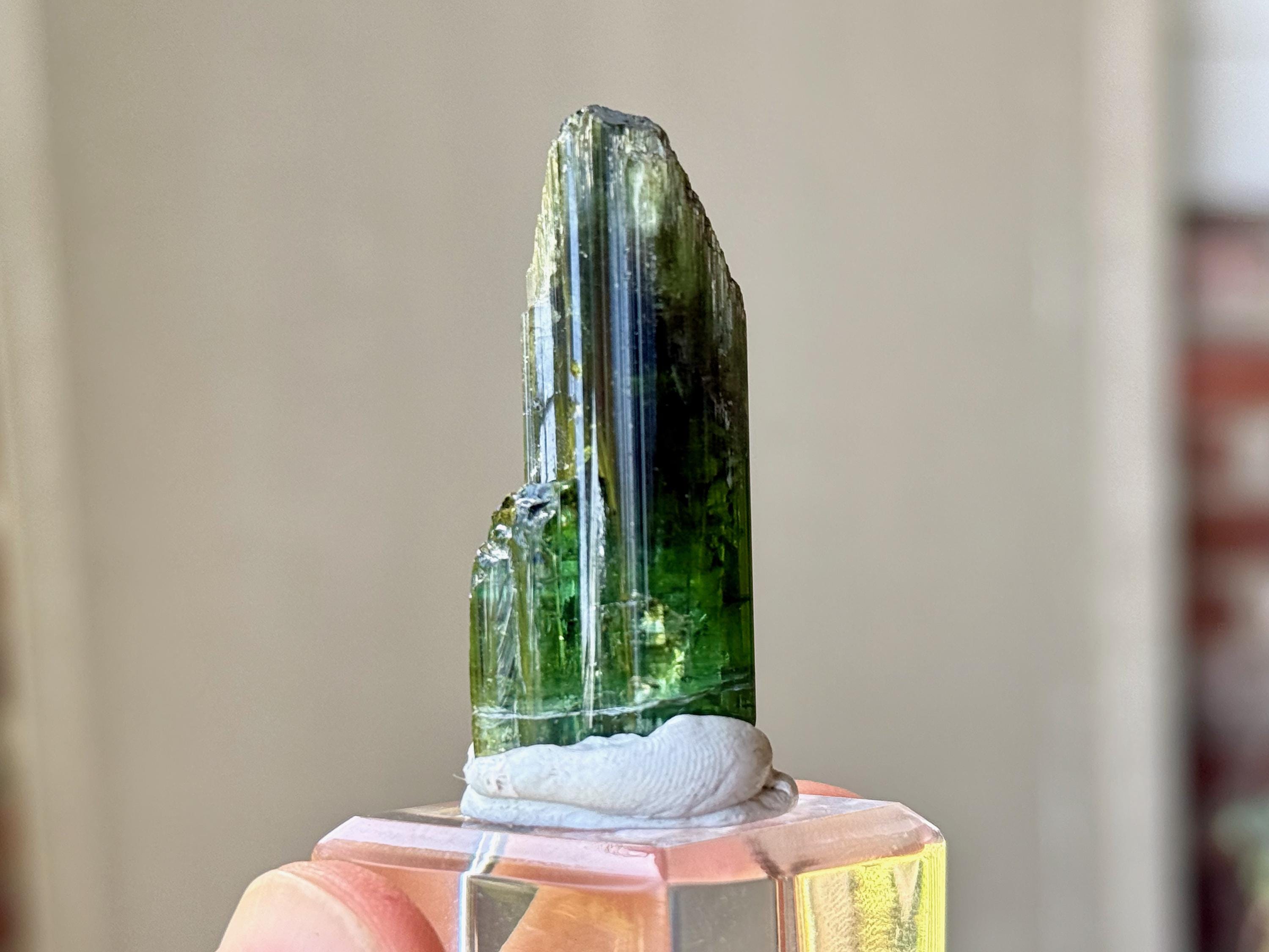 This is a brilliantly hued, highly lustrous, super-juicy Bicolor Tourmaline from the famed Aricanga mine. In natural light, this crystal simply appears to be a darkly lustrous Green Tourmaline. However, when backlit, we can see that the base is a lovely pale teal blue color that blends into green just below the midsection (Photos 1, 4-7). The translucency and depth of color is beautiful.
