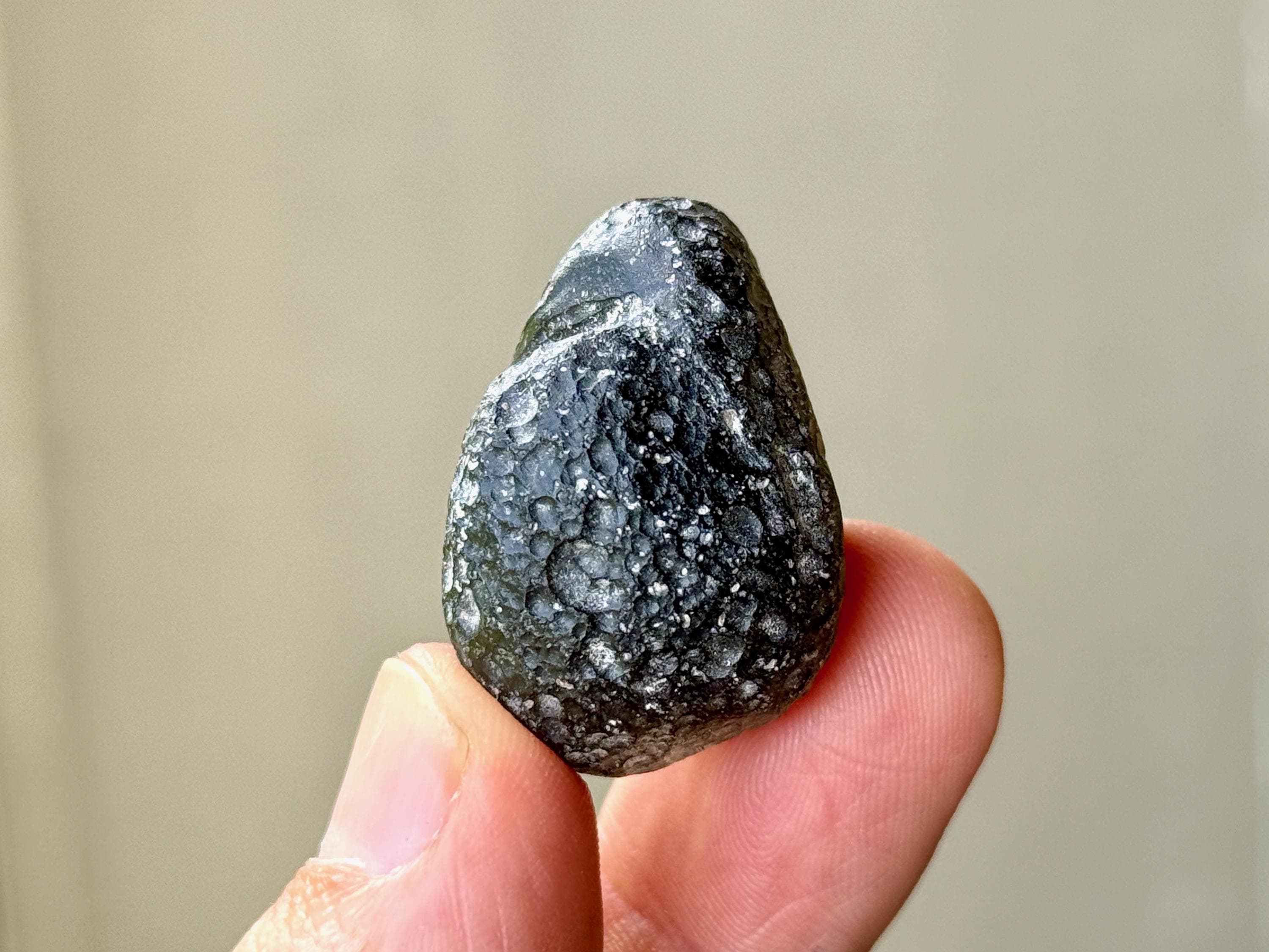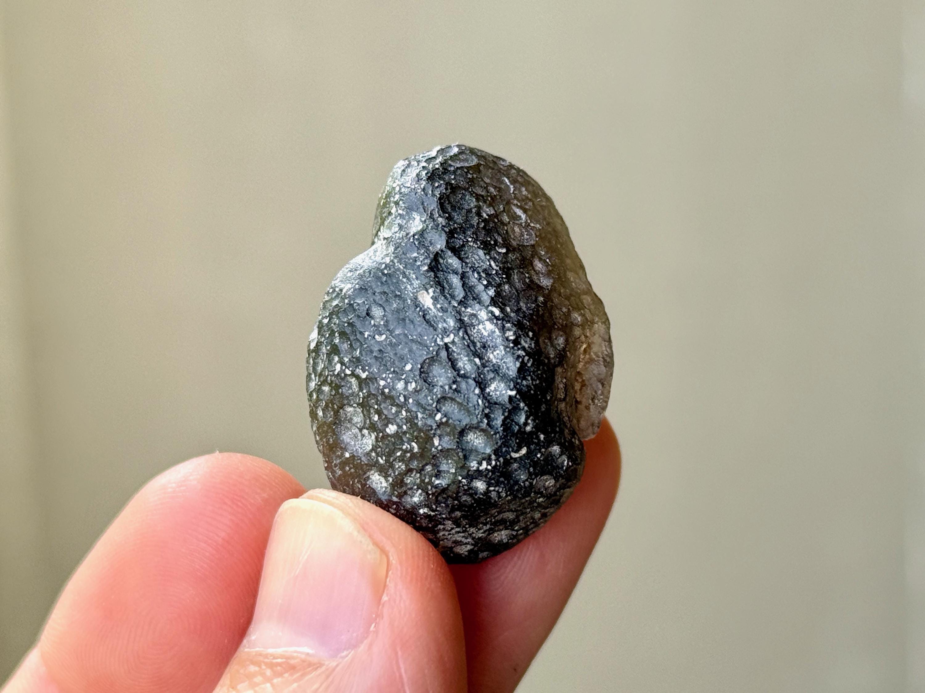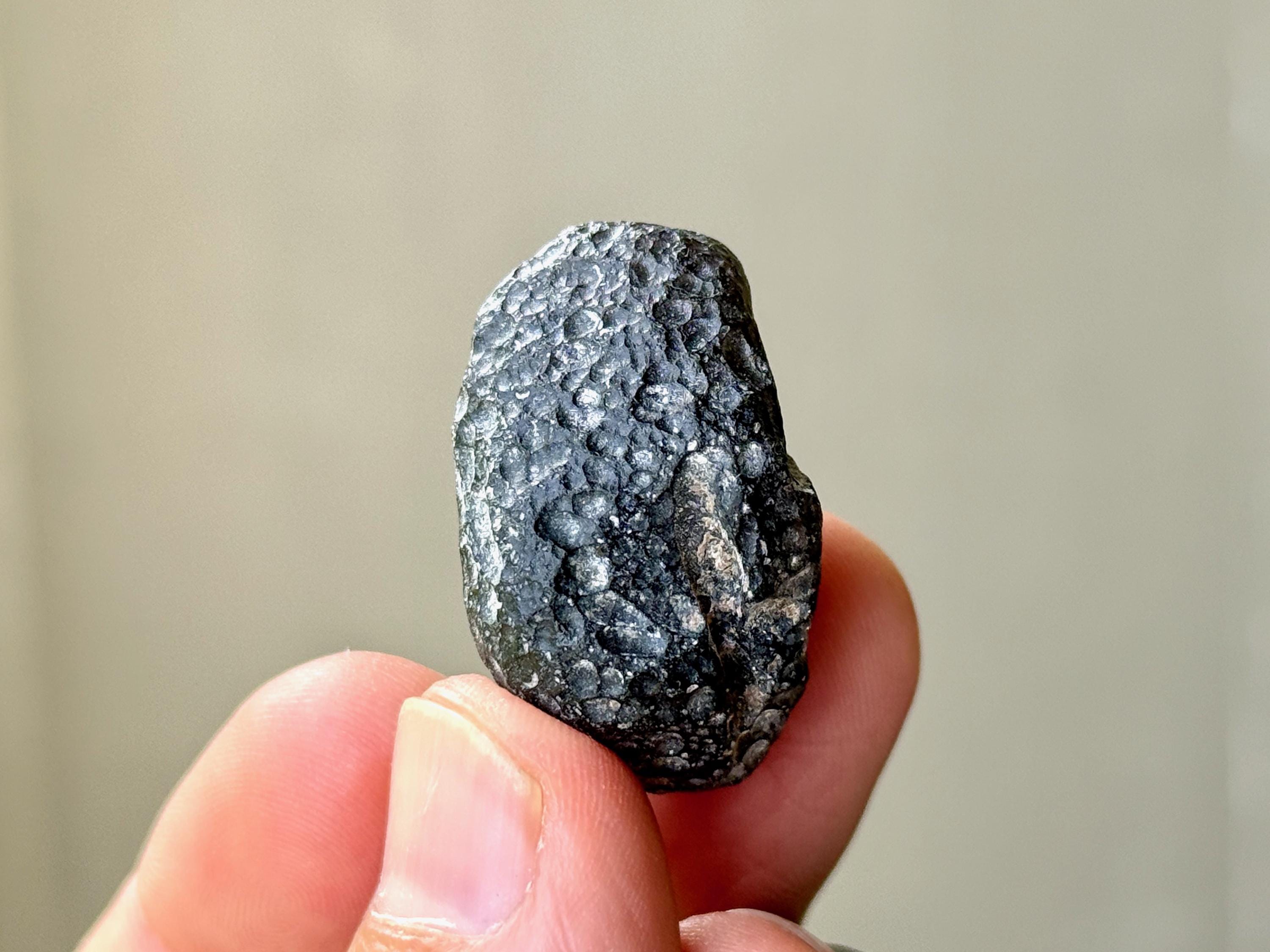 "B" Grade - These specimens may have a slightly duller complexion, with less luster and more more of a charcoal gray hue, as opposed to deep pitch black. They may still have rounded or ovular formations, or they may have irregular shapes and forms. There is still an element of translucency that is often quite high, or it may be slightly less. They may have larger smooth areas where there is no pitting.
