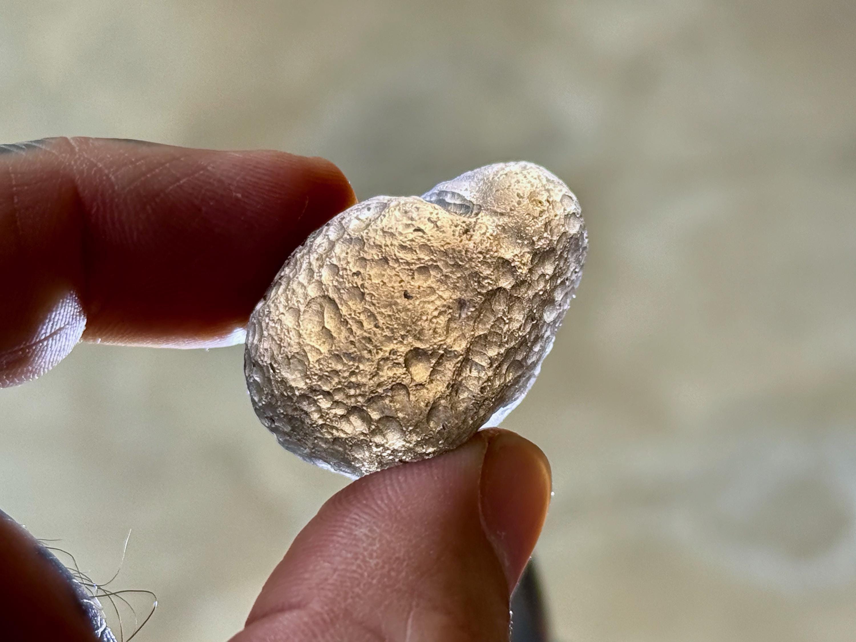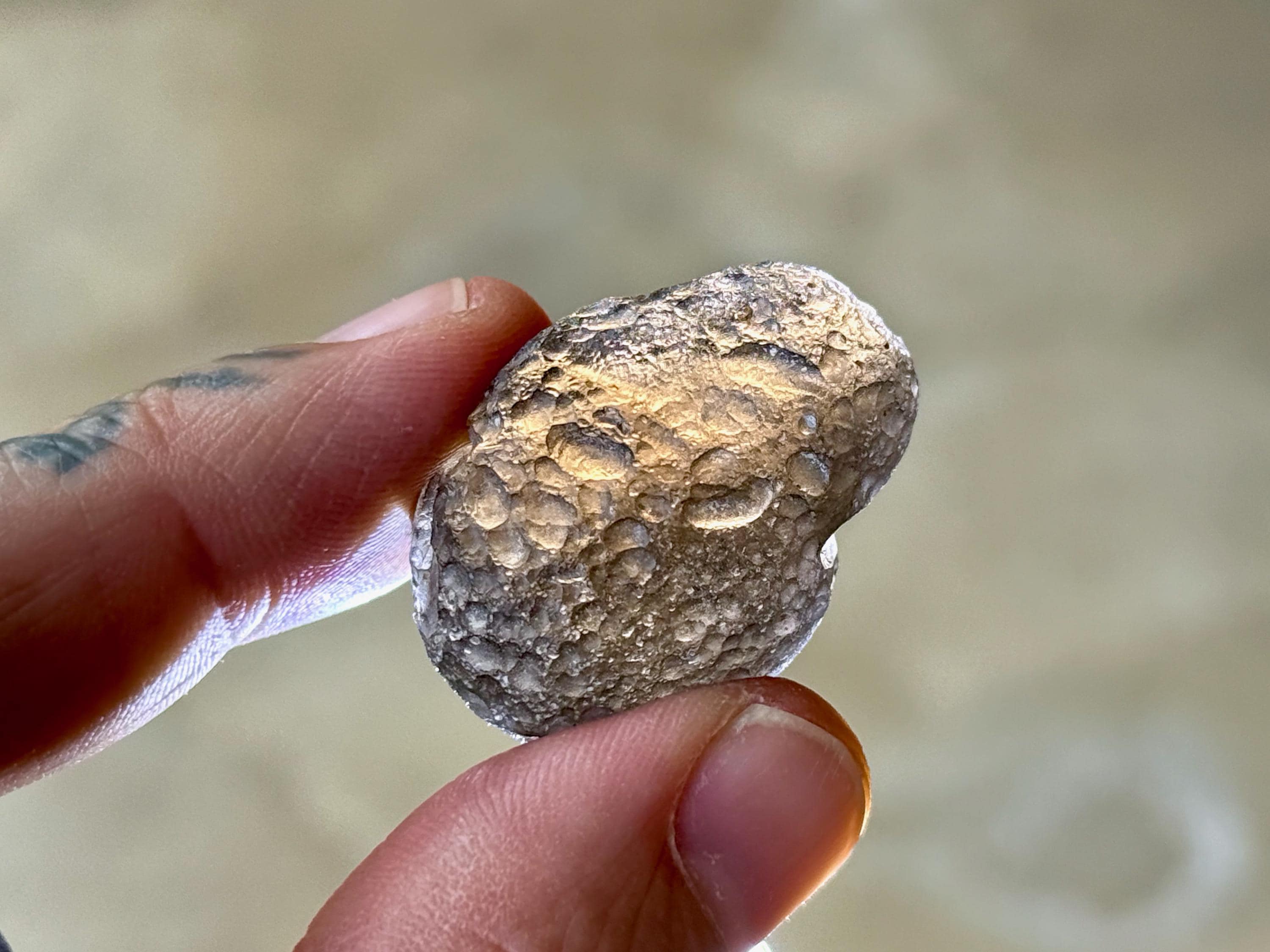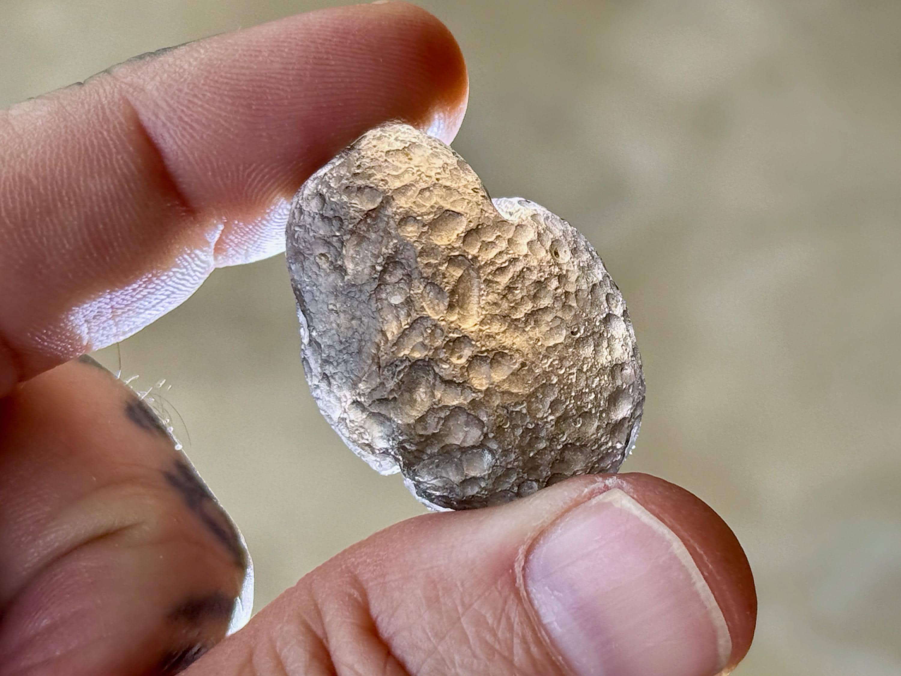 "B" Grade - These specimens may have a slightly duller complexion, with less luster and more more of a charcoal gray hue, as opposed to deep pitch black. They may still have rounded or ovular formations, or they may have irregular shapes and forms. There is still an element of translucency that is often quite high, or it may be slightly less. They may have larger smooth areas where there is no pitting.