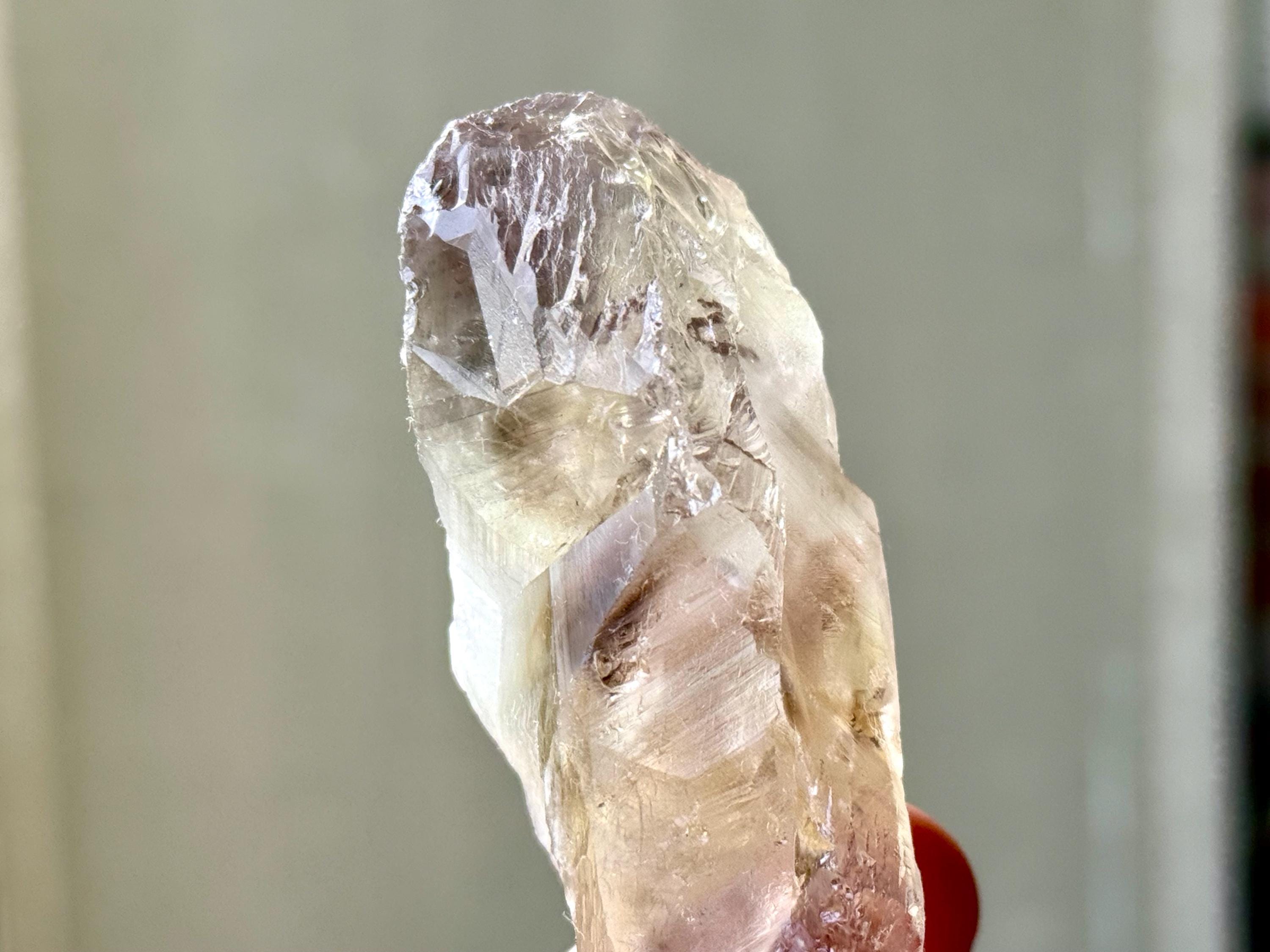 An outstanding broad and elongated "root" formation to this Powellite Phantom Quartz crystal, with outstanding luster and unique textural contact impressions covering its body. There's a mild hint of Amethyst inclusion just below the top.
