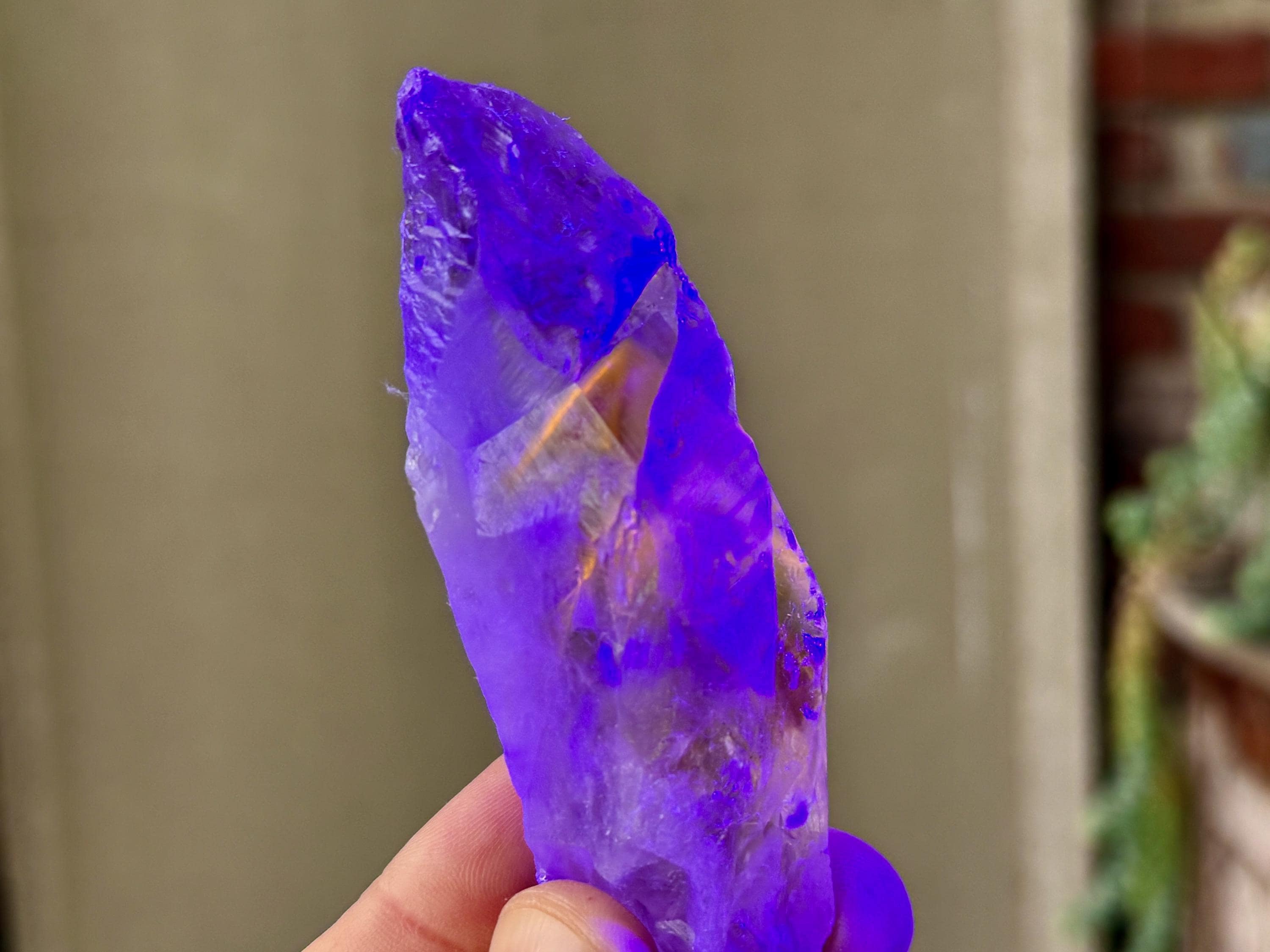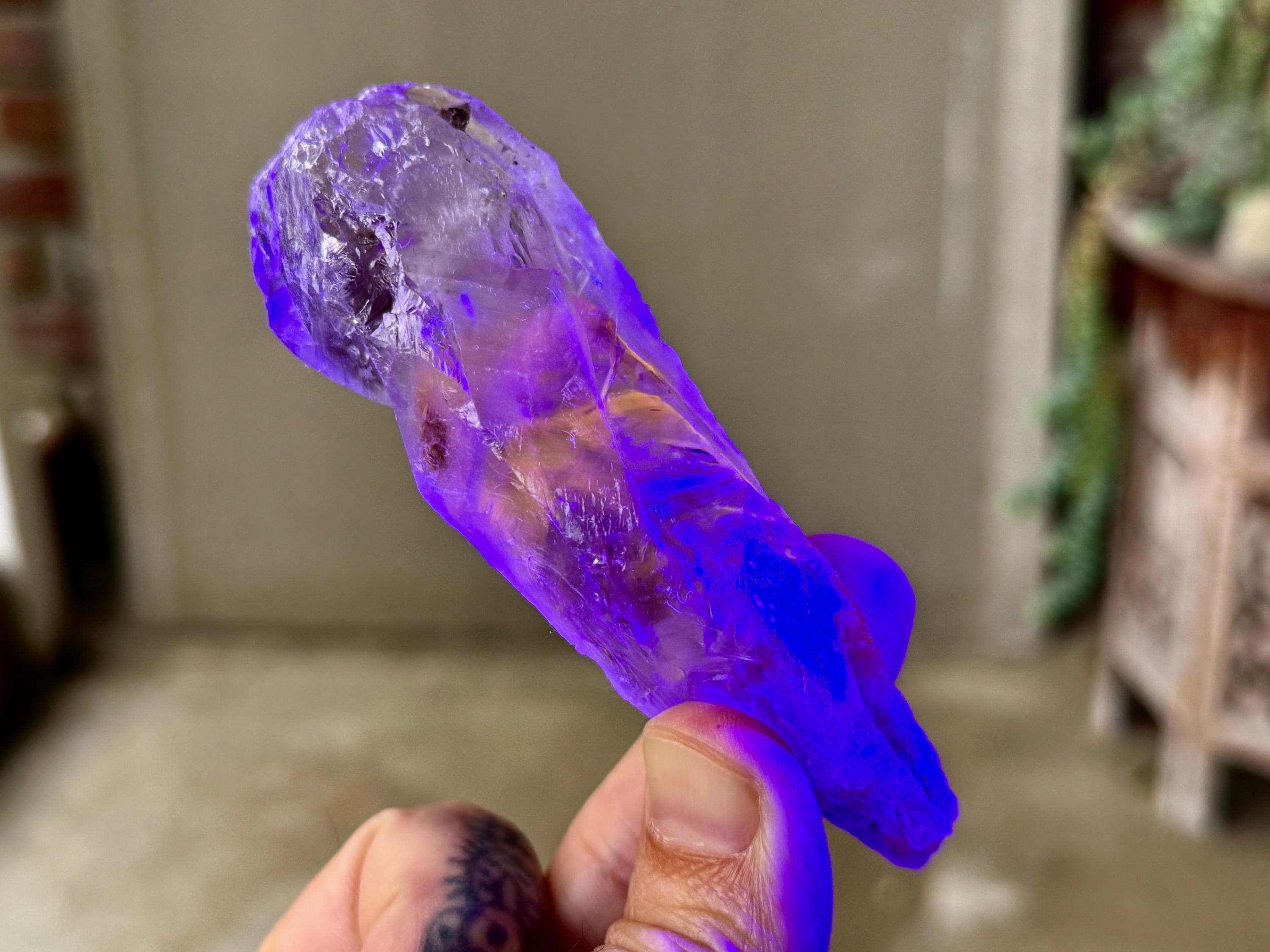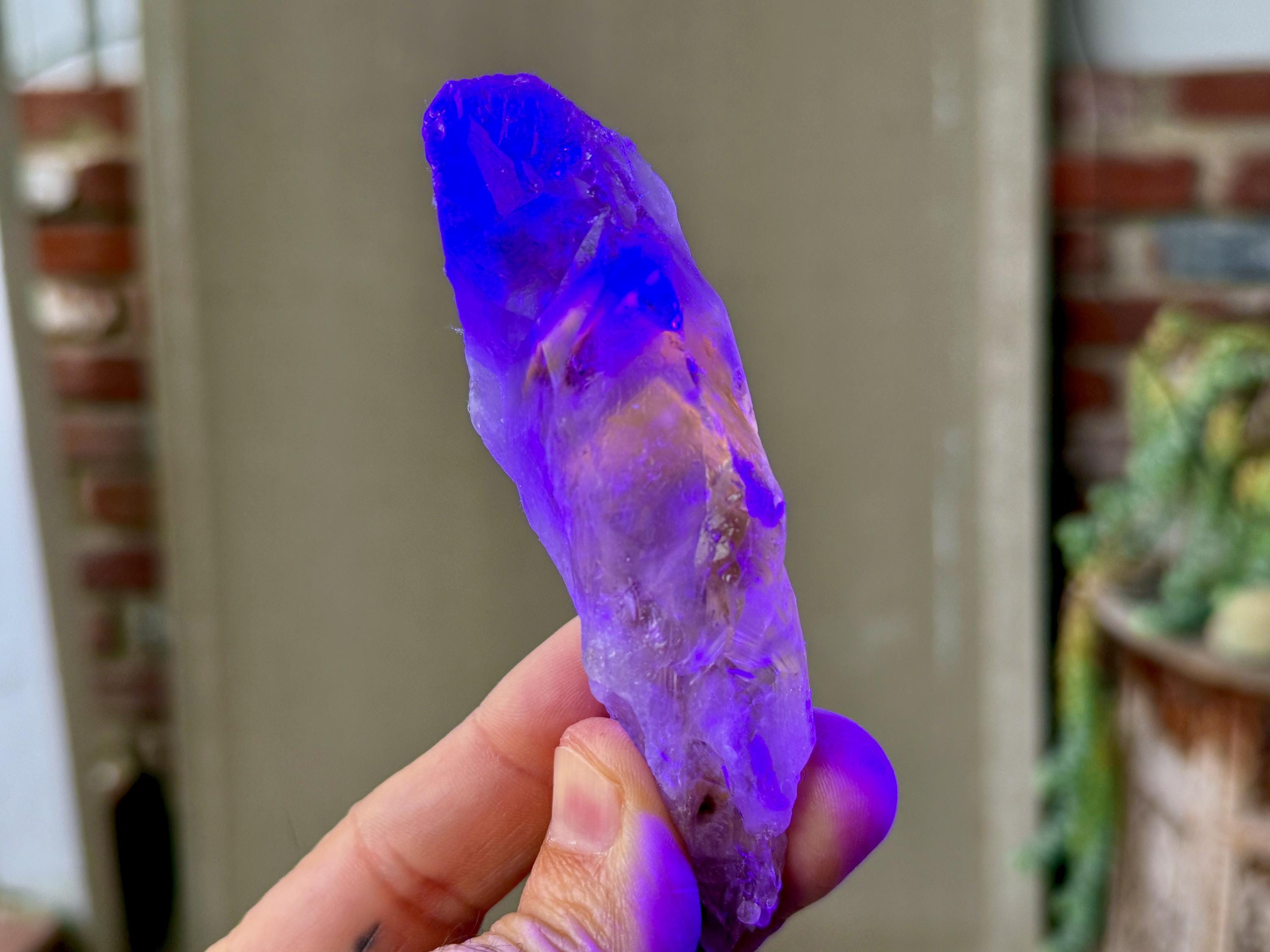 **Please note, the inclusions in this crystal are all natural/untreated. A UV light is necessary to see the phantoms glow, and they can be found affordably at Amazon or any other online outlet. Also, please note that the dark purple hues in the UV-lit photos are a result of the UV light itself and not the color of the crystal. The natural color is shown in the natural-light photos included in this listing.