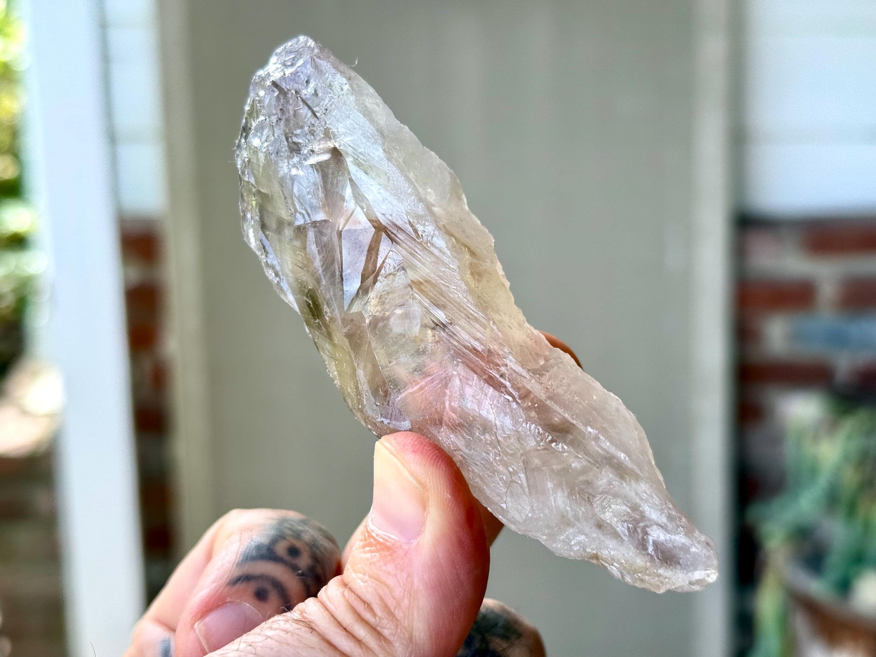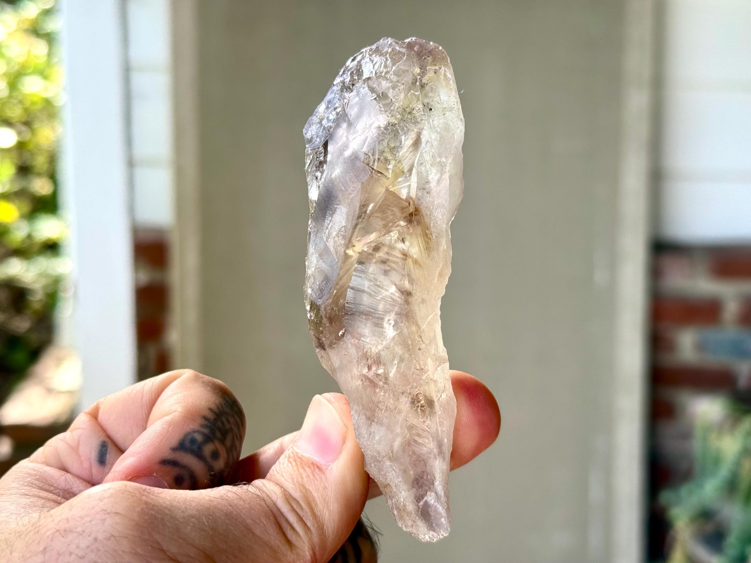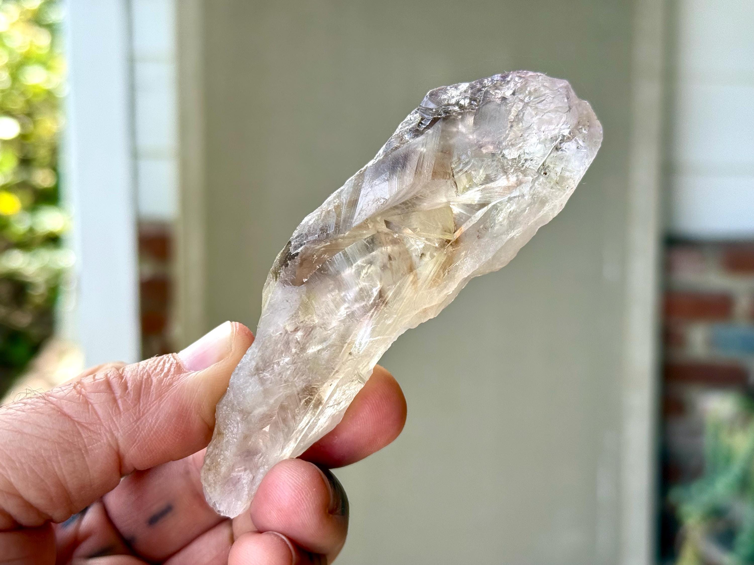 **Please note, the inclusions in this crystal are all natural/untreated. A UV light is necessary to see the phantoms glow, and they can be found affordably at Amazon or any other online outlet. Also, please note that the dark purple hues in the UV-lit photos are a result of the UV light itself and not the color of the crystal. The natural color is shown in the natural-light photos included in this listing.