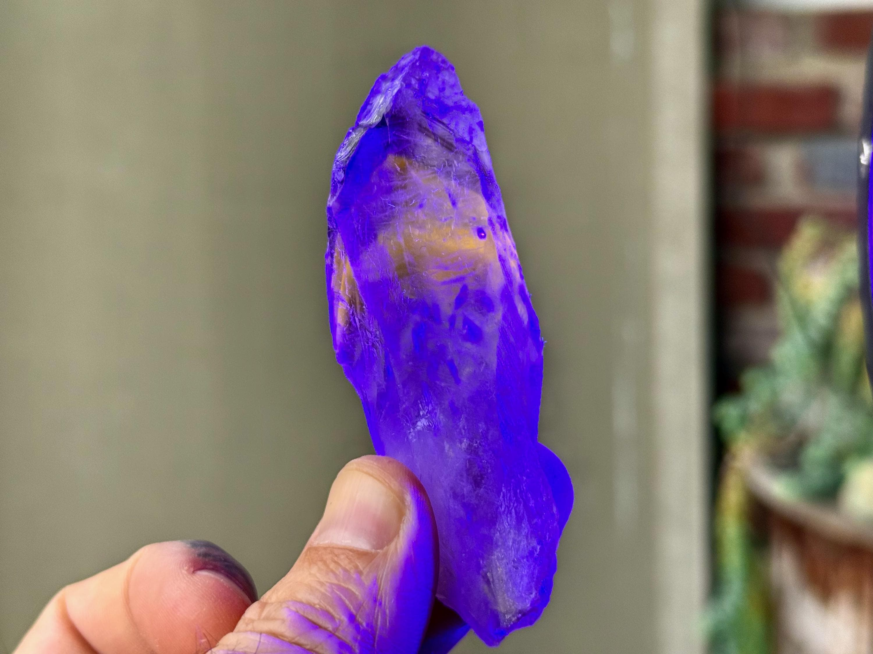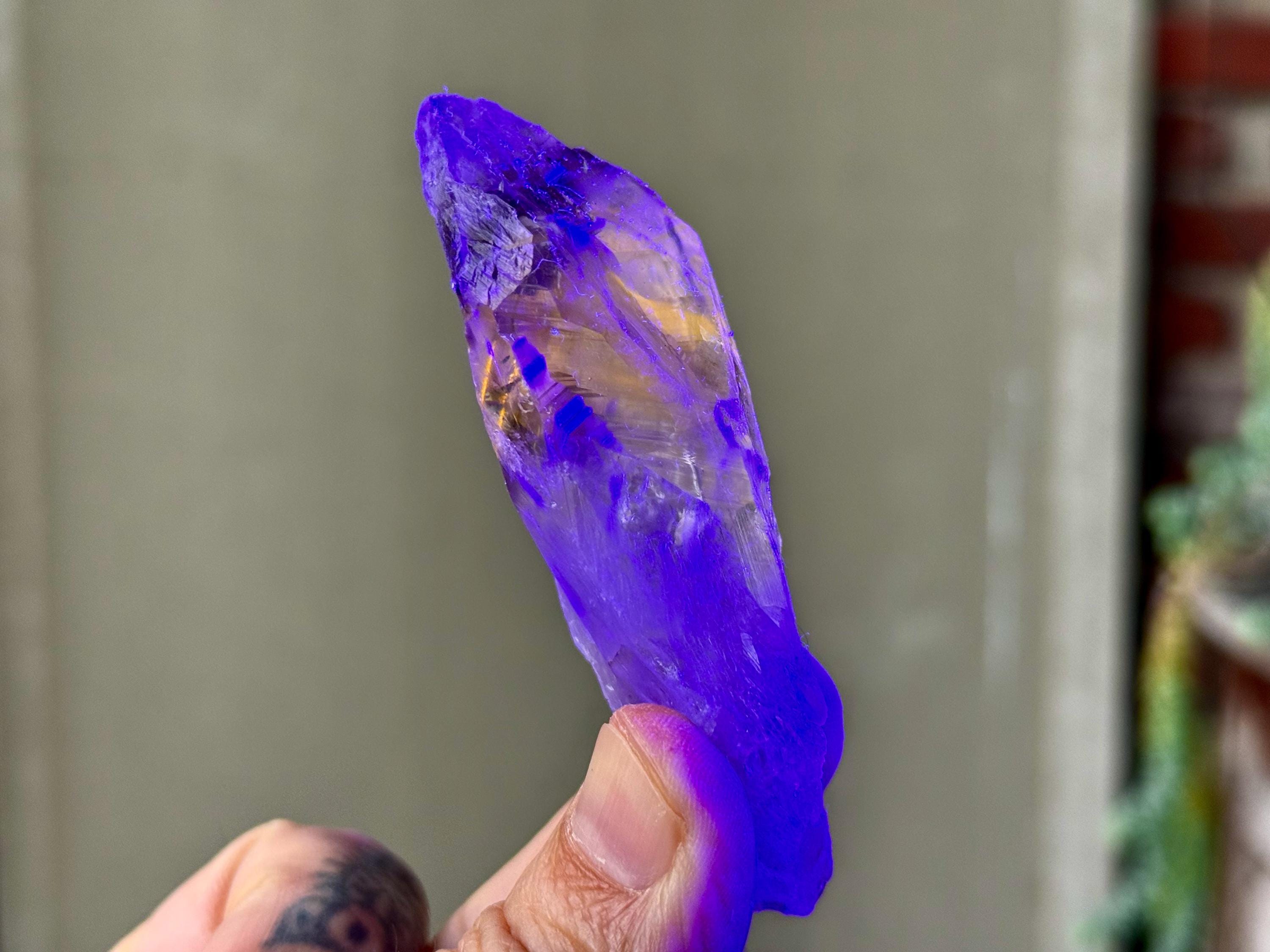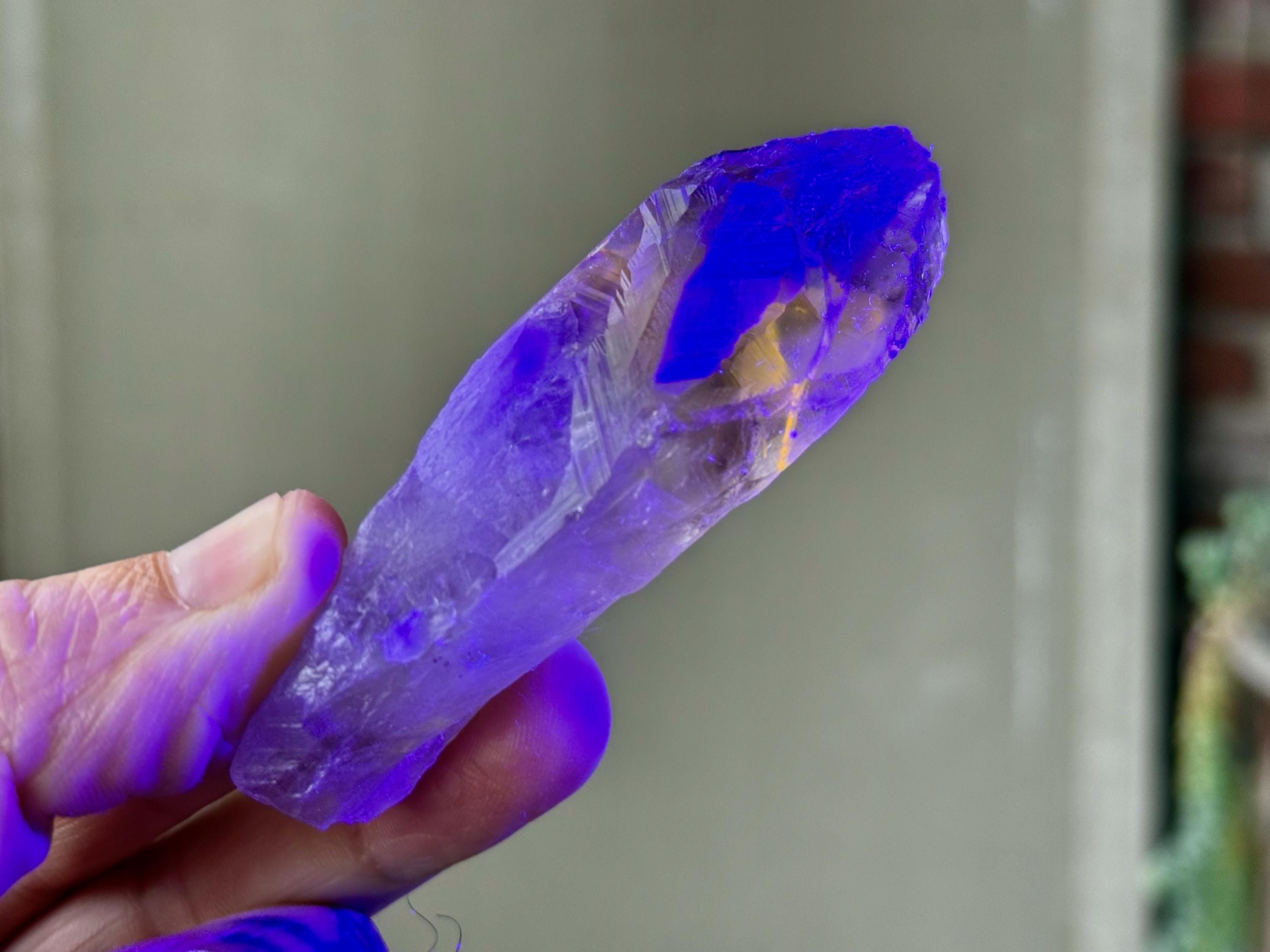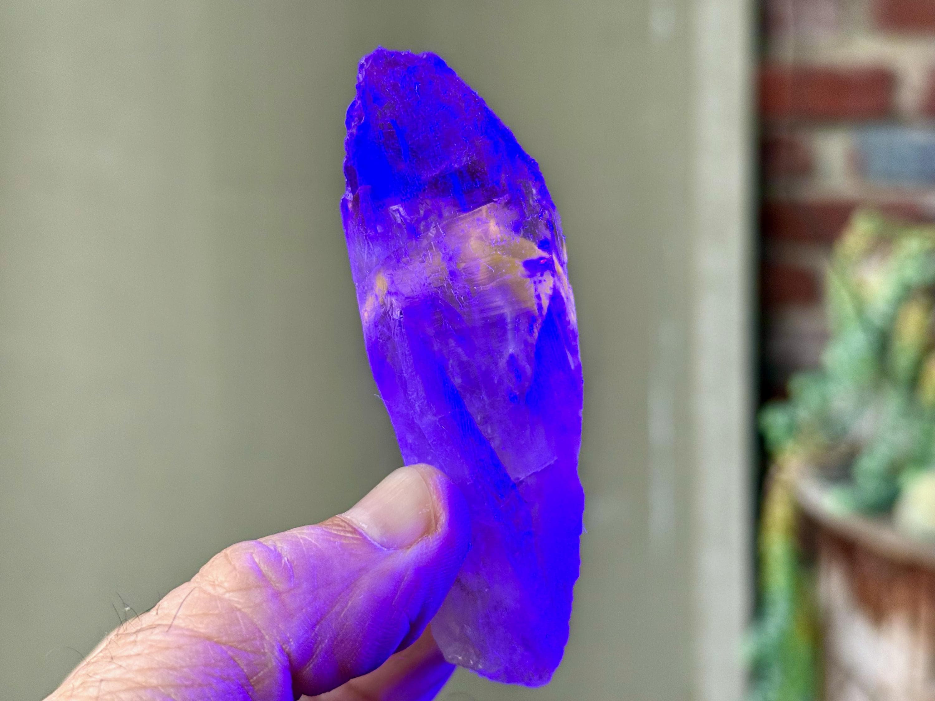**Please note, the inclusions in this crystal are all natural/untreated. A UV light is necessary to see the phantoms glow, and they can be found affordably at Amazon or any other online outlet. Also, please note that the dark purple hues in the UV-lit photos are a result of the UV light itself and not the color of the crystal. The natural color is shown in the natural-light photos included in this listing.