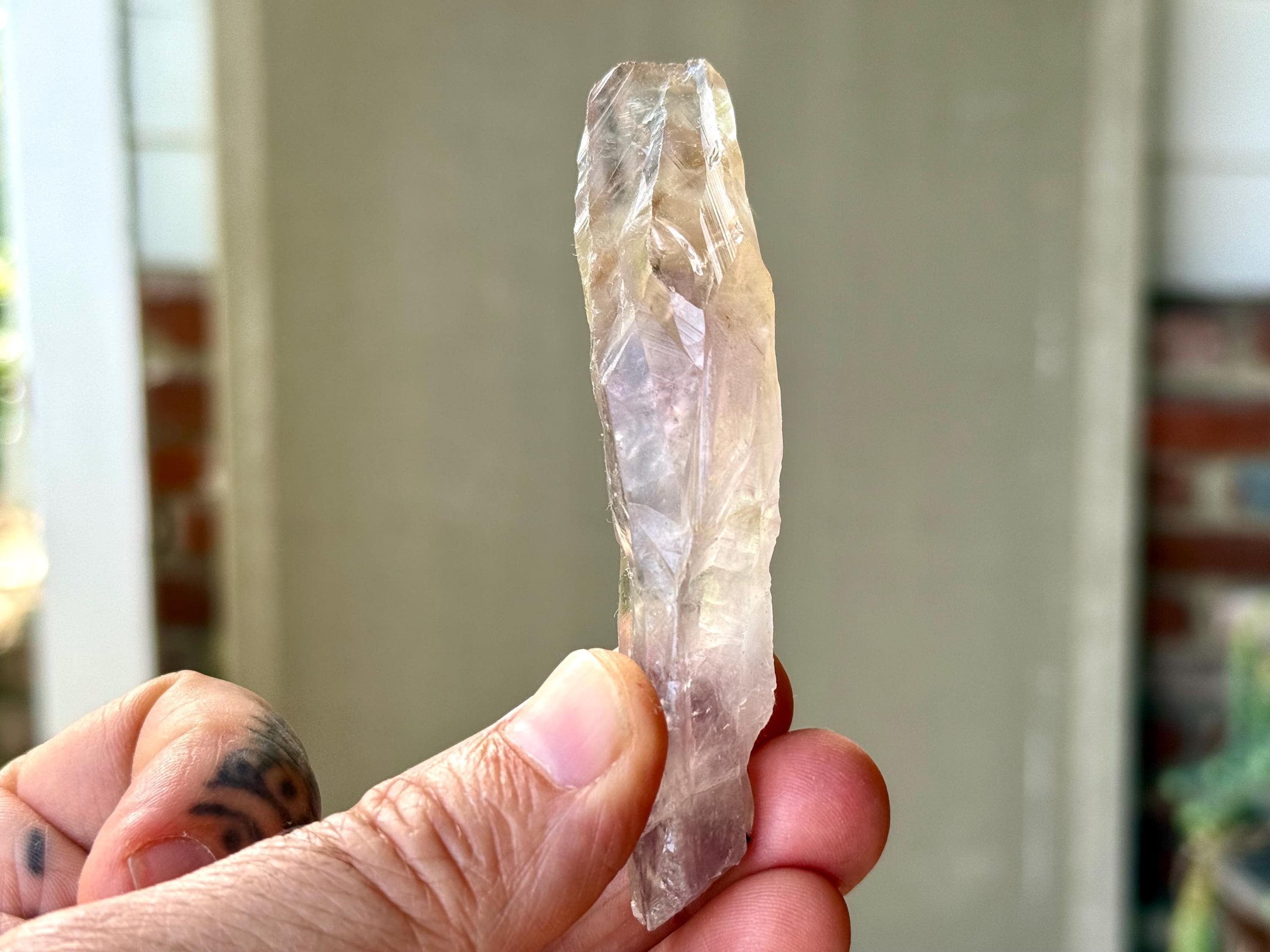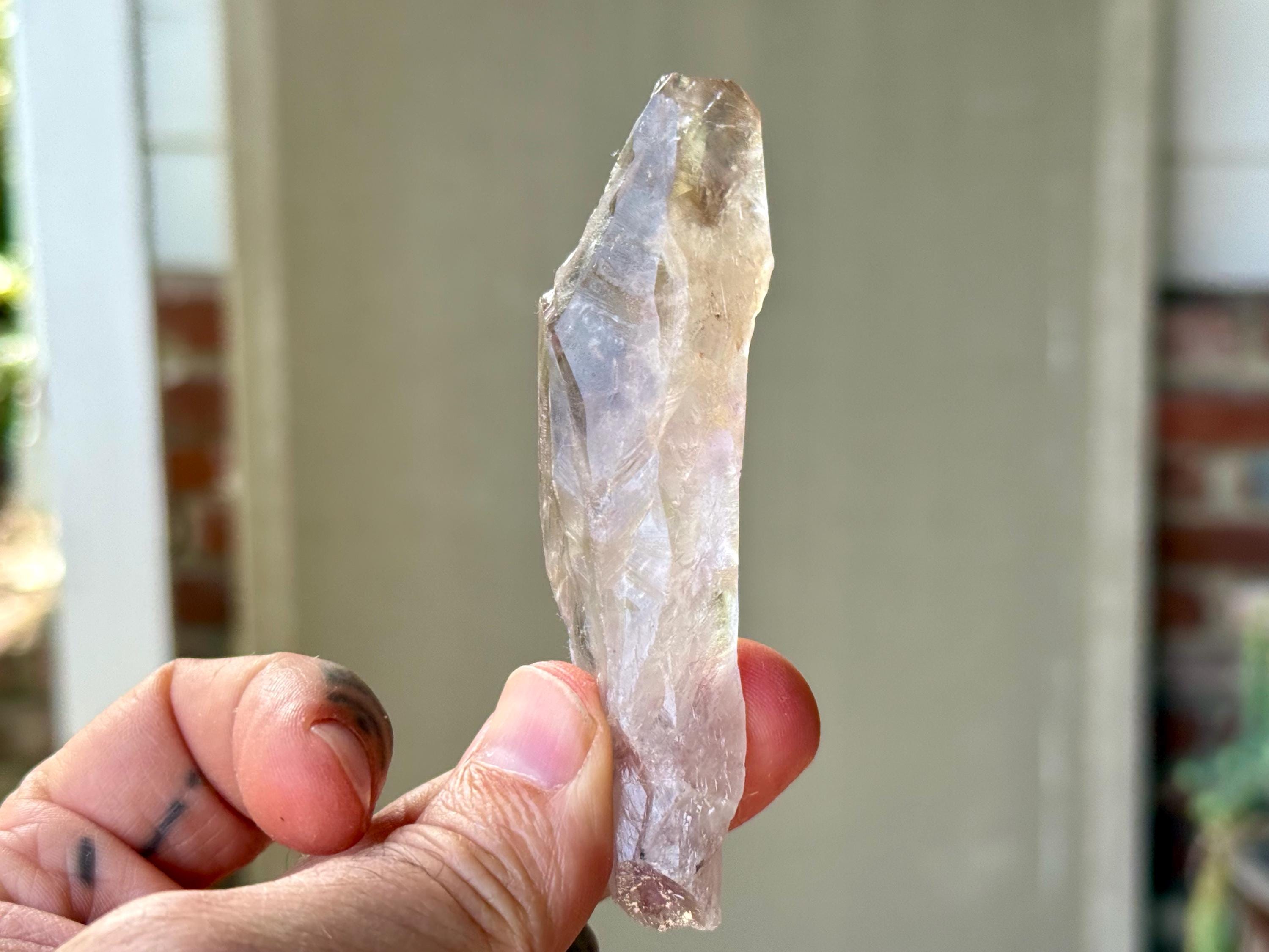 Superb clarity and brilliant luster to this Powellite Phantom Quartz in an elongated "root" formation, with unique, textural contact imprints covering its body. This crystal has a mild inclusion of golden Ametrine.