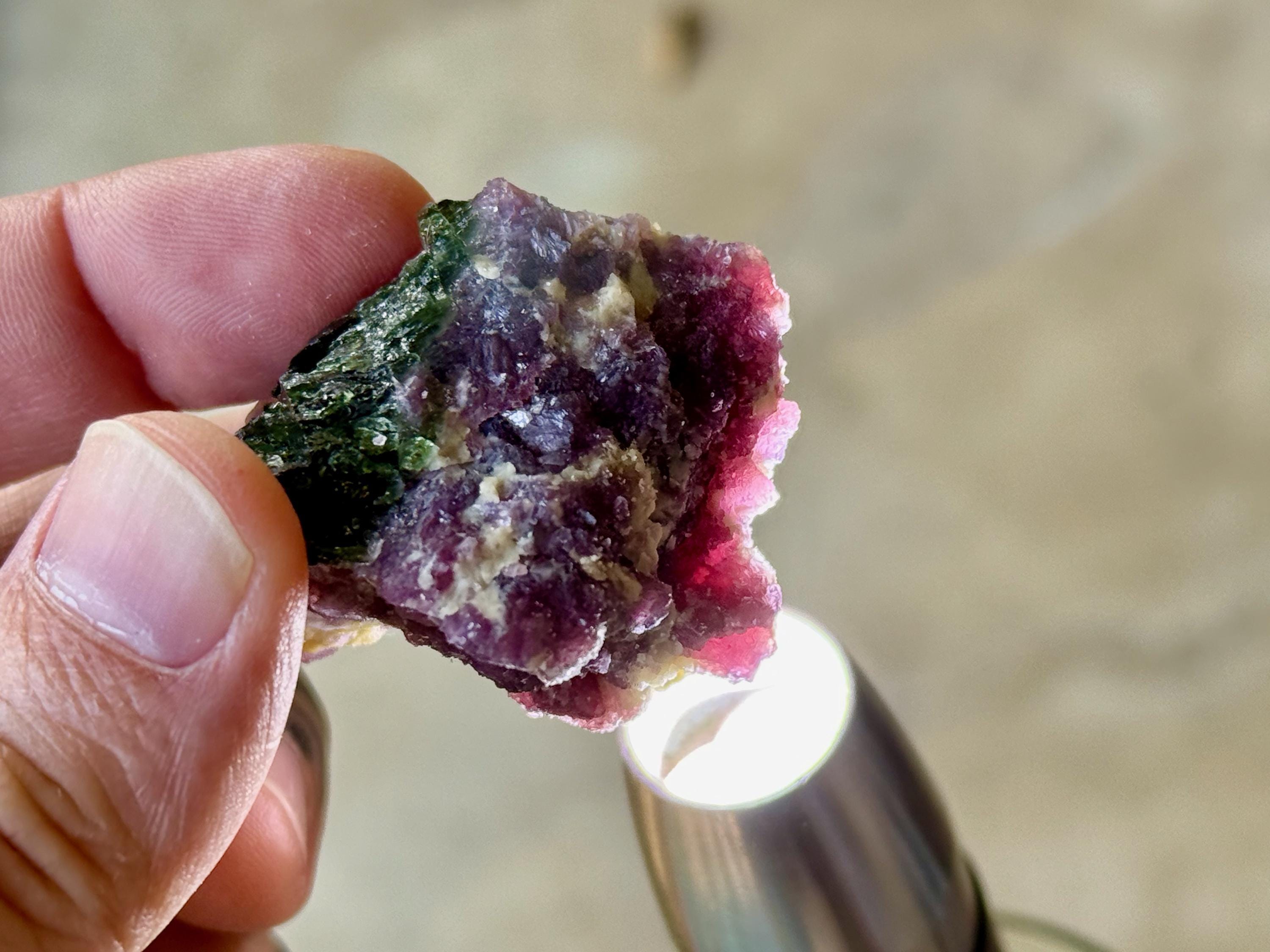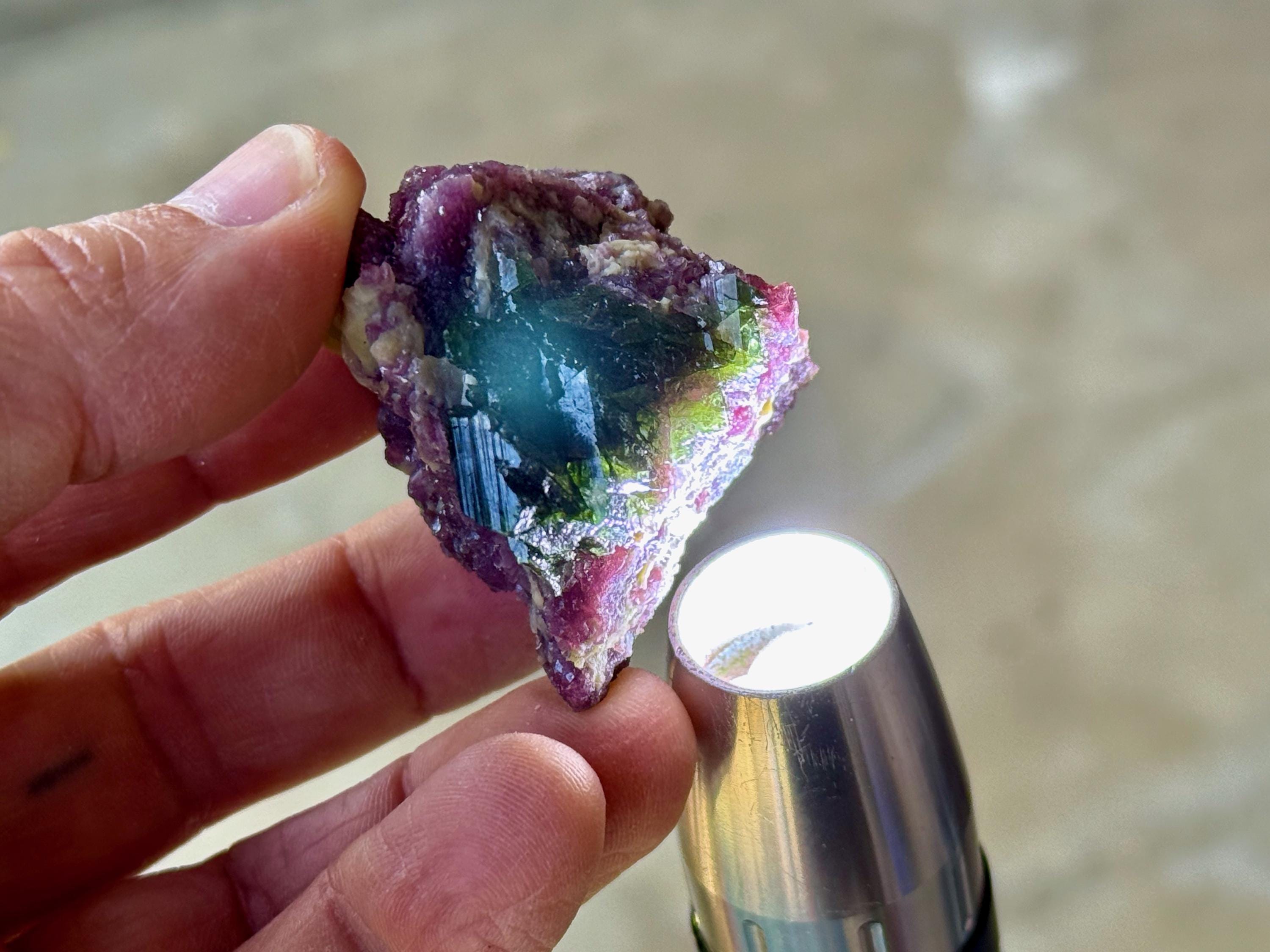The crystals from this region include unique combinations of Quartz, Citrine, Lepidolite, Albite, Cleavelandite and Feldspar, with vividly colored Tourmalines in lovely hues of green, pink, purple and blue. Crystals with combinations of these minerals are sometimes referred to as "Unicorn Stones."