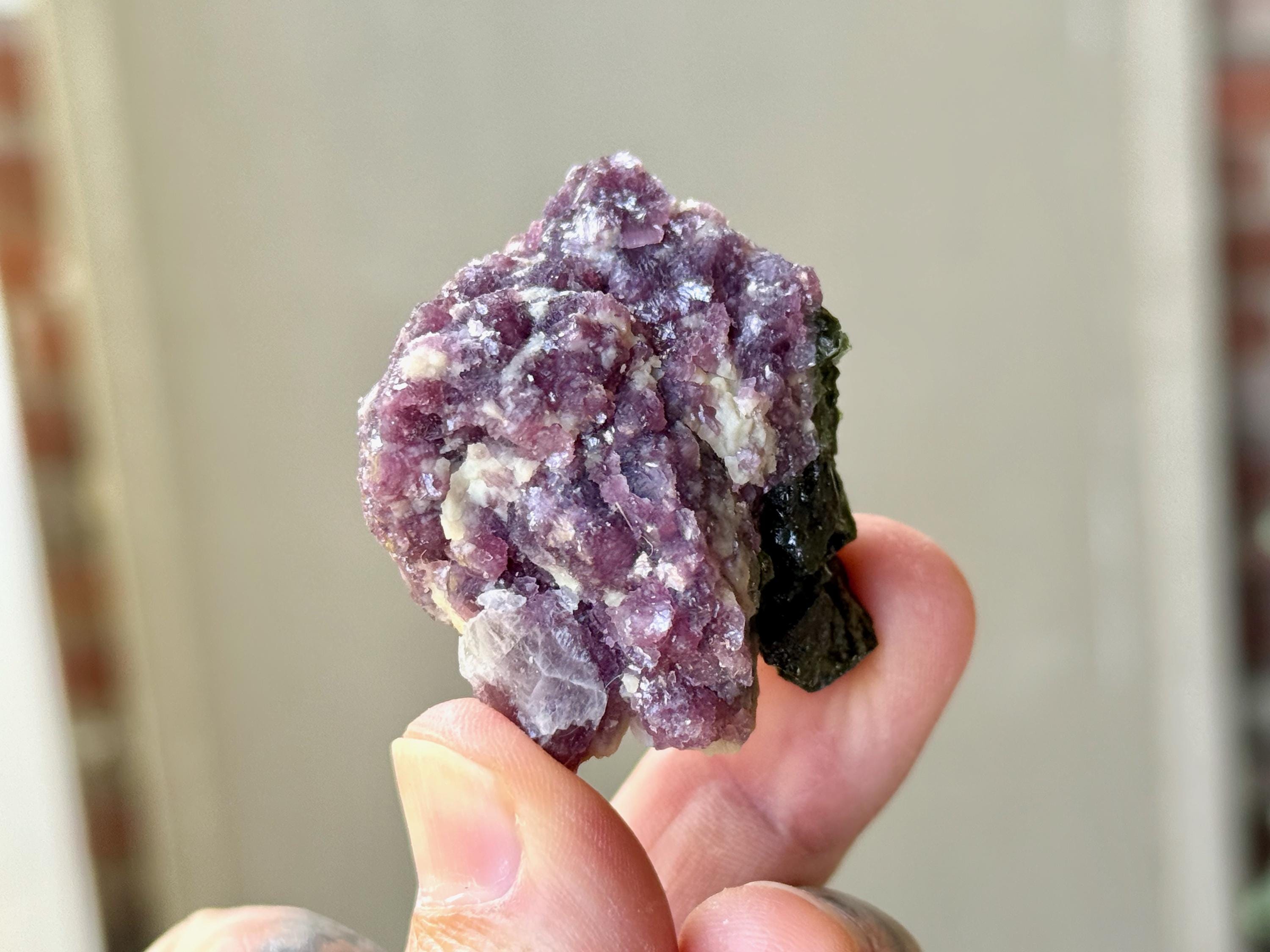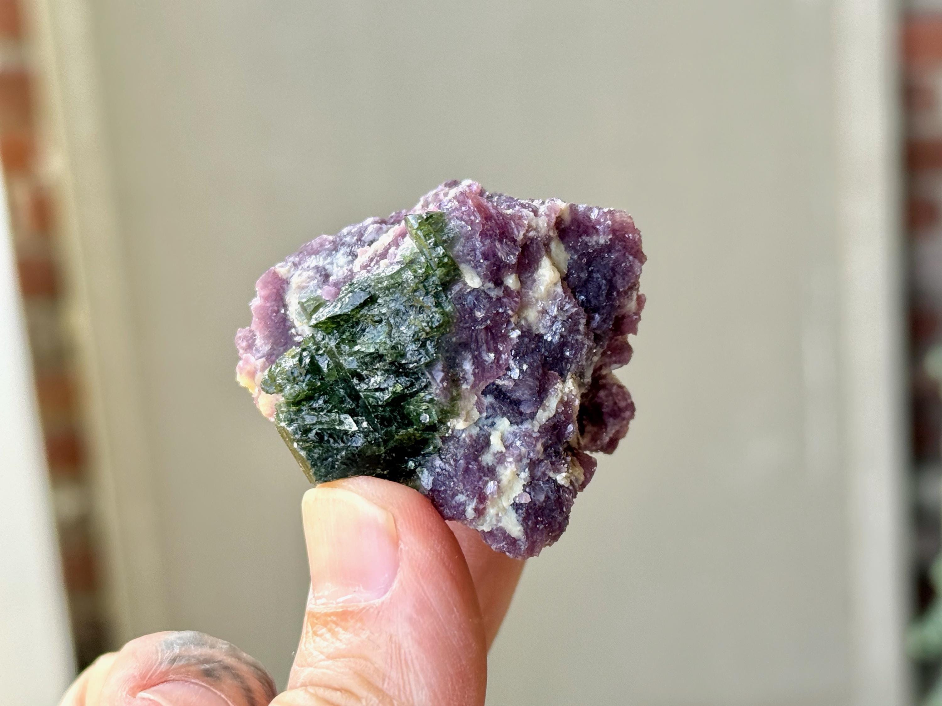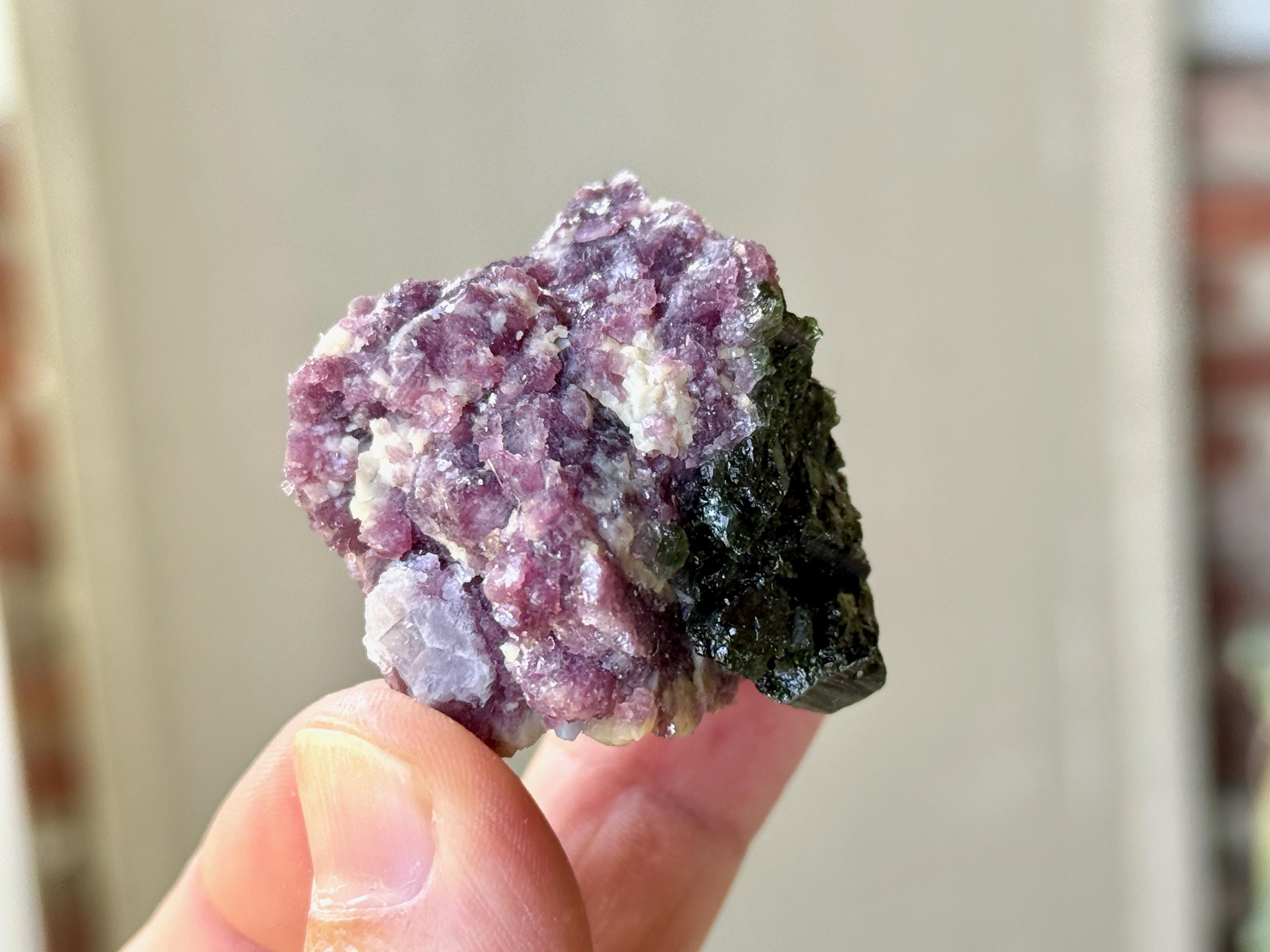 This vibrant Purple Lepidolite crystal with Green Tourmaline comes from a recent (2025) find in the area of Coronel Murta, Minas Gerais, Brazil. Energetically, Lepidolite has a strong relaxing, balancing and calming effect, while Green Tourmaline is a wonderful Heart Chakra crystal.