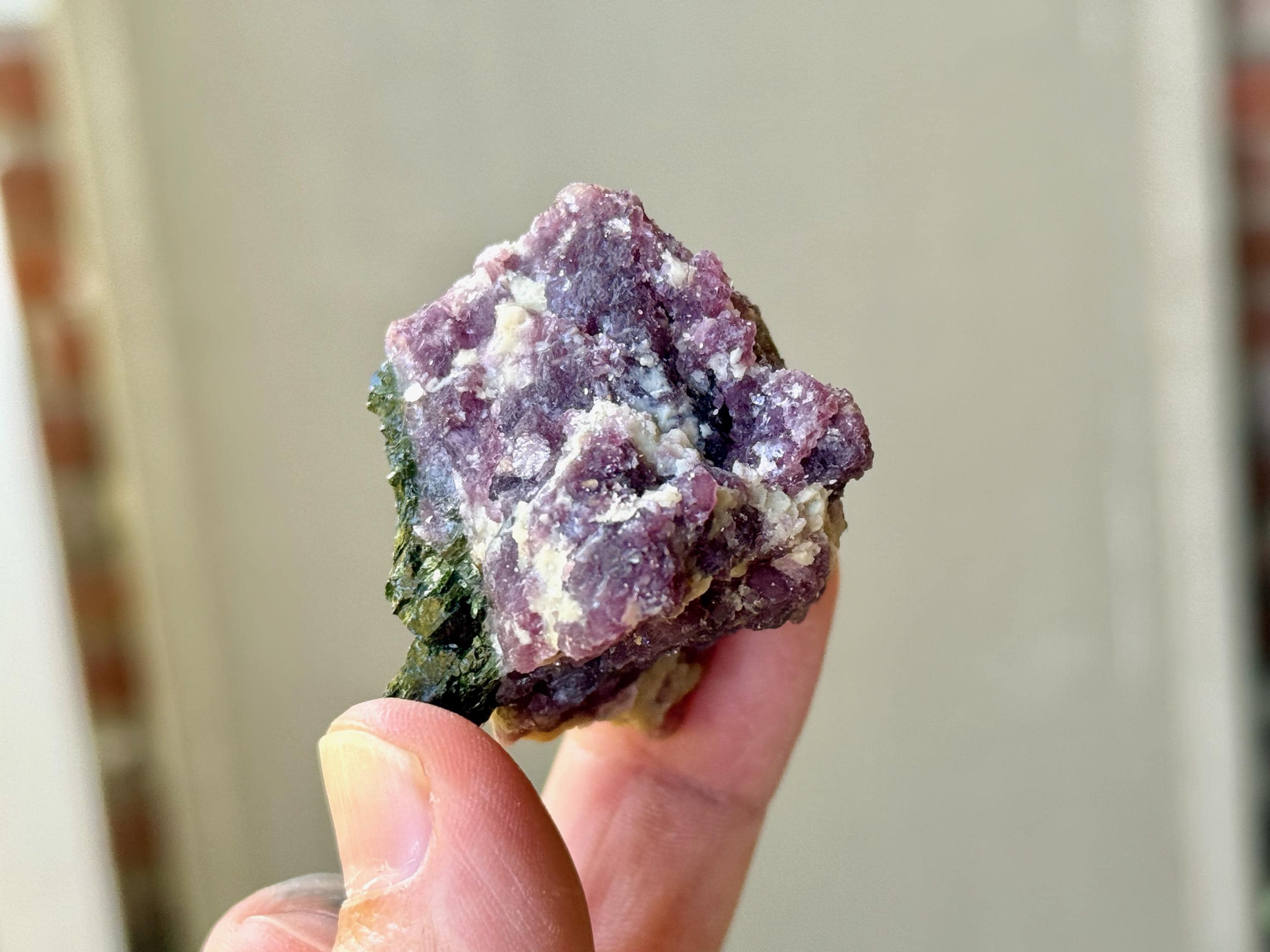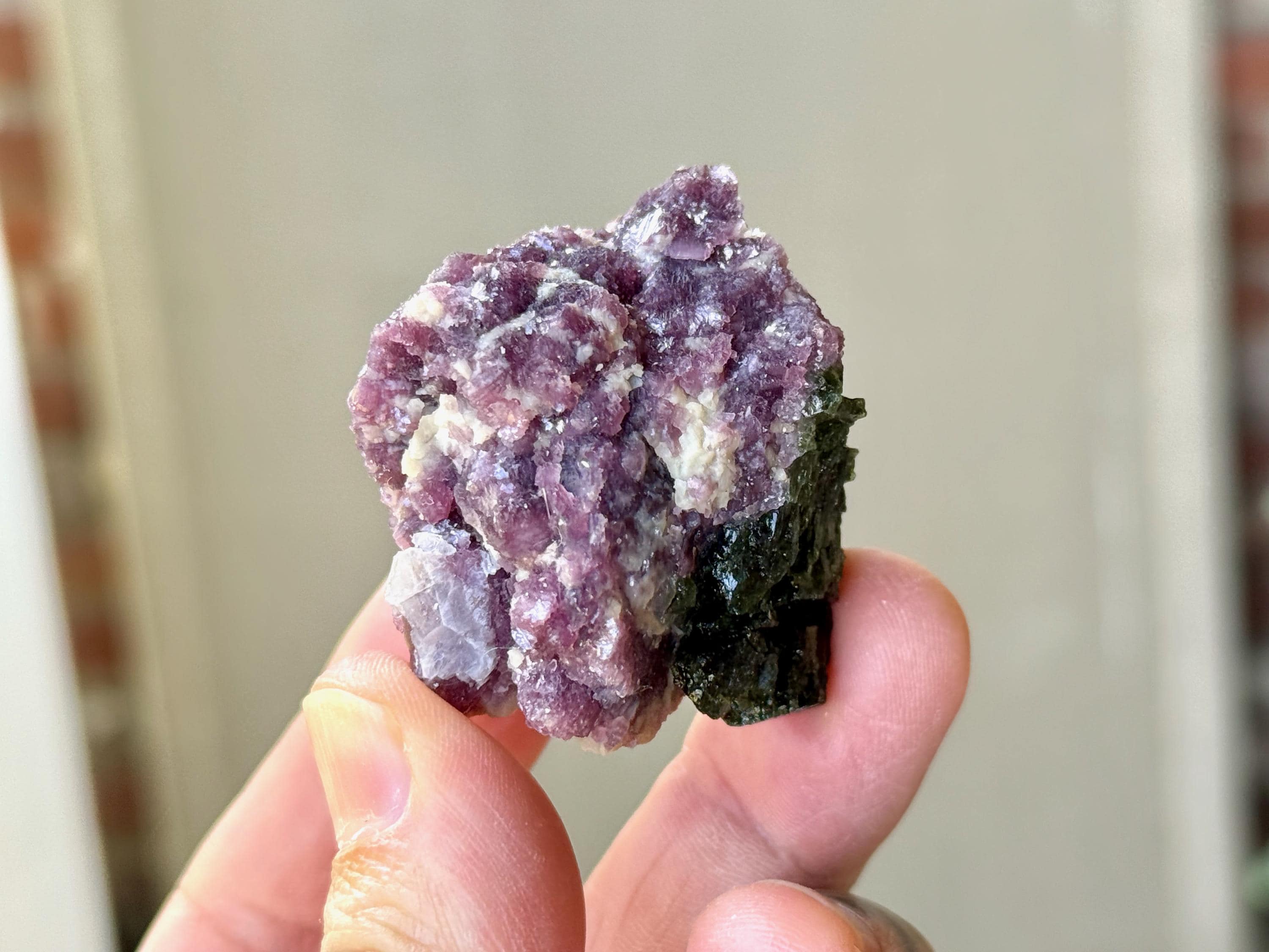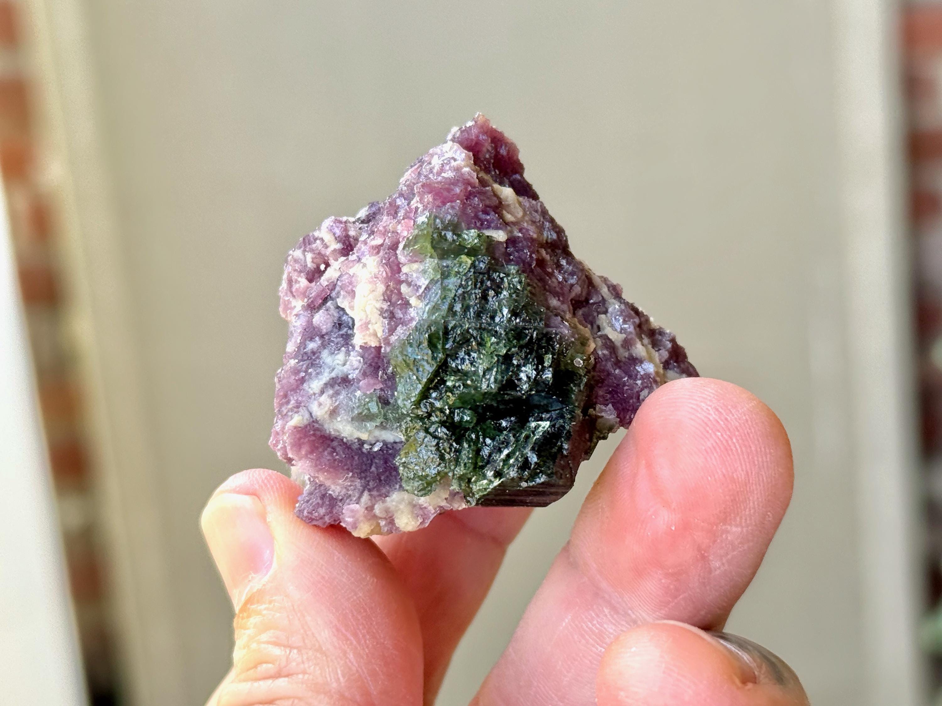 This vibrant Purple Lepidolite crystal with Green Tourmaline comes from a recent (2025) find in the area of Coronel Murta, Minas Gerais, Brazil. Energetically, Lepidolite has a strong relaxing, balancing and calming effect, while Green Tourmaline is a wonderful Heart Chakra crystal.
