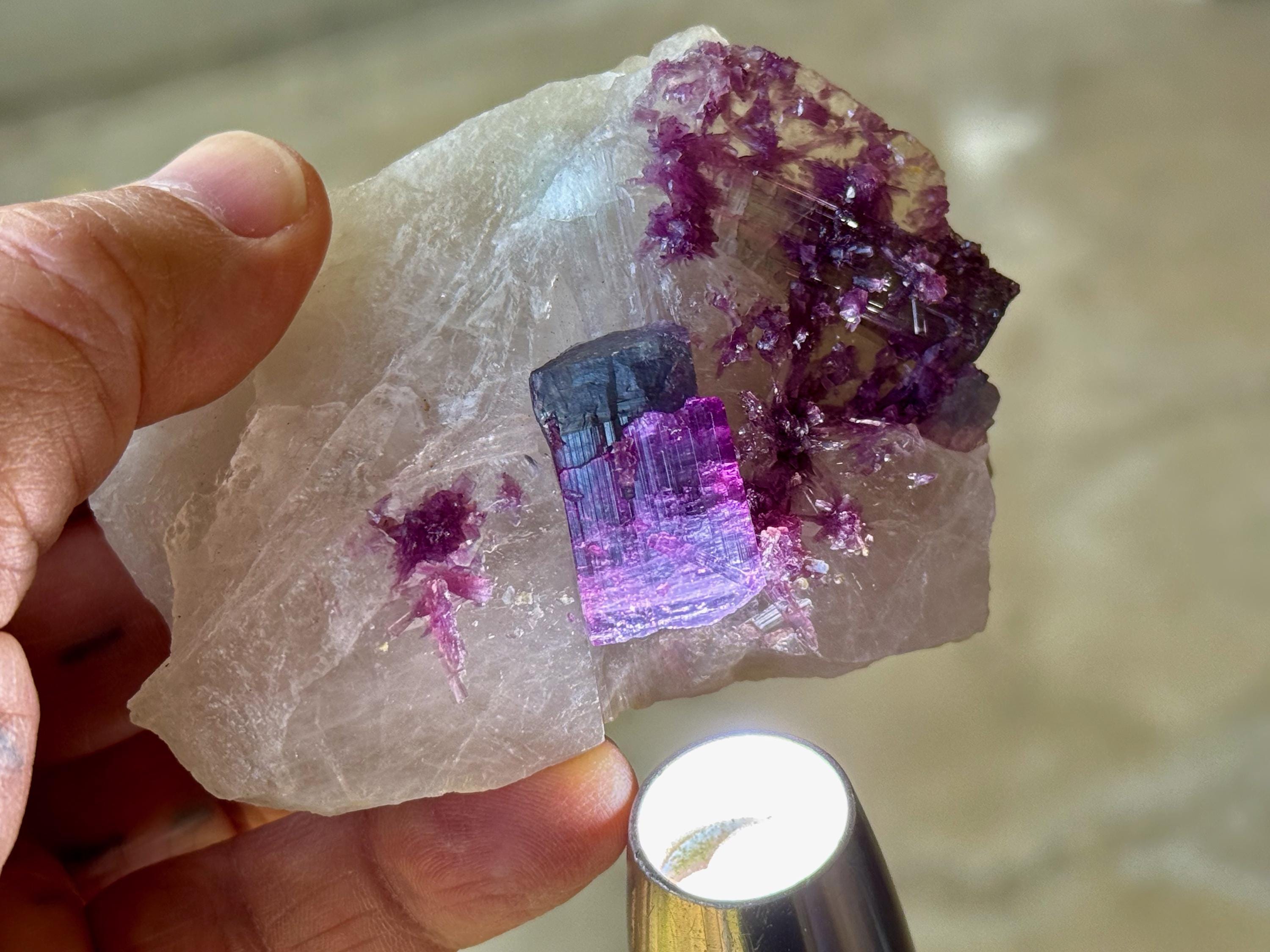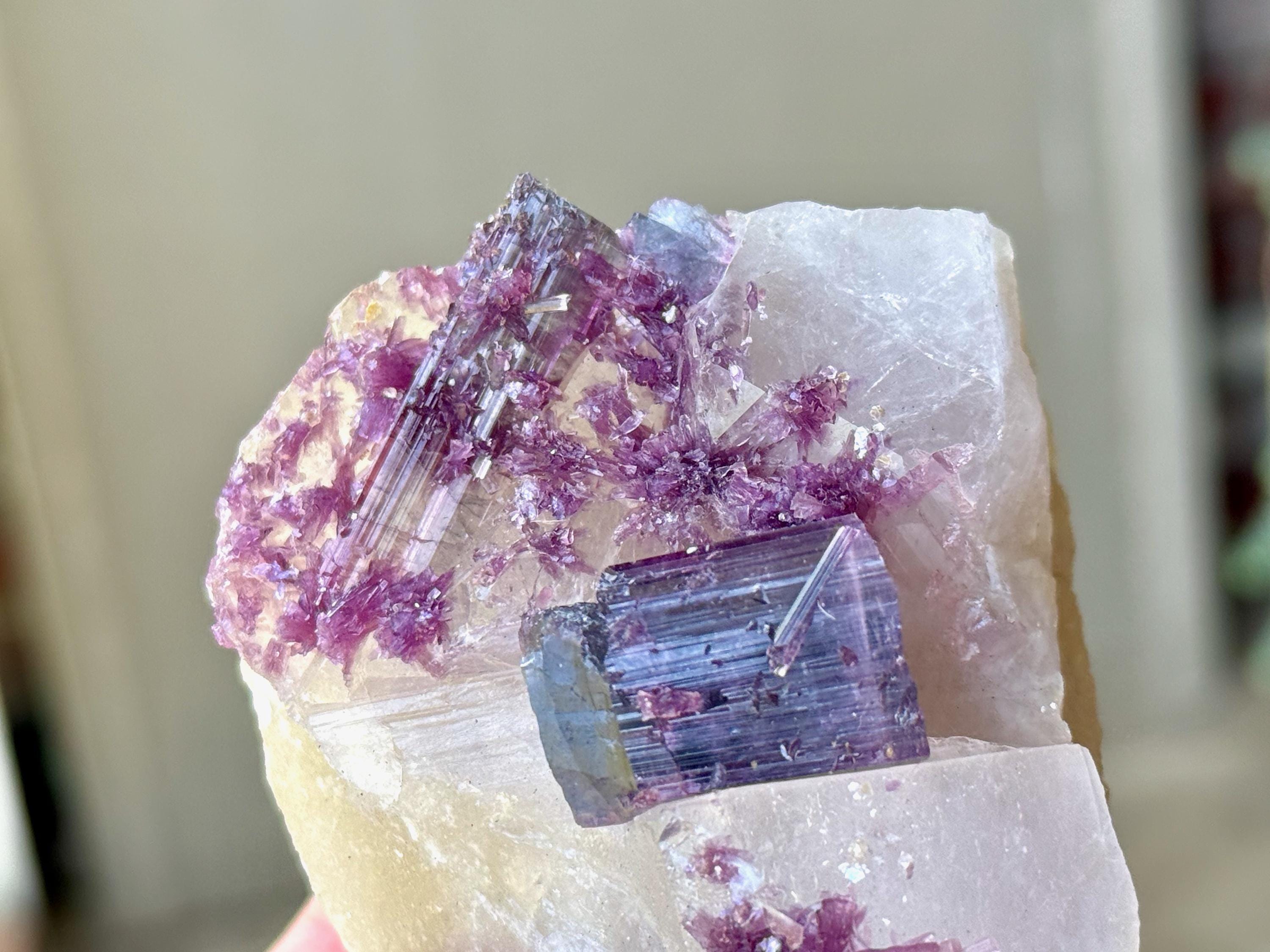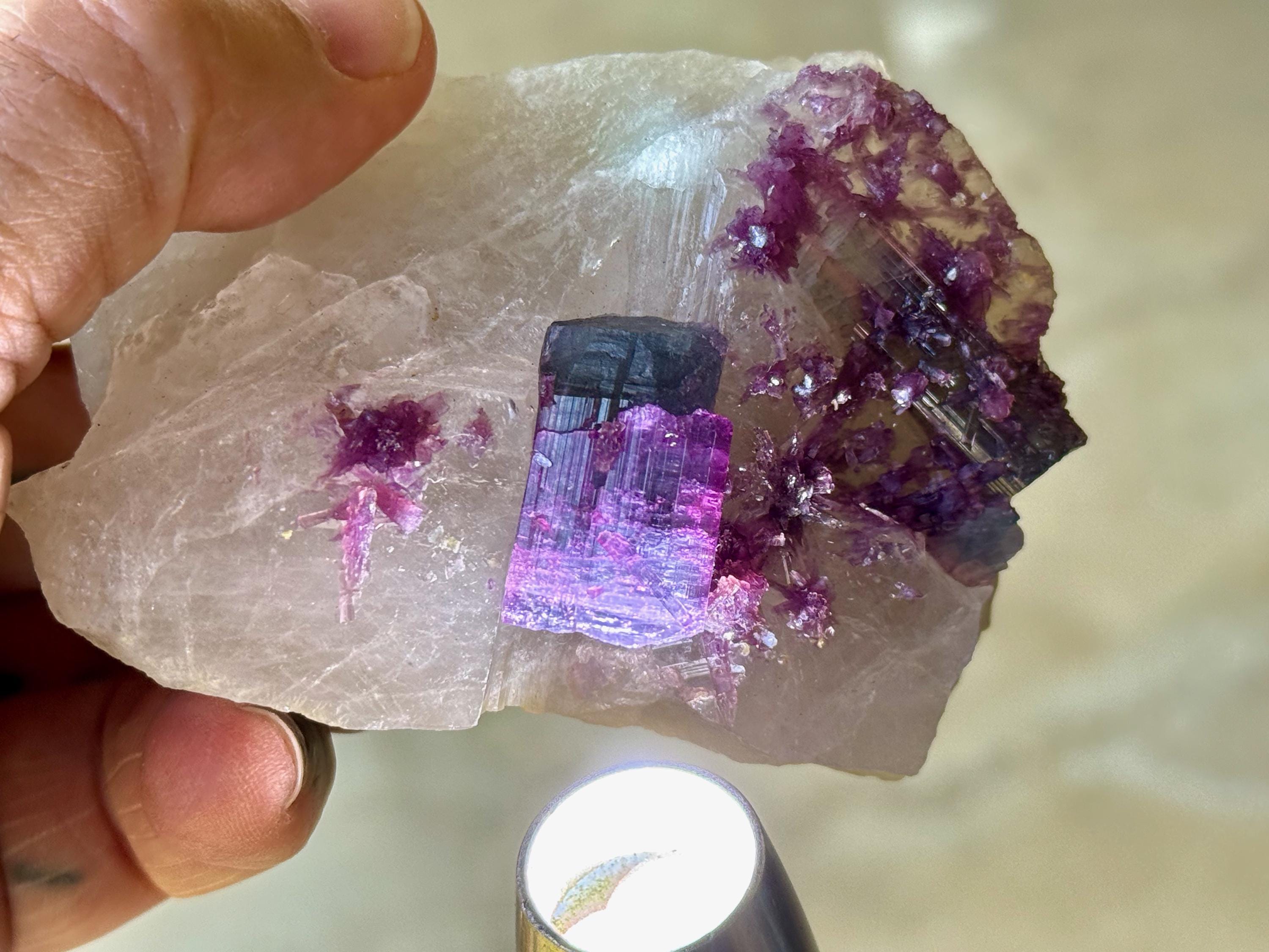Vibrant colors and marvelous luster to this Unicorn Stone Quartz crystal with the unique combination of Bicolor Blue & Purple Tourmaline, as well as Purple Lepidolite!