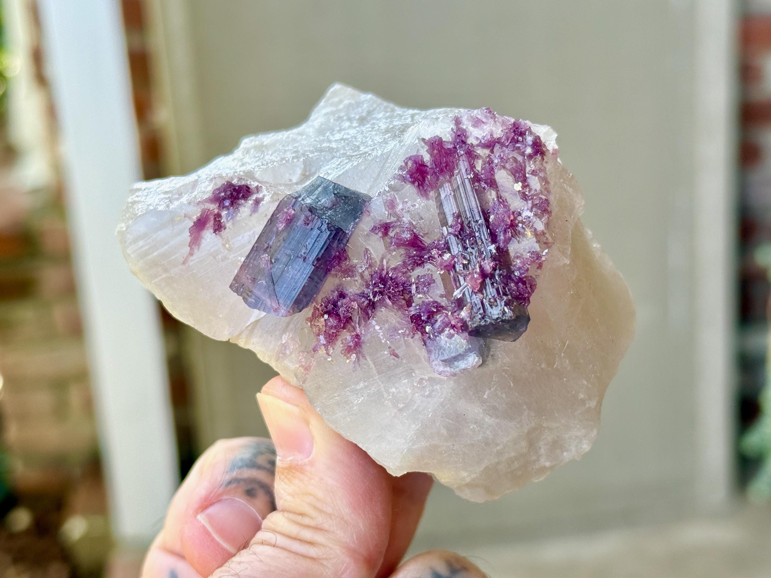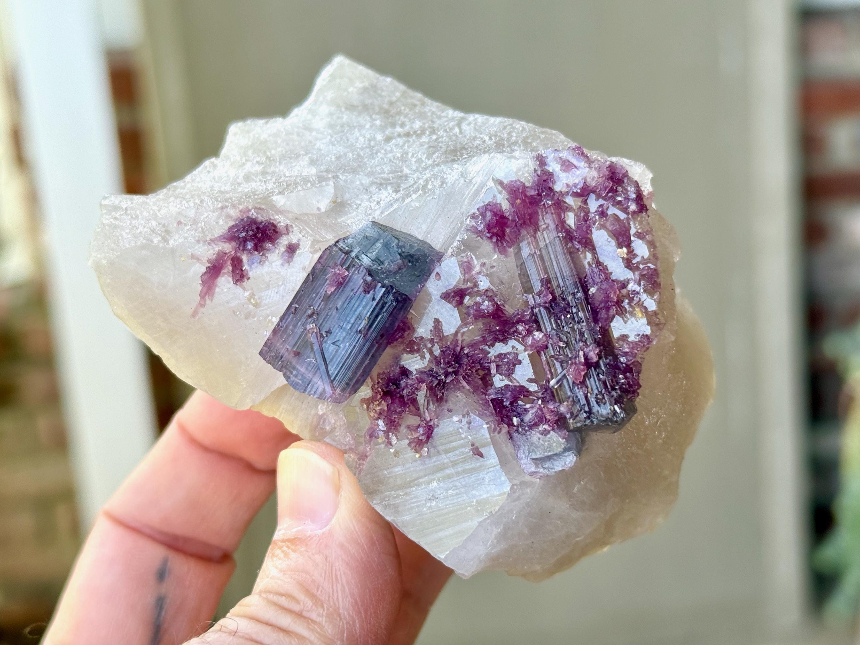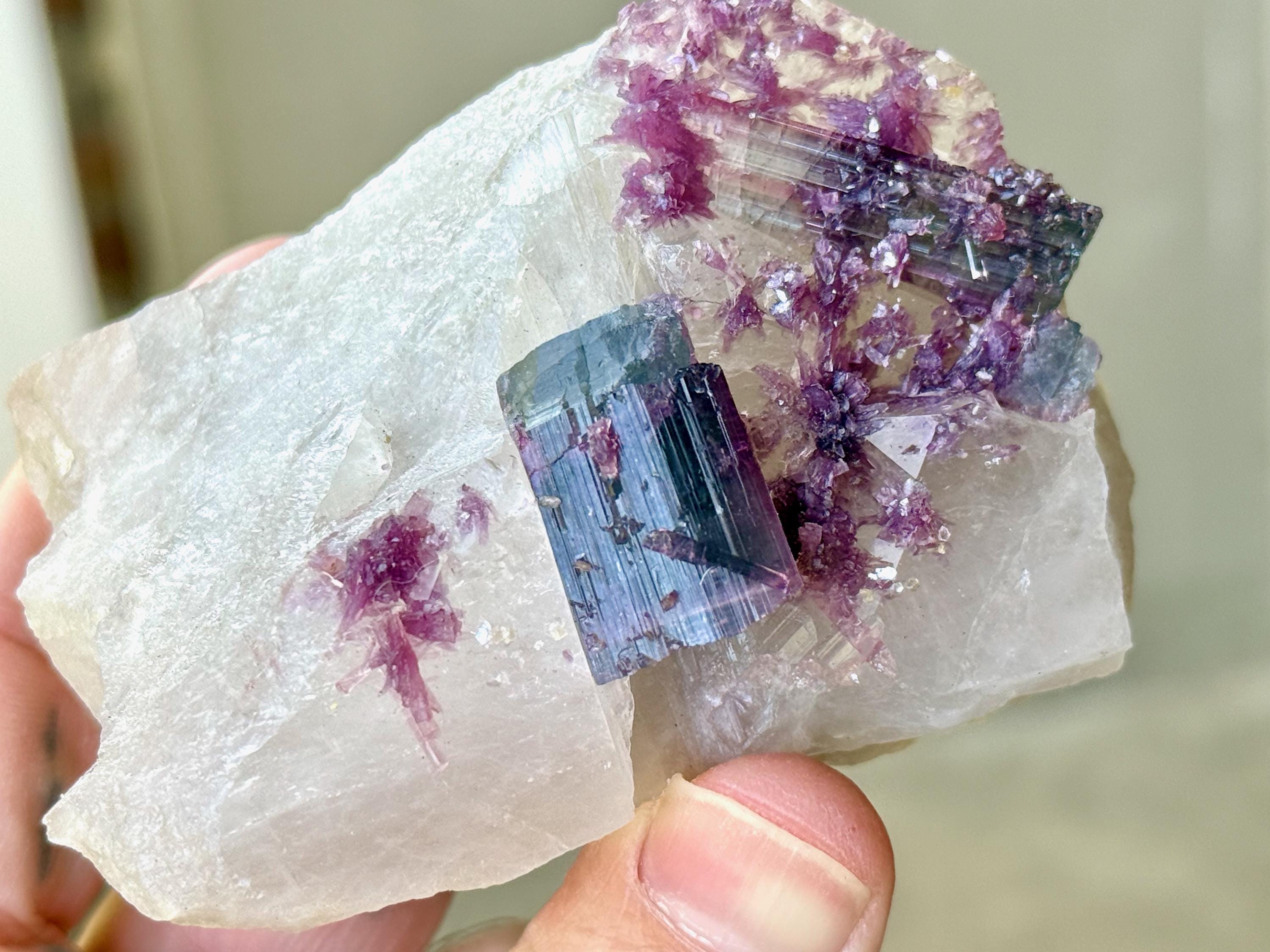 Vibrant colors and marvelous luster to this Unicorn Stone Quartz crystal with the unique combination of Bicolor Blue & Purple Tourmaline, as well as Purple Lepidolite!