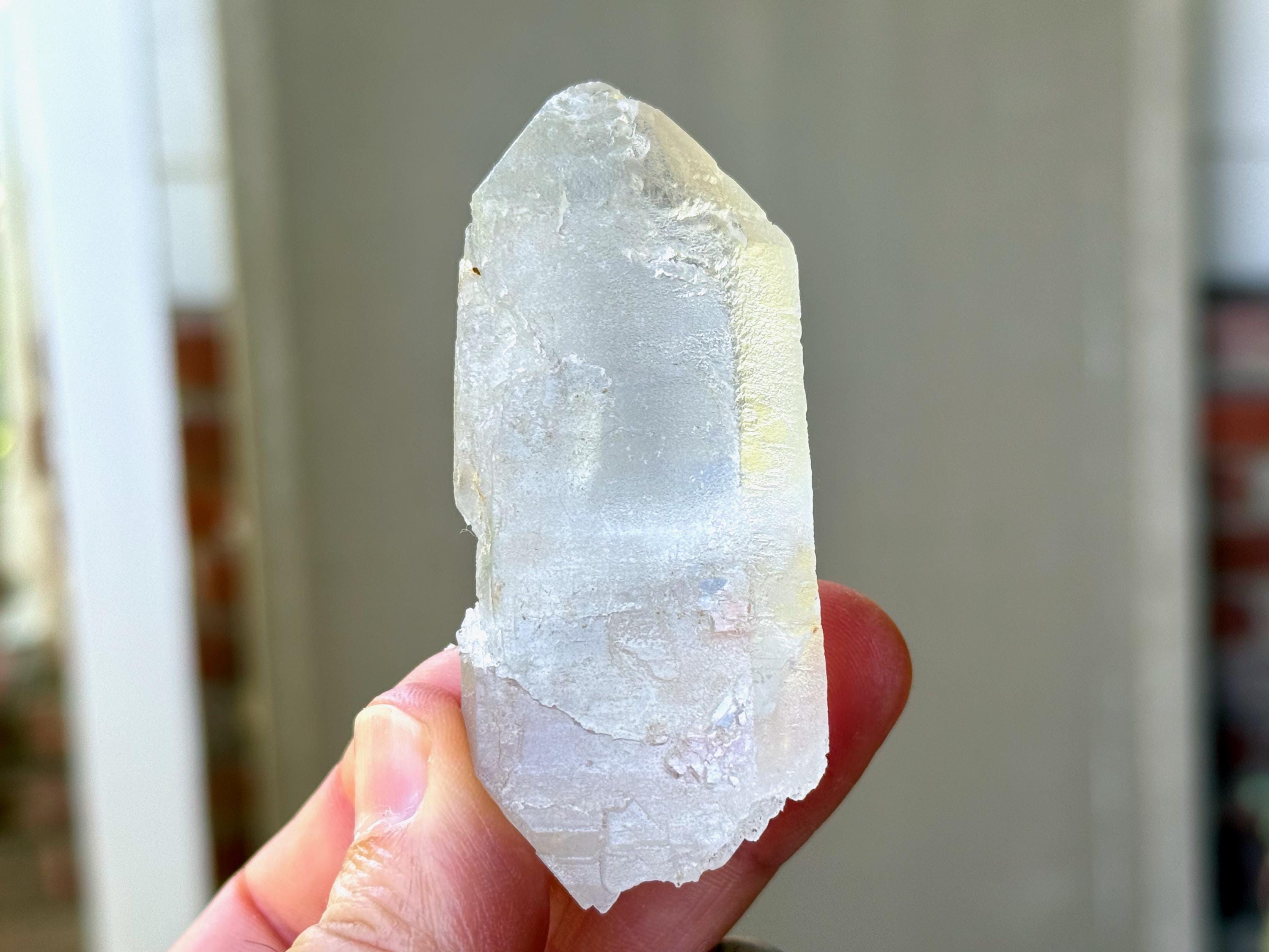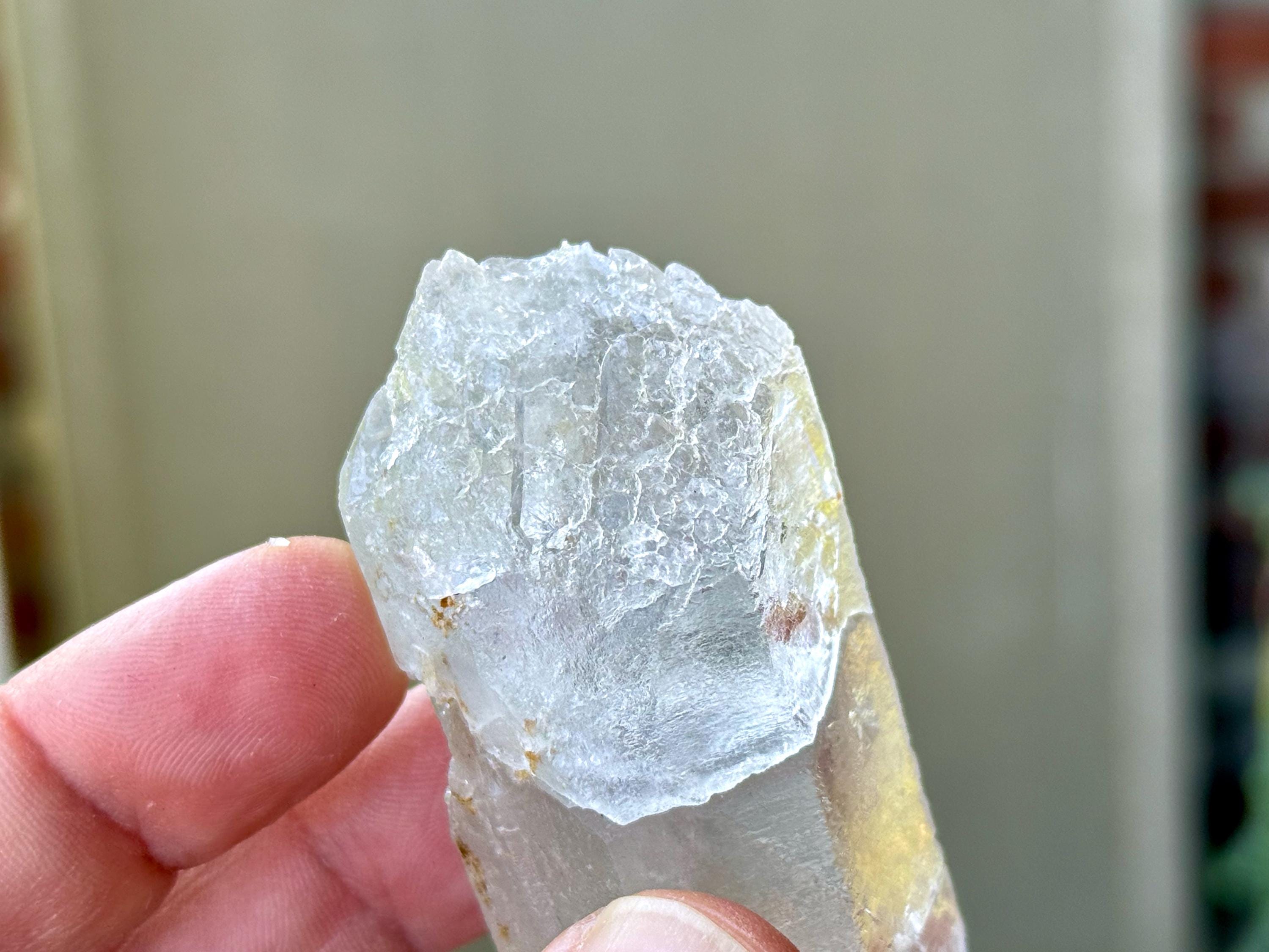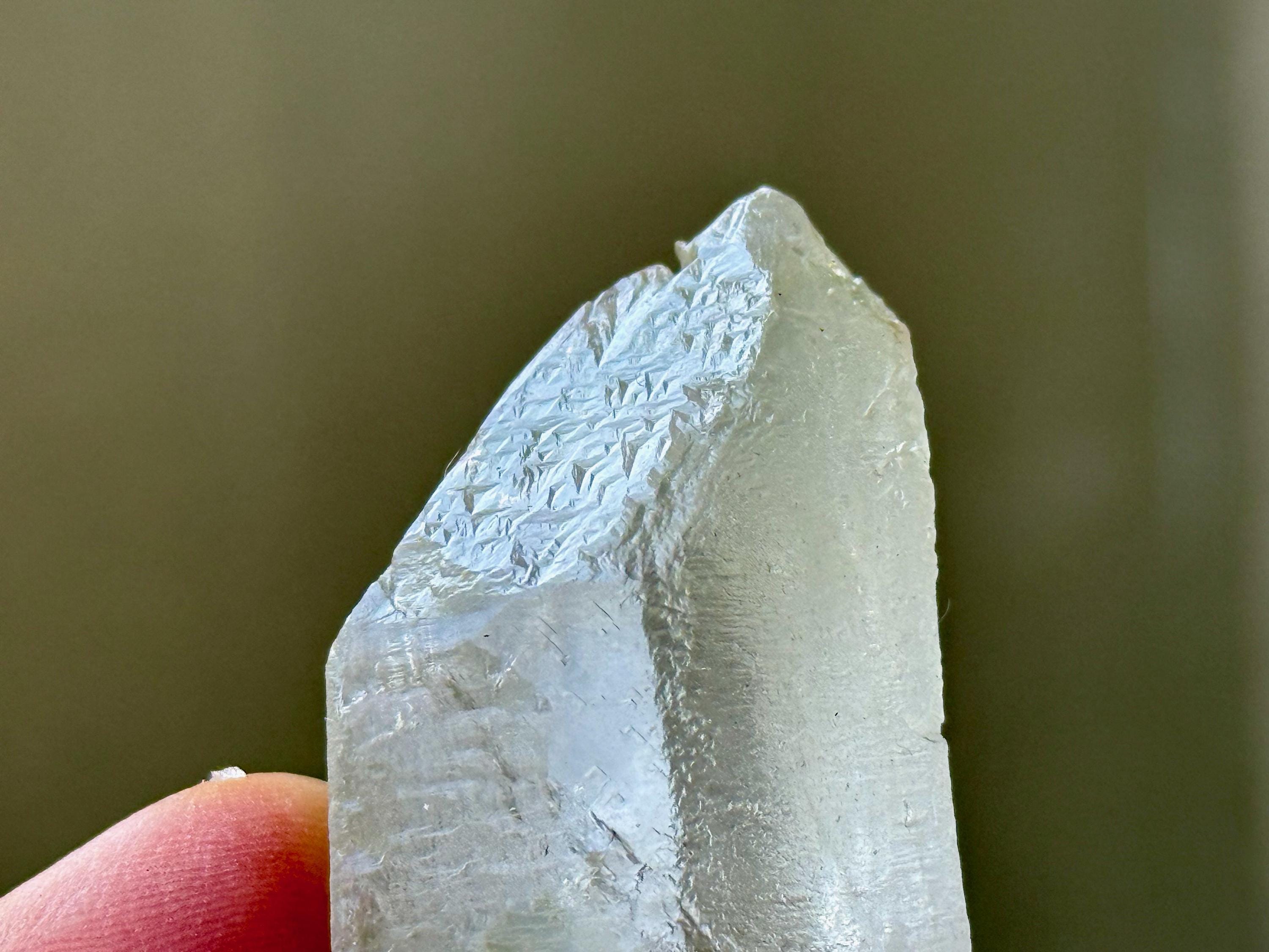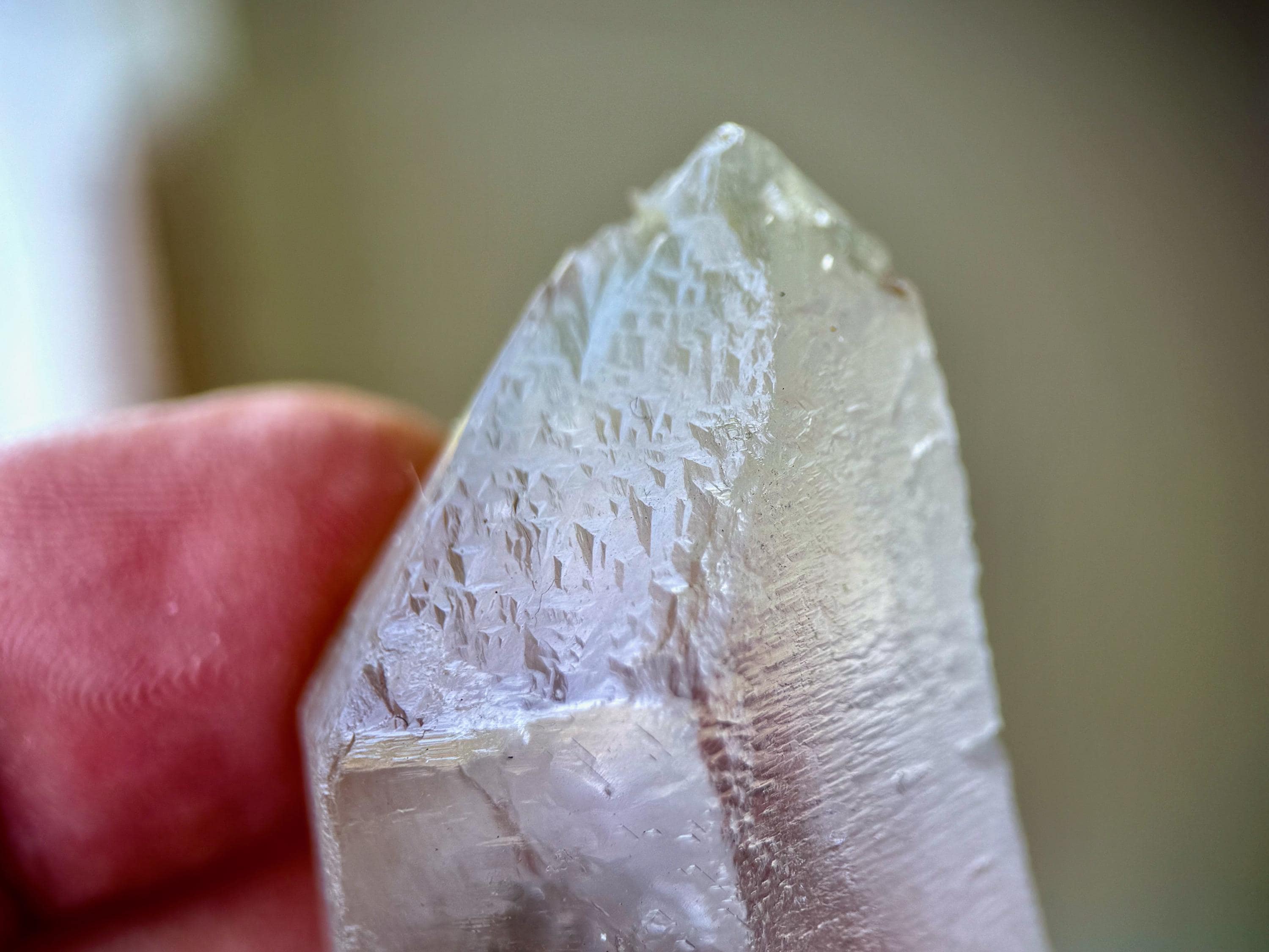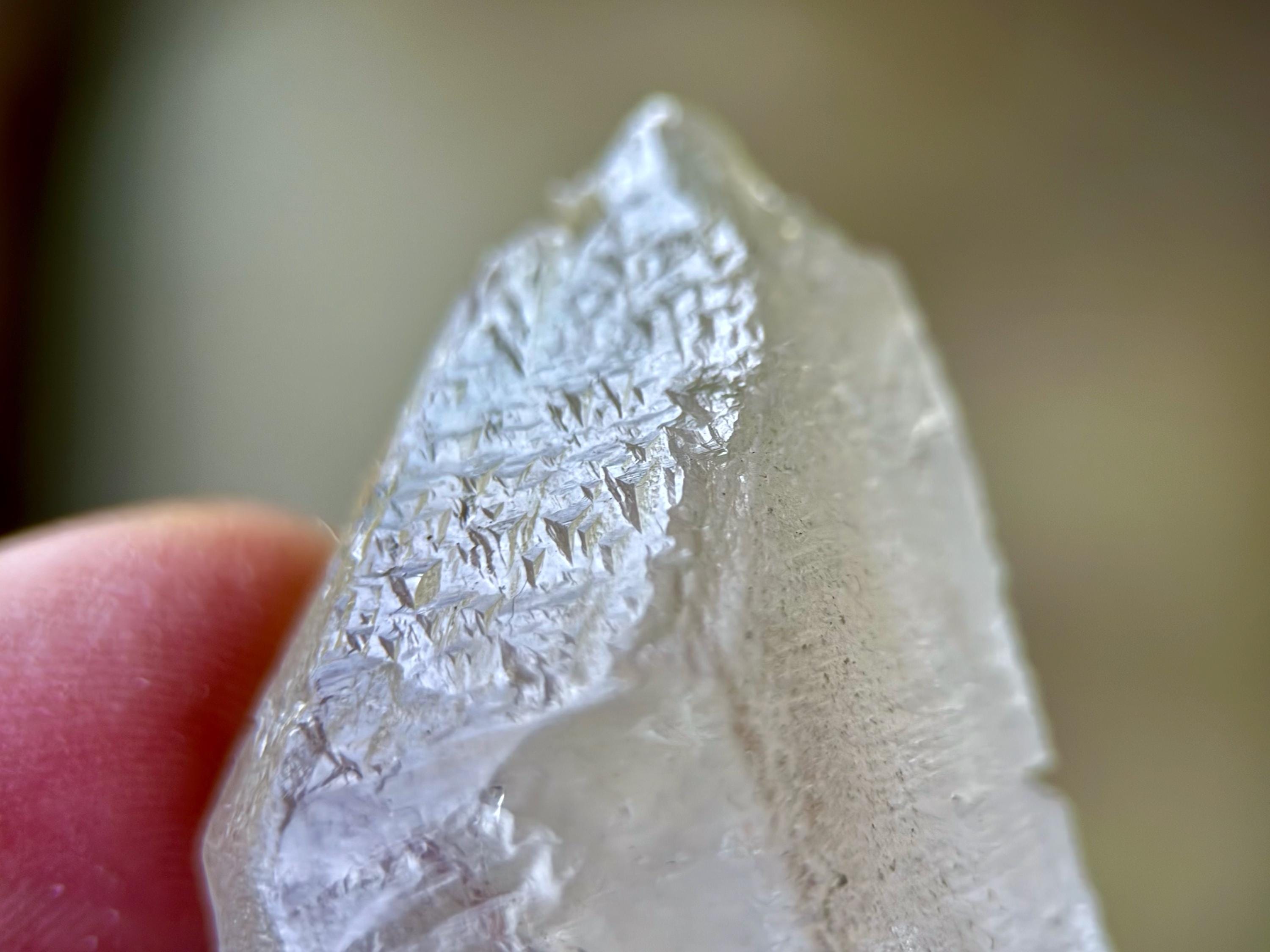 This natural Dissolution Quartz crystal features an icy, ethereal complexion and is covered on both the body and main facets with hydrothermally etched textures. At first these impressions simply look like the typical pitted markings we tend to see on most Dissolution Quartz. However, when we zoom in a little with a magnifying glass we see that many of these are trigons!
