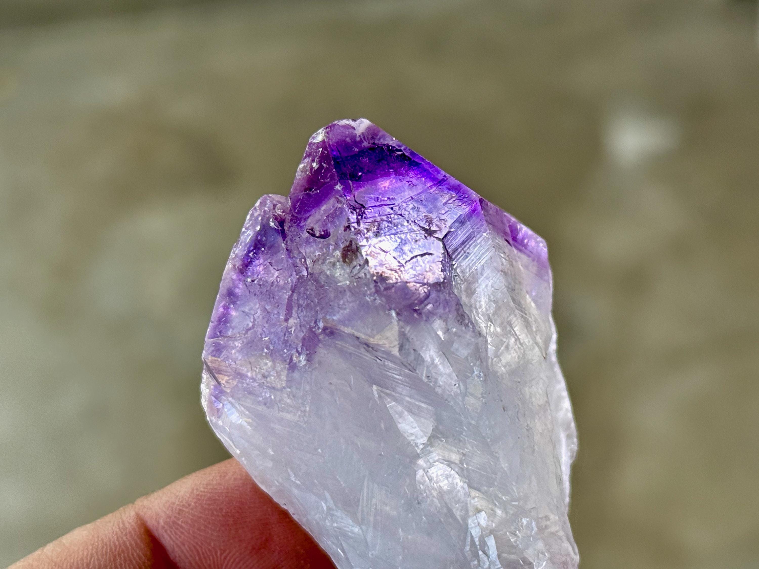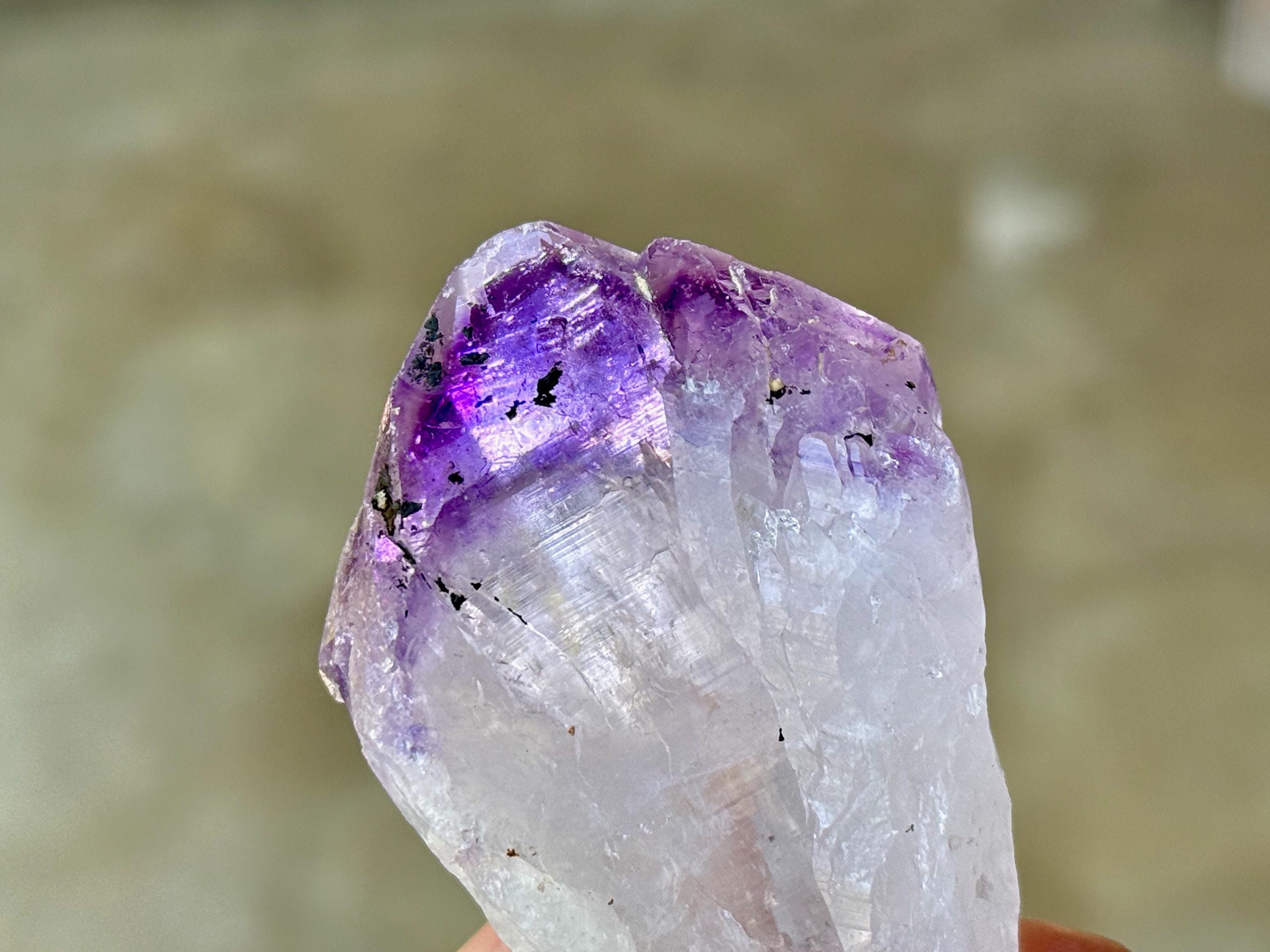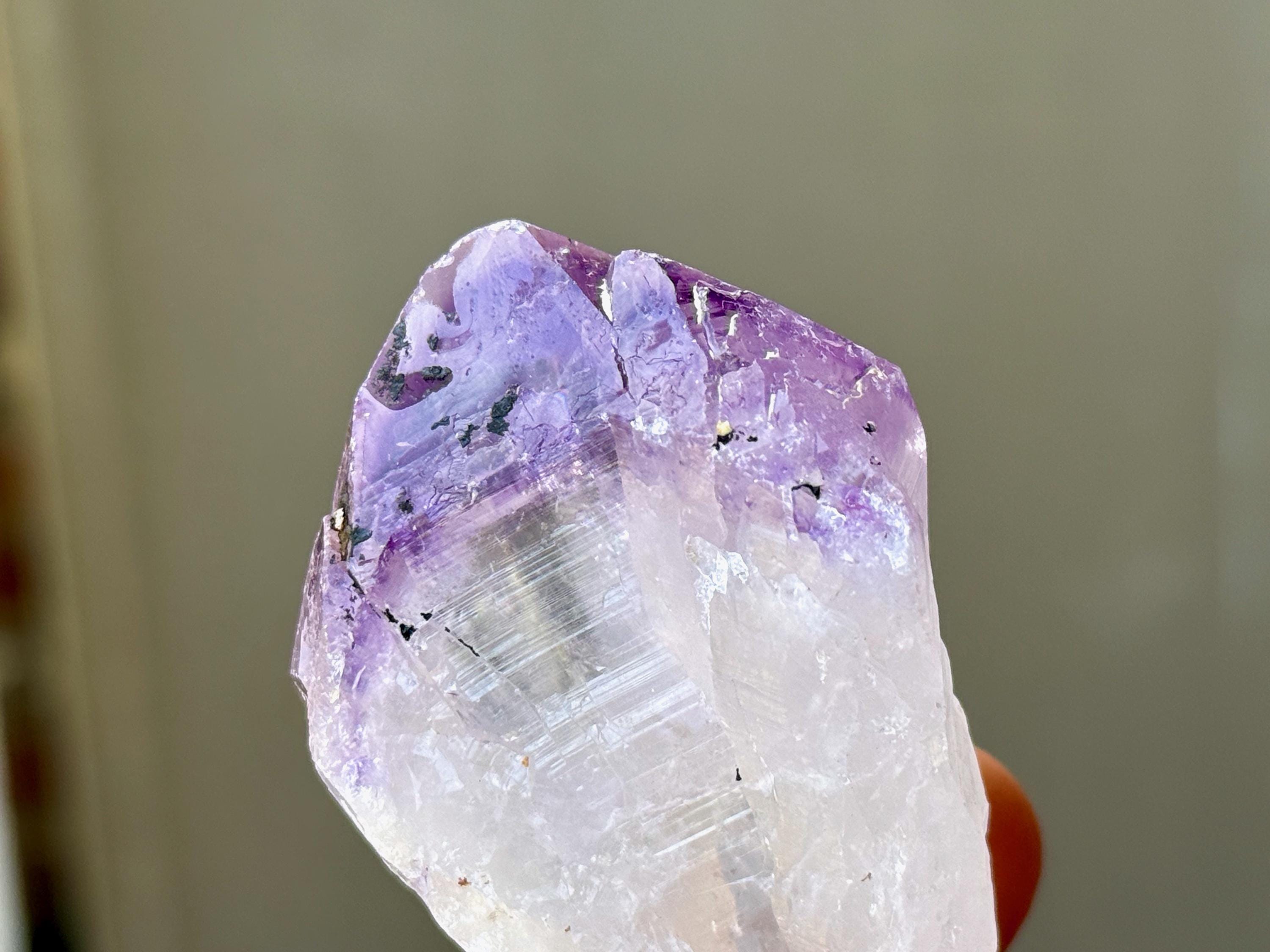 Tremendous luster and vibrant purple color to this exquisite Root Amethyst crystal. This crystal features an elongated "root" formation at the base with natural contact imprints and textures, and a very vivid purple main facet area. The contrast between the whitish-clear root and top is marvelous.