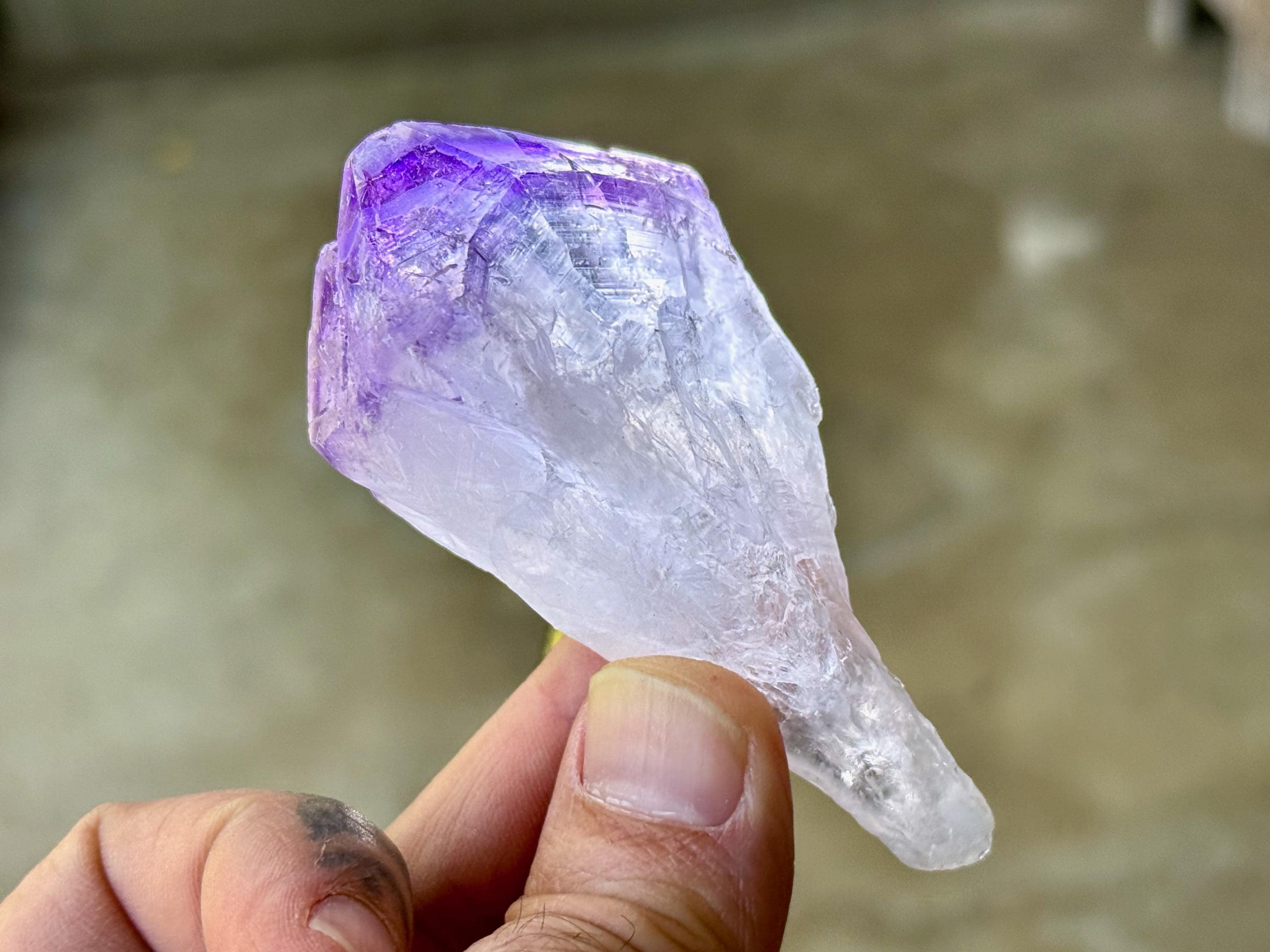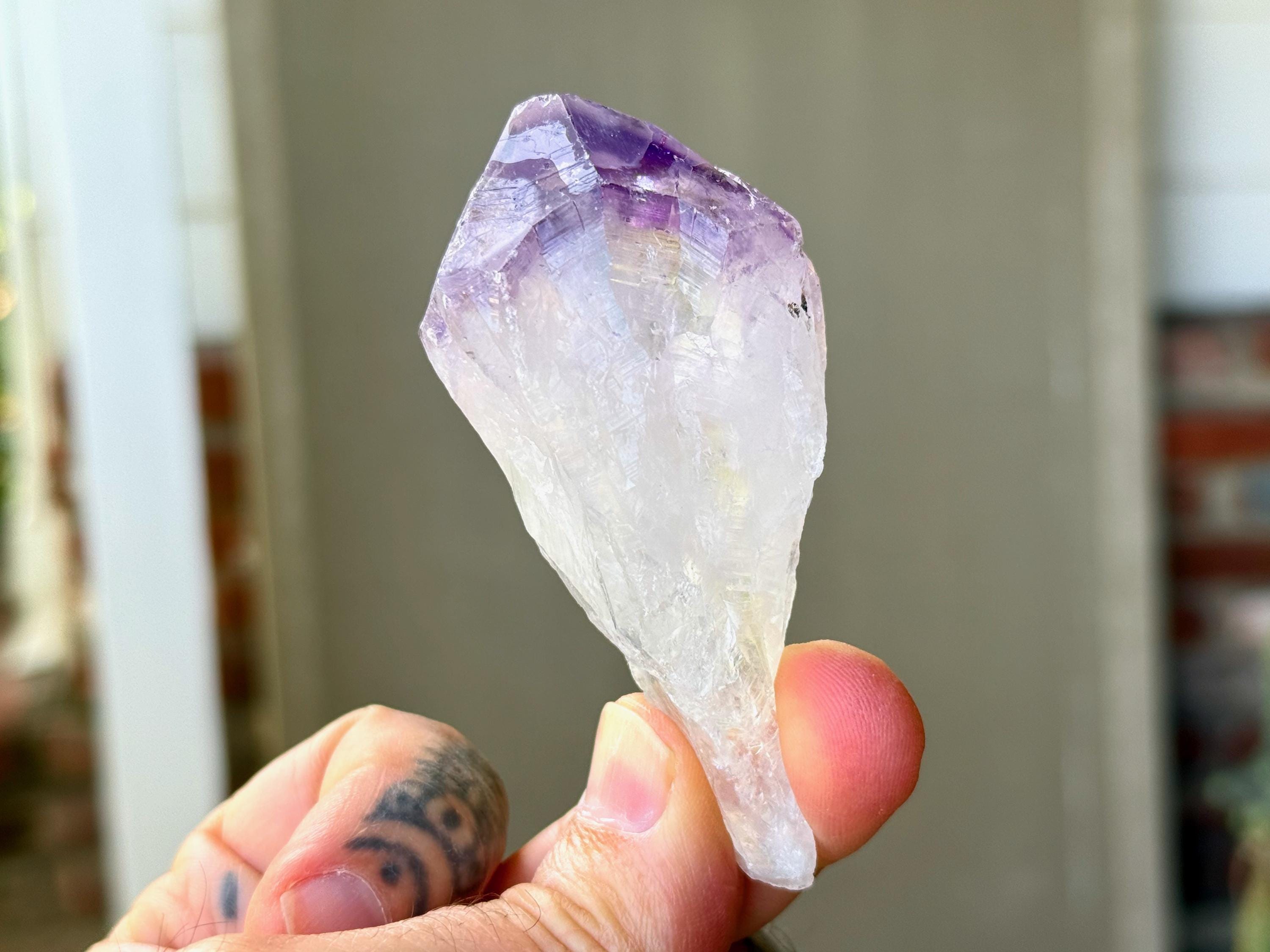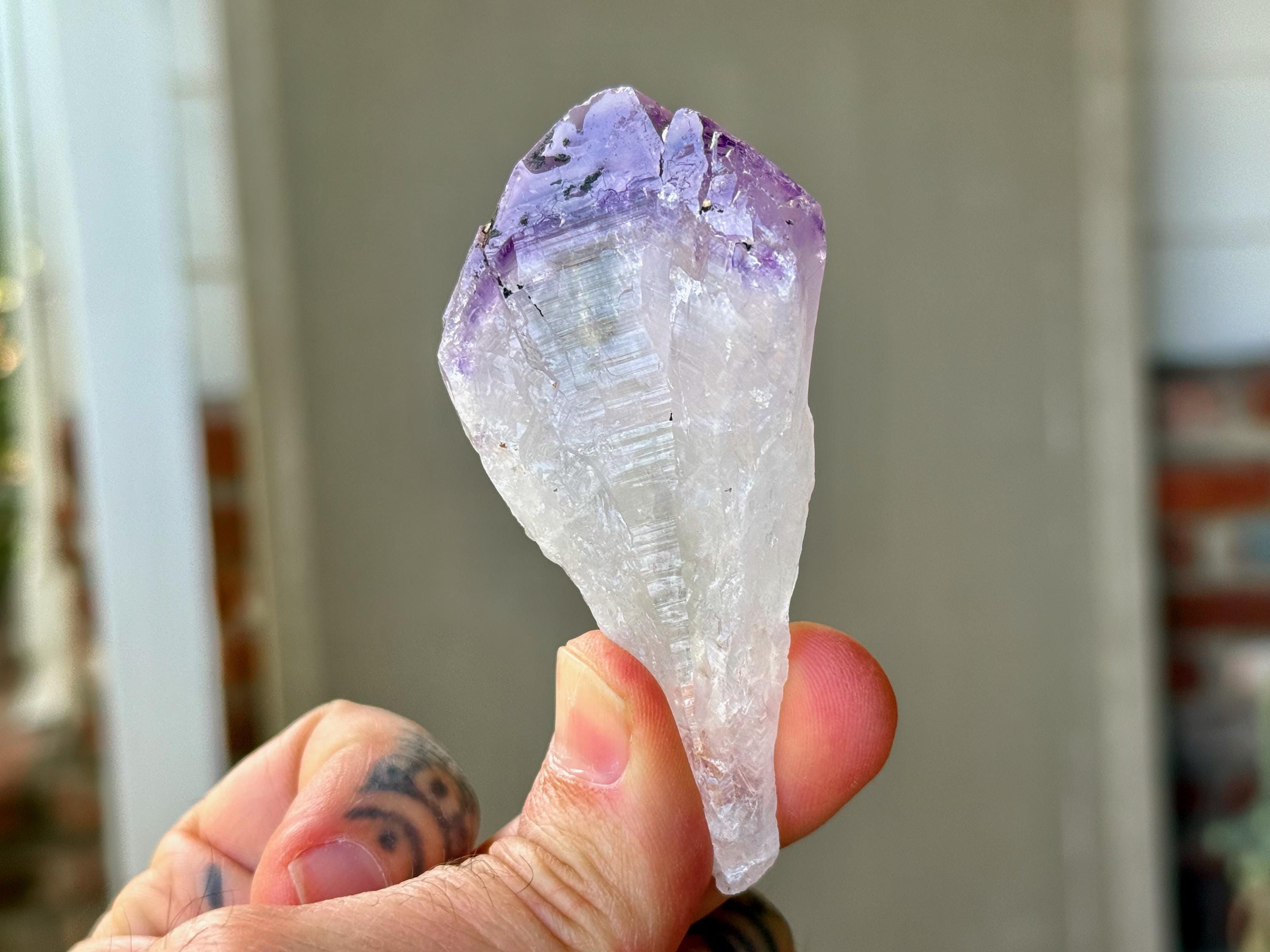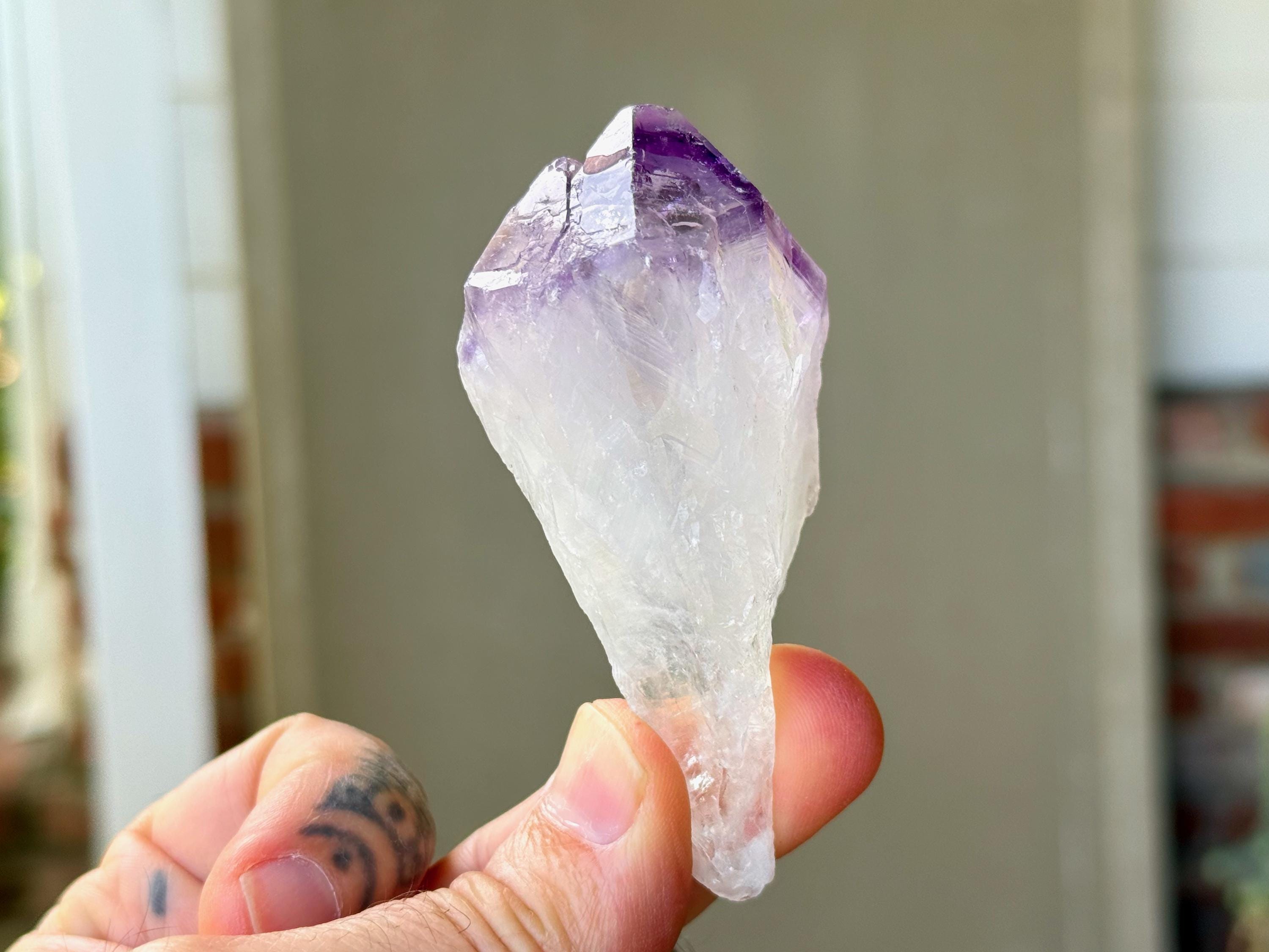 Tremendous luster and vibrant purple color to this exquisite Root Amethyst crystal. This crystal features an elongated "root" formation at the base with natural contact imprints and textures, and a very vivid purple main facet area. The contrast between the whitish-clear root and top is marvelous.