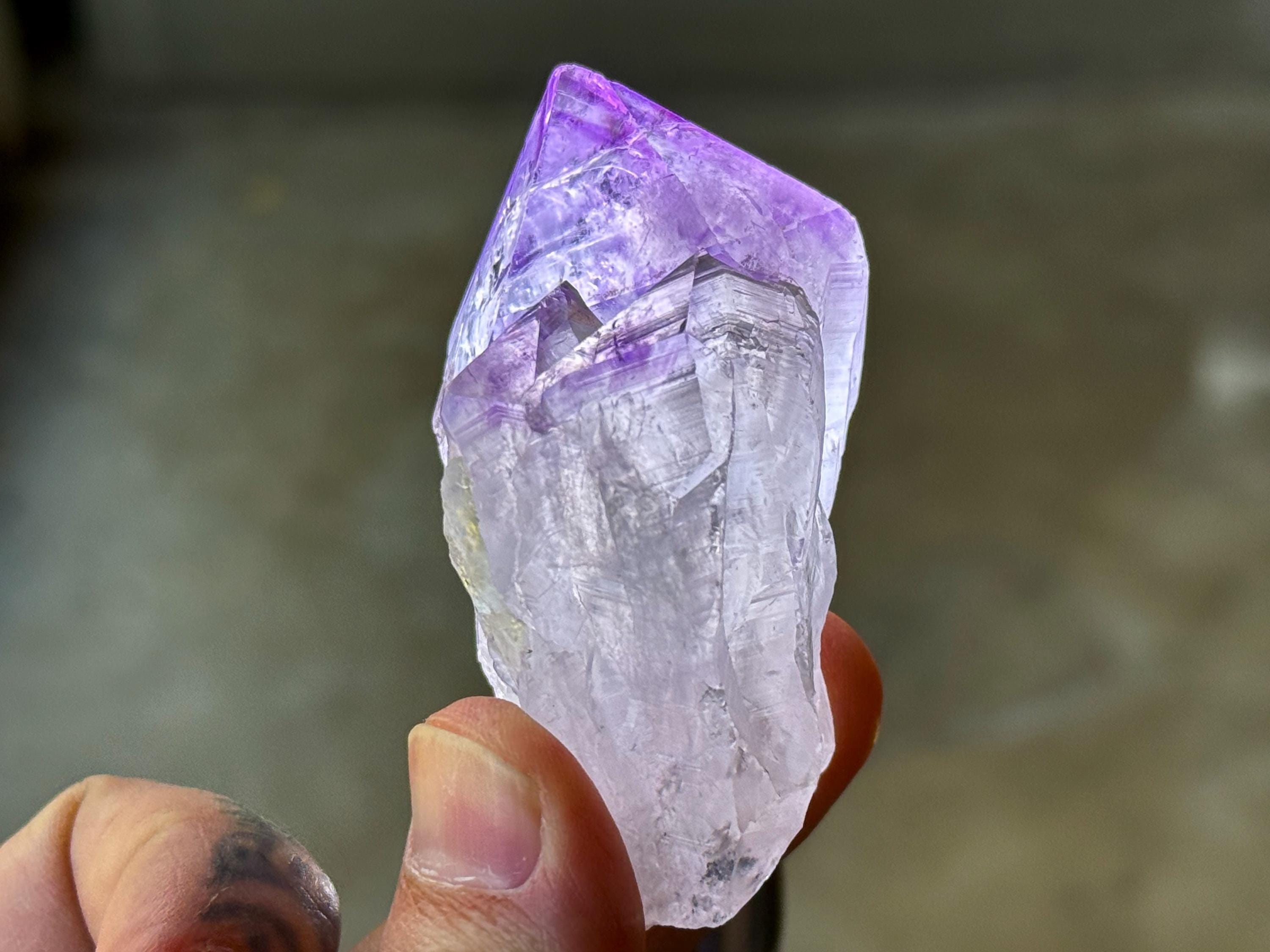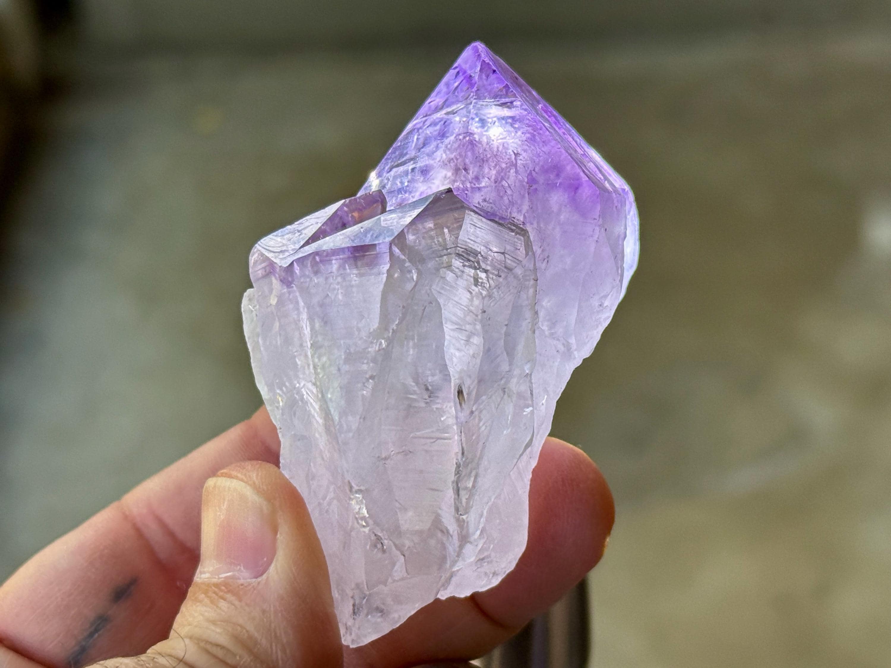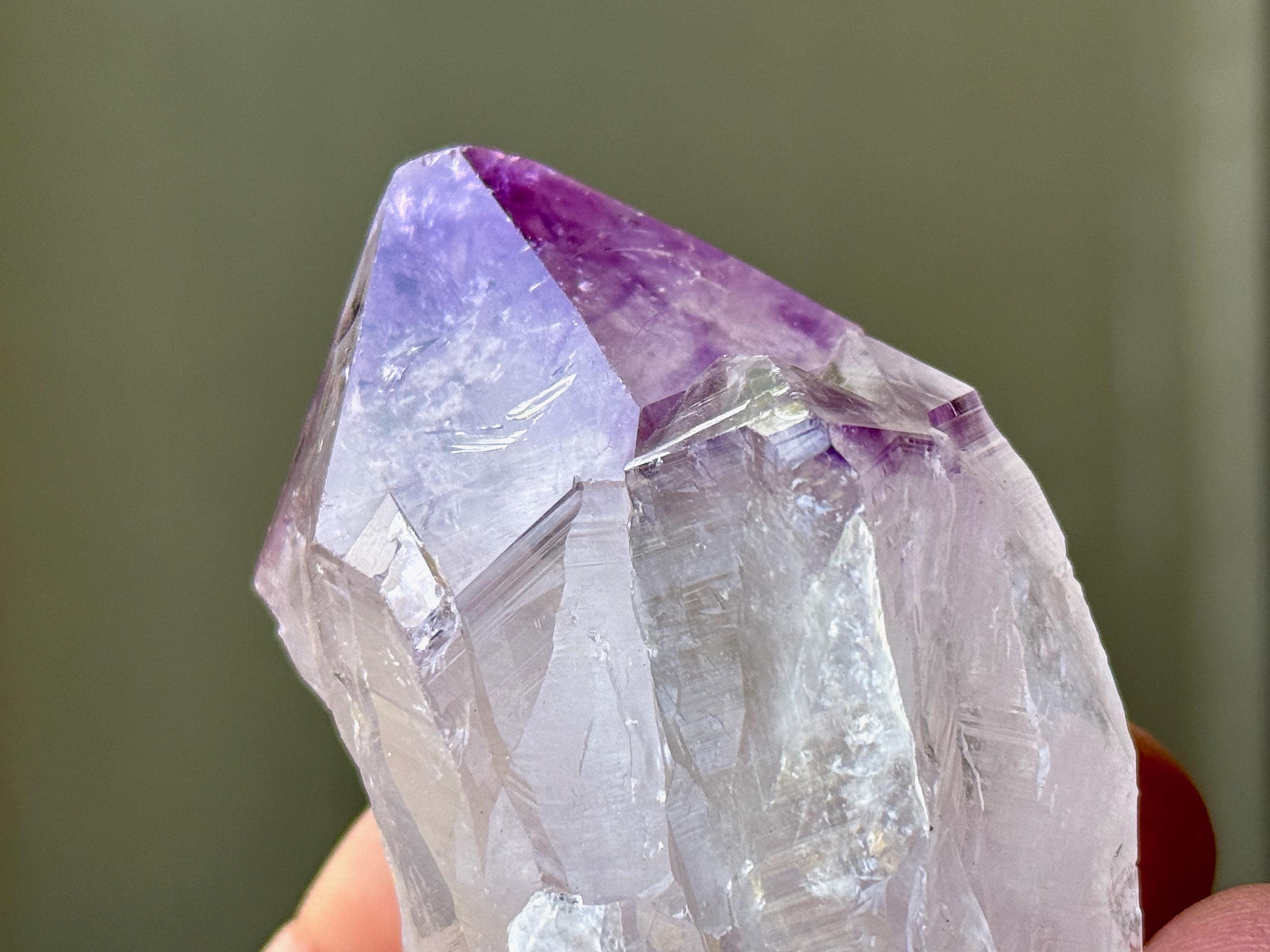 Exquisite luster and lovely lilac purple color to this exceptional Root Amethyst crystal. This crystal features an elongated "root" formation at the base with natural contact imprints and textures, and beautiful color at the top. The contrast between the whitish-clear root and top is marvelous.