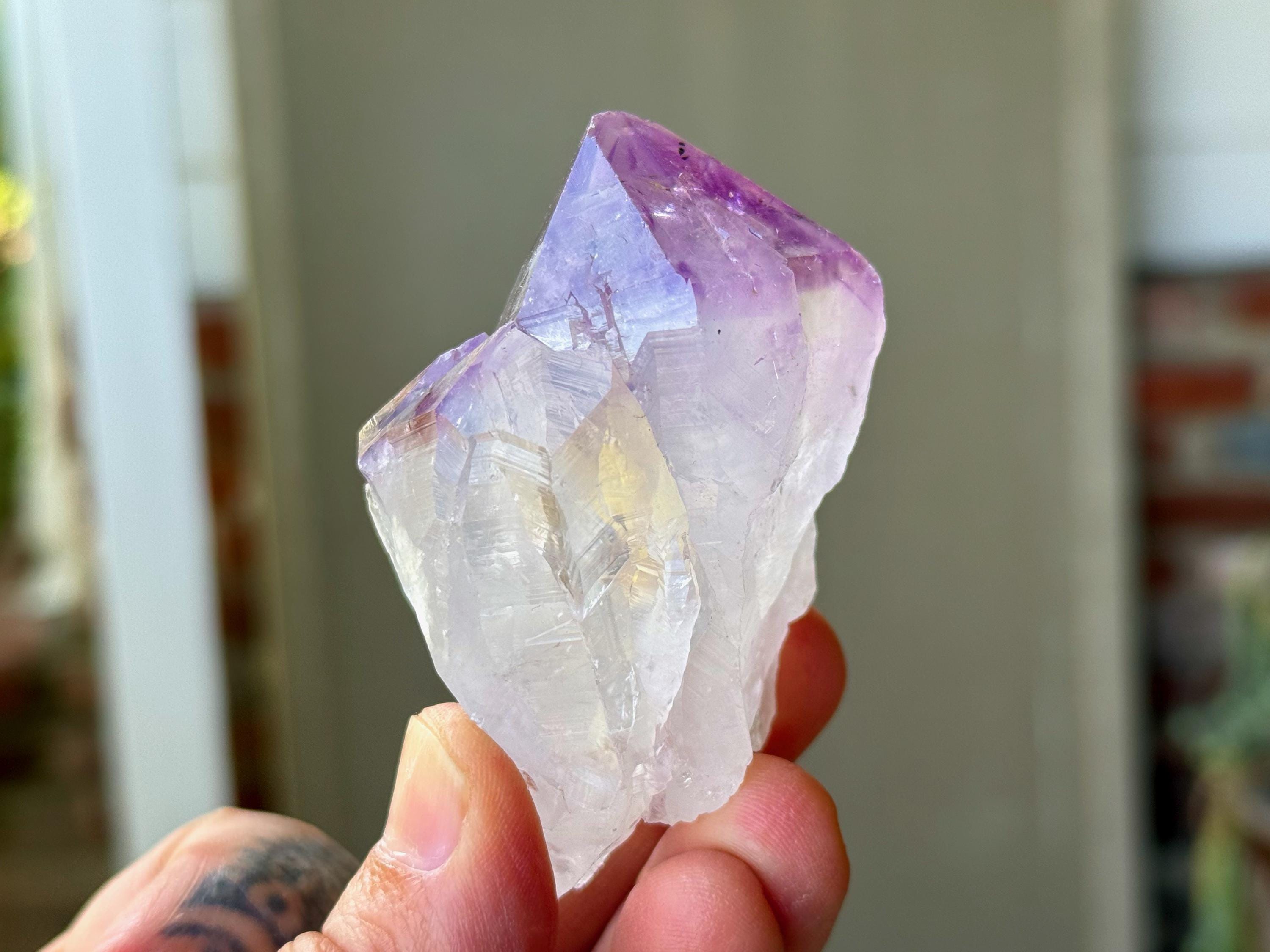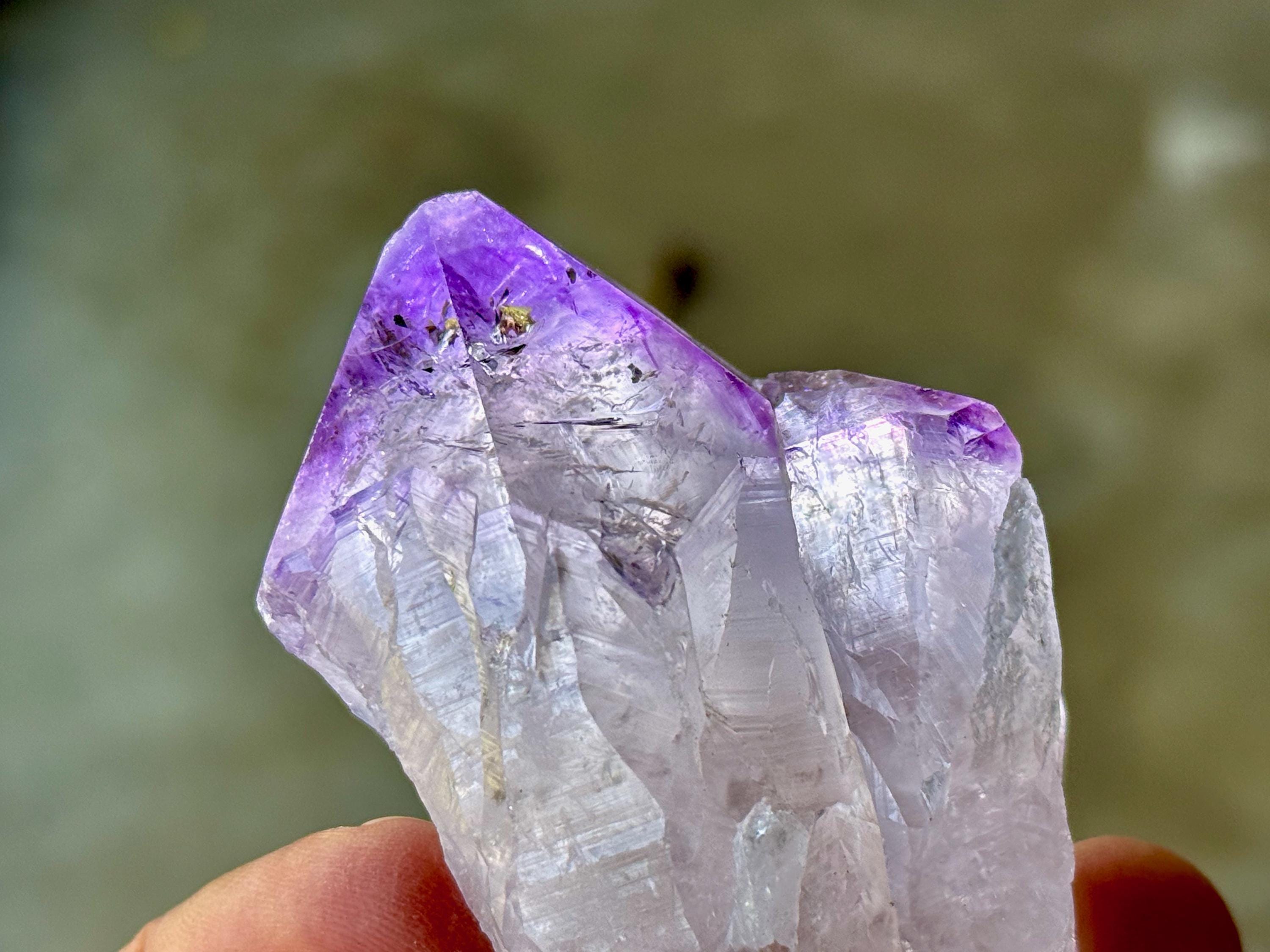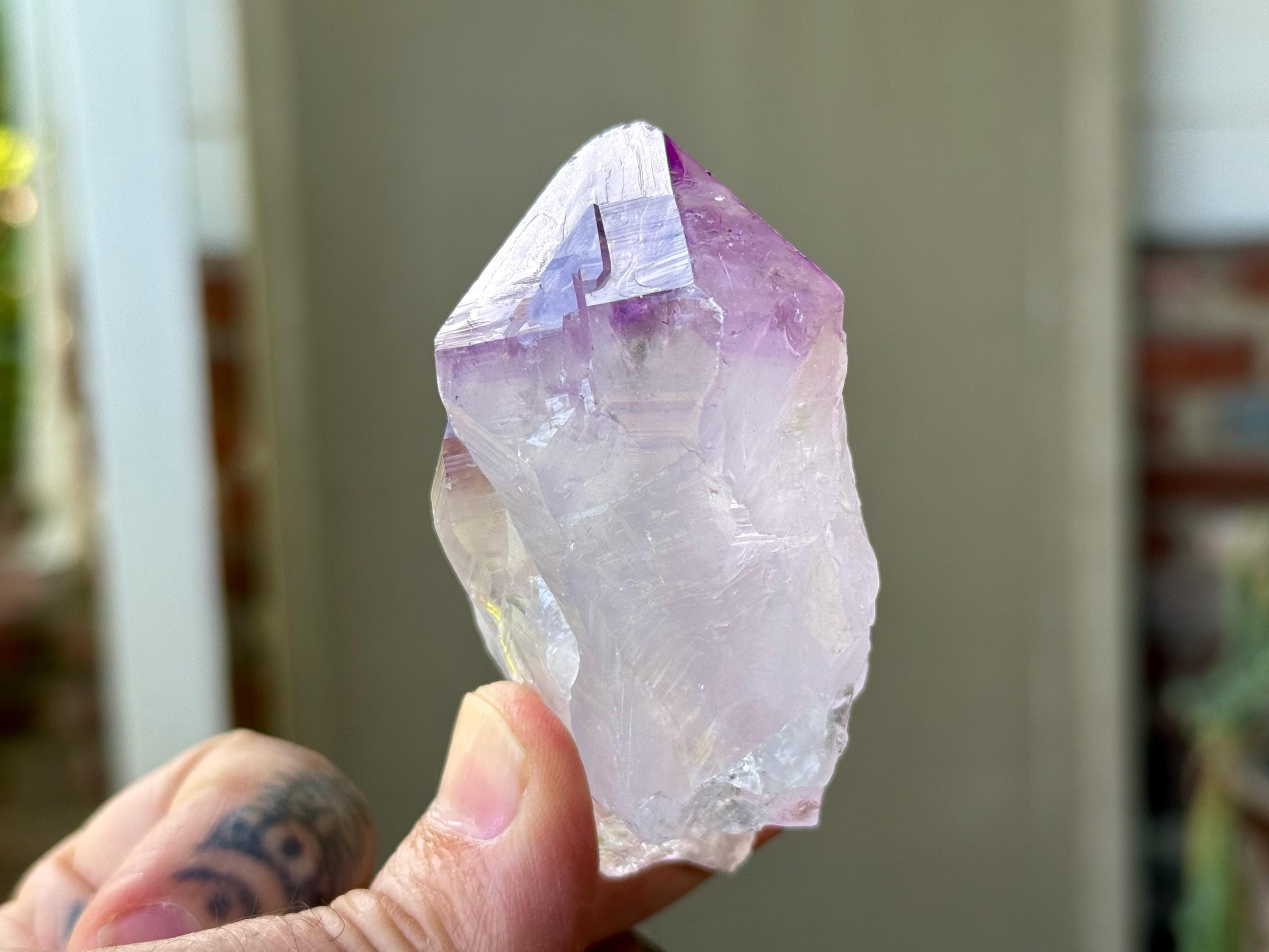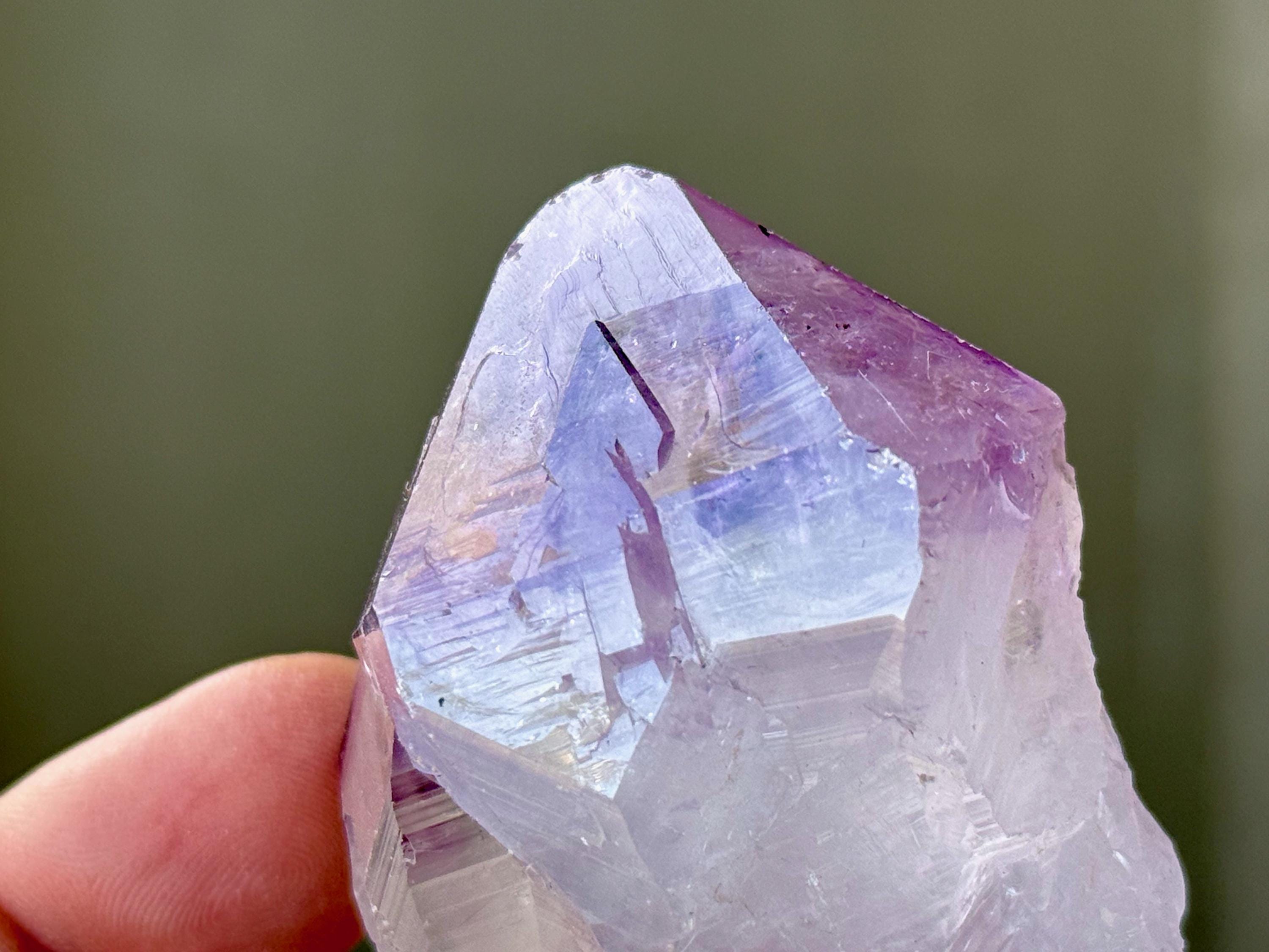 Exquisite luster and lovely lilac purple color to this exceptional Root Amethyst crystal. This crystal features an elongated "root" formation at the base with natural contact imprints and textures, and beautiful color at the top. The contrast between the whitish-clear root and top is marvelous.