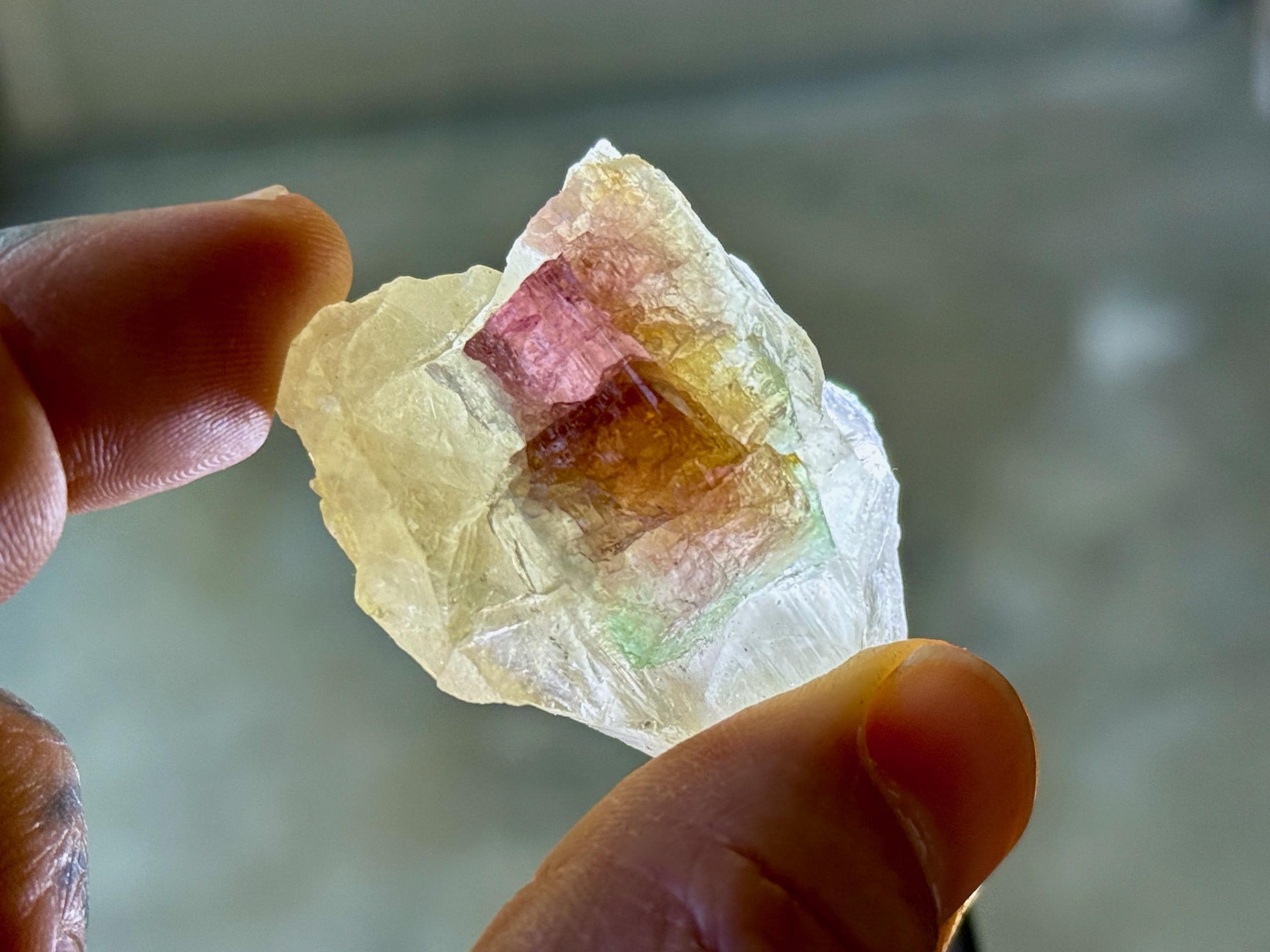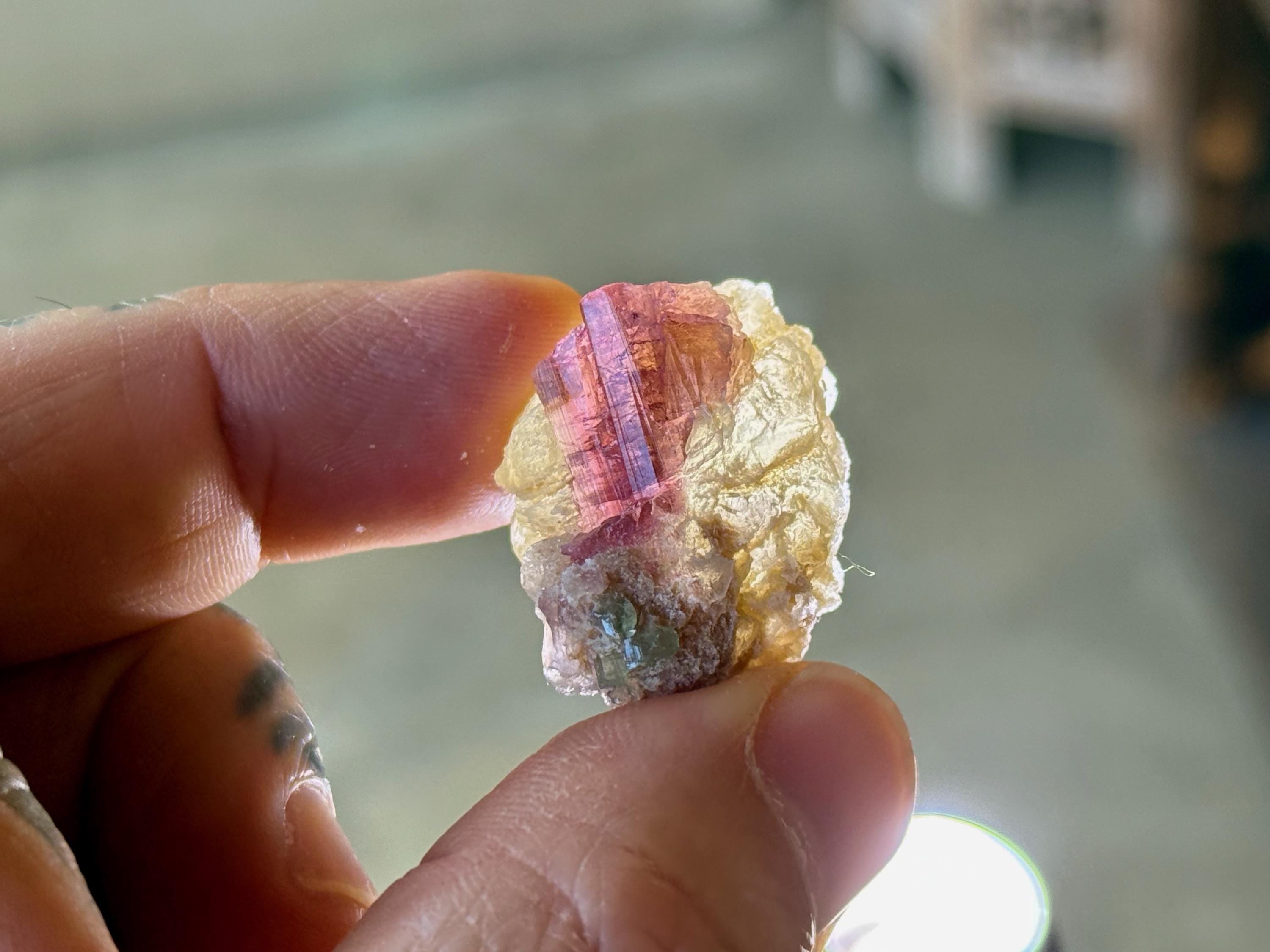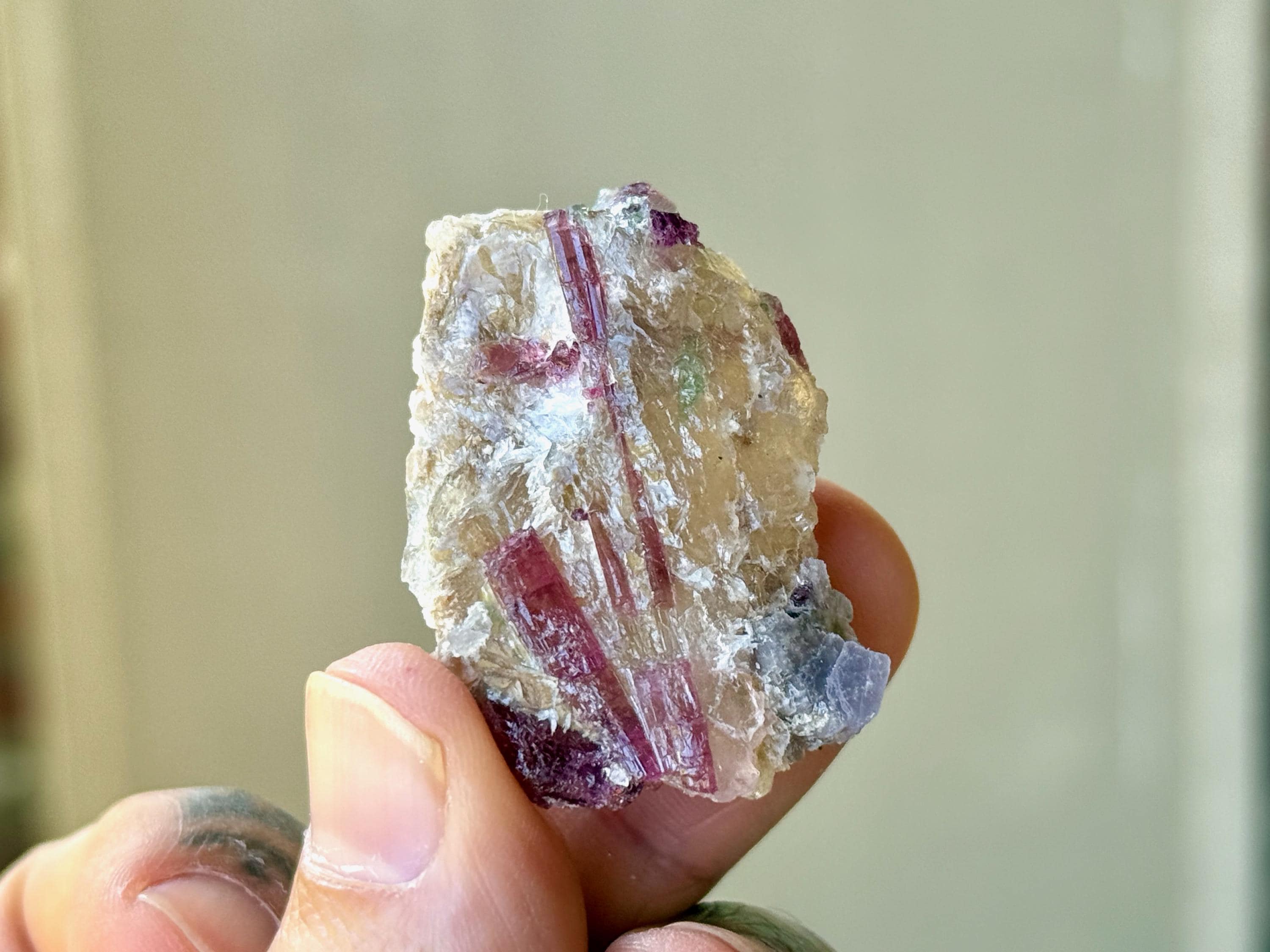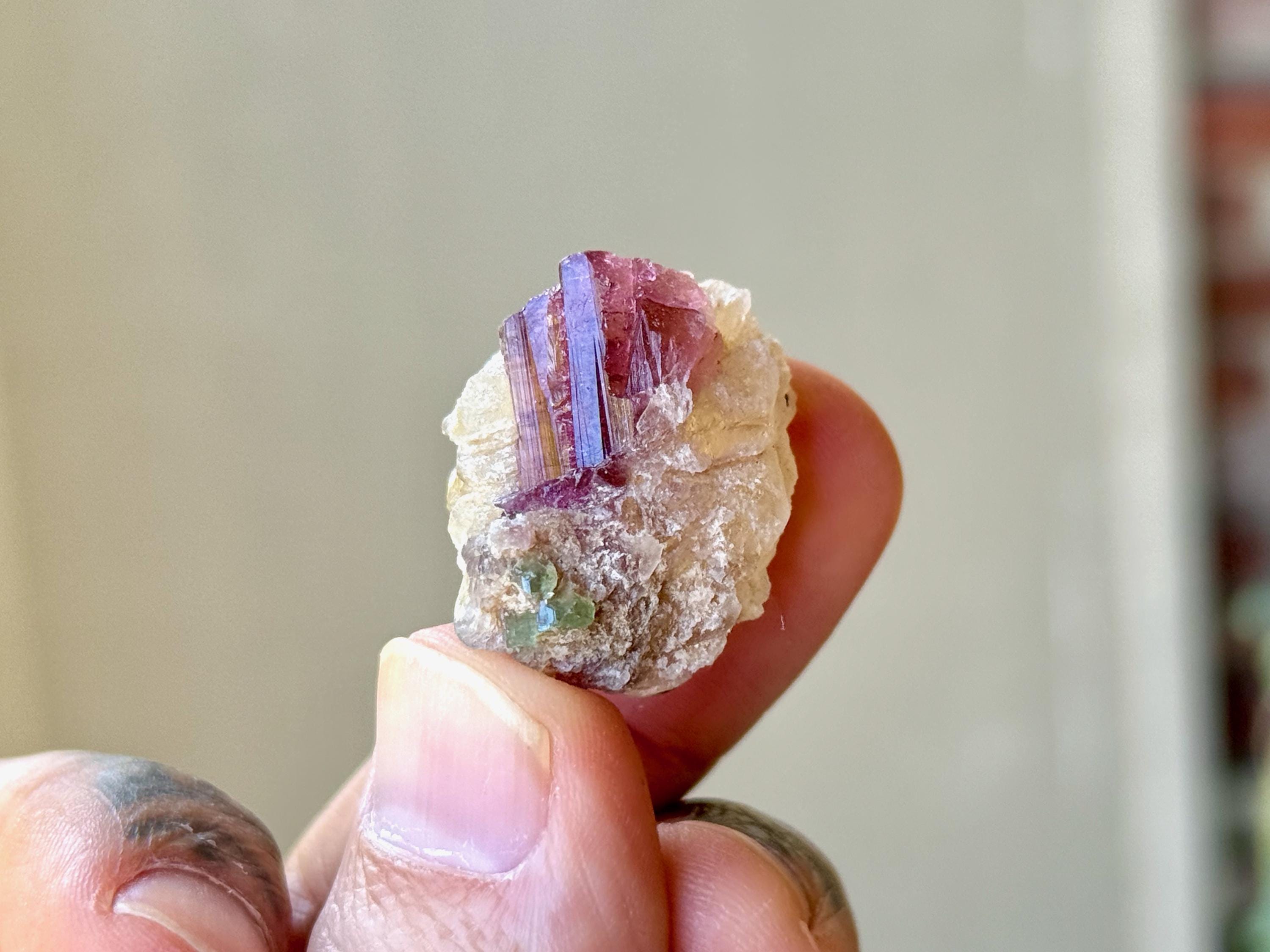 The crystals from this find include unique combinations of Quartz, Lepidolite, Citrine, Cleavelandite, Albite and Feldspar, with vividly colored Tourmalines in lovely hues of green, pink, purple and blue. Crystals with combinations of these minerals are sometimes referred to as "Unicorn Stones."