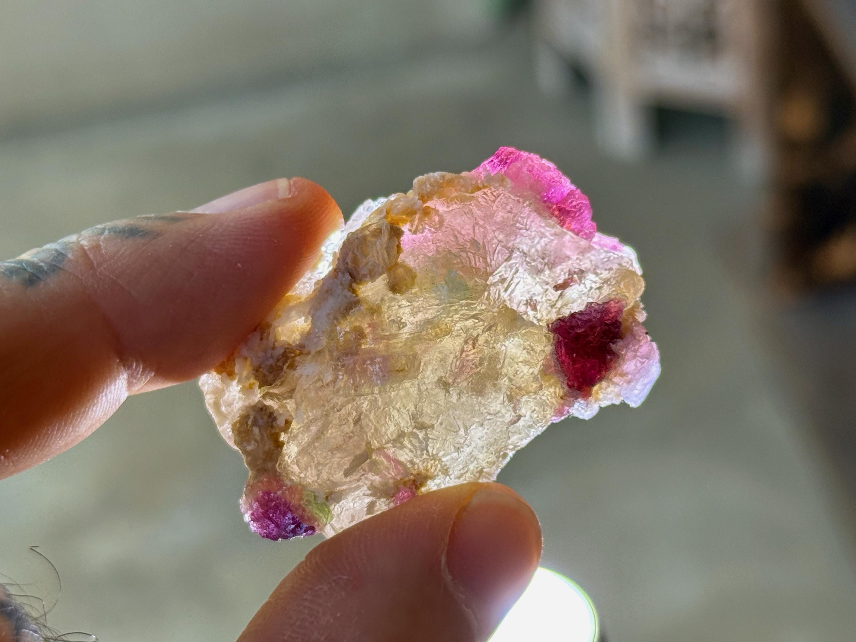 This is a vibrant lot of Unicorn Stone Quartz crystals that feature Pink Tourmaline as the primary inclusion. The color on these is super vibrant and when backlit, we can see just how gemmy and translucent these tourmaline inclusions are. A few of these have a mild golden tinge, indicating Citrine inclusion, and we can see hints of Green Tourmaline, Lepidolite and Golden Mica on a few as well.