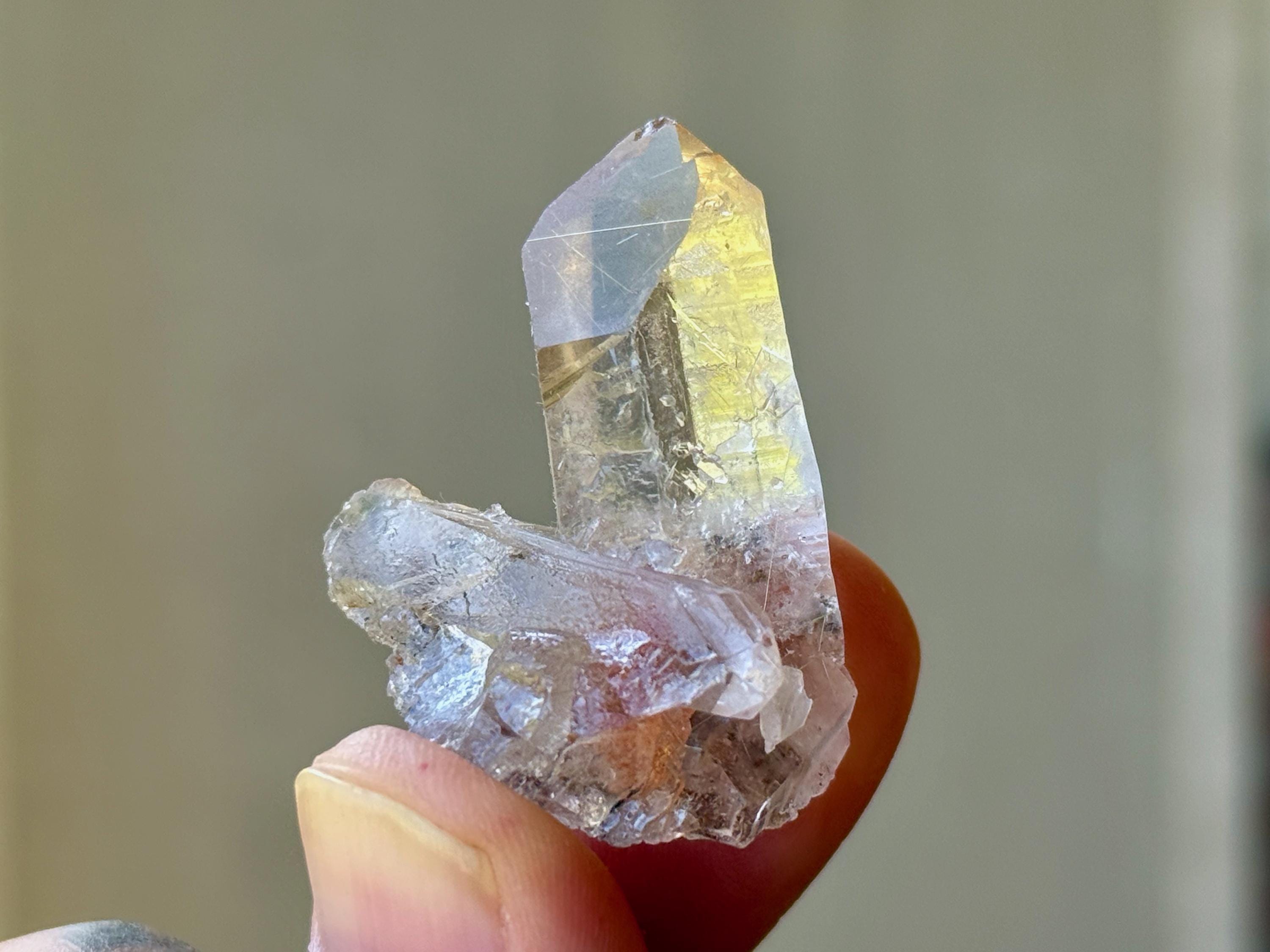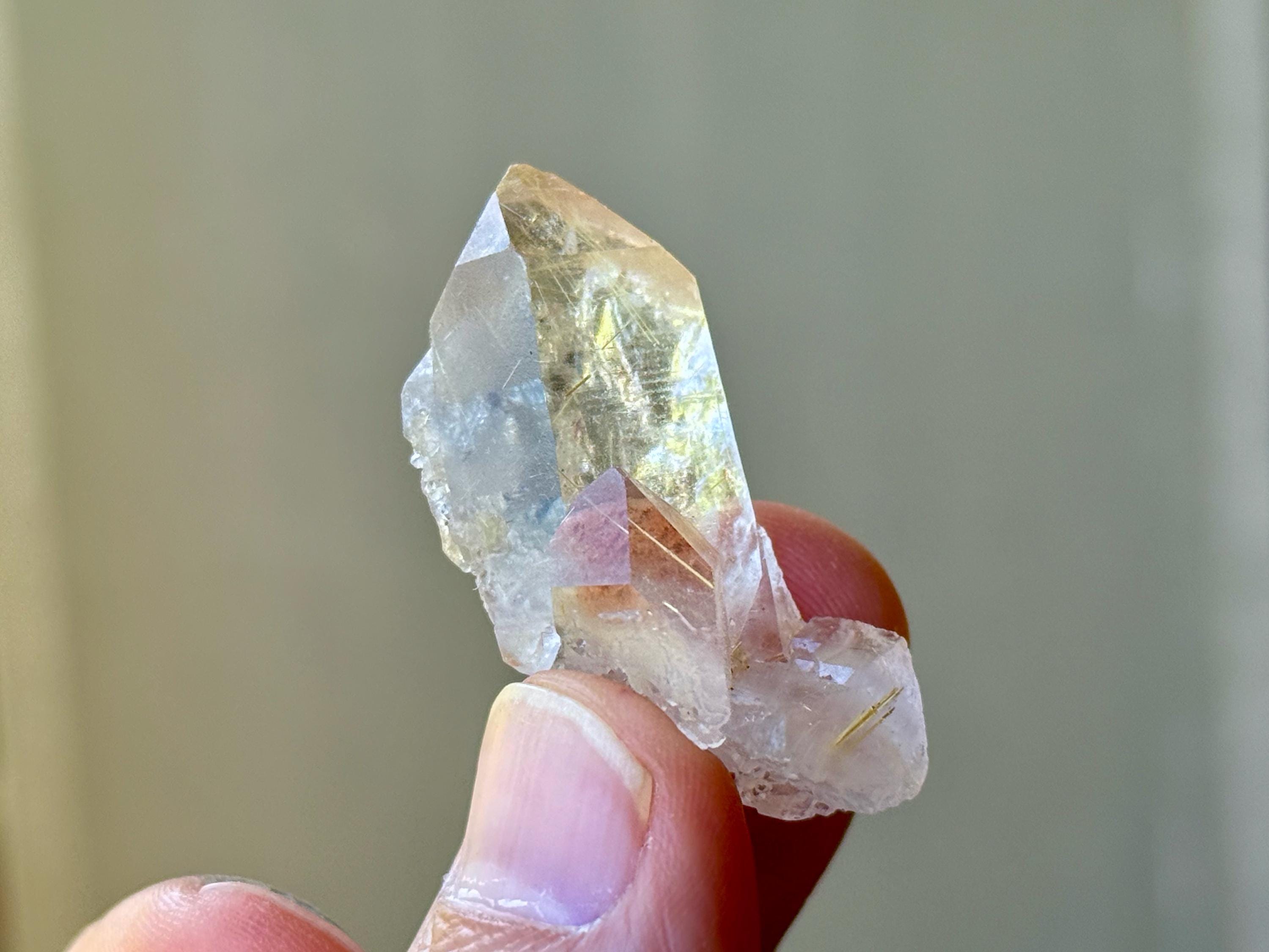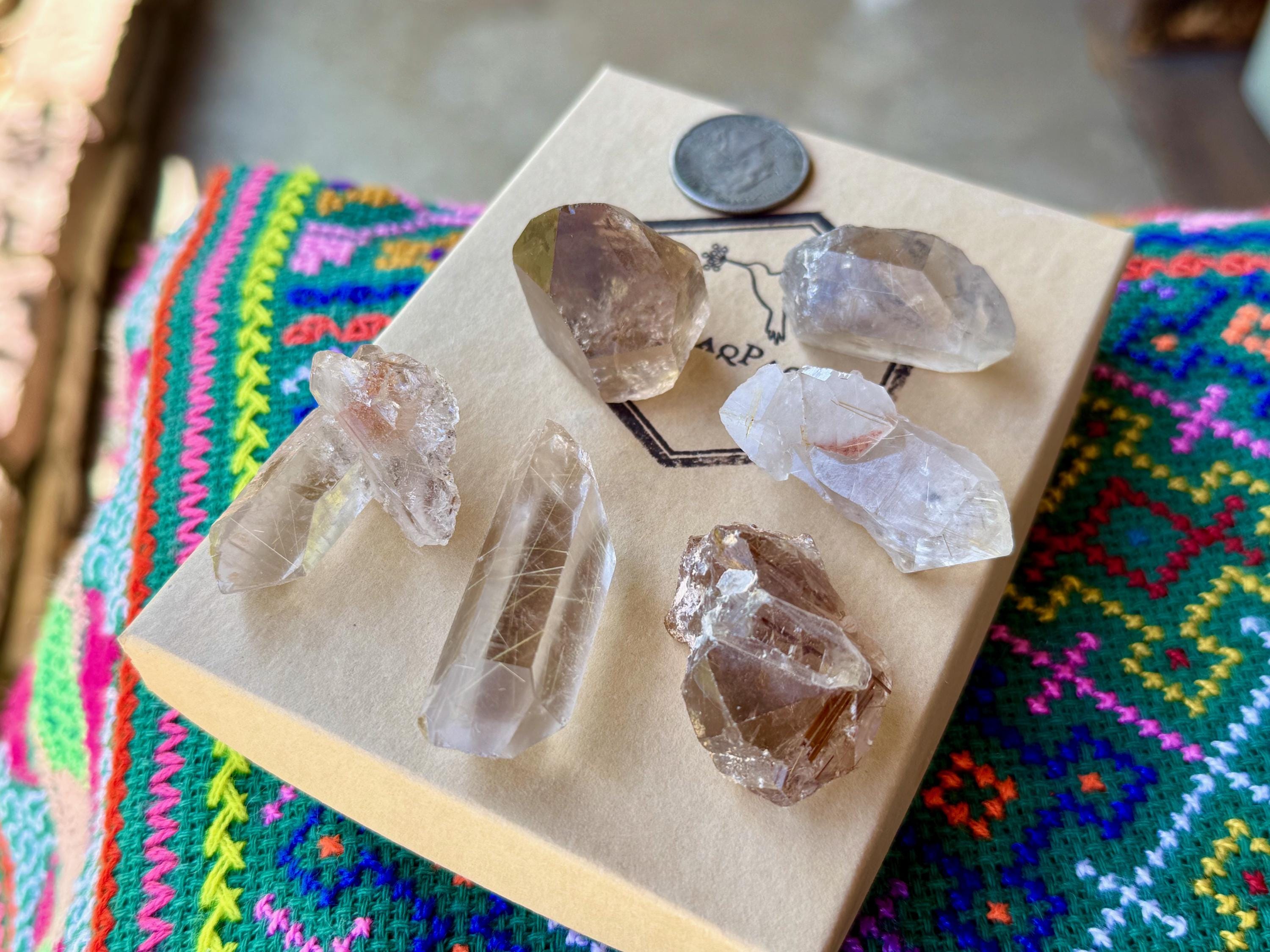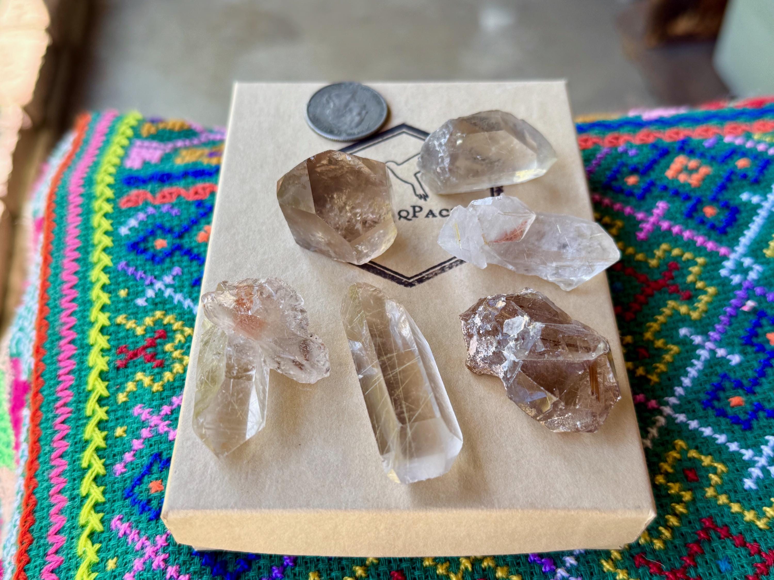 Wonderful clarity and brilliant luster to these Quartz crystals with inclusions of Golden Rutile within. These crystals possess various hues of smokiness and clarity, and each possesses some Golden Rutile, from mild to more ample. In the natural sunlight, these inclusions become much more visible with lots of sparkle.