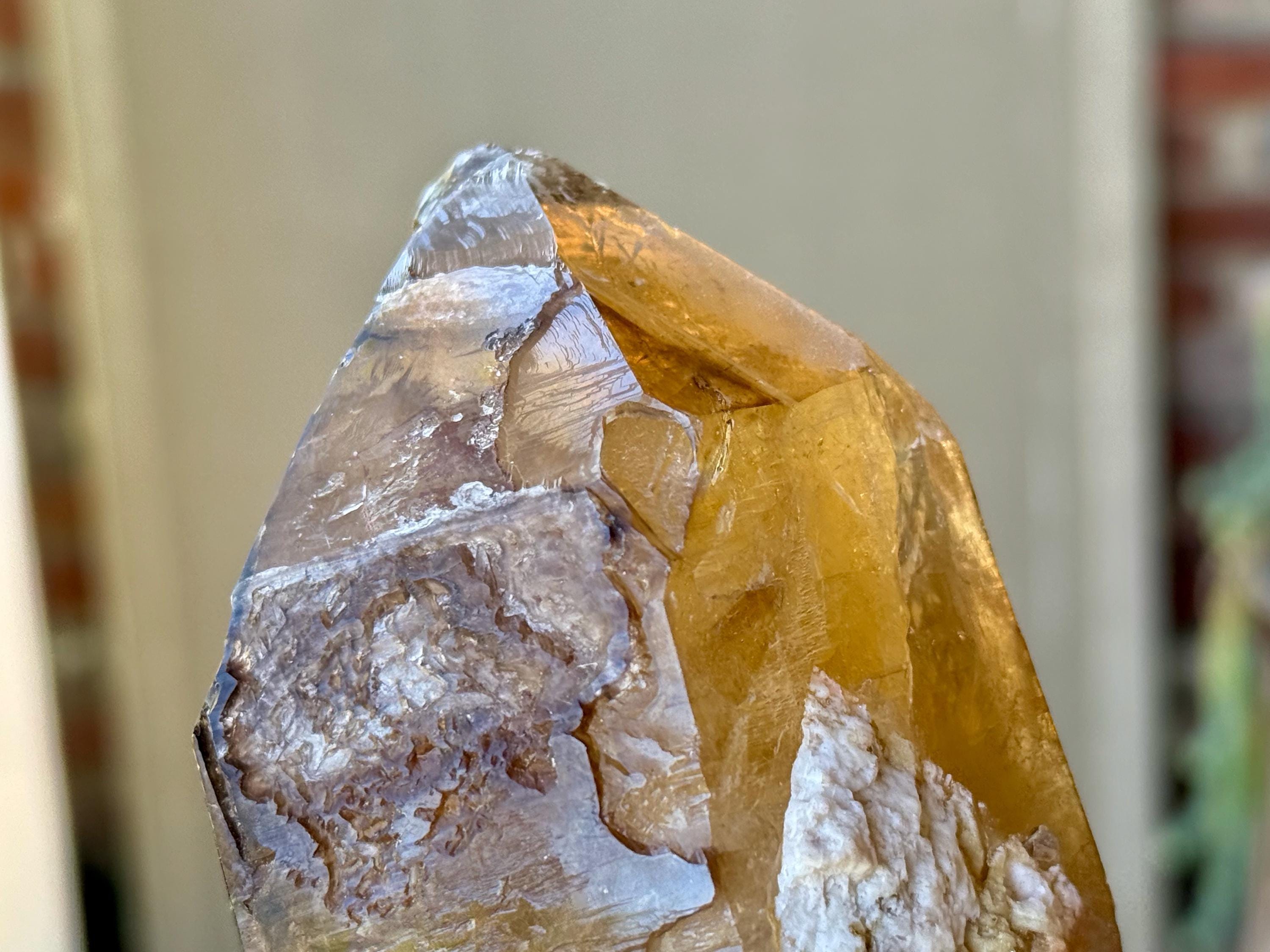 Below this "frosted" area we see a large inclusion of textural, white Feldspar. The Citrine is kind of "sandwiched" between this inclusion at the base, as we see more Feldspar in the front.
